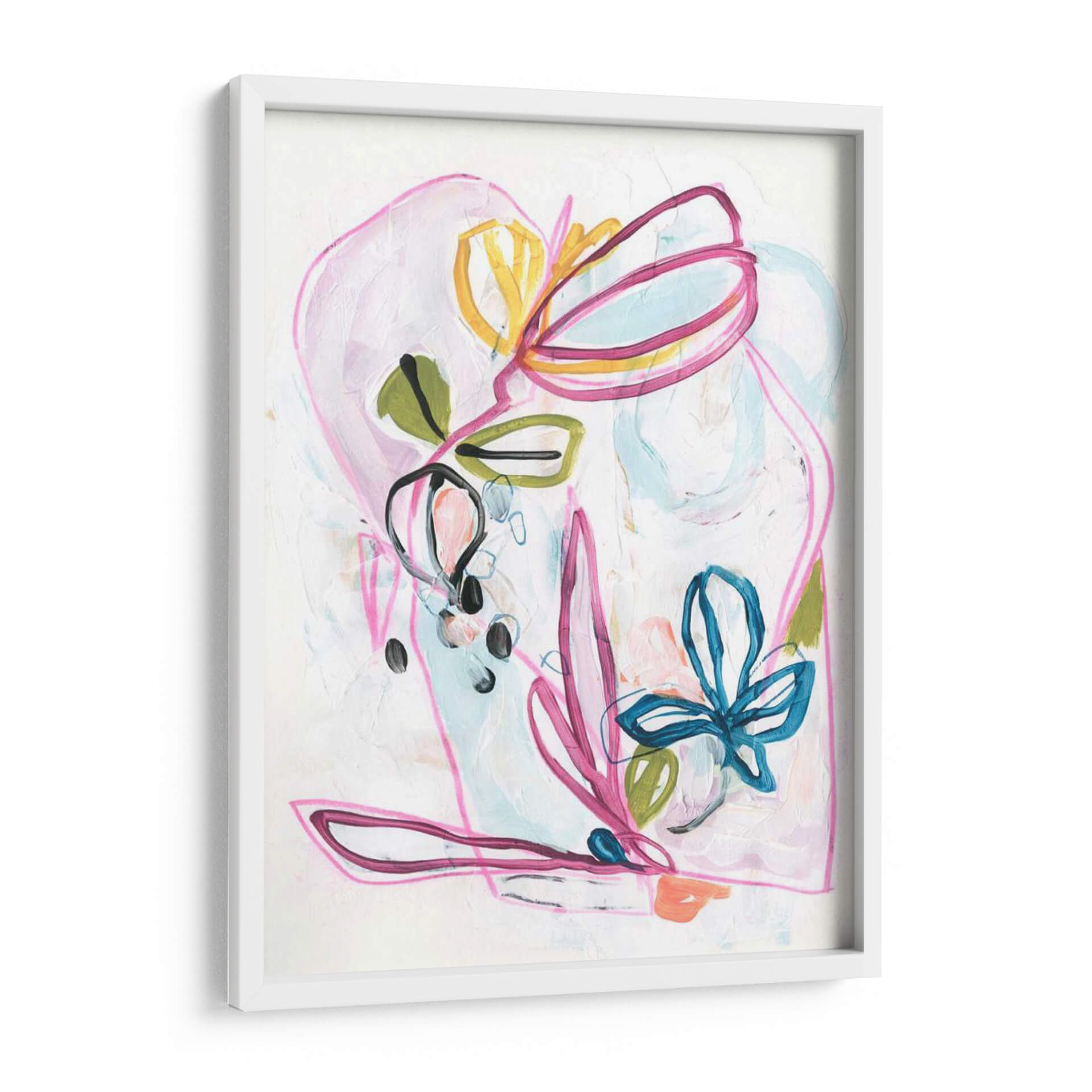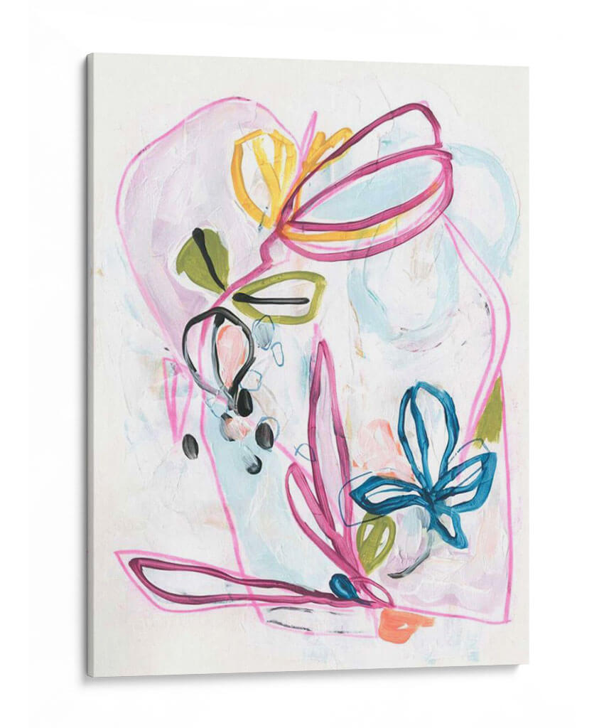 Sumérgete en la delicada belleza de 'Alusión de Jardín II', una obra de arte contemporáneo que captura la esencia efímera de la naturaleza con un toque lírico y vibrante. June Erica Vess nos presenta una composición audaz donde trazos fluidos en tonos fucsia, azul cobalto y amarillo sol danzan sobre un lienzo texturizado en blanco roto. Las formas orgánicas, evocando pétalos y hojas, se entrelazan en un juego de líneas abstractas y manchas de color que invitan a la interpretación. La paleta de colores, dominada por suaves pasteles y acentos energéticos, crea una atmósfera de alegría sutil y optimismo, perfecta para infundir vida y personalidad a cualquier espacio. Este cuadro decorativo es una elección ideal para quienes buscan añadir un punto focal de sofisticación y un aire de frescura primaveral a su hogar u oficina. Su estilo abstracto moderno y su composición dinámica lo convierten en una pieza versátil, capaz de complementar desde decoraciones minimalistas hasta ambientes más bohemios, aportando una sensación de calma creativa y elegancia desenfadada.