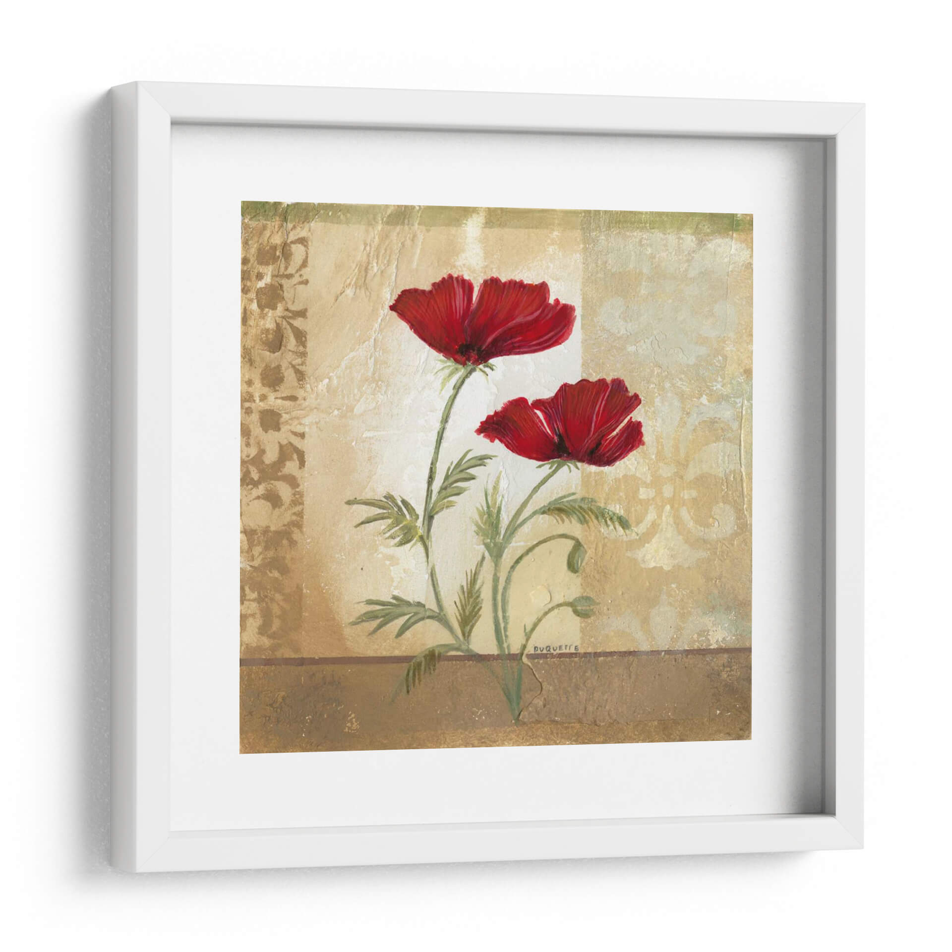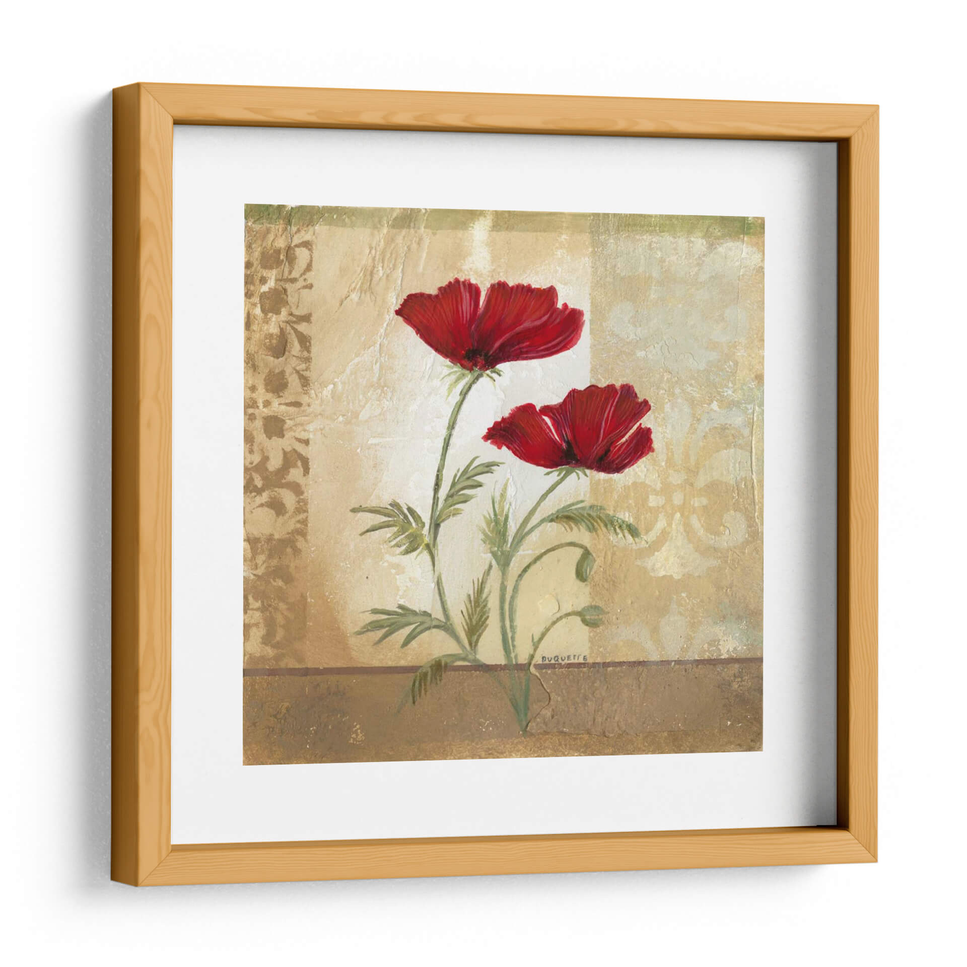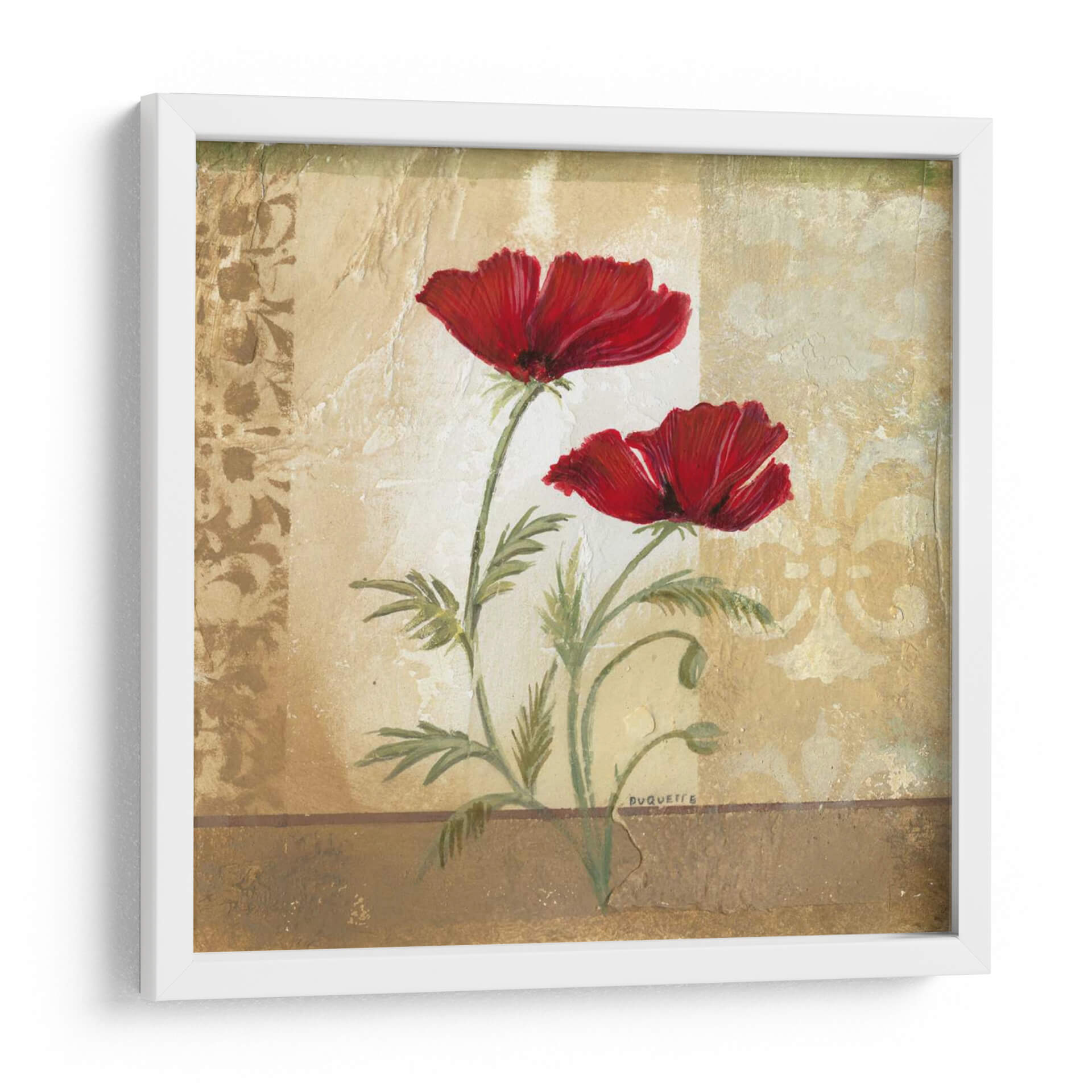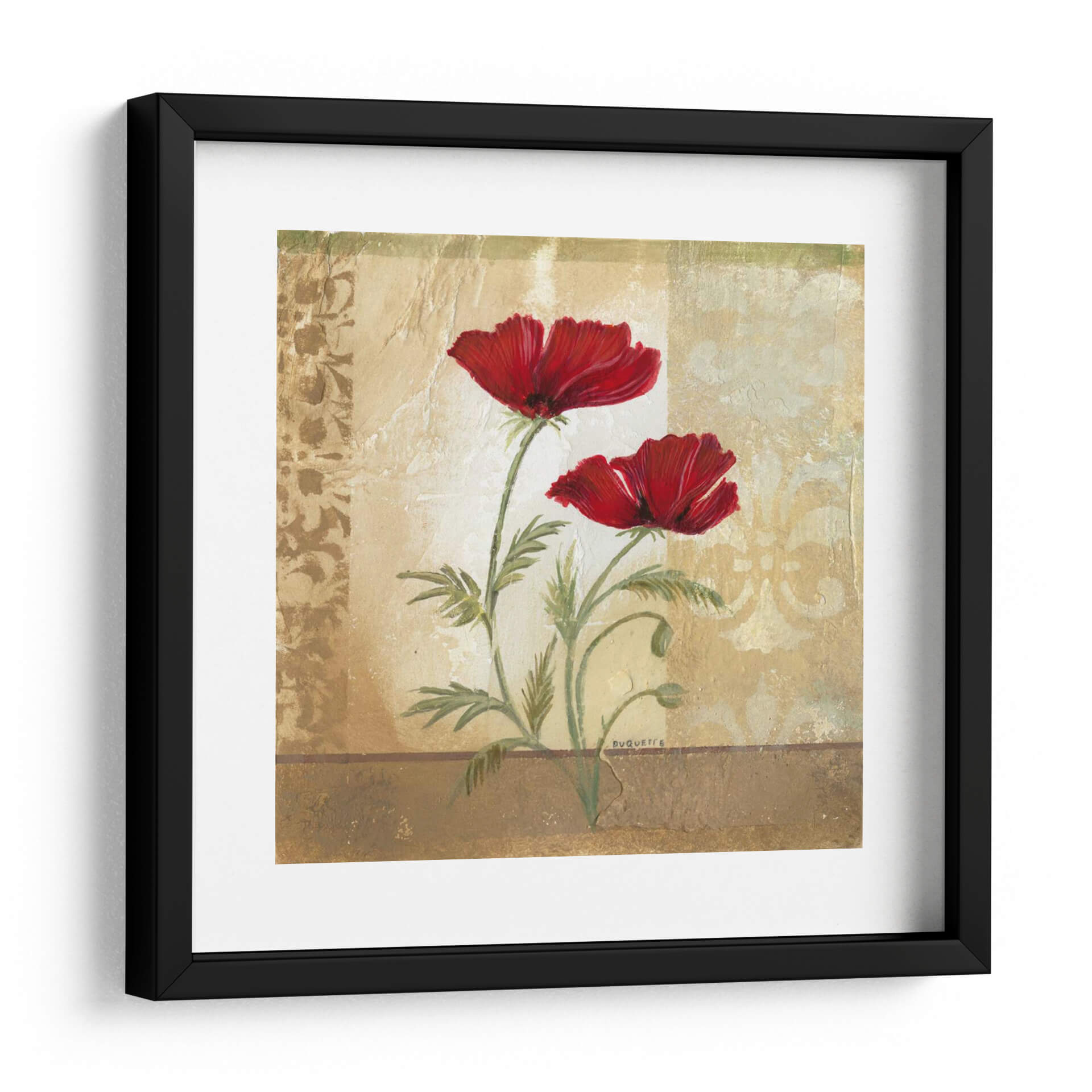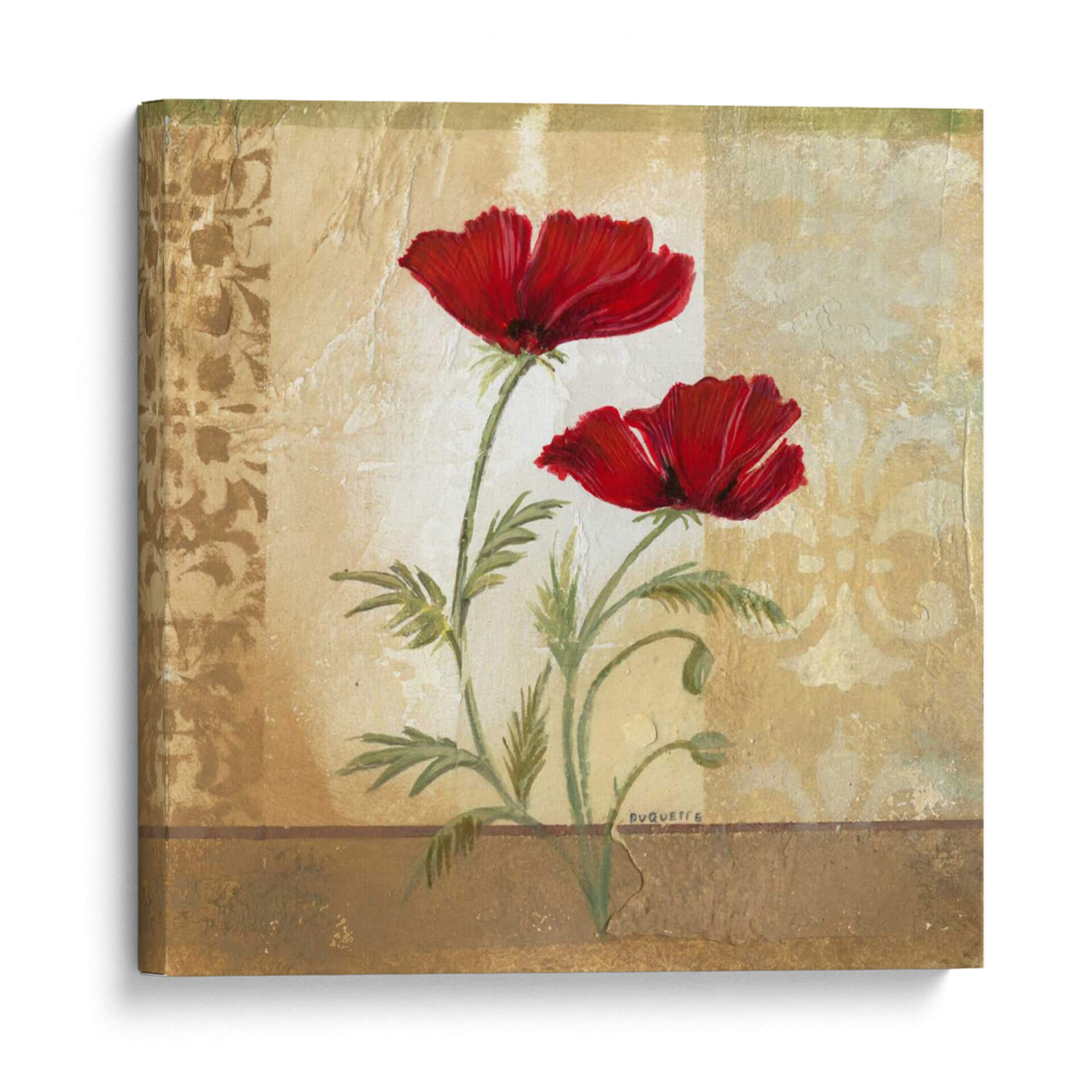 Sumérgete en la vibrante belleza de "Amapolas Rojas I", una cautivadora obra de arte que captura la esencia de estas icónicas flores con una pasión desbordante. Dos amapolas rojas, de pétalos sedosos y profundos, se alzan con gracia sobre tallos esbeltos, adornados con hojas de un verde intenso y delicado. El fondo texturizado, que evoca la calidez de un lienzo envejecido, presenta sutiles patrones ornamentales en tonos tierra y ocre, complementados por un borde superior de un verde apagado y una franja inferior de un marrón profundo y terroso. La composición, equilibrada y armoniosa, resalta el contraste dramático entre el rojo vivo de las flores y los matices neutros del entorno, creando un punto focal de gran impacto visual. Este cuadro decorativo, con su estilo que fusiona lo figurativo con toques de arte rústico, transmite una sensación de vitalidad y elegancia atemporal. Es la pieza perfecta para infundir energía y color en cualquier espacio, ya sea un salón moderno, un comedor acogedor o un estudio inspirador. "Amapolas Rojas I" no es solo una obra de arte, es una declaración de estilo y una fuente de alegría visual que transformará tu decoración.