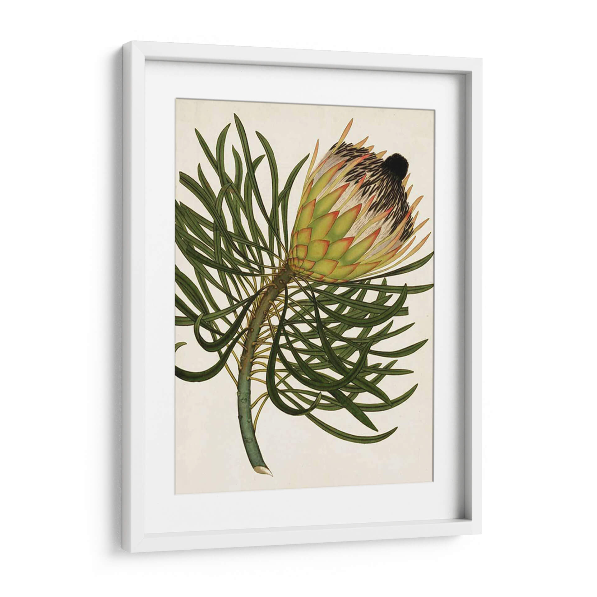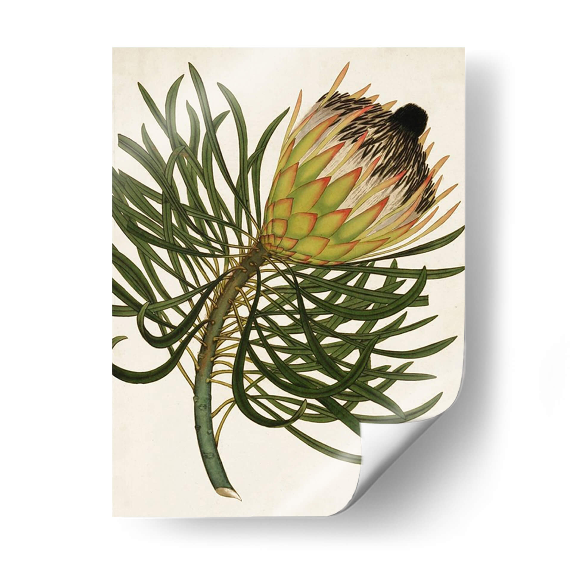 Embellece tu espacio con el encanto botánico del cuadro decorativo 'Antiguo Protea III'. Esta exquisita obra de arte presenta una detallada ilustración de una flor de protea, capturando la majestuosidad de la naturaleza con una precisión casi científica. Los tonos verdes profundos de las hojas contrastan elegantemente con los cálidos matices de amarillo y rojo que bordean los pétalos de la flor, culminando en un centro oscuro y texturizado. El fondo neutro y de tono crema permite que la flor sea la protagonista indiscutible, creando un punto focal sereno y sofisticado. Ideal para quienes aprecian la belleza de la botánica y buscan añadir un toque de elegancia atemporal a su hogar u oficina. Este cuadro decorativo es perfecto para salas de estar, comedores o estudios, aportando una sensación de calma y conexión con el mundo natural. Su estilo clásico, reminiscentes de ilustraciones botánicas antiguas, se integra a la perfección en decoraciones tradicionales, rústicas o incluso en espacios modernos que buscan un contrapunto orgánico. Descubre la fuerza y la delicadeza de esta impresionante flor a través de una pieza de arte que inspira contemplación y admiración.
