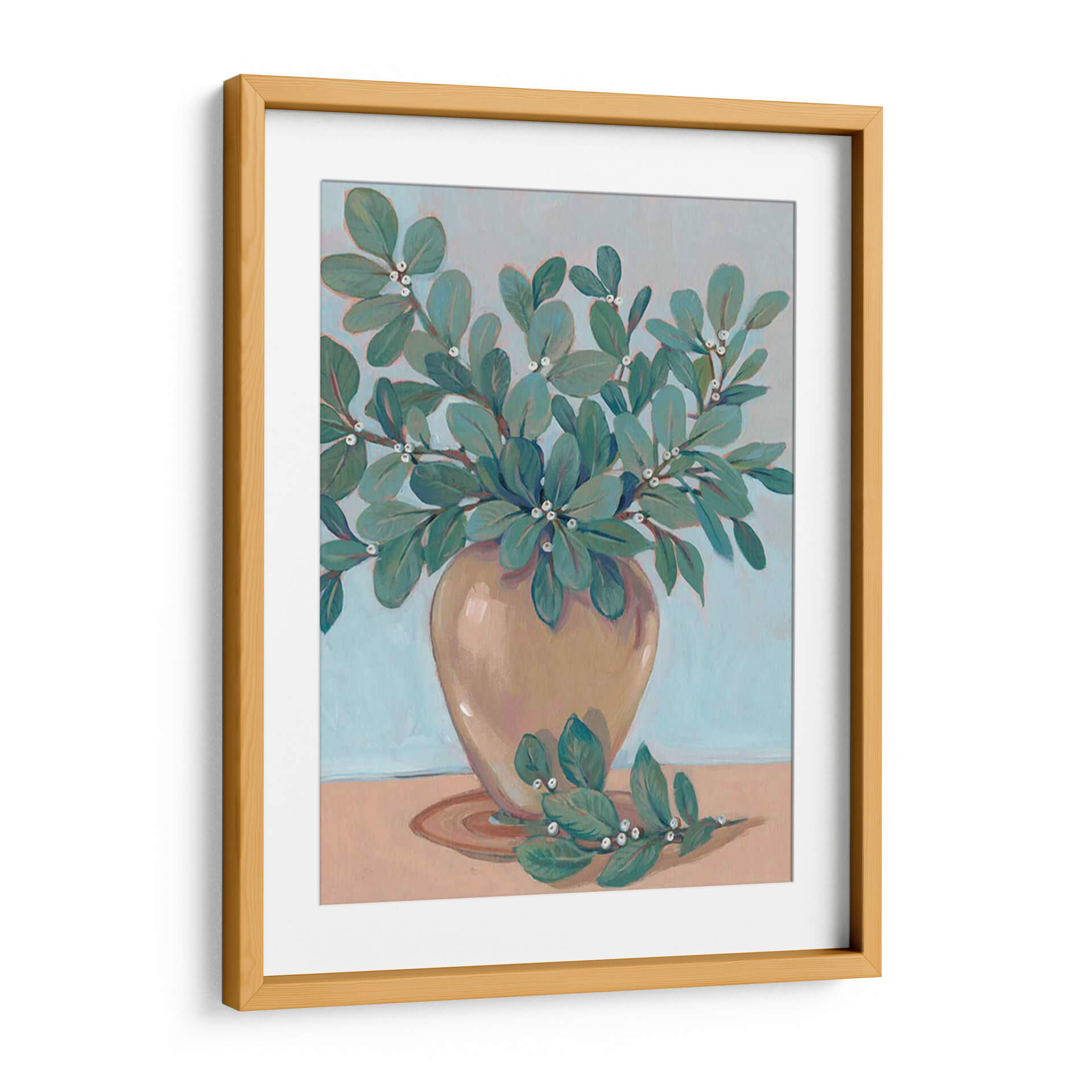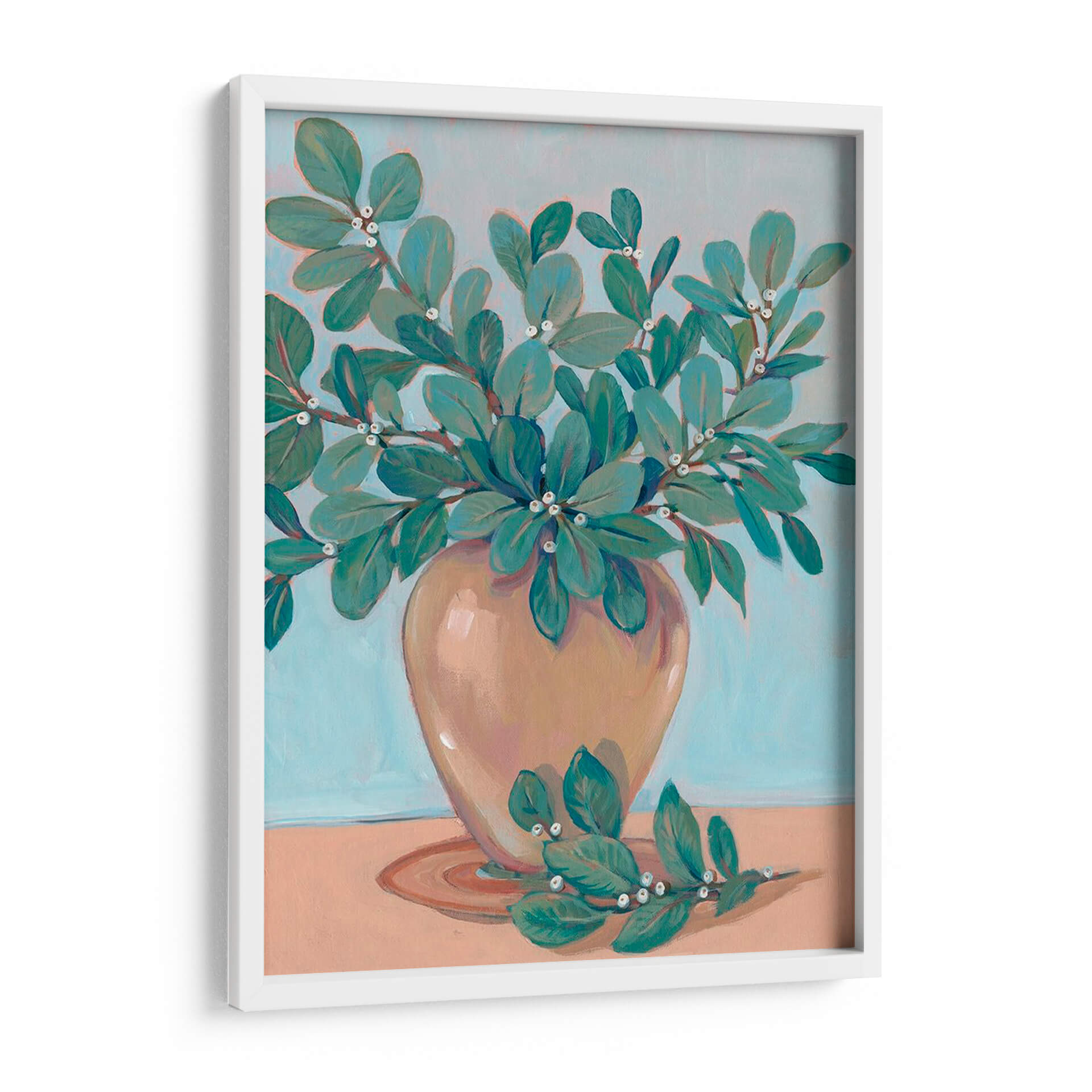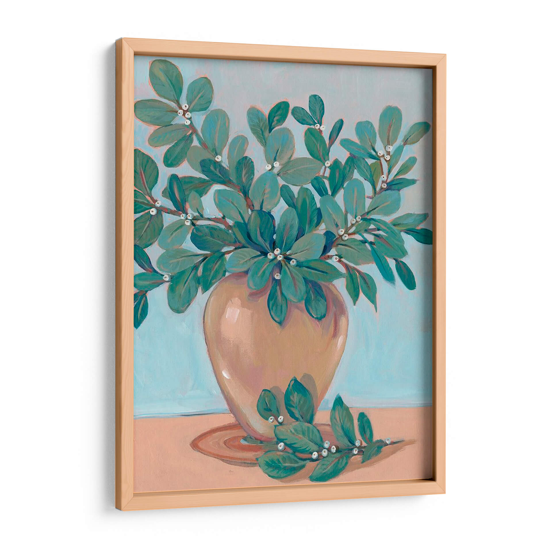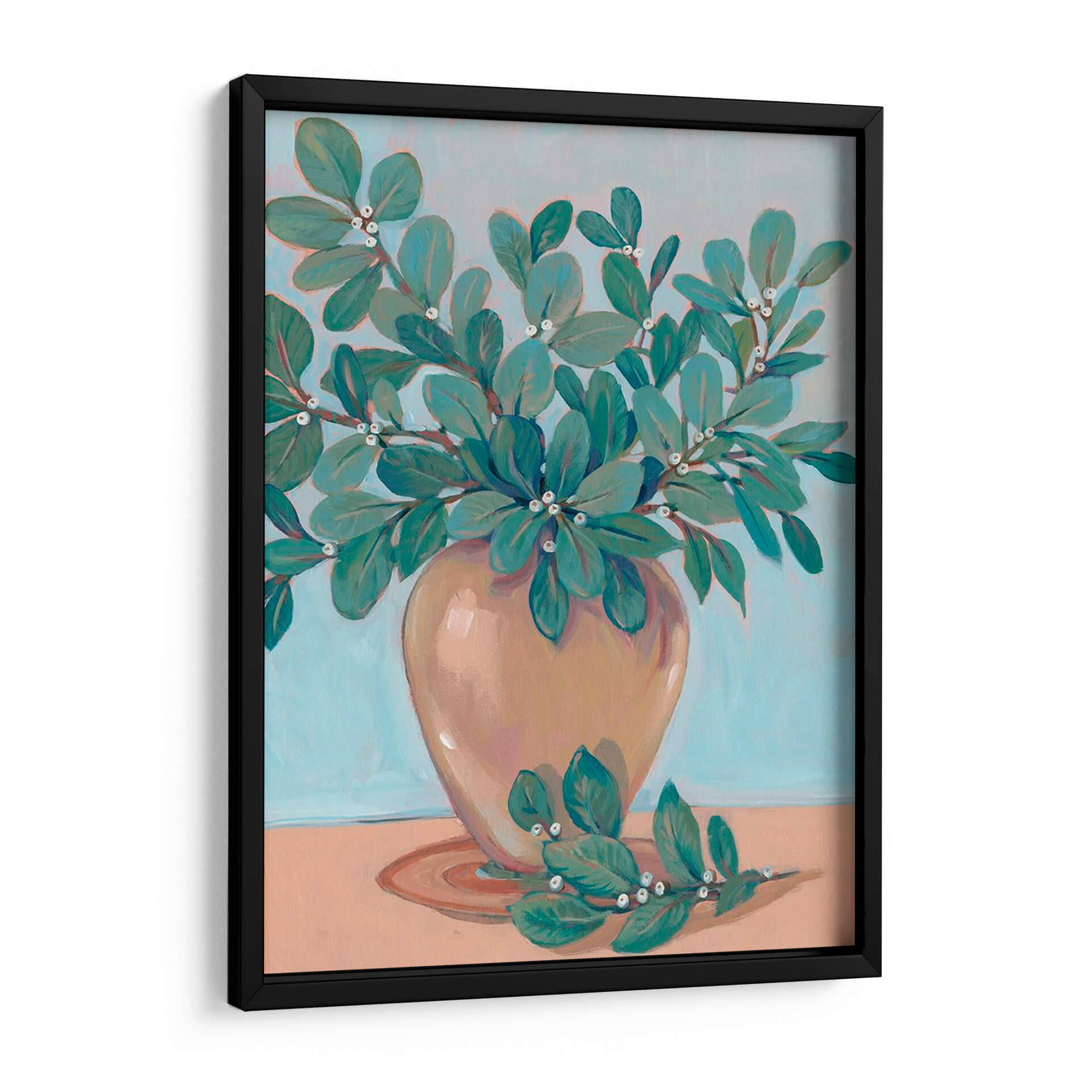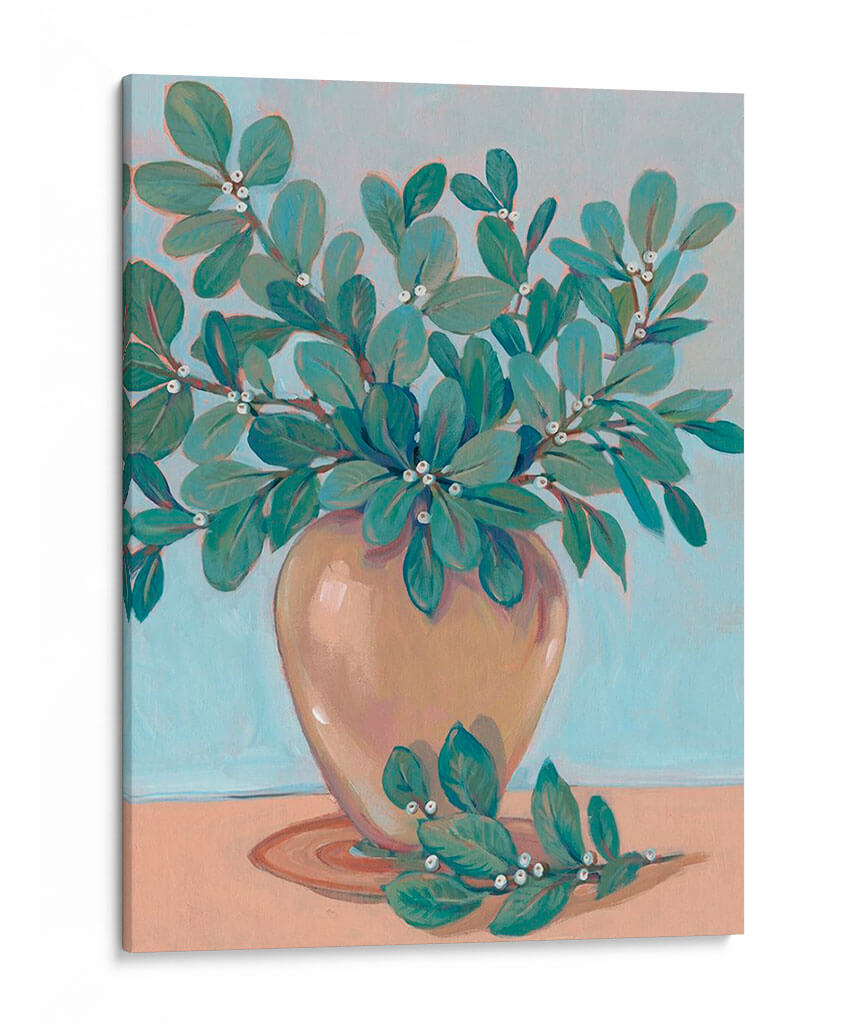Sumérgete en la serenidad de "Arreglo III", una obra de arte contemporáneo que captura la delicadeza de la naturaleza con un toque moderno. Este cuadro decorativo presenta un exuberante ramo de hojas de un profundo tono verde azulado, salpicado de pequeños puntos blancos que imitan bayas o rocío, dispuestas elegantemente dentro de un jarrón o recipiente de color terracota. La paleta de colores, dominada por los verdes, azules celestes y tonos cálidos de tierra, crea una atmósfera de calma y frescura, ideal para transformar cualquier espacio. El estilo pictórico, con pinceladas visibles y una composición que evoca un bodegón clásico pero con una sensibilidad contemporánea, hace que esta pieza sea versátil. Perfecta para añadir un elemento de tranquilidad a tu sala de estar, un toque de color natural a tu dormitorio, o una nota de sofisticación a tu oficina. "Arreglo III" es más que una decoración; es una invitación a la contemplación y al bienestar, una ventana a la belleza serena de lo cotidiano que aportará vida y estilo a tu hogar.