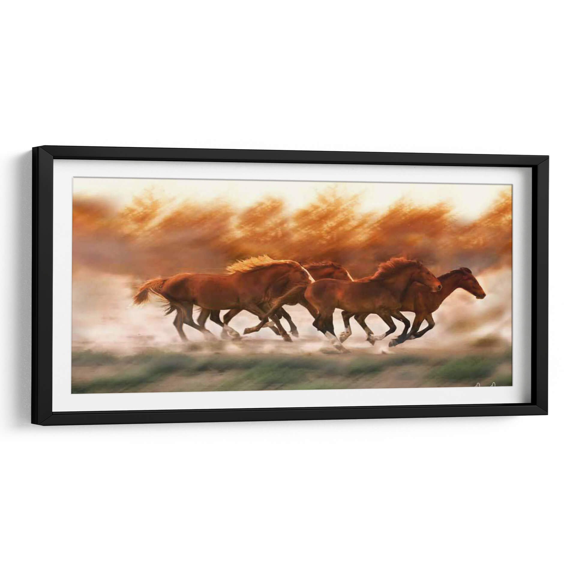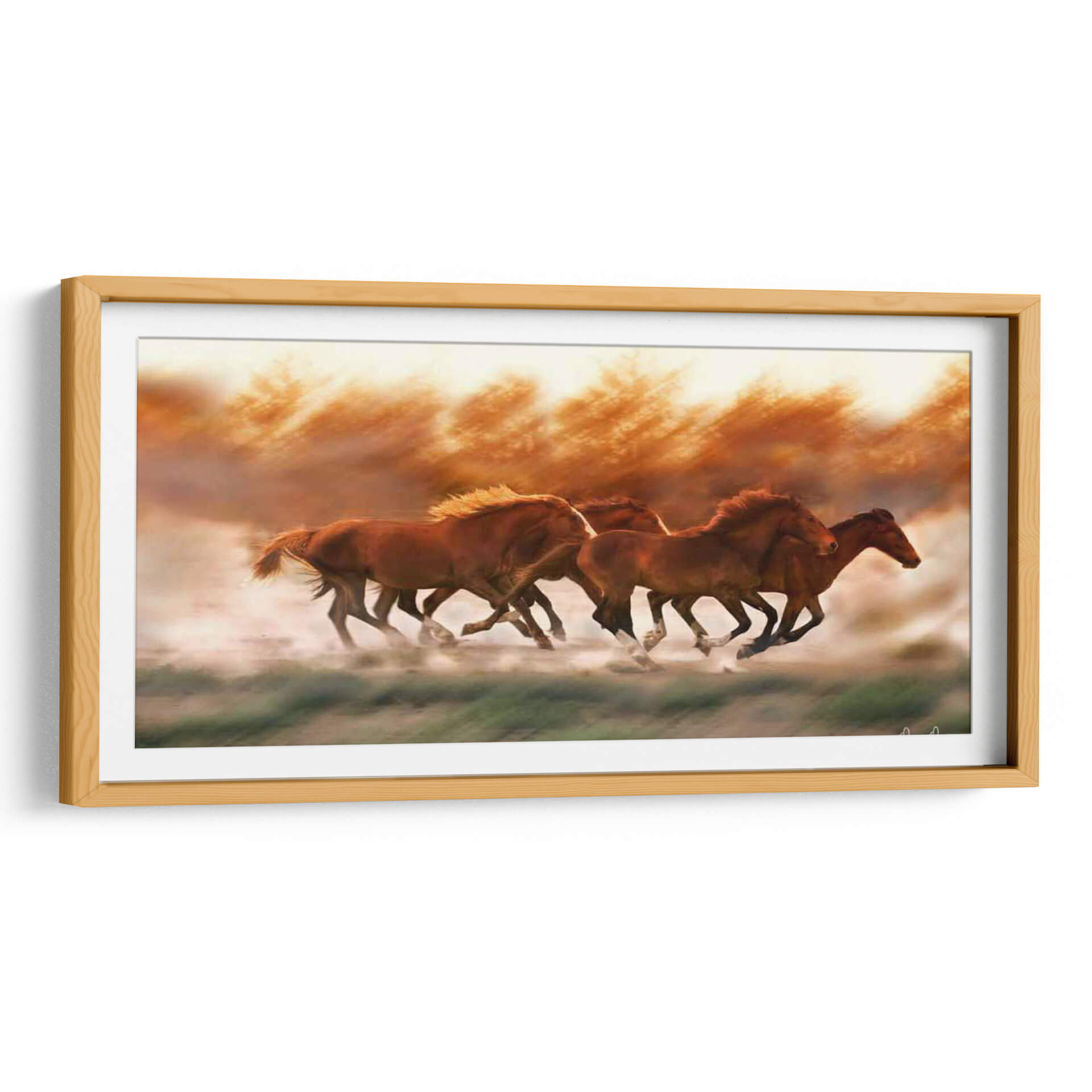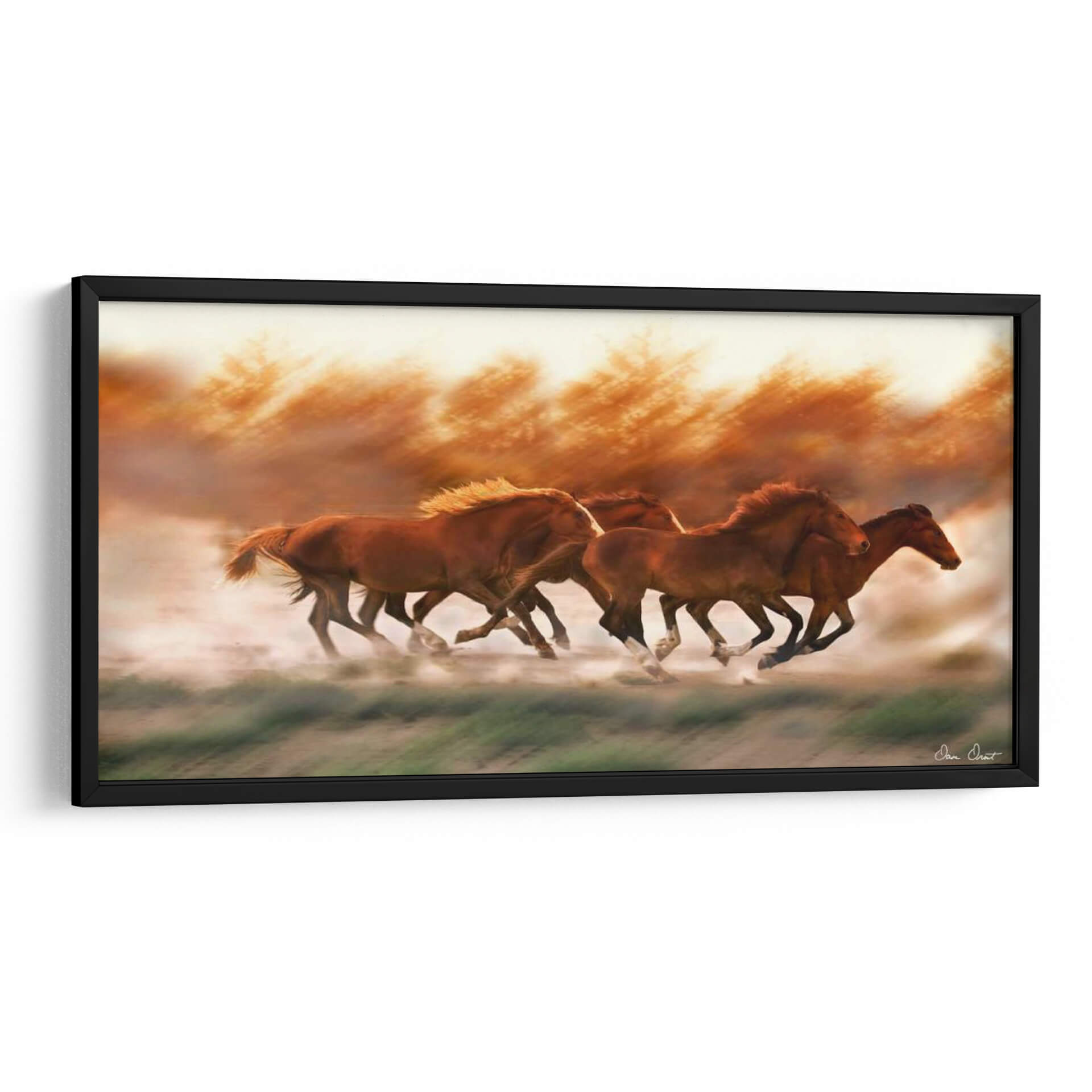 Captura la fuerza indómita de la naturaleza con "Blazing Herd II", una obra de arte dinámica que inmortaliza la majestuosidad de varios caballos galopando a través de un paisaje polvoriento. Los tonos cálidos y ardientes, que van desde los ocres profundos hasta los naranjas vibrantes, dominan la paleta, creando una atmósfera de energía cruda y movimiento incesante. Las figuras de los caballos están representadas con un detalle impresionante, sus músculos tensos y sus melenas al viento, sugiriendo una poderosa carrera hacia un horizonte brumoso. El estilo realista con toques impresionistas en el fondo y el suelo crea una sensación de profundidad y fugacidad, como si el espectador estuviera presenciando un instante efímero. Este cuadro decorativo es ideal para infundir vitalidad y un espíritu salvaje en cualquier espacio, desde una sala de estar moderna hasta un estudio o una oficina que busque un punto focal inspirador. La composición, que enfoca la manada en plena acción, evoca sentimientos de libertad, poder y la belleza indómita del mundo natural. "Blazing Herd II" no es solo una pieza de decoración, sino una ventana a la pasión y la elegancia de estas magníficas criaturas en su máxima expresión de movimiento.