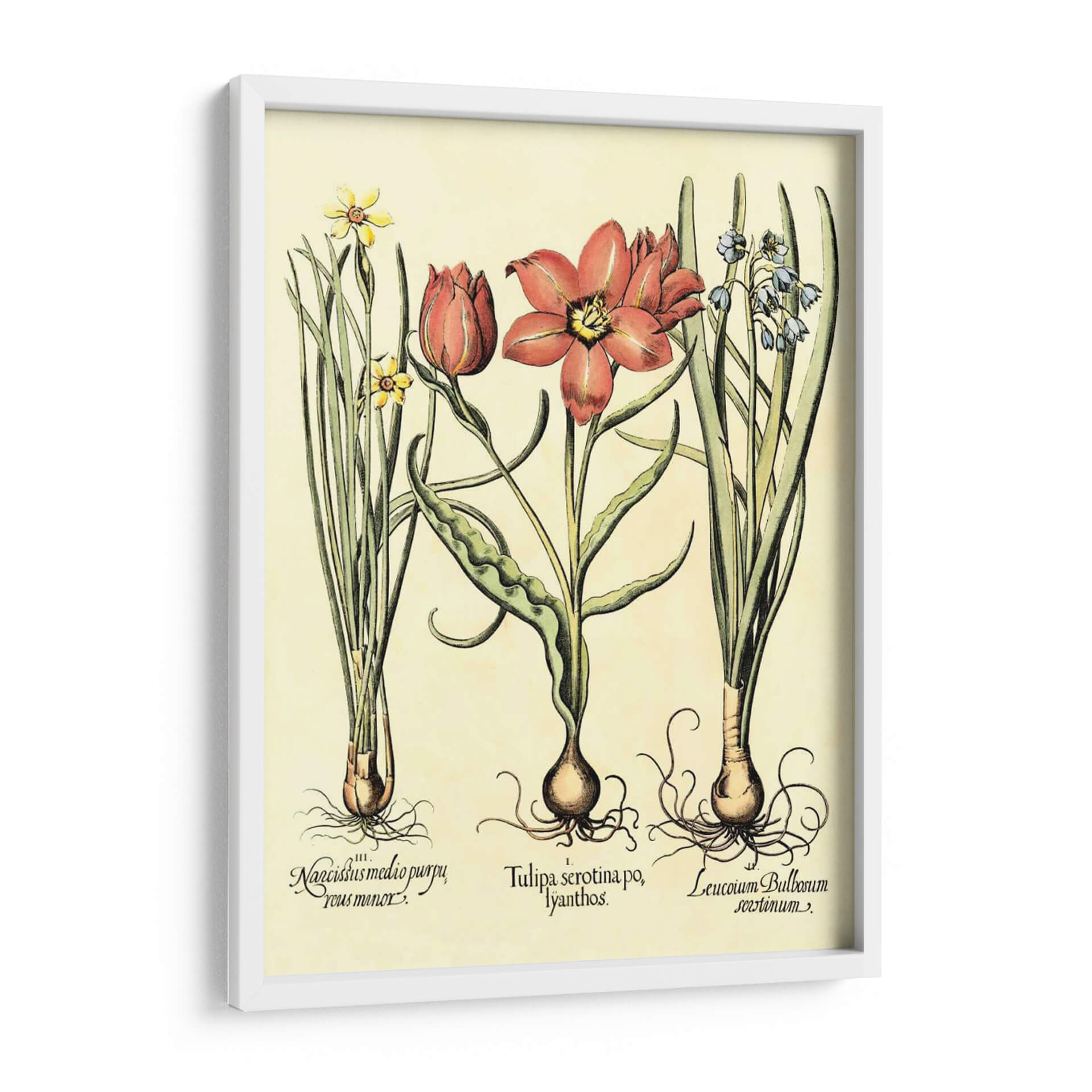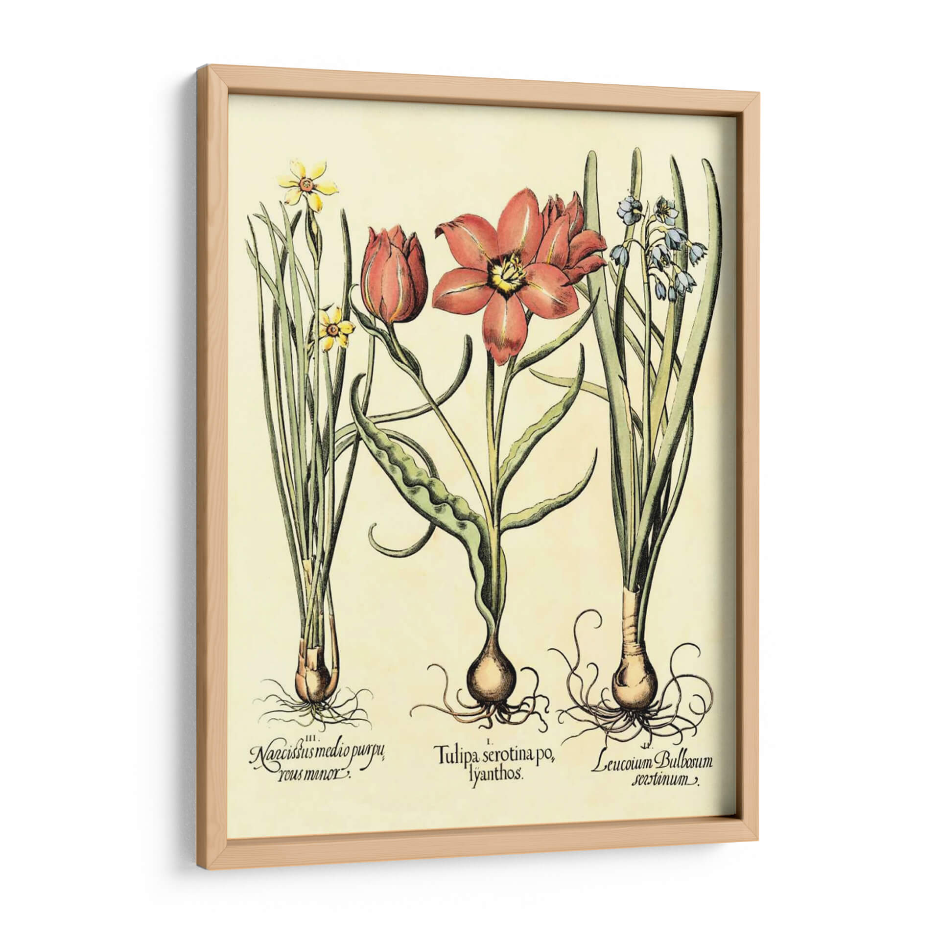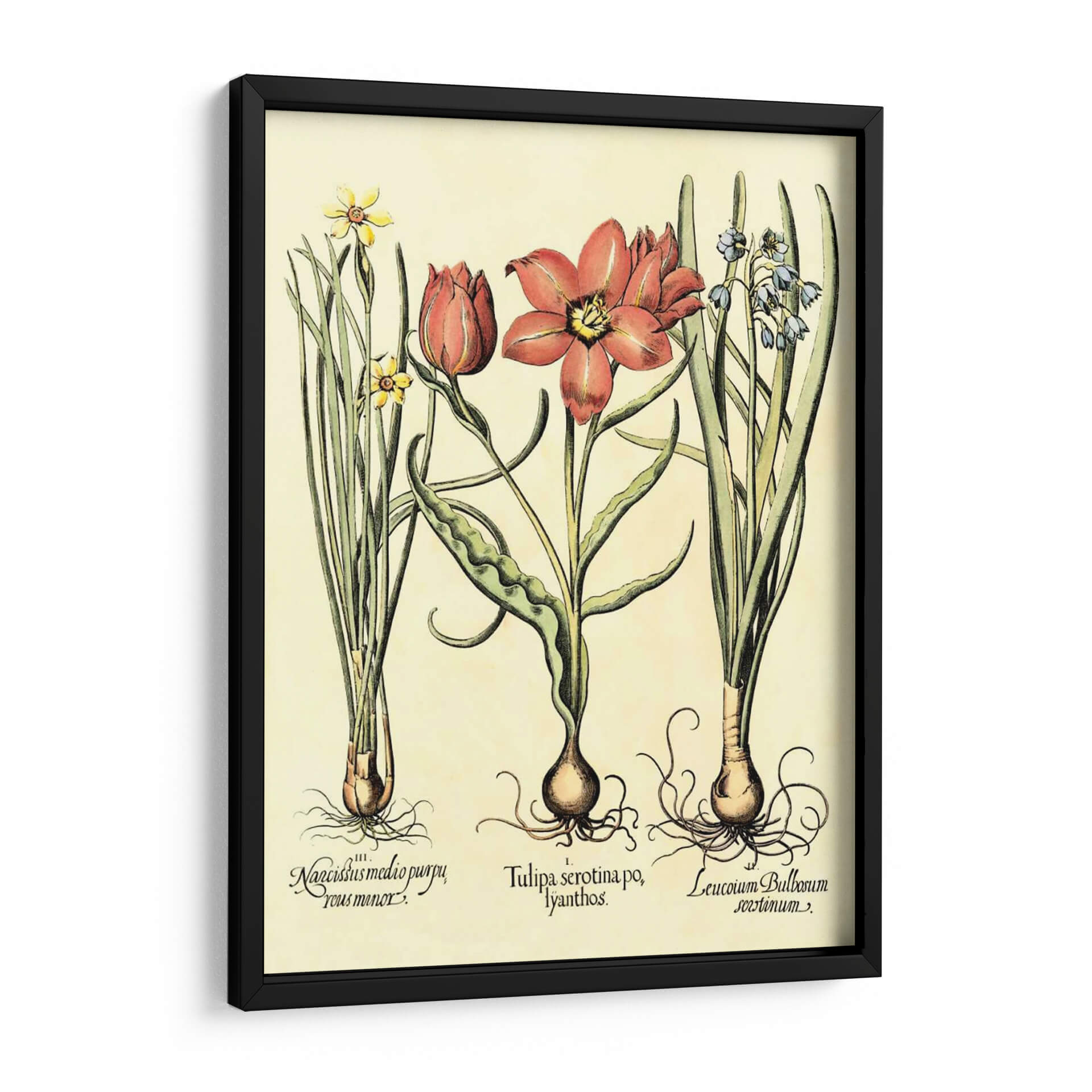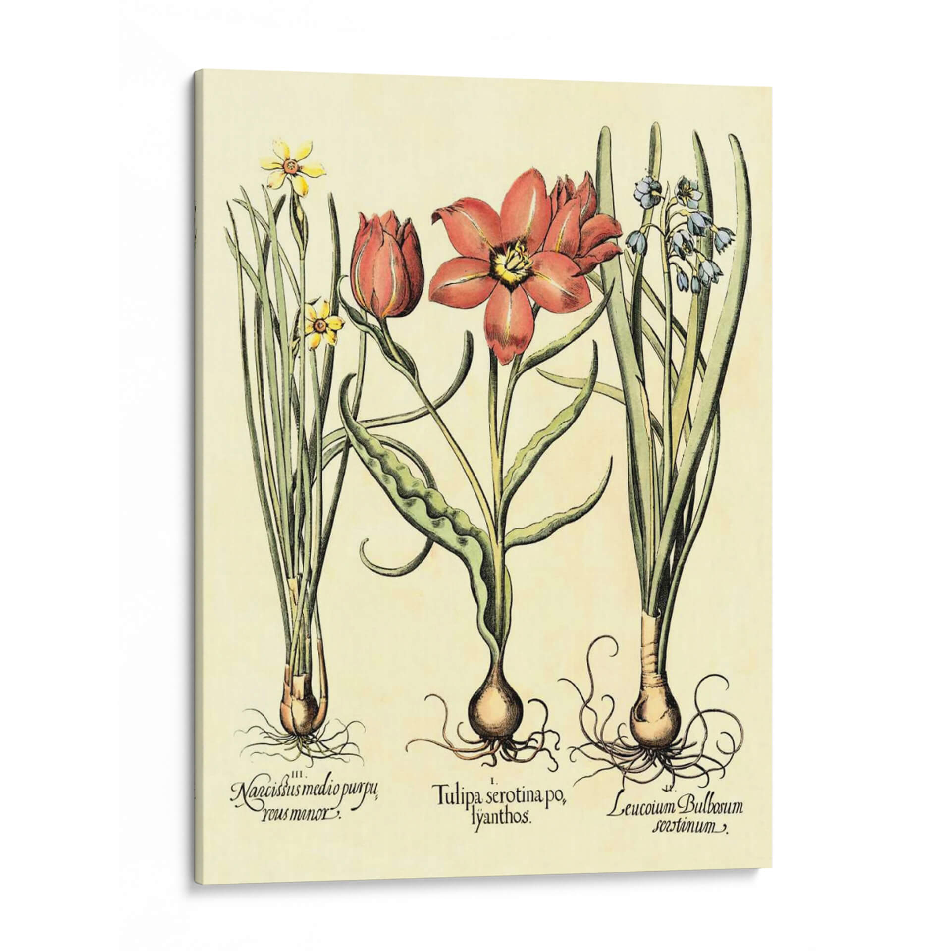 Embellece tu espacio con el encanto atemporal de "Bombilla Jardín Iv", una obra maestra botánica del renombrado artista Basilius Besler. Esta pieza, que captura la delicadeza de tres tipos de bulbos florales en plena floración, es una celebración de la naturaleza en su máxima expresión. Los vibrantes tulipanes en tonos rojizos, junto a los sutiles narcisos amarillos y las etéreas flores azules, crean una paleta de colores rica y armoniosa que aporta vida y serenidad a cualquier ambiente. La composición, con un fondo de color crema suave y un detalle exquisito en cada pétalo y hoja, evoca una atmósfera de calma y elegancia. Ideal para salones, estudios o incluso cocinas, este cuadro decorativo de estilo botánico clásico infunde un toque de sofisticación y conexión con el mundo natural. Su diseño detallado y la calidad artística lo convierten en una adición perfecta para aquellos que aprecian la belleza clásica y la ciencia botánica. Añade esta pieza única a tu colección y transforma tu hogar en una galería de arte personal, inspirada en la precisión y la belleza de la ilustración botánica histórica.