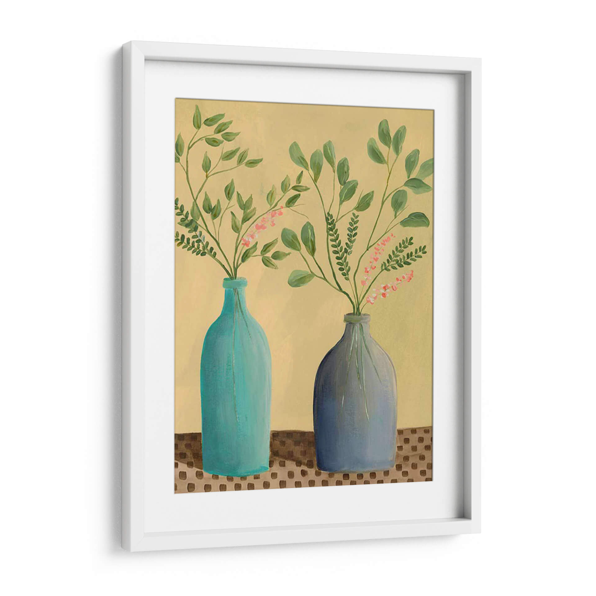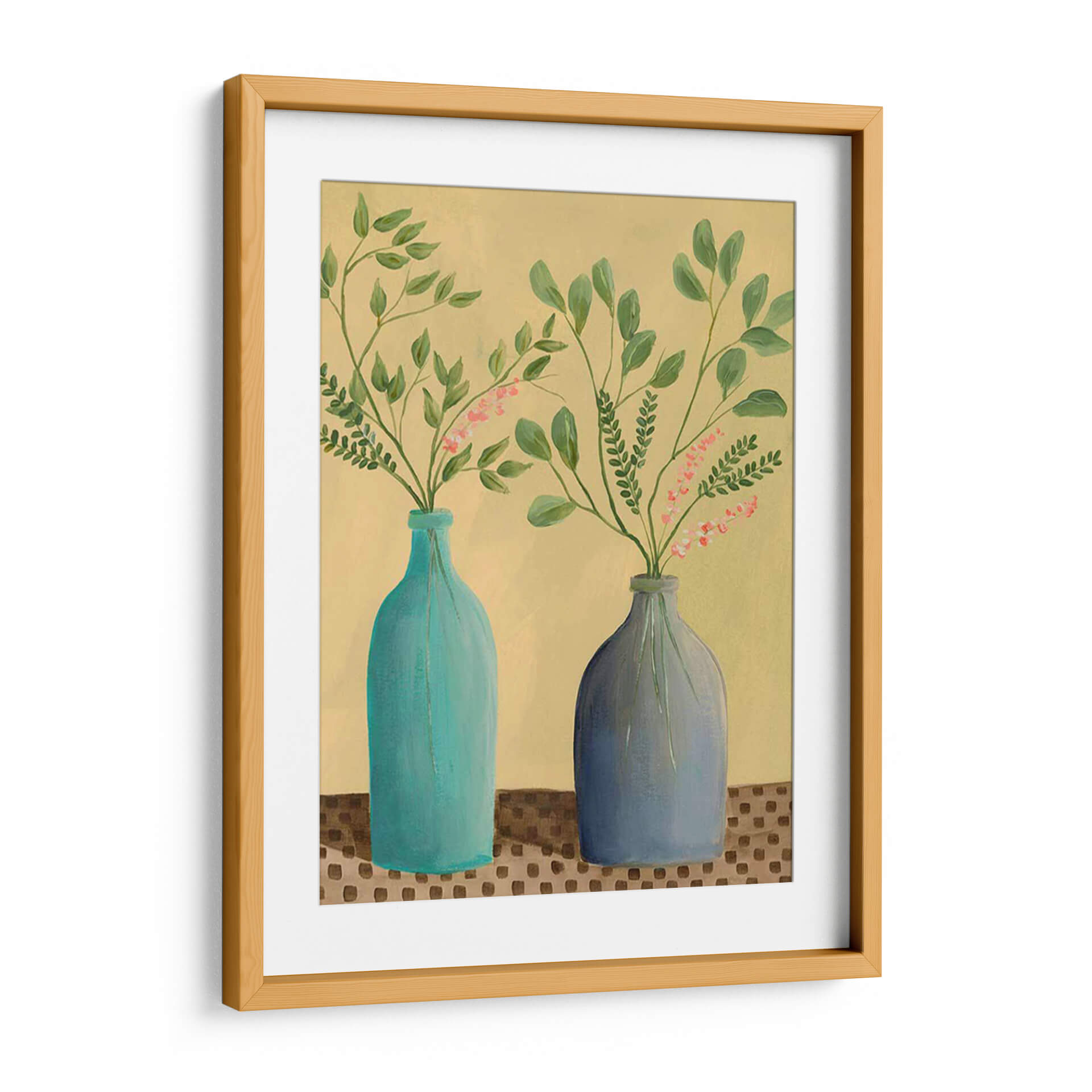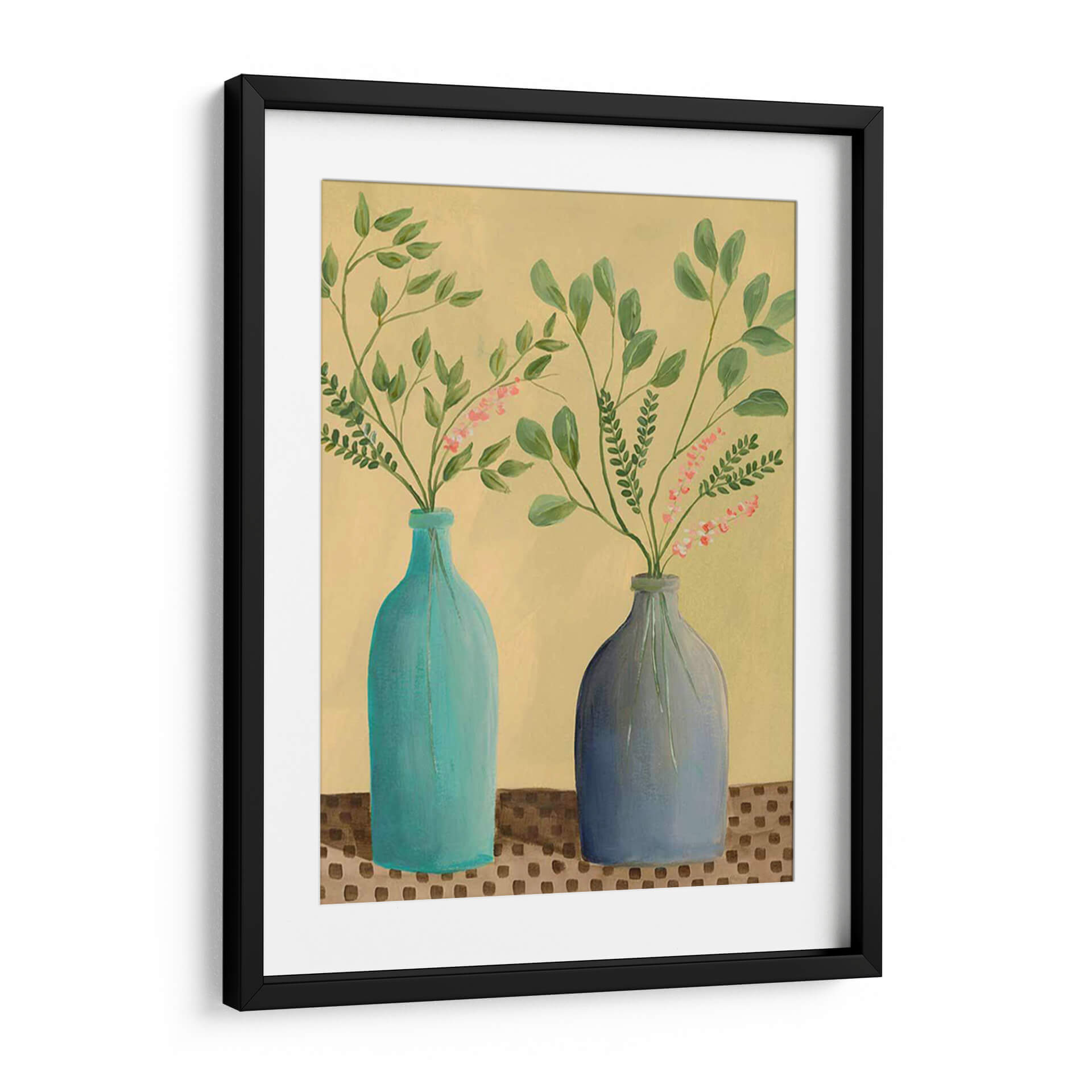 Aporta una dosis de serenidad y encanto rústico a tu hogar con "Botella Vignette II", una cautivadora obra de arte de Regina Moore. Esta pieza presenta dos botellas de vidrio en tonos aguamarina y gris azulado, dispuestas armoniosamente sobre una superficie texturizada con un patrón de cuadros marrones. De las botellas emanan delicados tallos de vegetación con pequeñas flores rosadas, pintados con trazos suaves y orgánicos que evocan la belleza de la naturaleza en su forma más simple. La paleta de colores, dominada por tonos tierra, amarillos suaves y acentos botánicos, crea una atmósfera cálida y acogedora, perfecta para cualquier rincón que necesite un toque de tranquilidad. El estilo, que combina elementos del bodegón con una sensibilidad contemporánea y ligeramente impresionista, convierte a este cuadro decorativo en una pieza versátil, ideal para salas de estar, comedores, dormitorios o estudios. La composición equilibrada y la ejecución artística de Moore invitan a la contemplación, añadiendo profundidad y un aire de sofisticación discreta a tu decoración. "Botella Vignette II" es más que un simple adorno; es una ventana a la calma y la elegancia natural que transformará tu espacio en un refugio de paz.