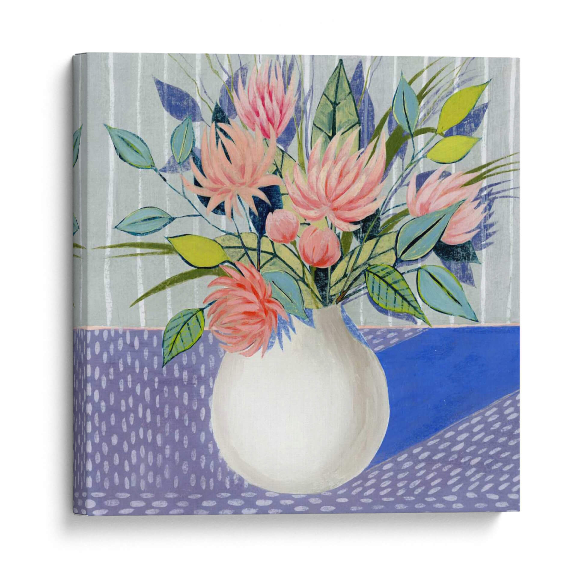 Aporta un toque de vitalidad y estilo contemporáneo a tu hogar u oficina con el cuadro decorativo "Bouquet Del Mediodía II" de Grace Popp. Esta obra de arte captura la delicadeza de un ramo de flores en plena floración, presentadas en un jarrón blanco minimalista. La paleta de colores se centra en tonos pastel de rosa, complementados por verdes hoja y toques de azul vibrante, creando una atmósfera alegre y fresca. El fondo, con sus sutiles rayas verticales y patrones geométricos en tonos lavanda y azul, añade una dimensión moderna y texturizada a la composición. El estilo artístico, que combina elementos figurativos con un toque abstracto y naíf, permite que la obra sea versátil y se adapte a diversos entornos decorativos, desde una sala de estar moderna hasta un dormitorio sereno o un espacio de trabajo inspirador. "Bouquet Del Mediodía II" es más que una simple decoración de pared; es una invitación a la contemplación de la belleza efímera de la naturaleza, interpretada a través de una sensibilidad artística única. Ideal para quienes buscan añadir un acento de color y personalidad a sus paredes, esta pieza decorativa promete ser un punto focal encantador y lleno de vida.