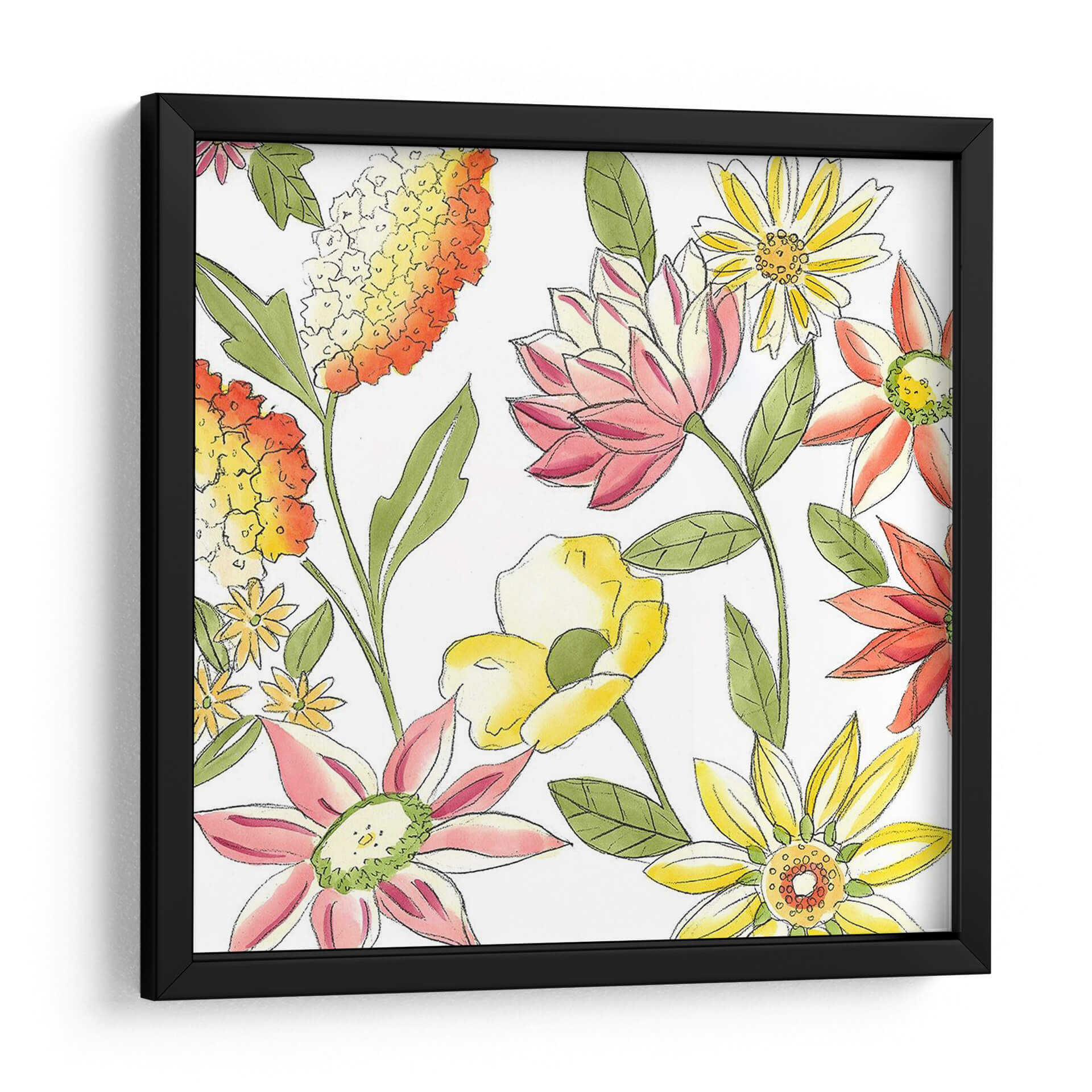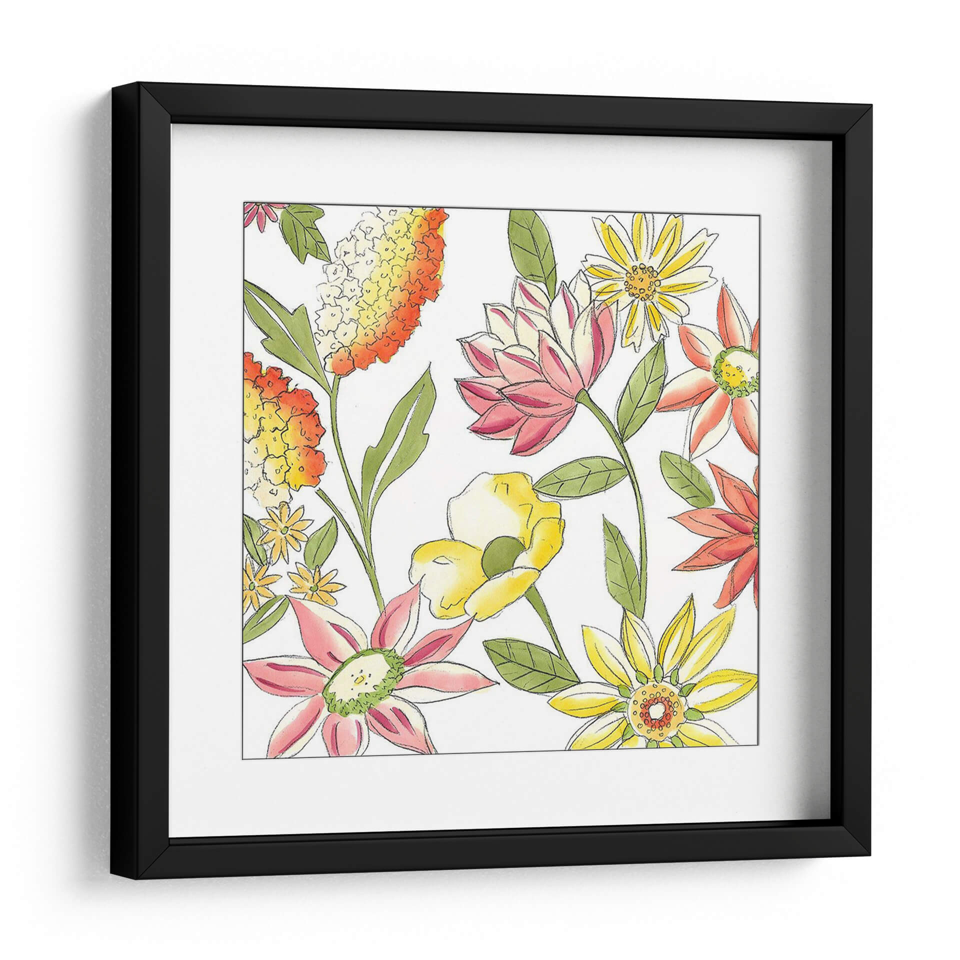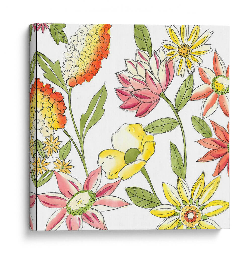 Sumérgete en la vitalidad y el encanto natural con el cuadro decorativo "Bouquet Garden I" de Chariklia Zarris. Esta obra evoca la frescura de un jardín floreciente, capturando la esencia de la primavera y el verano en una explosión de color y forma. Las flores, representadas con trazos delicados y acuarelas vibrantes, se despliegan en una composición alegre y dinámica sobre un fondo limpio que resalta su belleza intrínseca. La paleta de colores, que combina cálidos naranjas y amarillos con suaves rosas y toques de verde, crea una atmósfera de optimismo y serenidad, perfecta para infundir vida y alegría en cualquier espacio. El estilo, que combina elementos figurativos con una pincelada suelta y expresiva, confiere a la pieza un aire contemporáneo y accesible. Ideal para iluminar salones, dormitorios o estudios, "Bouquet Garden I" es una invitación a la contemplación de la naturaleza y un acento decorativo que aporta calidez y estilo a tu hogar. Transforma tu pared en un jardín de ensueño con esta pieza floral única.