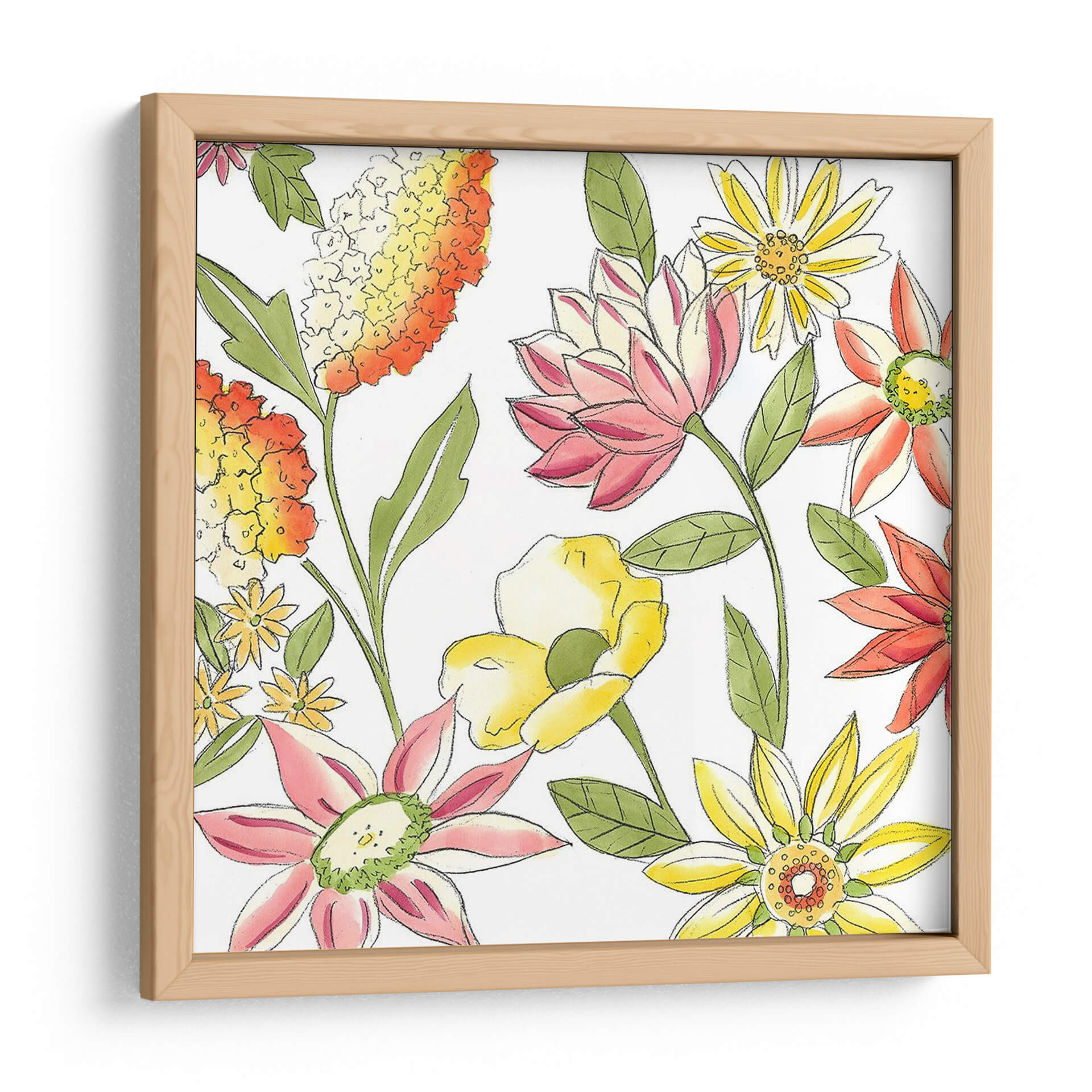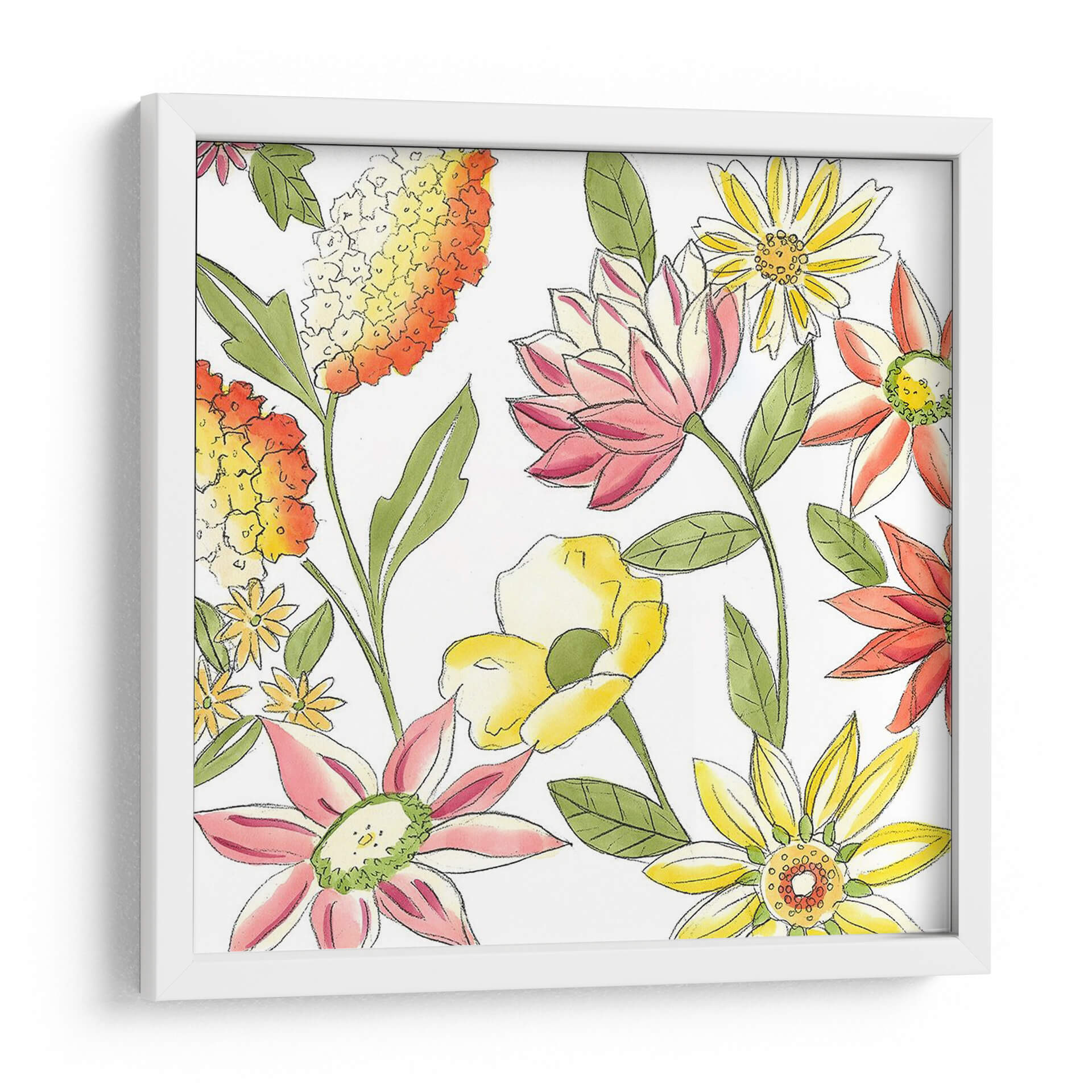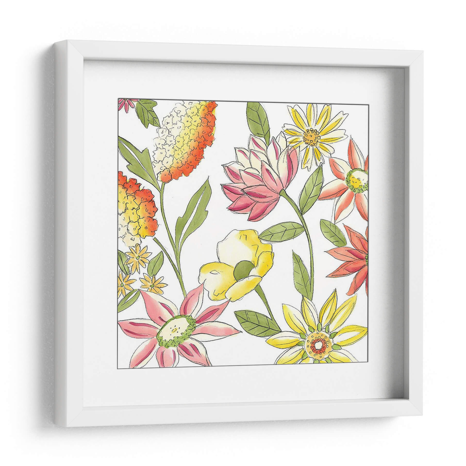 Sumérgete en la vitalidad y el encanto natural con el cuadro decorativo "Bouquet Garden I" de Chariklia Zarris. Esta obra evoca la frescura de un jardín floreciente, capturando la esencia de la primavera y el verano en una explosión de color y forma. Las flores, representadas con trazos delicados y acuarelas vibrantes, se despliegan en una composición alegre y dinámica sobre un fondo limpio que resalta su belleza intrínseca. La paleta de colores, que combina cálidos naranjas y amarillos con suaves rosas y toques de verde, crea una atmósfera de optimismo y serenidad, perfecta para infundir vida y alegría en cualquier espacio. El estilo, que combina elementos figurativos con una pincelada suelta y expresiva, confiere a la pieza un aire contemporáneo y accesible. Ideal para iluminar salones, dormitorios o estudios, "Bouquet Garden I" es una invitación a la contemplación de la naturaleza y un acento decorativo que aporta calidez y estilo a tu hogar. Transforma tu pared en un jardín de ensueño con esta pieza floral única.