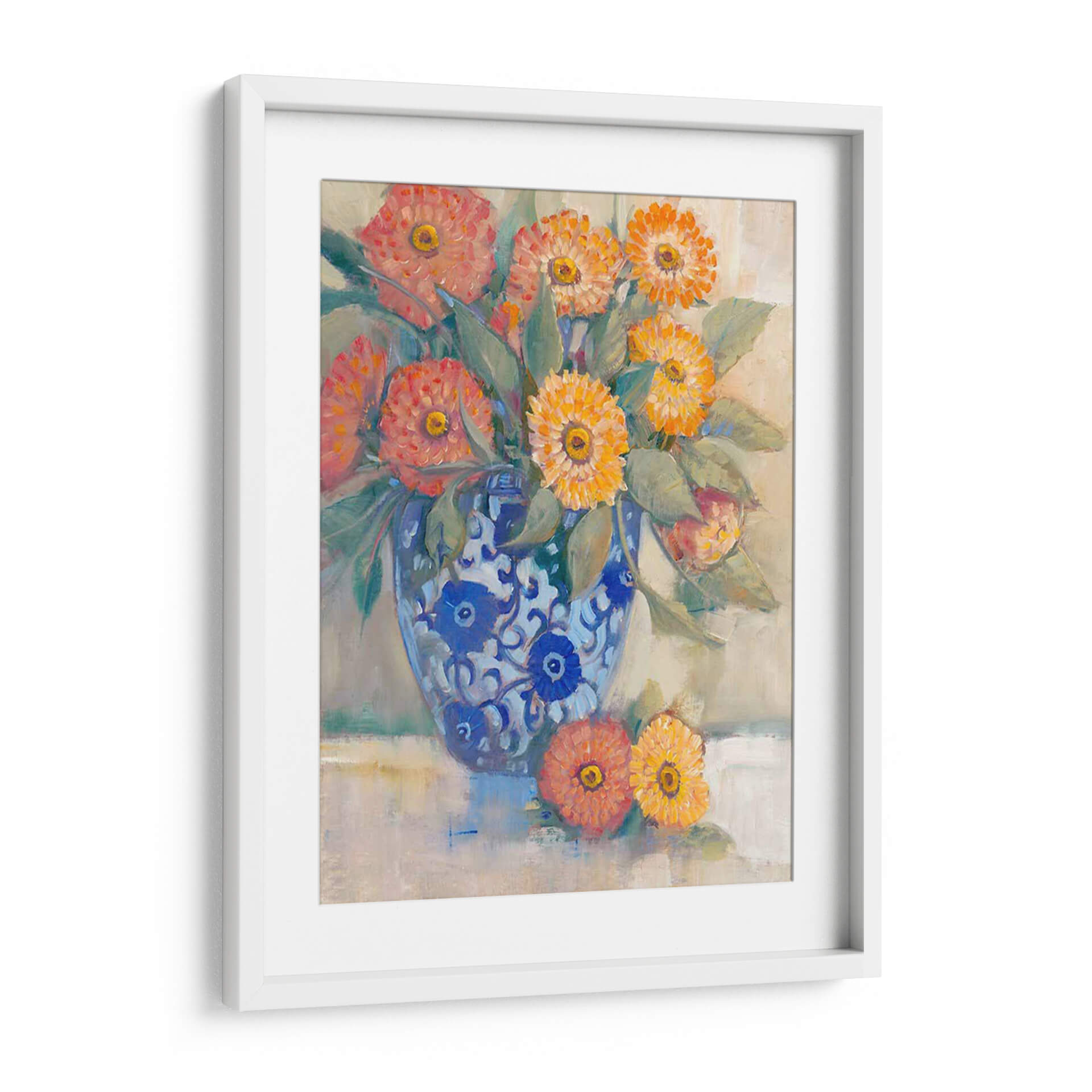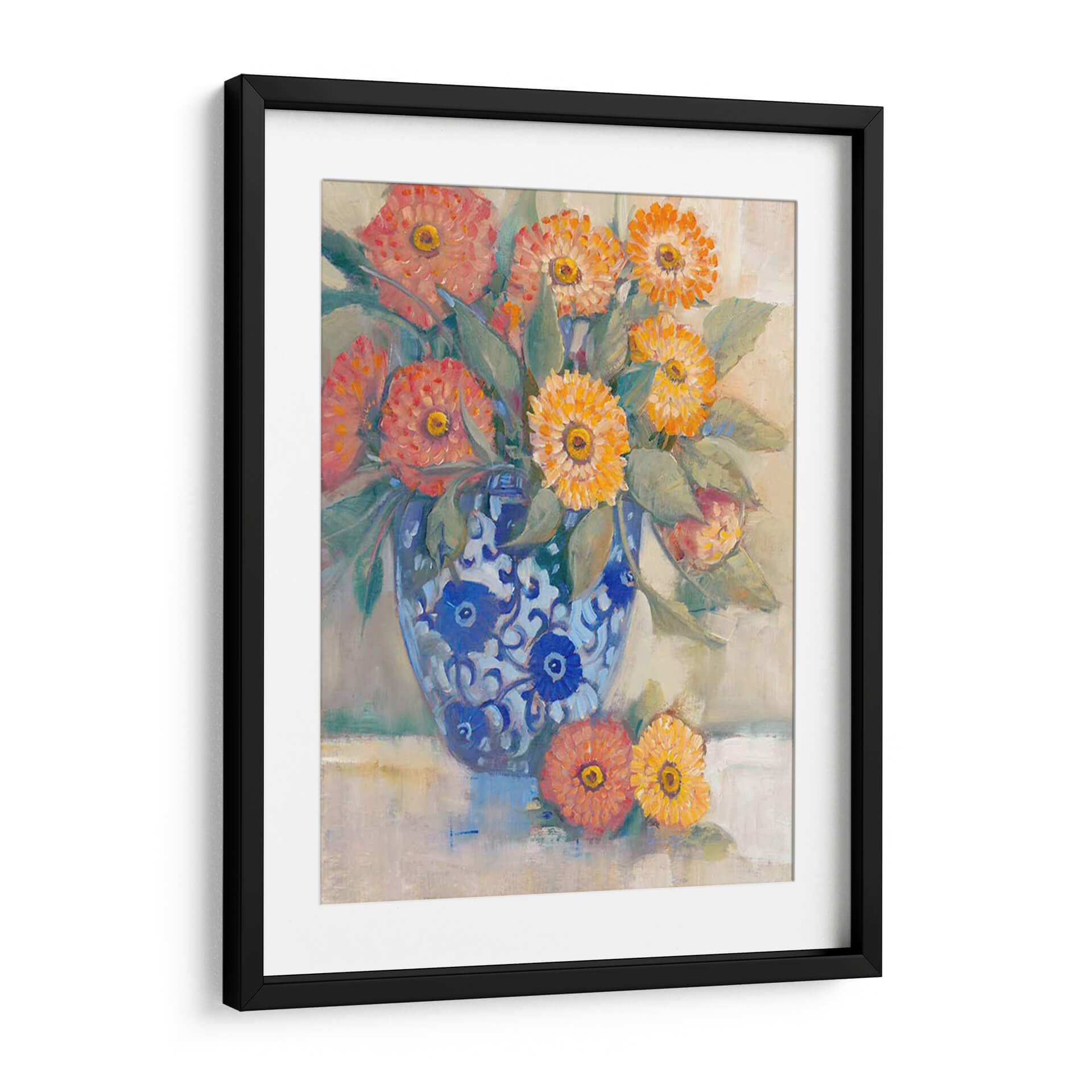 Embárcate en un viaje visual con 'Bouquet Oriental I', una obra de arte que captura la vibrante esencia de la naturaleza en un jarrón de cerámica intrincadamente decorado. Los colores cálidos y enérgicos de las flores, que van desde naranjas intensos hasta rosas suaves, contrastan armoniosamente con el azul profundo y los patrones blancos del jarrón, creando una composición visualmente cautivadora. La técnica de pintura, con pinceladas expresivas y una textura visible, añade una dimensión de profundidad y vida a la pieza, evocando una sensación de frescura y vitalidad.
