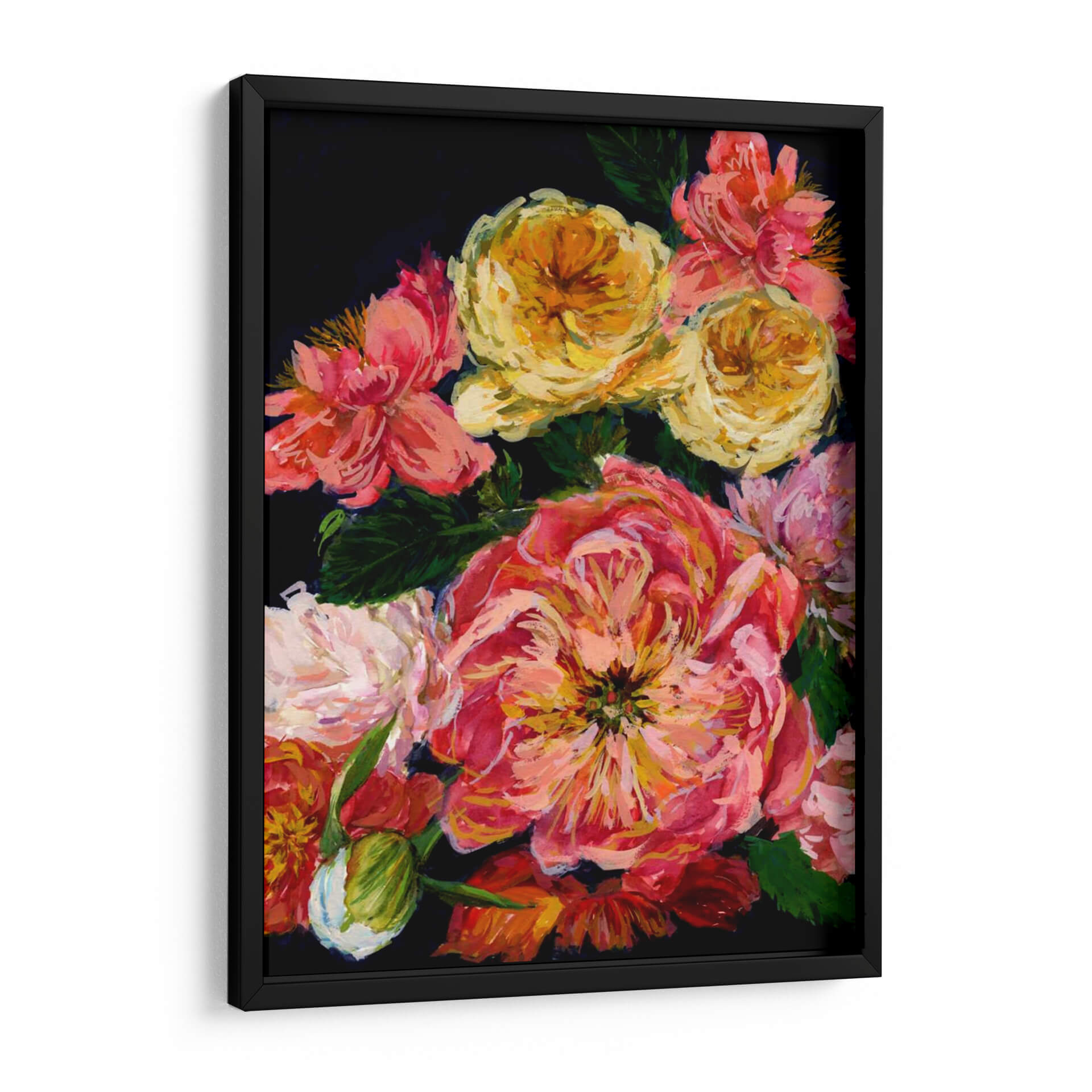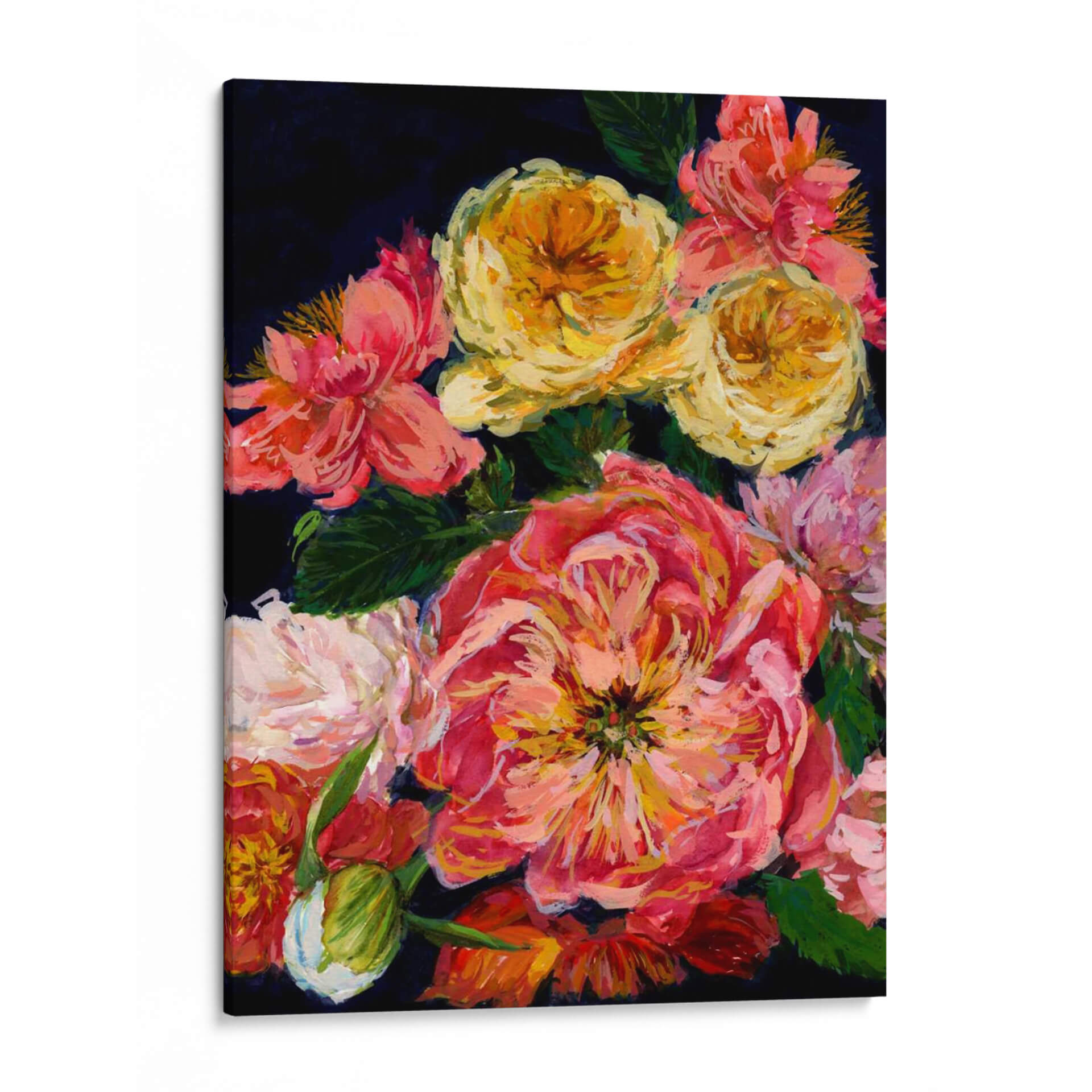 Embárcate en un viaje visual con "Bouquet Vintage III", una obra maestra de Melissa Wang que captura la exuberante belleza de un arreglo floral en su máxima expresión. Esta pieza presenta una profusión de rosas y peonías en diversas etapas de floración, bañadas en una paleta de colores vibrantes que van desde los cálidos rosas y naranjas hasta los alegres amarillos dorados. El contraste con el fondo oscuro y profundo resalta la riqueza de cada pétalo y la delicadeza de las hojas verdes, creando una atmósfera de elegancia atemporal y romance. La técnica pictórica, con pinceladas audaces y expresivas, añade textura y vitalidad a la composición, invitando al espectador a apreciar la belleza efímera de la naturaleza. Este cuadro decorativo es perfecto para infundir calidez y un toque de sofisticación en cualquier estancia, desde salones y comedores hasta dormitorios o estudios. Su estilo evoca una sensación de nostalgia y encanto, haciendo de "Bouquet Vintage III" una adición exquisita para quienes buscan añadir un elemento de belleza clásica y apasionada a su hogar.