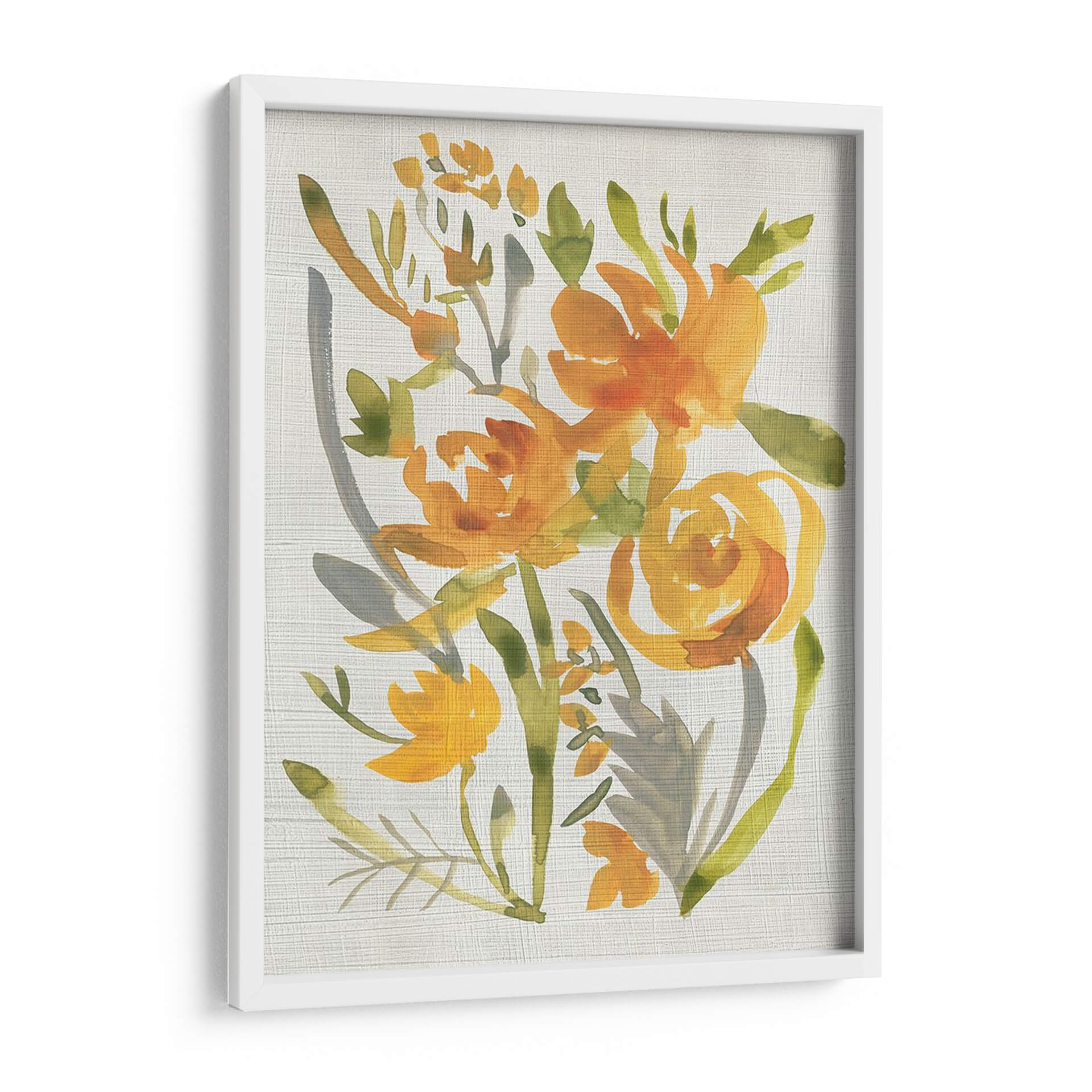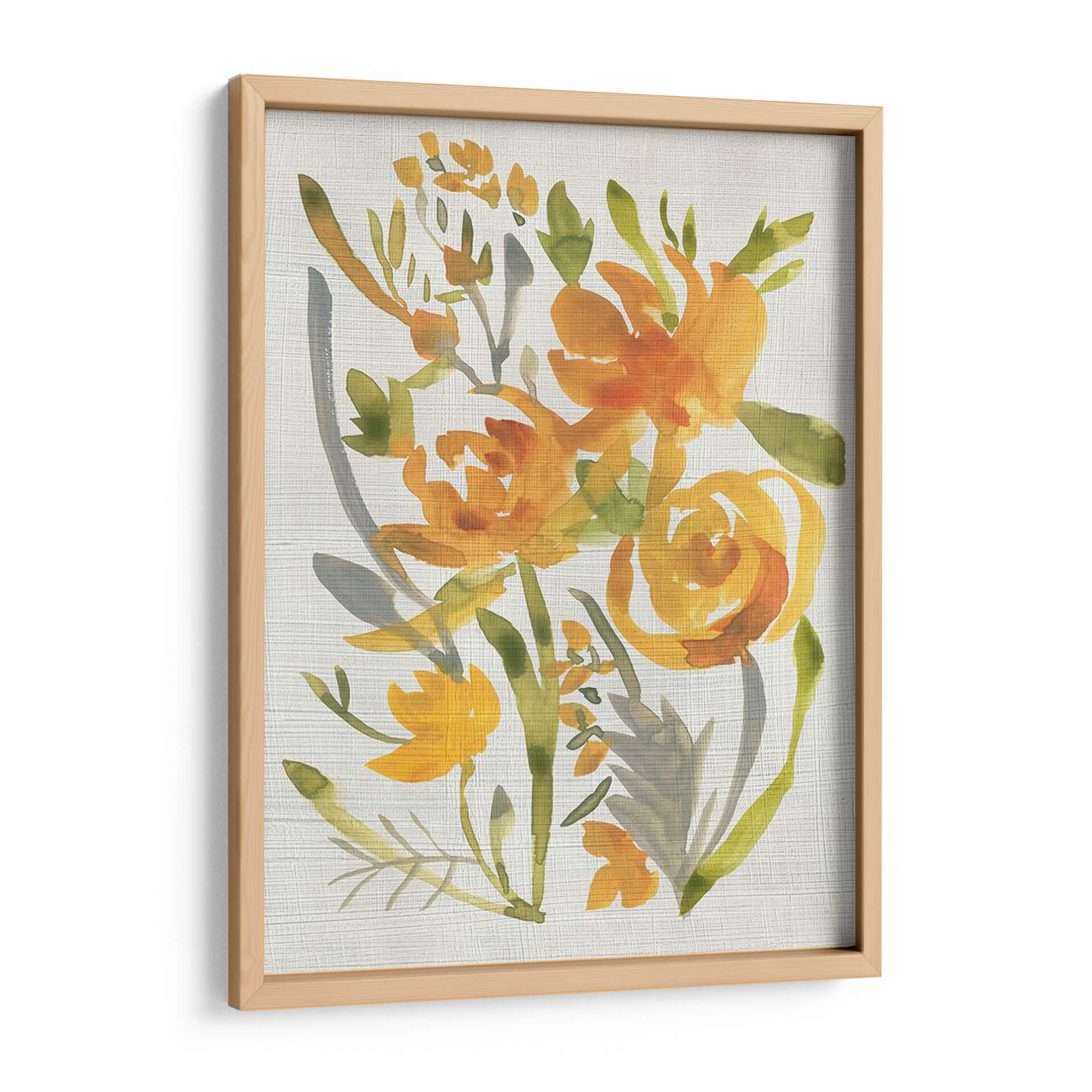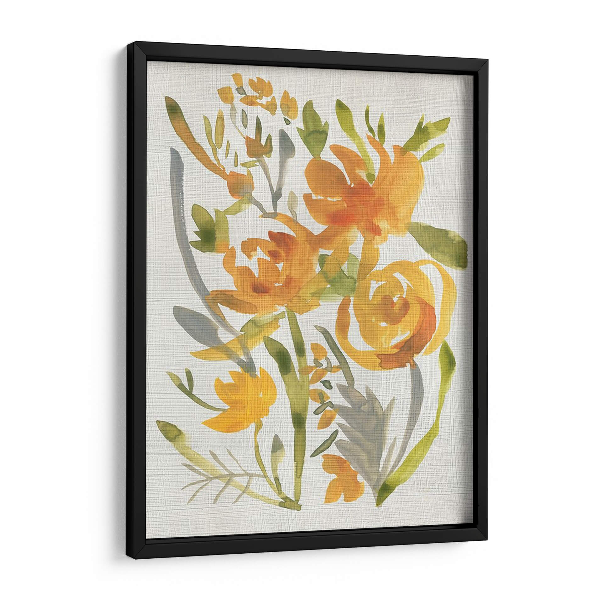 Sumérgete en la delicadeza y el vibrante encanto de "Butterscotch Bouquet II", una obra de arte floral que captura la esencia de la primavera con una técnica acuarela cautivadora. Este cuadro decorativo presenta un ramo de flores en tonos cálidos de caramelo, naranja y amarillo, contrastando sutilmente con hojas en verdes y grises suaves. La composición, que evoca la frescura de un jardín recién descubierto, se despliega sobre un fondo texturizado que aporta profundidad y realismo. El estilo etéreo y suelto de Chariklia Zarris, con pinceladas que fluyen como el agua, dota a la pieza de una ligereza y una sensación de movimiento, invitando a la contemplación serena. Es una adición perfecta para espacios que buscan un toque de alegría y sofisticación natural. Ideal para iluminar salones modernos, dar vida a dormitorios o añadir un acento de color y calma a oficinas. Este lienzo es una ventana a la belleza efímera de las flores, transformando cualquier pared en un jardín de inspiración. Añade un toque de naturaleza y arte contemporáneo a tu hogar con esta pieza única que celebra la vitalidad de la naturaleza en su máxima expresión.
