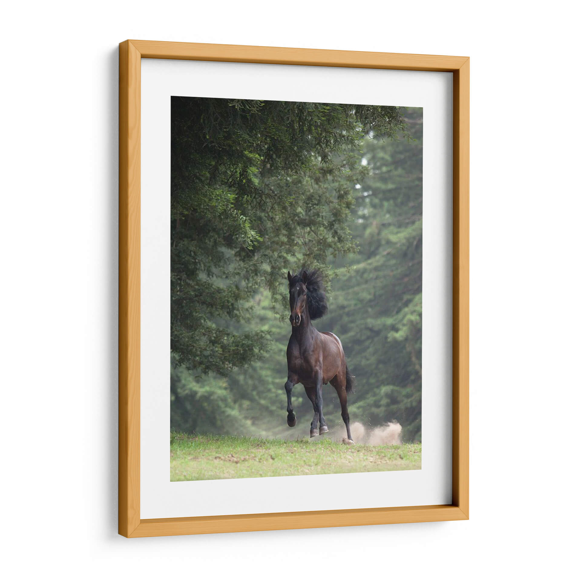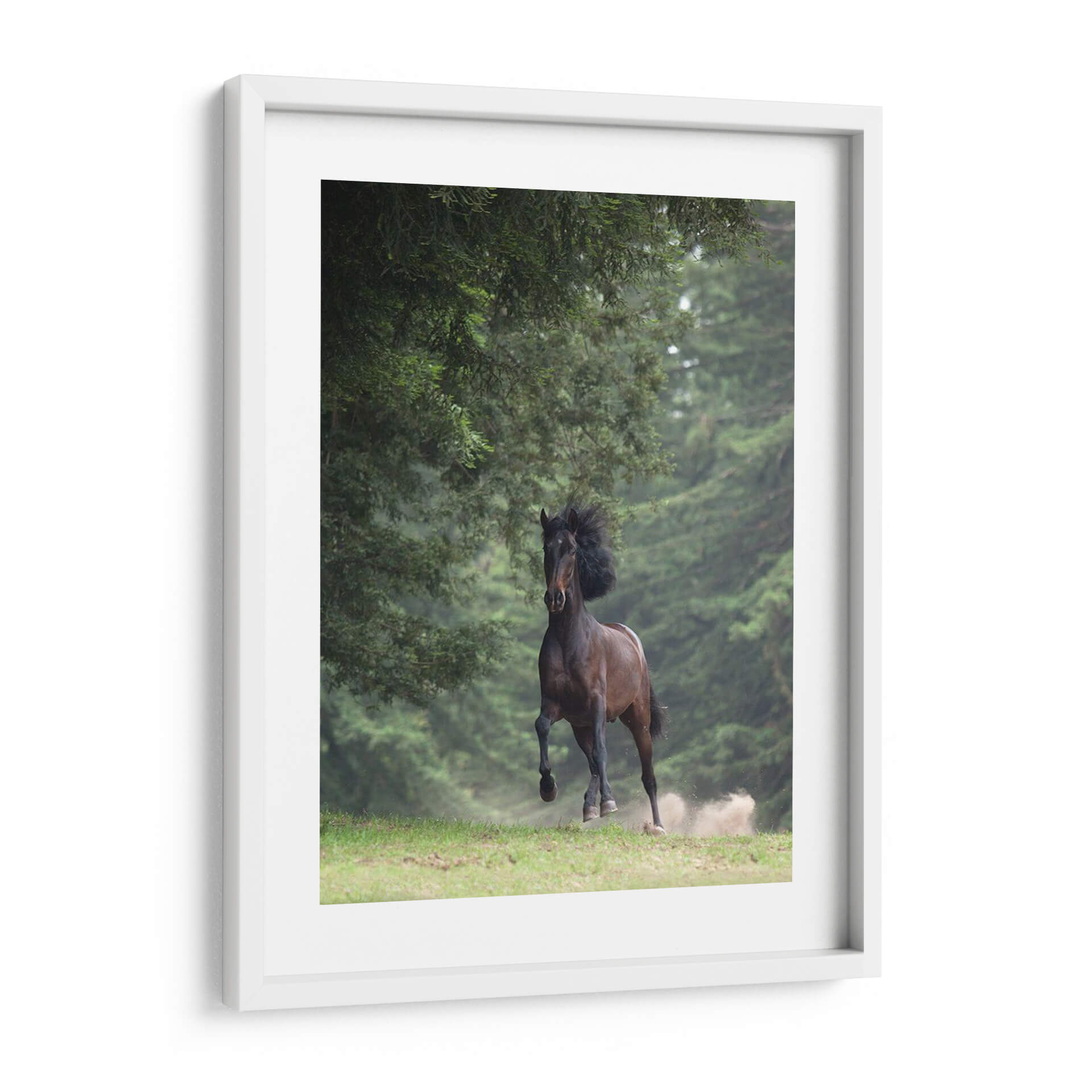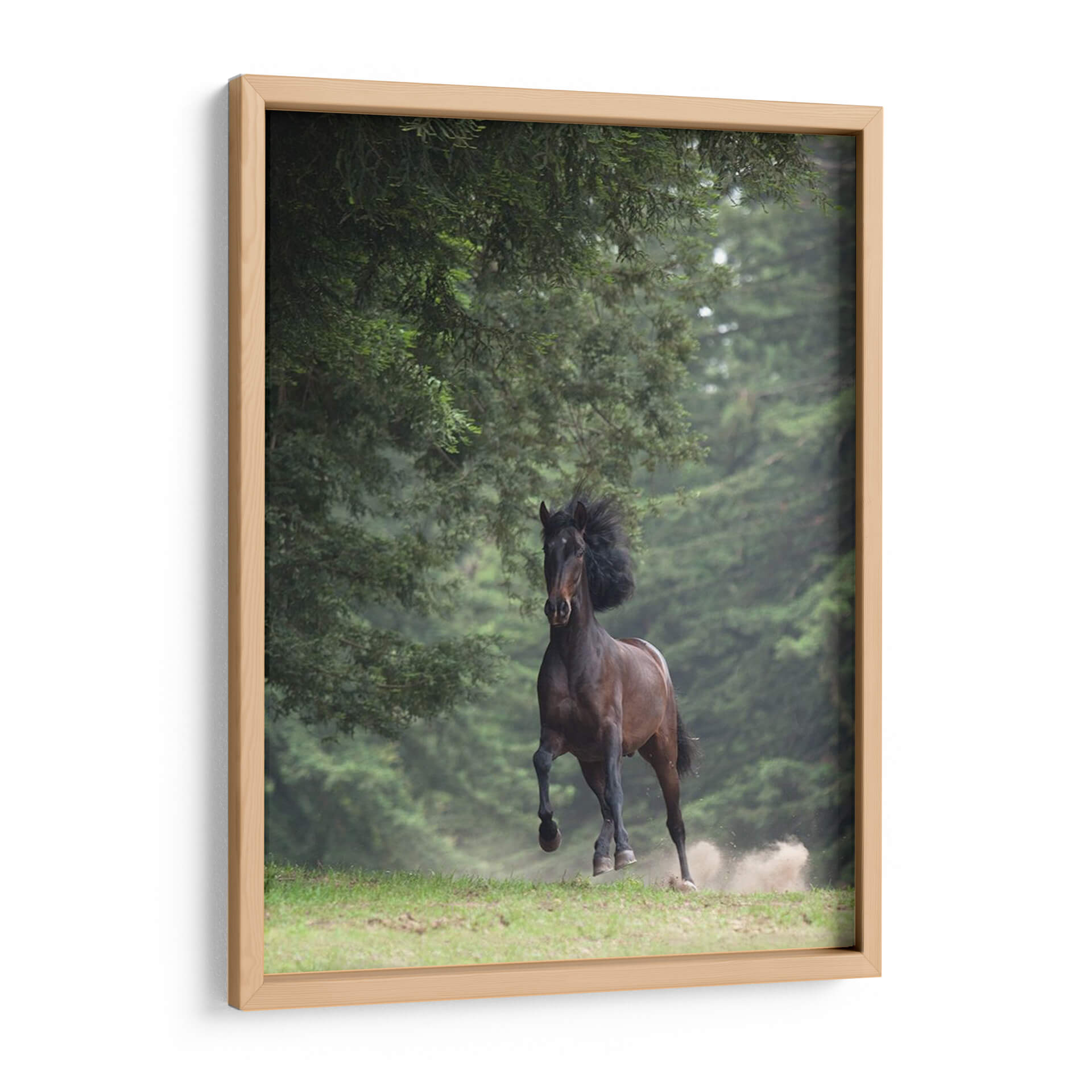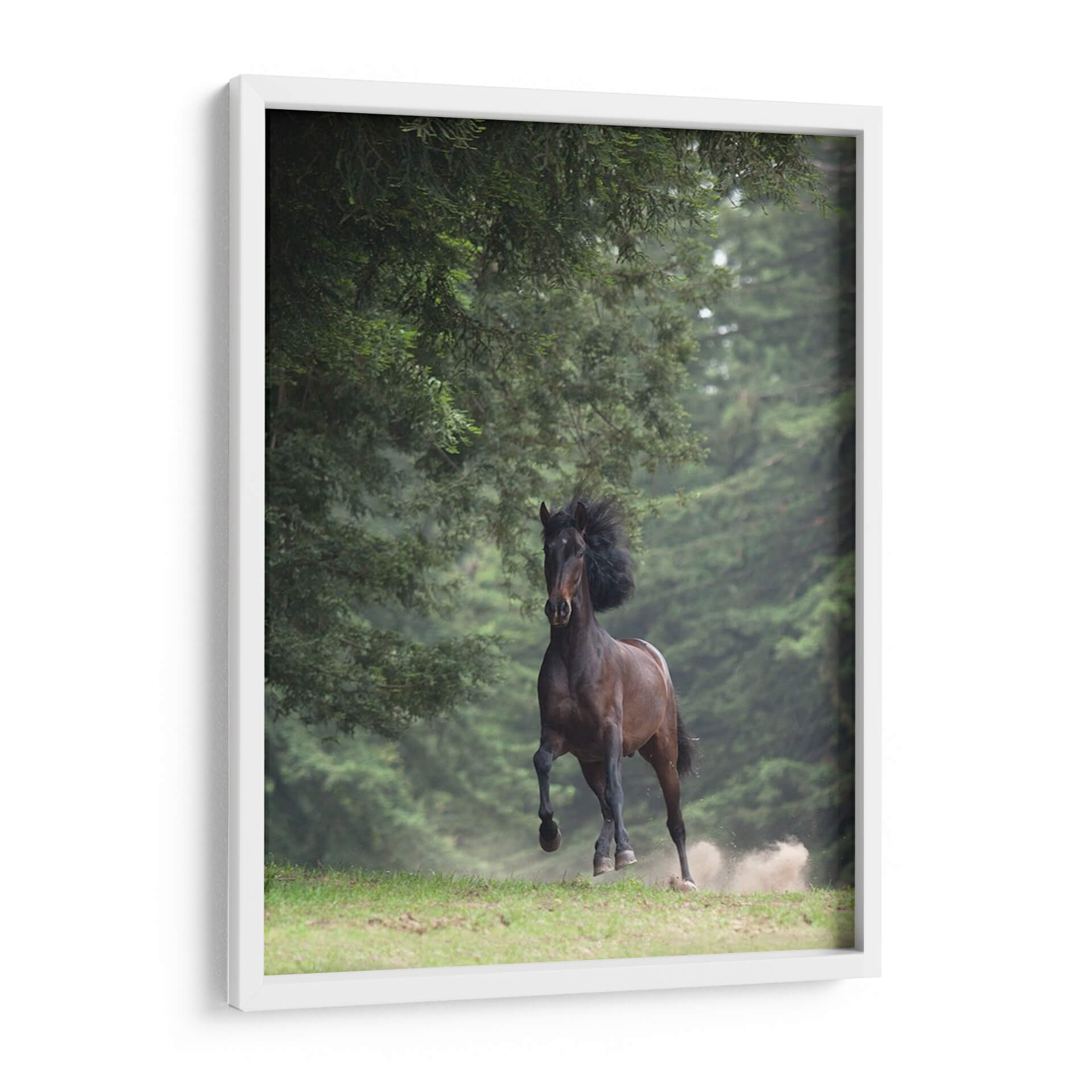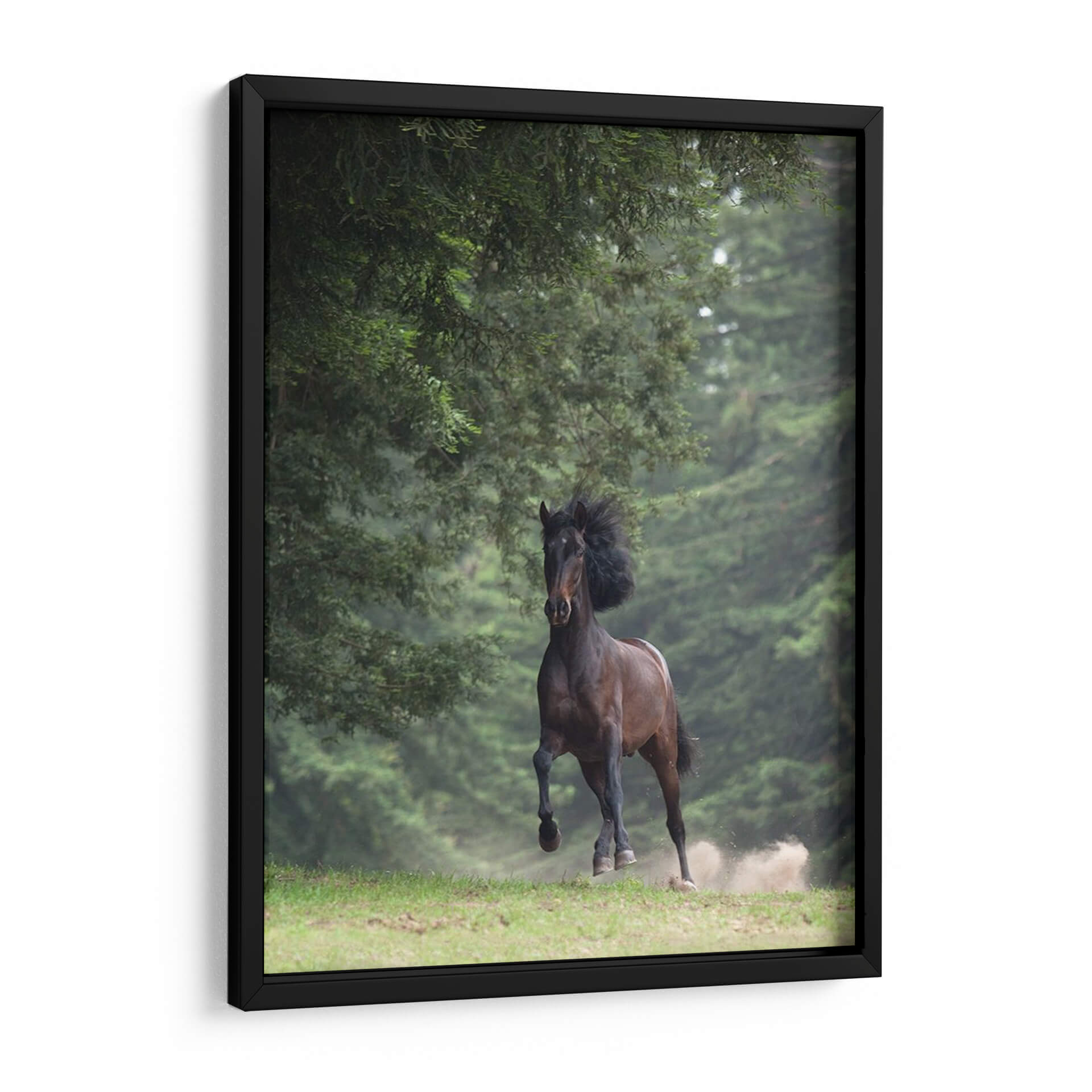 Captura la fuerza y la elegancia indómita con este impresionante cuadro decorativo de un caballo en movimiento. La obra maestra de Allen Friedlander, titulada "Caballo En Los Árboles Iii", transporta al espectador a un bosque sereno donde la naturaleza y la majestuosidad animal se fusionan en una escena dinámica. Los verdes profundos del follaje crean un telón de fondo exuberante que contrasta maravillosamente con el tono terroso y poderoso del caballo. La composición se centra en el equino, capturando el momento justo de su galope, con el polvo levantándose del suelo, lo que añade una sensación de movimiento y vitalidad a la pieza. La iluminación suave y la atmósfera ligeramente neblinosa sugieren un ambiente de tranquilidad y misterio. Este cuadro decorativo es ideal para infundir energía y un toque de la naturaleza salvaje en cualquier espacio, ya sea una sala de estar moderna, un estudio privado o una oficina que busque inspiración. Añade un elemento de conexión con el mundo natural y la libertad que representa el caballo a tu decoración.