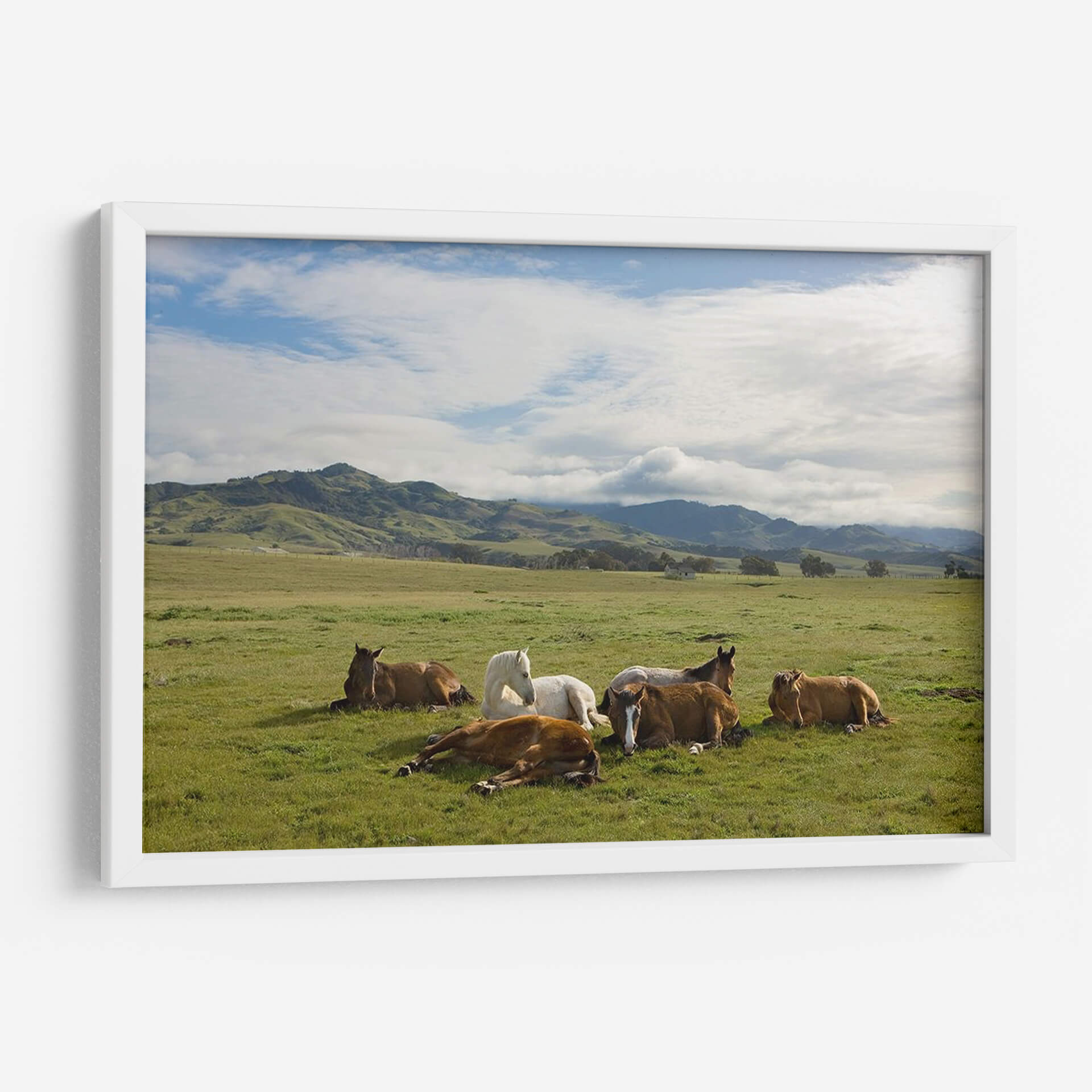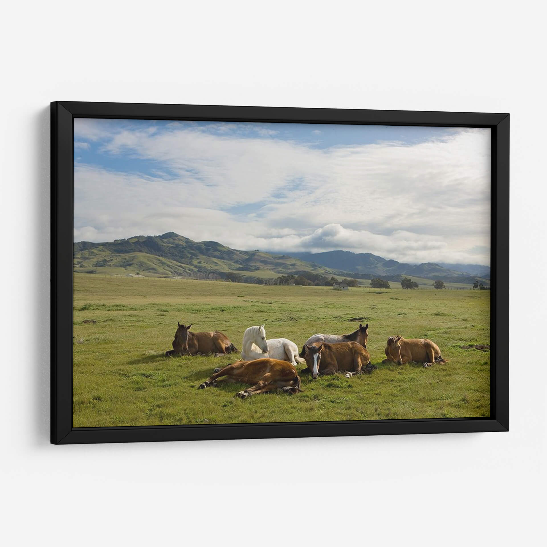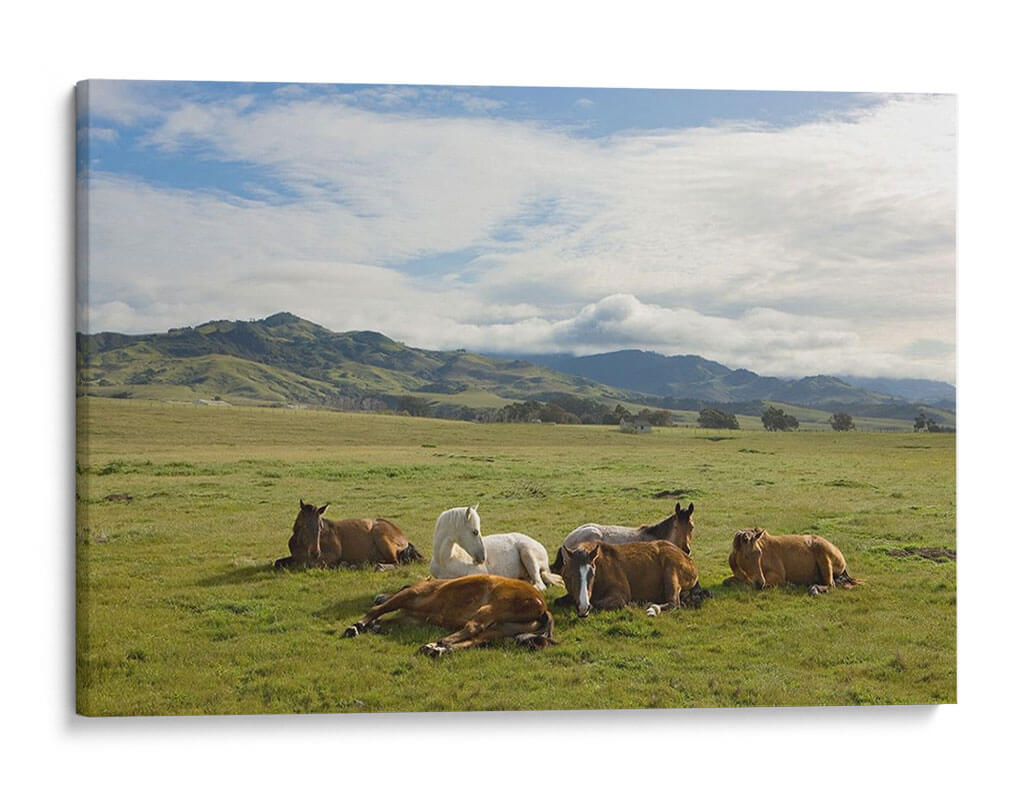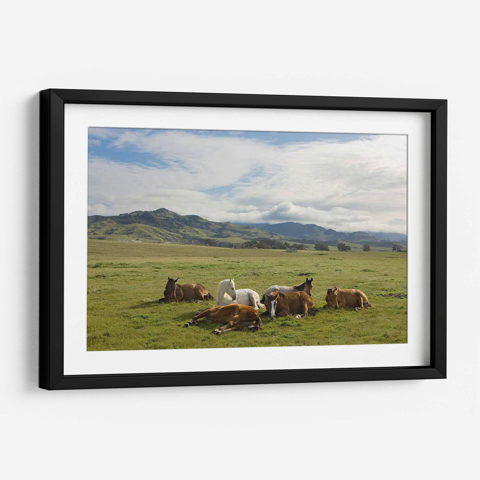 Captura la esencia de la tranquilidad rural con este evocador cuadro decorativo de caballos descansando en un prado verde bajo un cielo nublado. La obra, titulada 'Caballos De Descanso, San Simeón' del artista Robert Hansen, presenta un grupo de equinos en reposo, con la majestuosa cadena montañosa de San Simeón como telón de fondo. Los tonos tierra de los caballos contrastan armoniosamente con el vibrante verde de la hierba y los suaves azules y blancos del cielo, creando una atmósfera de paz y serenidad. El estilo fotográfico y la composición natural invitan a la contemplación, transportando al espectador a un momento de calma bucólica. Este cuadro decorativo es ideal para añadir un toque de naturaleza y sosiego a tu sala de estar, dormitorio u oficina, convirtiéndose en un punto focal que inspira relajación y conexión con el entorno natural. Su belleza atemporal y su temática universal lo hacen perfecto para cualquier espacio que busque transmitir una sensación de paz y simplicidad.