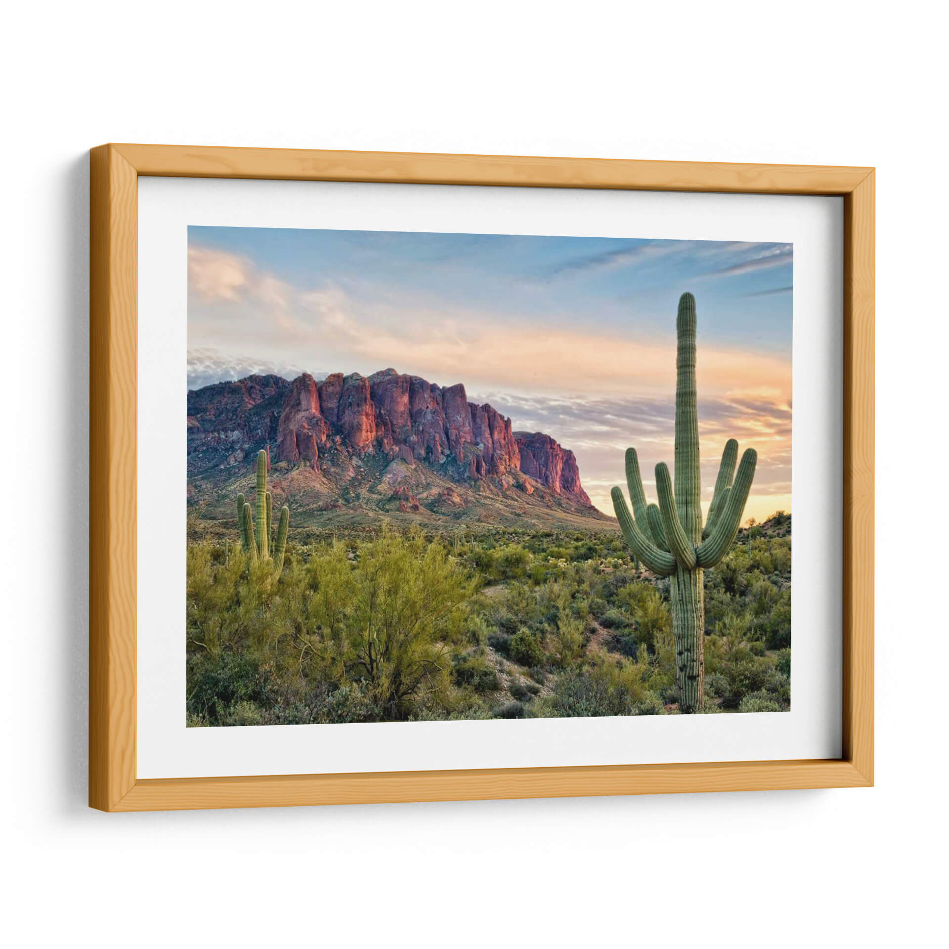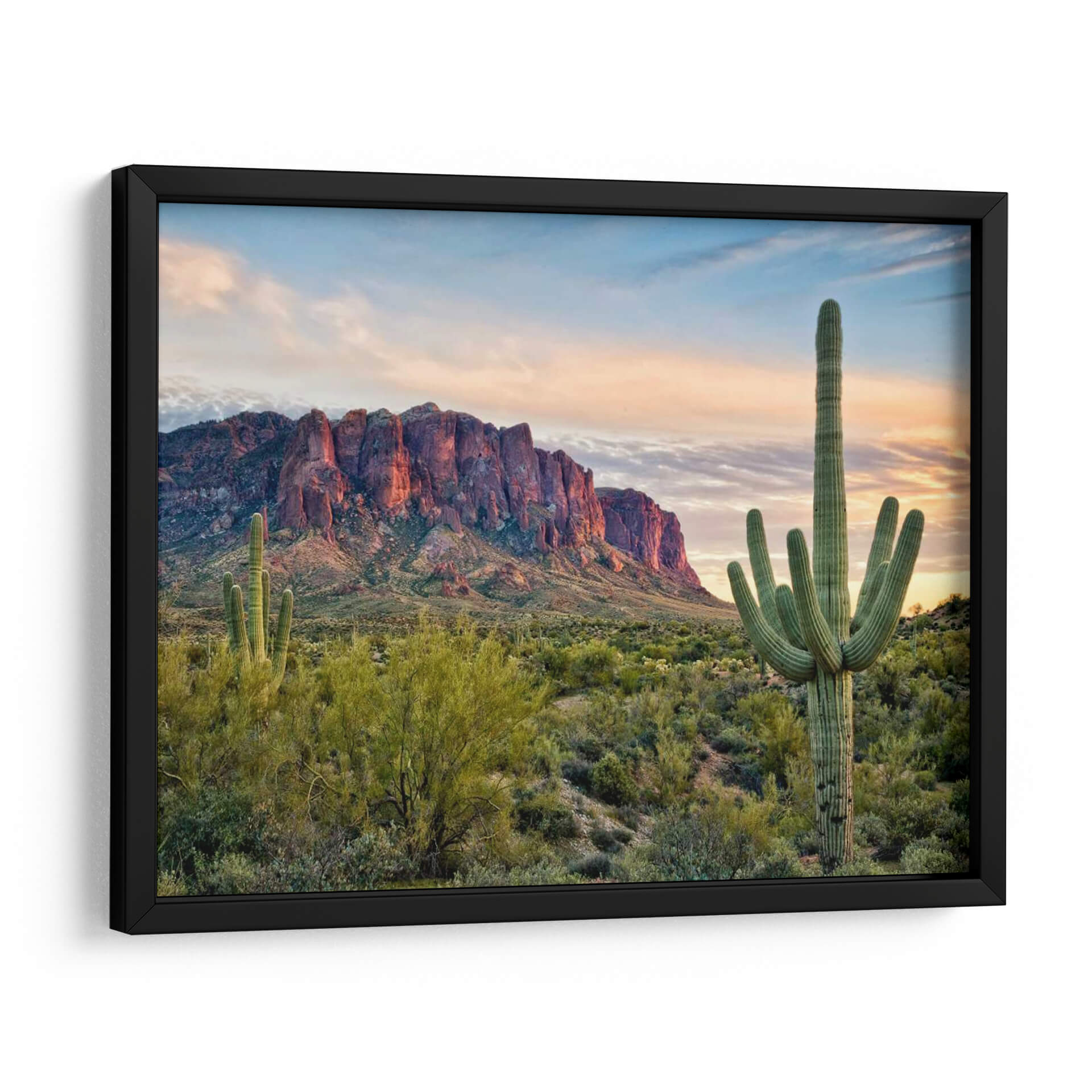 Sumérgete en la majestuosidad del desierto con "Cactus View II", una obra de arte que captura la esencia salvaje y serena de un paisaje icónico. David Drost nos transporta a un atardecer en el suroeste, donde las imponentes montañas rocosas se tiñen de tonos cálidos y rojizos bajo la caricia de la luz dorada. En primer plano, un saguaro monumental se alza con orgullo, sus brazos extendidos hacia el cielo azul crepuscular, salpicado de nubes tenues y rosadas. La vegetación desértica, representada con un realismo detallado, crea una textura rica y un contraste vibrante con la roca y el cielo. Esta pieza evoca una sensación de paz profunda, aventura y la belleza indómita de la naturaleza. "Cactus View II" es ideal para añadir un toque de calidez y carácter a tu sala de estar, estudio u oficina, fusionando la fuerza del paisaje con la delicadeza de la luz del atardecer. Un cuadro decorativo perfecto para amantes de la naturaleza y de los espacios amplios y luminosos.