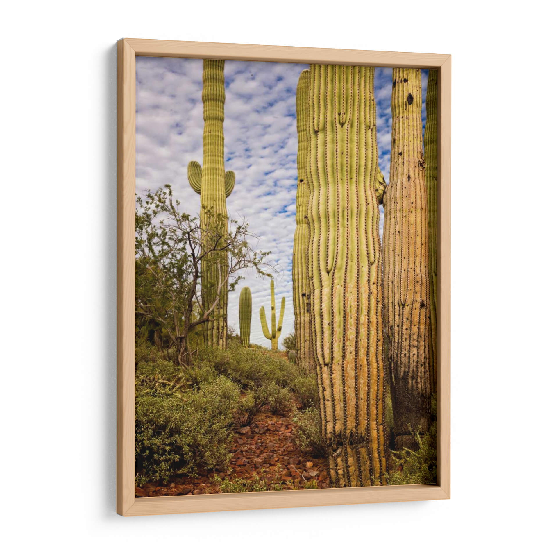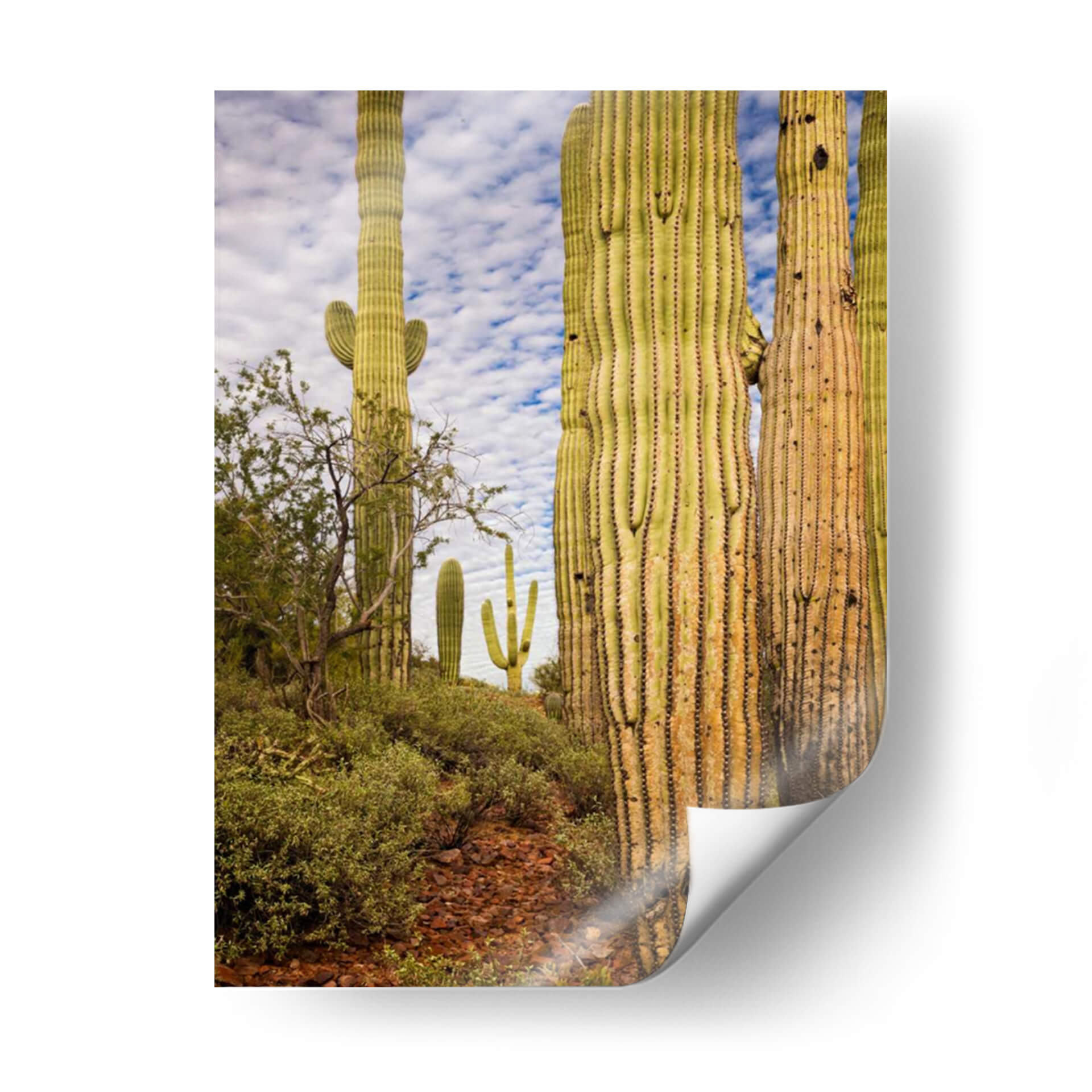Sumérgete en la majestuosidad del desierto con "Cactus View Iv", una obra de David Drost que captura la esencia de los imponentes cactus saguaro bajo un cielo azul vibrante y nubes algodonosas. Esta pieza fotográfica, con su enfoque detallado en las texturas rugosas y las formas esculturales de estos gigantes del desierto, te transportará directamente a un paisaje árido bañado por el sol. La paleta de colores, dominada por verdes y amarillos terrosos de los cactus, contrasta armoniosamente con el azul del cielo y los tonos rojizos del suelo, creando una atmósfera de calma y resistencia. La composición, que juega con la profundidad y la escala, resalta la presencia imponente de los cactus frontales mientras revela un grupo más pequeño en la distancia, sugiriendo la vastedad del entorno. Ideal para quienes buscan infundir serenidad y un toque de naturaleza salvaje en sus espacios, este cuadro decorativo es perfecto para salones, oficinas o cualquier lugar donde se desee un recordatorio de la belleza resiliente del mundo natural. Añade un aire de tranquilidad y aventura a tu decoración con esta cautivadora vista del desierto.