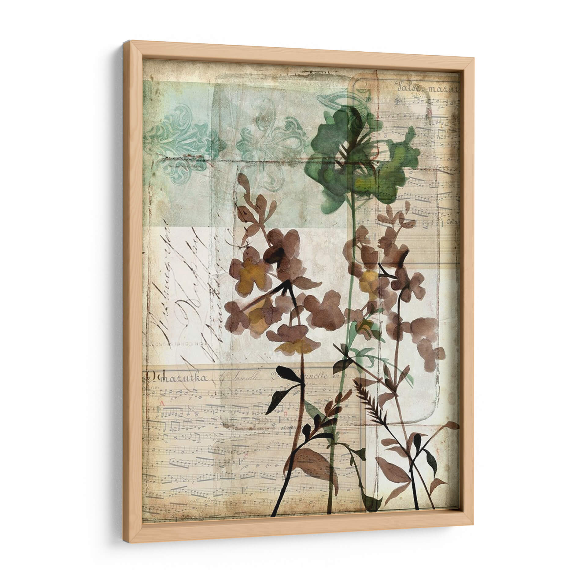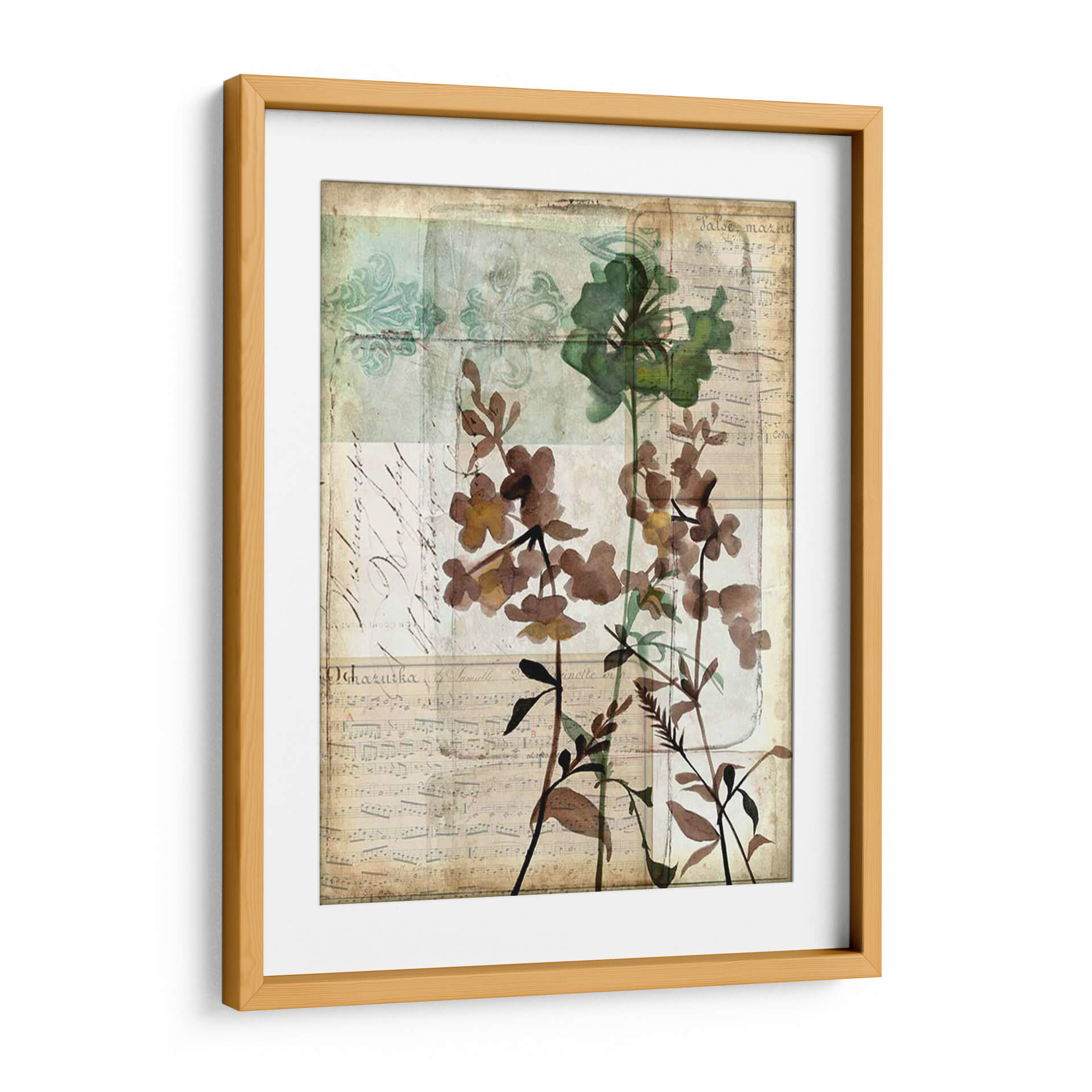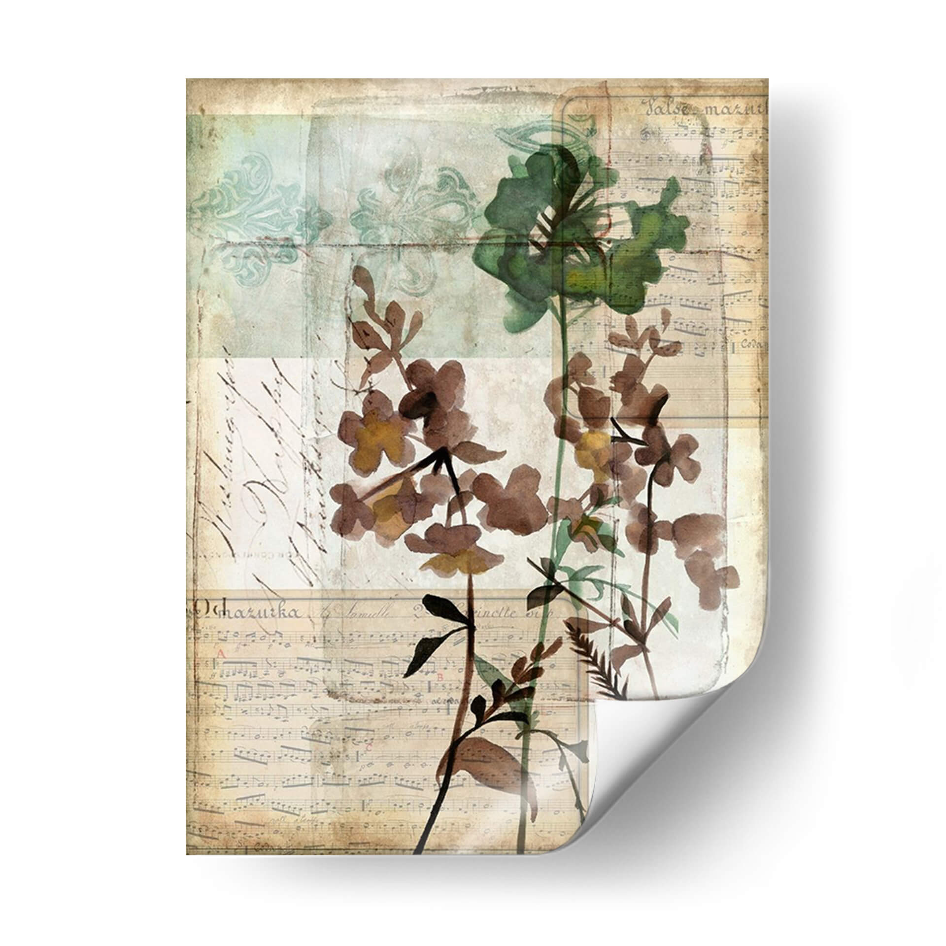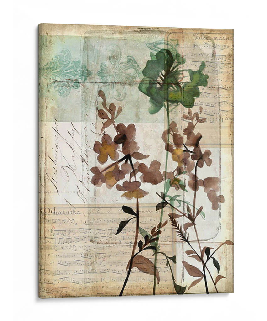 Sumérgete en la delicadeza y el encanto atemporal de "Caja De Música Floral Ii", una obra de arte que evoca la belleza serena de la naturaleza con un toque de nostalgia. Esta pieza, creada por Jennifer Goldberger, fusiona elementos botánicos con texturas que recuerdan a partituras antiguas y caligrafía desvanecida, creando una atmósfera poética y etérea. Los tonos tierra, marrones suaves y verdes apagados se entrelazan con sutiles toques de aguamarina y beige, aportando una sensación de calma y sofisticación a cualquier espacio. Las flores, representadas con una técnica que sugiere acuarela o xilografía, parecen flotar sobre un fondo texturizado, invitando a la contemplación. Su composición vertical y el estilo collage le otorgan una profundidad única, haciéndola ideal para añadir un punto de interés visual en salones, dormitorios o estudios. "Caja De Música Floral Ii" no es solo un cuadro decorativo; es una ventana a un mundo de armonía floral y ecos musicales, perfecta para quienes buscan una decoración de pared que hable de elegancia sutil y conexión con la belleza clásica.