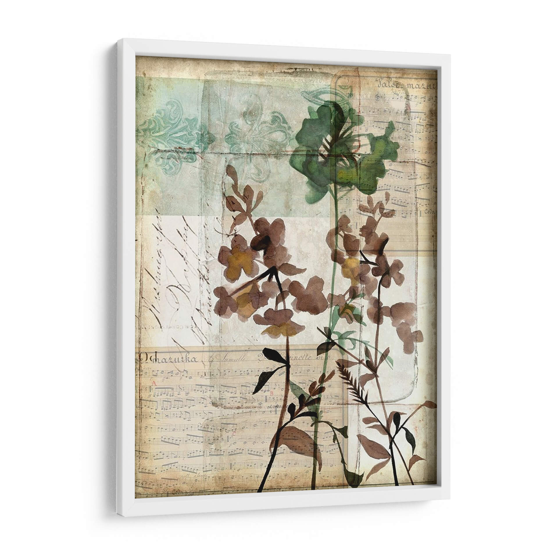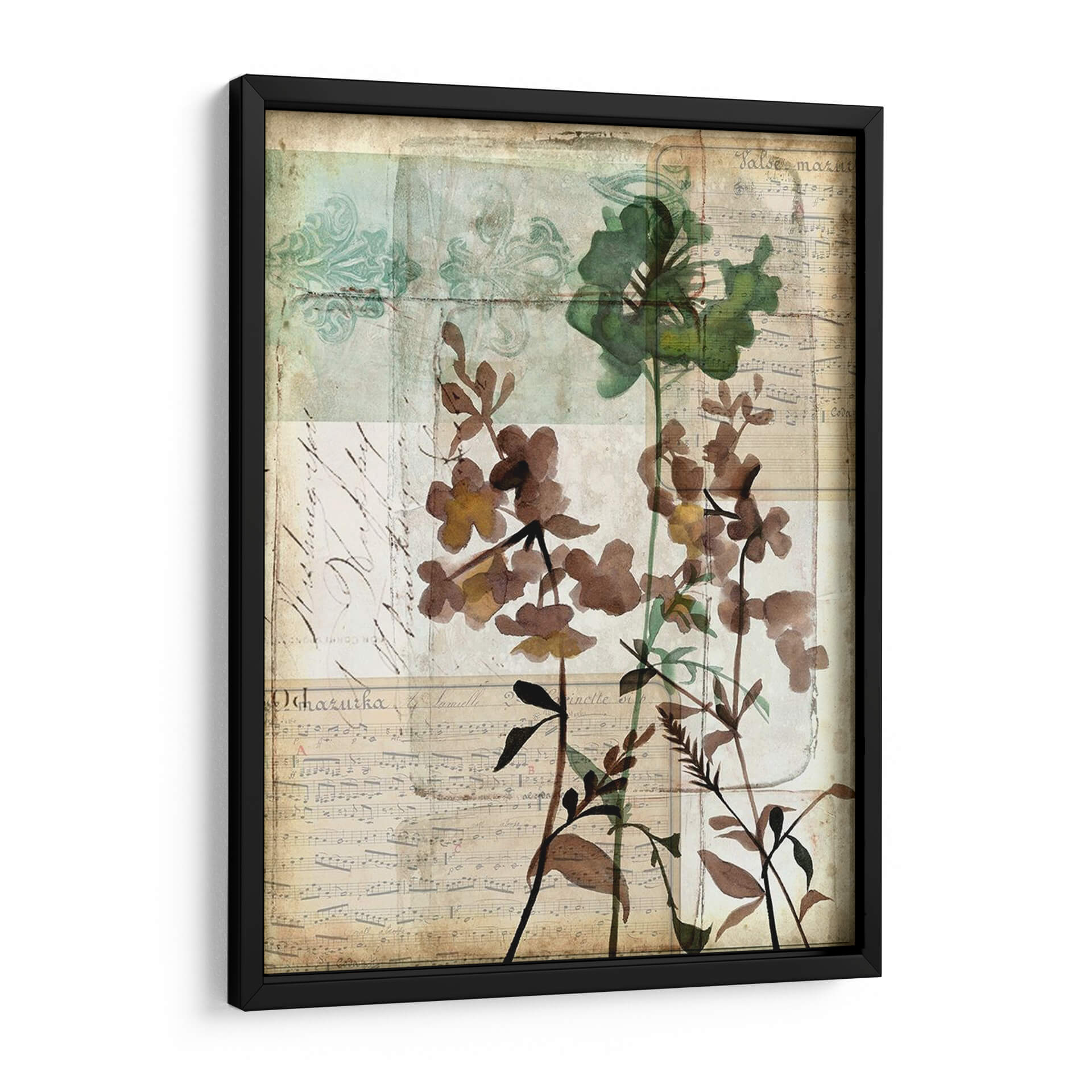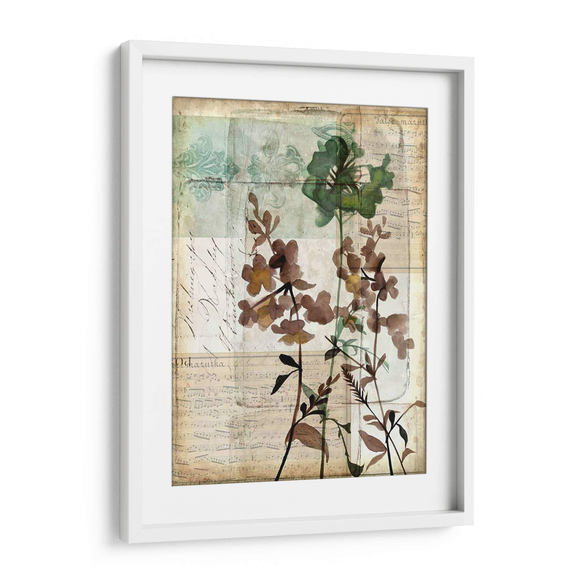 Sumérgete en la delicadeza y el encanto atemporal de "Caja De Música Floral Ii", una obra de arte que evoca la belleza serena de la naturaleza con un toque de nostalgia. Esta pieza, creada por Jennifer Goldberger, fusiona elementos botánicos con texturas que recuerdan a partituras antiguas y caligrafía desvanecida, creando una atmósfera poética y etérea. Los tonos tierra, marrones suaves y verdes apagados se entrelazan con sutiles toques de aguamarina y beige, aportando una sensación de calma y sofisticación a cualquier espacio. Las flores, representadas con una técnica que sugiere acuarela o xilografía, parecen flotar sobre un fondo texturizado, invitando a la contemplación. Su composición vertical y el estilo collage le otorgan una profundidad única, haciéndola ideal para añadir un punto de interés visual en salones, dormitorios o estudios. "Caja De Música Floral Ii" no es solo un cuadro decorativo; es una ventana a un mundo de armonía floral y ecos musicales, perfecta para quienes buscan una decoración de pared que hable de elegancia sutil y conexión con la belleza clásica.