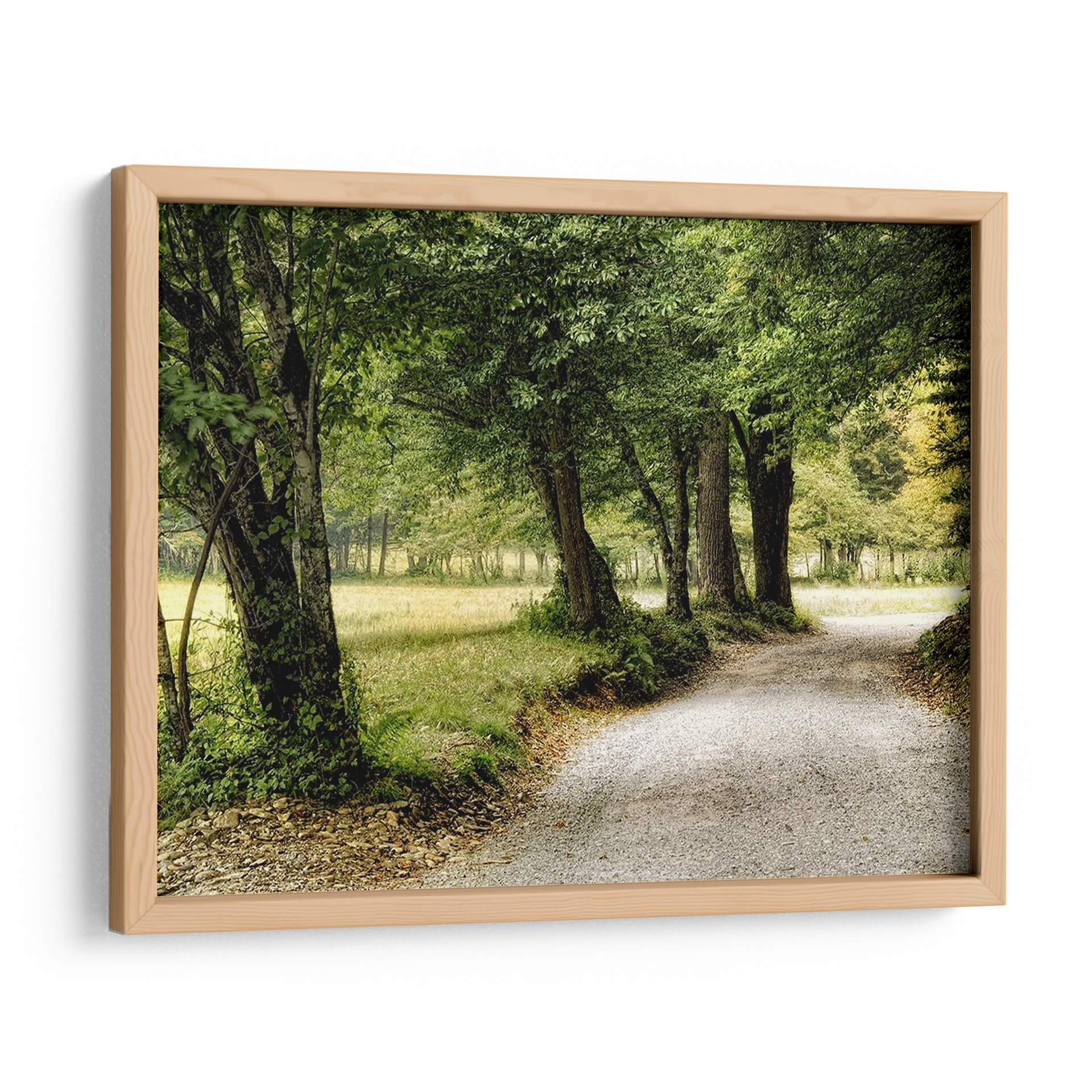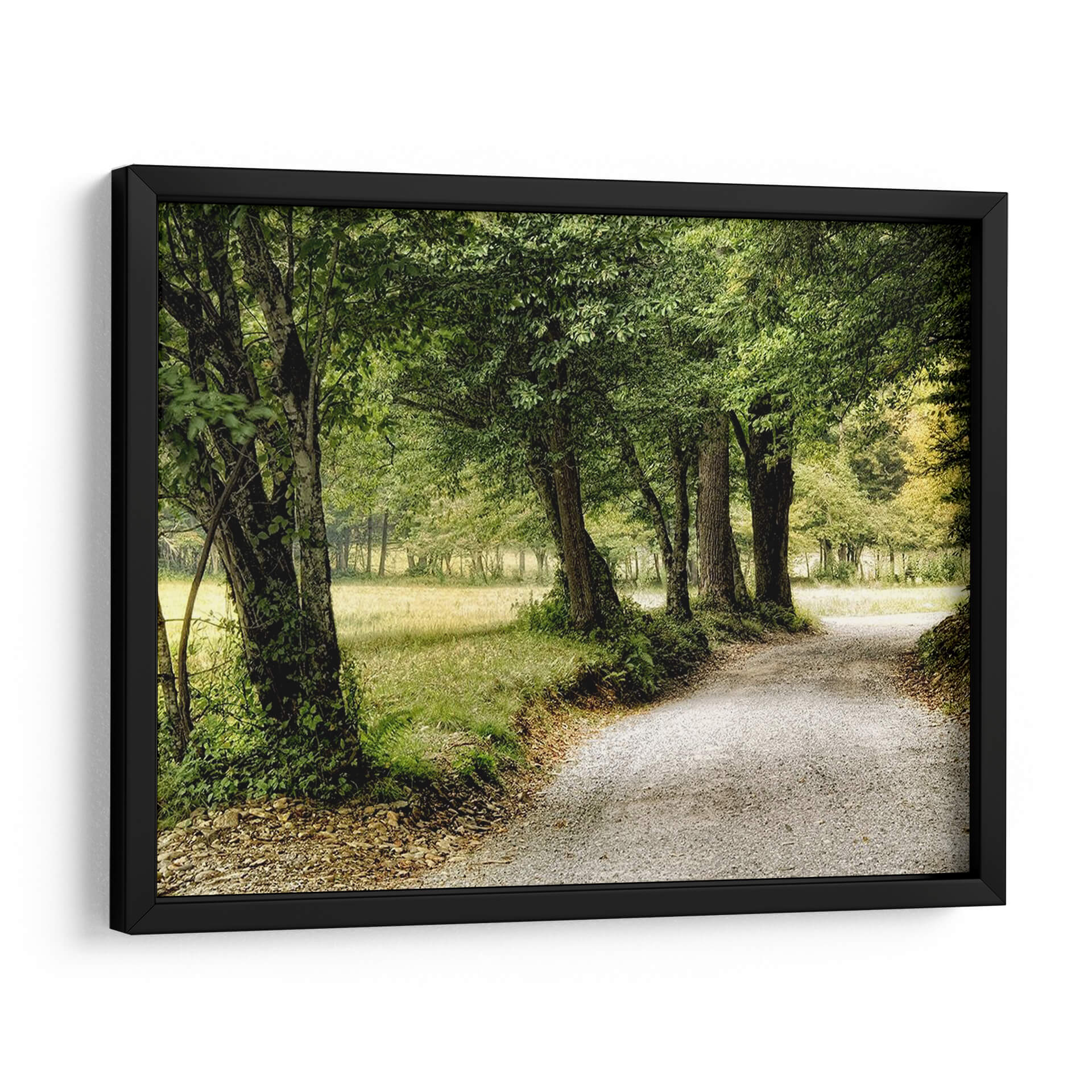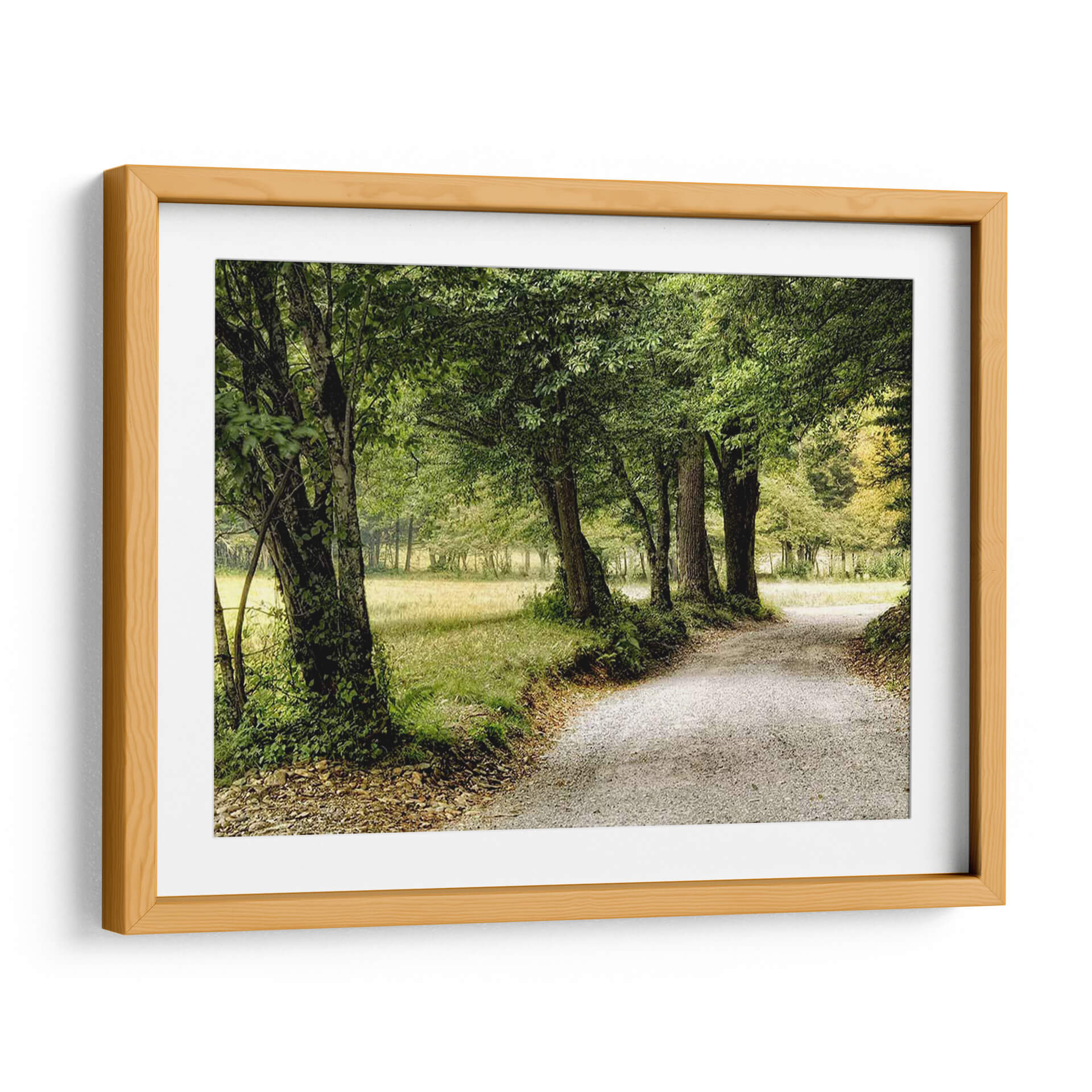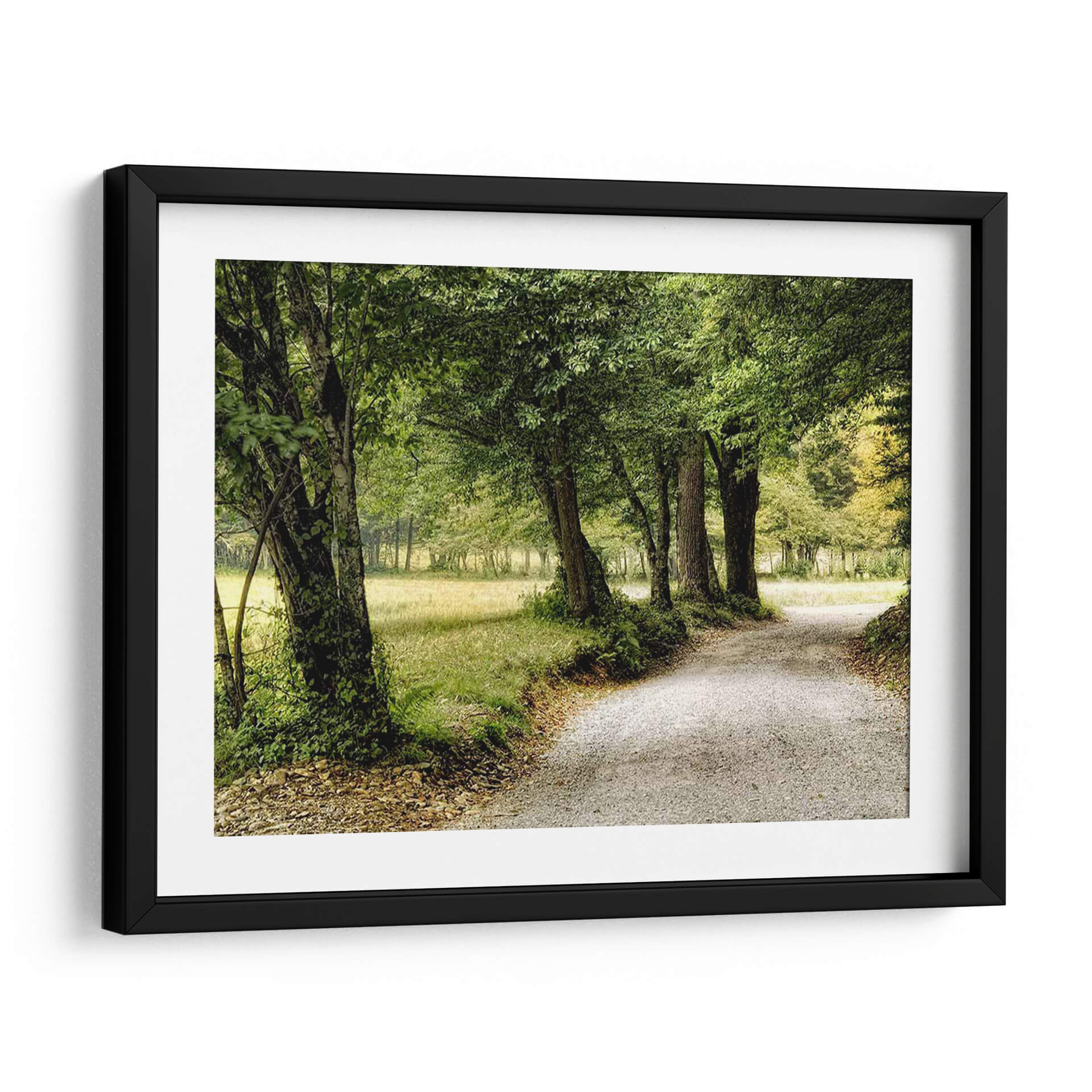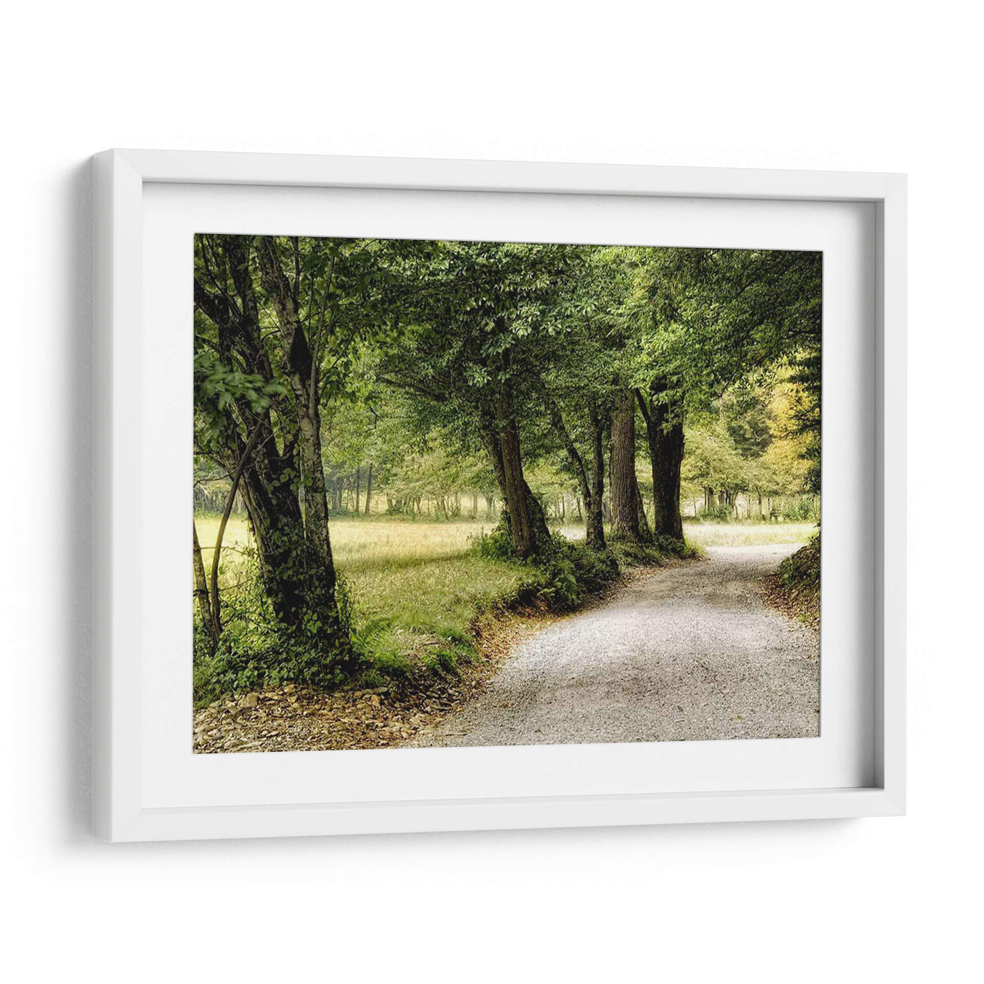 Emb rquese en un viaje visual con "Camino En El Pais", una obra de arte que captura la esencia serena de un sendero bordeado por la exuberancia de la naturaleza. La imagen presenta un camino de grava serpenteante que se adentra en un paisaje frondoso, flanqueado por árboles majestuosos cuyas copas forman un dosel verde. La paleta de colores se centra en tonos de verde vibrante y terrosos, evocando una profunda conexión con el entorno natural y transmitiendo una sensación de paz y tranquilidad. La composición guía la mirada del espectador a lo largo del camino, invitando a la contemplación y al descubrimiento. Este cuadro decorativo es perfecto para aquellos que buscan infundir sus espacios con una atmósfera de calma y un toque de la belleza rústica del campo. Ideal para salones, dormitorios o estudios, "Camino En El Pais" es una invitación a la introspección y a la apreciación de la simplicidad y la majestuosidad de la naturaleza, transformando cualquier habitación en un refugio de serenidad. Su estilo realista pero evocador lo convierte en una pieza versátil para diversas decoraciones.