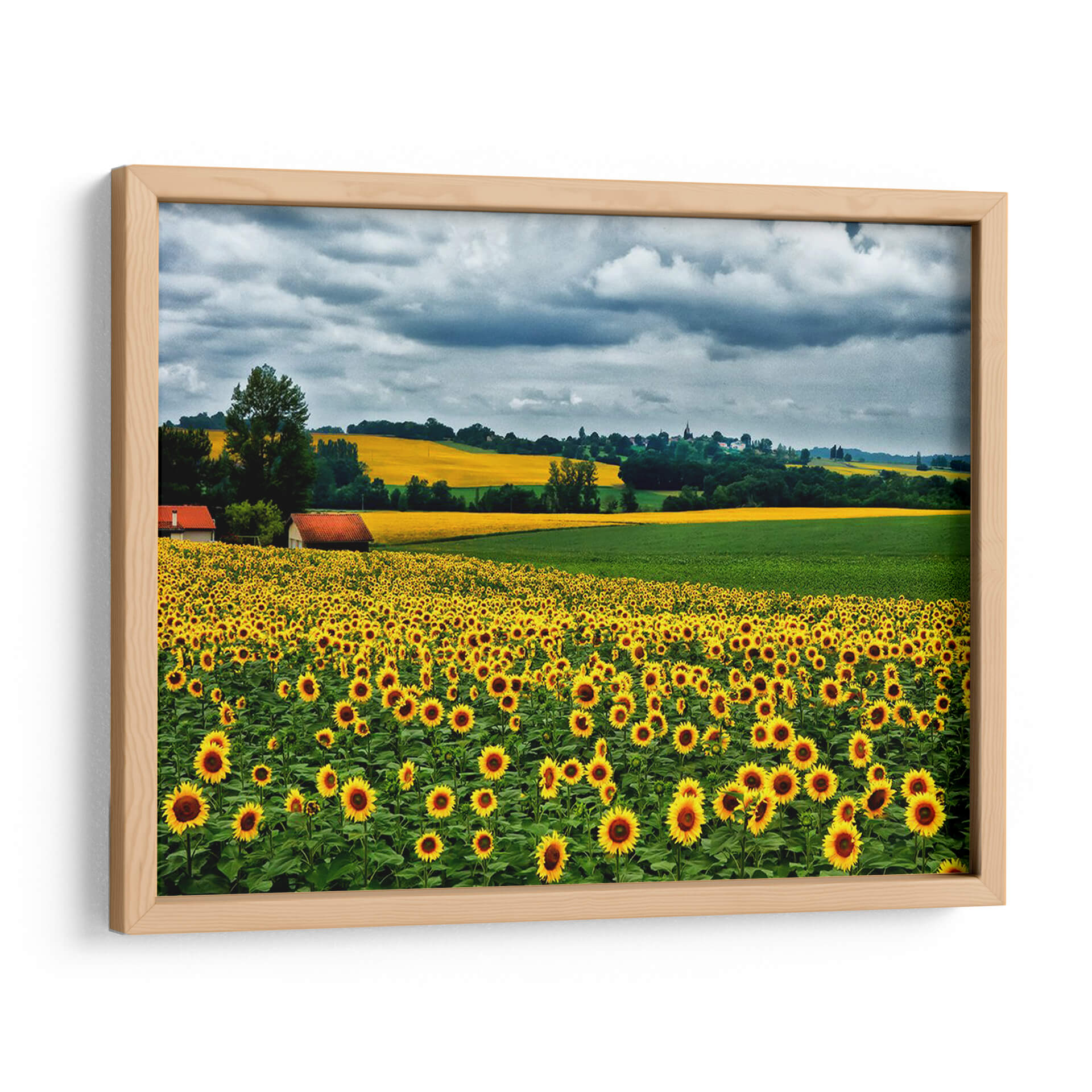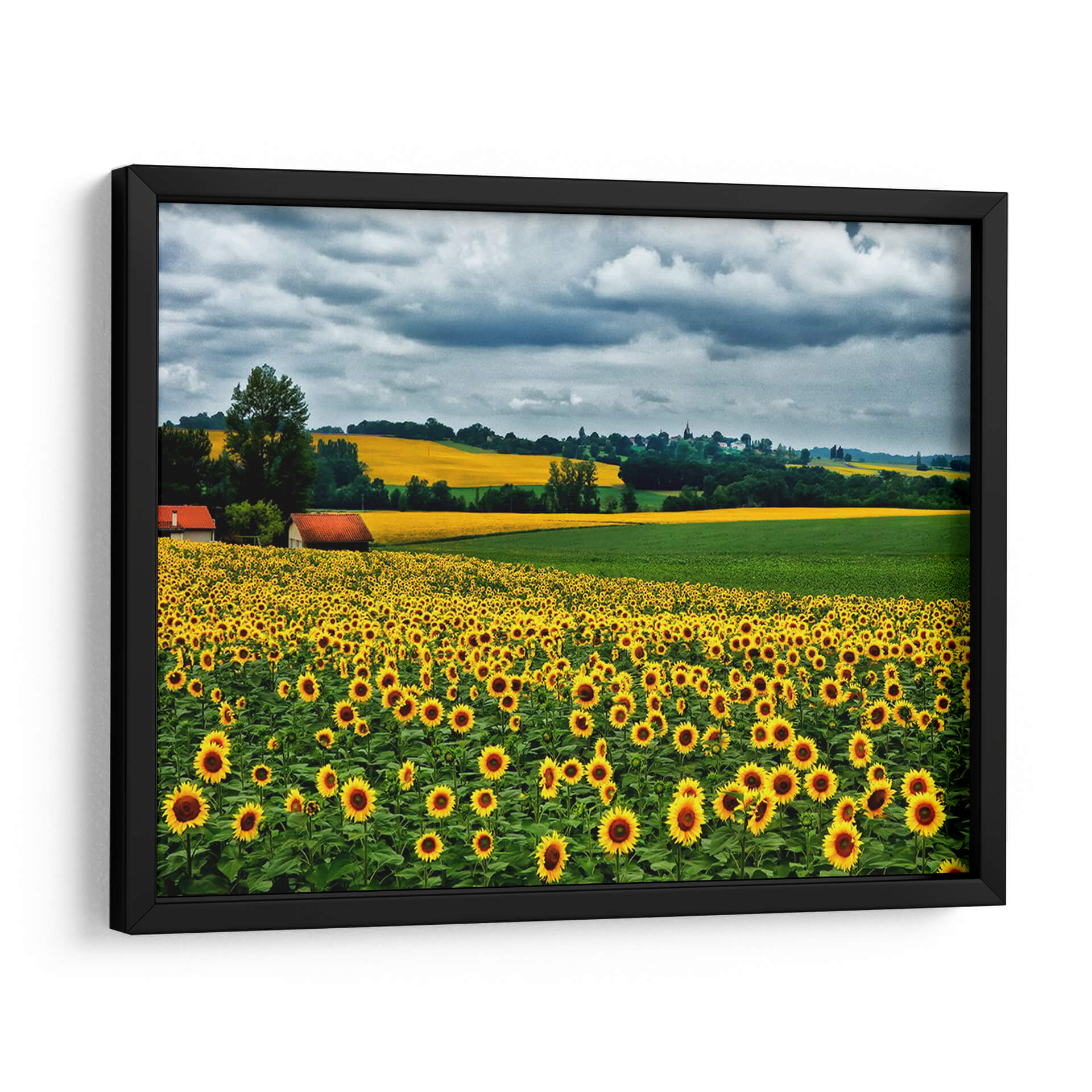 Sumérgete en la vibrante belleza de "Campo Pastoral IV", una obra de arte que captura la esencia de un paisaje idílico bajo un cielo nublado. Este cuadro decorativo te transporta a un vasto campo de girasoles en plena floración, con sus vibrantes pétalos amarillos iluminando la escena. Las colinas ondulantes y los campos dorados en el fondo, junto con la presencia de dos pequeñas edificaciones rústicas, crean una composición rica y detallada que evoca una sensación de paz y conexión con la naturaleza. La paleta de colores, dominada por amarillos intensos, verdes profundos y el contraste de un cielo grisáceo y dramático, aporta profundidad y carácter a la pieza. Ideal para quienes buscan infundir calidez y vitalidad en su hogar u oficina, este cuadro de paisaje es perfecto para salas de estar, comedores o cualquier espacio que necesite un toque de alegría rural y serenidad artística. Su estilo figurativo con toques impresionistas captura la luz y la atmósfera de manera magistral, invitando a la contemplación y al disfrute de la belleza campestre. Añade este paisaje de girasoles a tu colección y transforma tu entorno en un refugio de inspiración y tranquilidad.