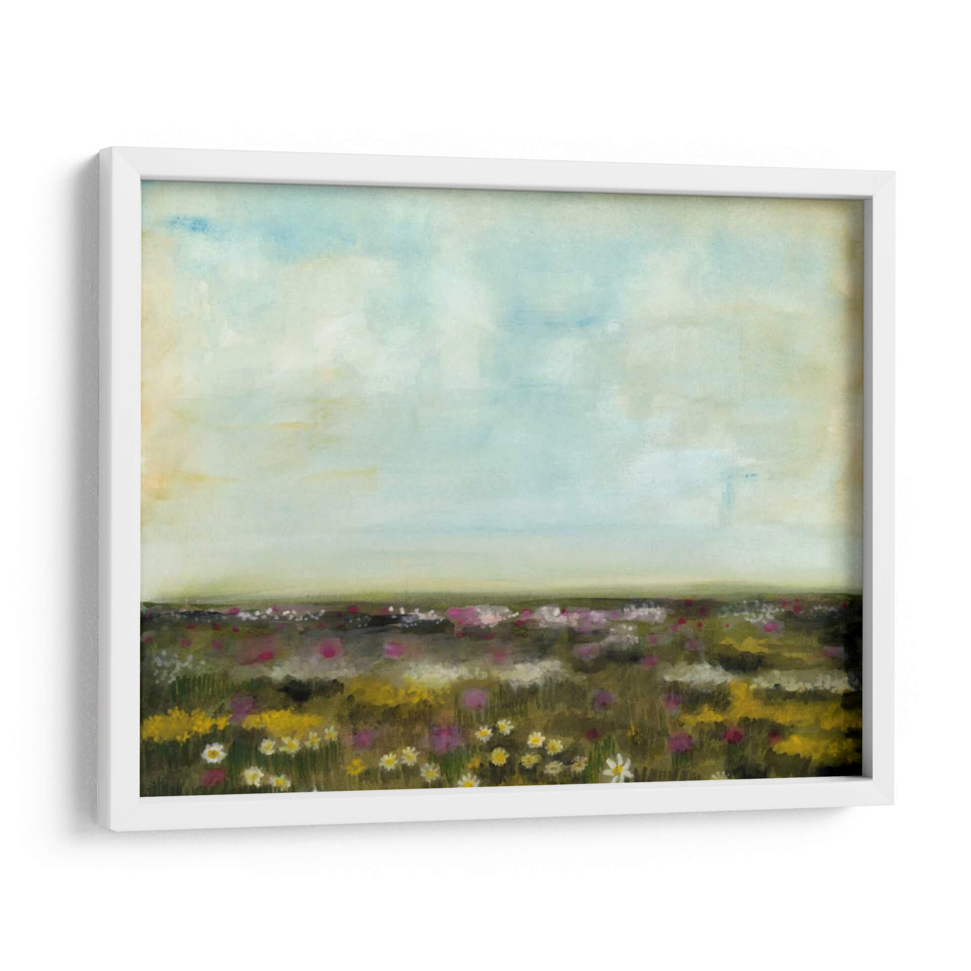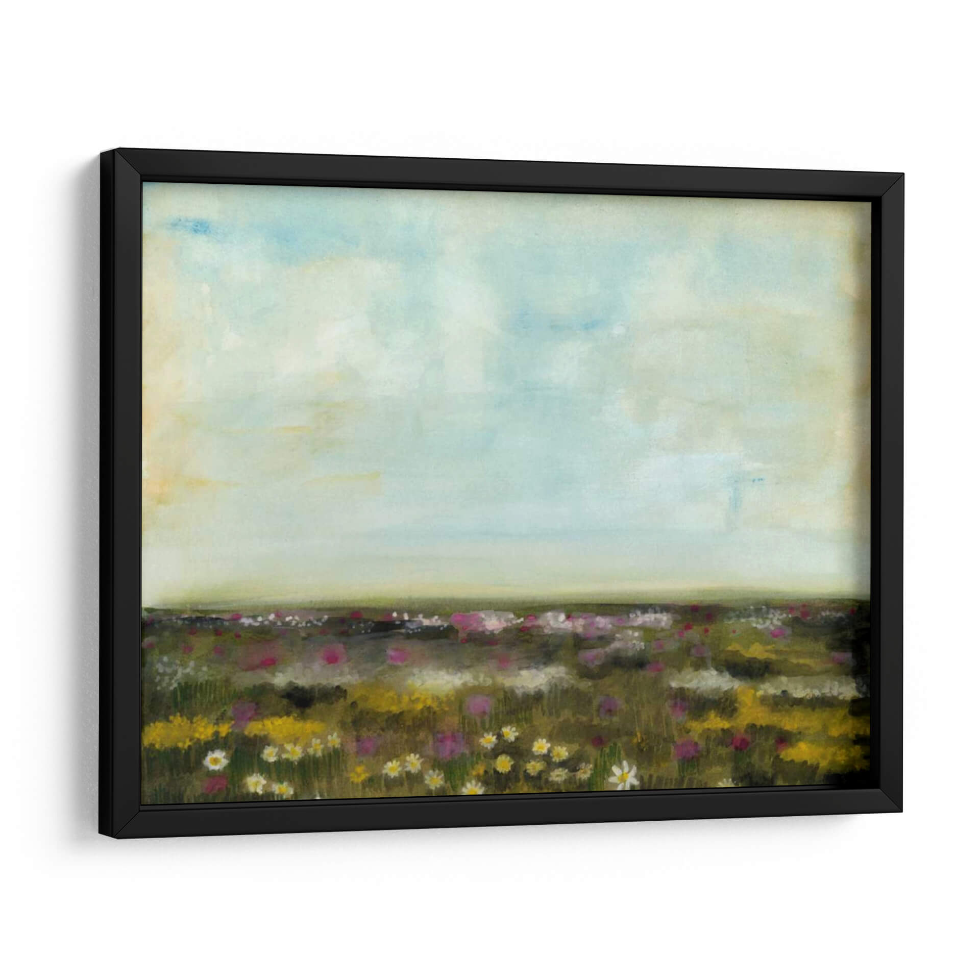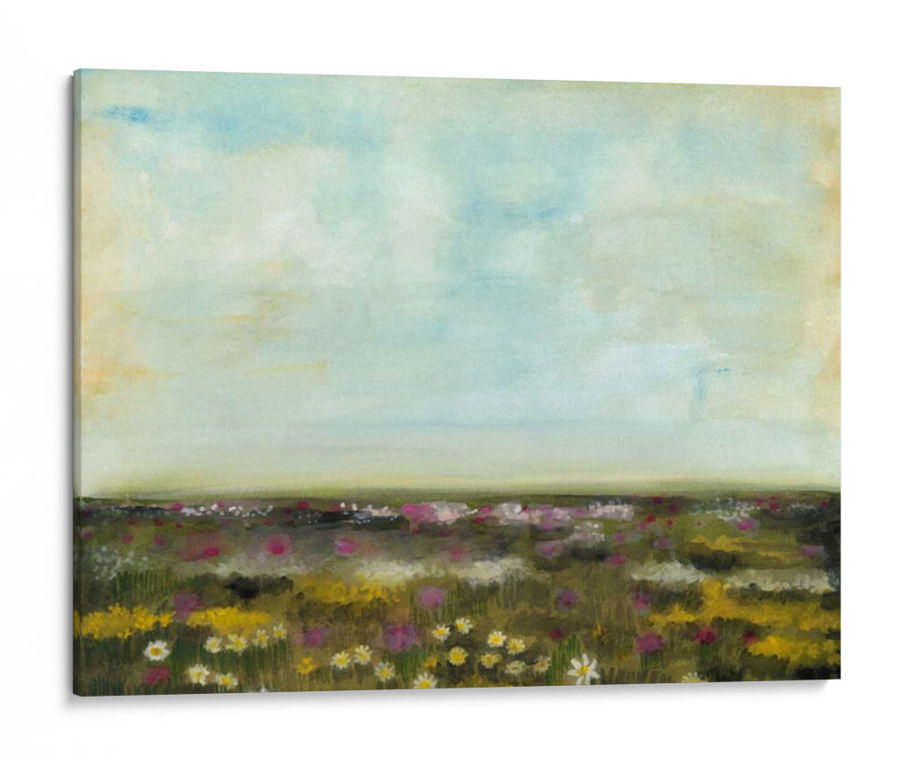 Sumérgete en la serenidad de "Campos Florales I", una obra de arte contemporáneo de Naomi McCavitt que captura la esencia de un prado vibrante bajo un cielo expansivo. Esta pieza evoca una atmósfera de tranquilidad y belleza natural, con pinceladas sueltas que dan vida a un tapiz de flores silvestres en tonos amarillos, rosas y blancos, contrastando sutilmente con el verde profundo de la vegetación. El cielo, con sus matices celestes y toques de amarillo pálido, añade una sensación de amplitud y luminosidad, invitando a la contemplación. El estilo artístico, que roza lo impresionista con una ejecución moderna, permite que la imaginación del espectador complete los detalles, creando una conexión personal con la pieza. "Campos Florales I" es ideal para añadir un toque de color y calma a cualquier espacio, desde un rincón acogedor en el hogar hasta un área de descanso en la oficina. Este cuadro decorativo moderno trasciende la simple representación para ofrecer una experiencia visual que renueva el espíritu y embellece tu entorno con la delicadeza de la naturaleza.