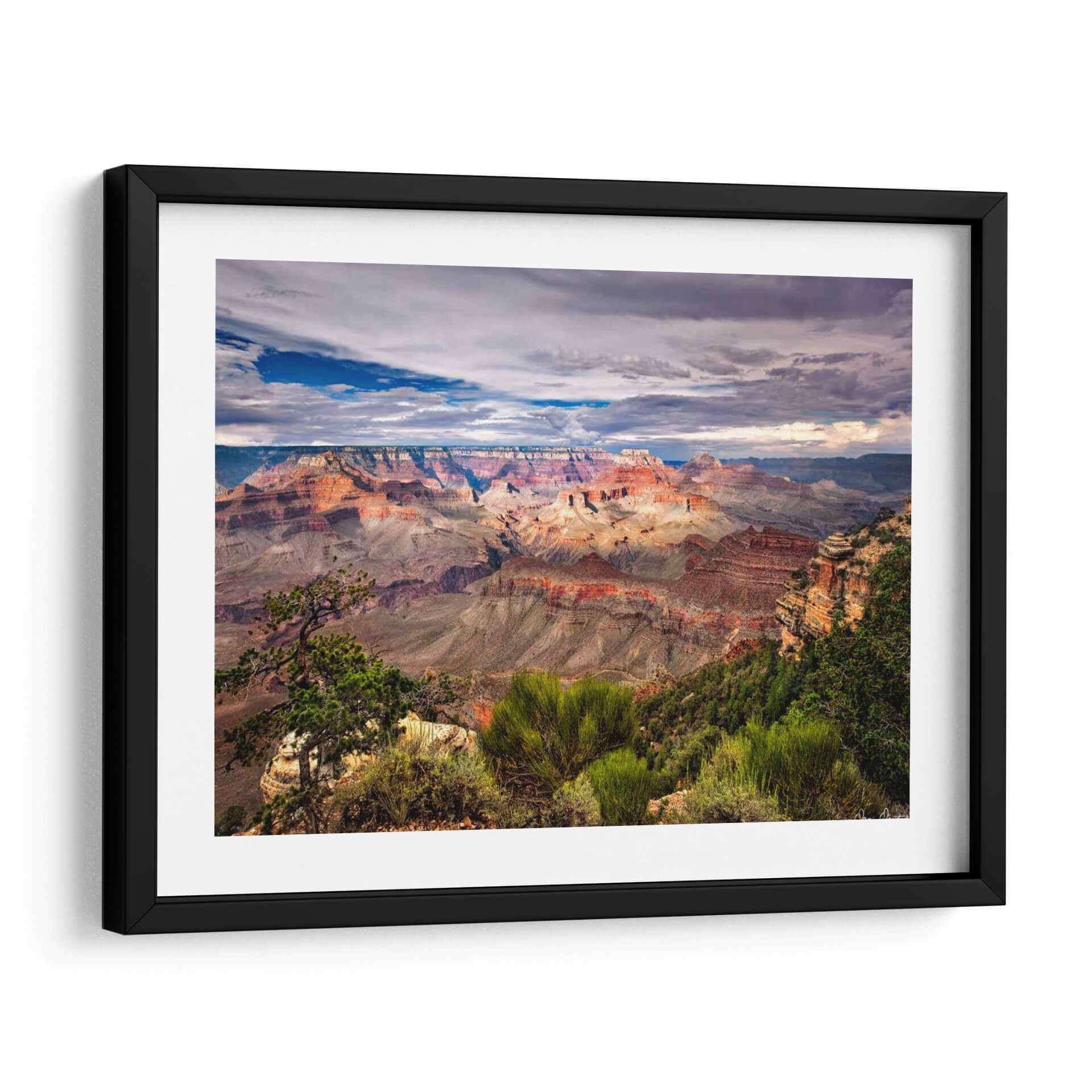 Sumérgete en la majestuosidad natural con "Canyon View Vi", una obra de arte que captura la imponente belleza de un cañón al atardecer. David Drost nos transporta a través de una composición visualmente rica, donde las capas geológicas del cañón se despliegan en una paleta de tonos tierra, ocres, rojizos y anaranjados, bañadas por una luz dramática. El cielo, un lienzo de nubes en movimiento con toques de azul intenso y grises plomizos, añade una atmósfera de inmensidad y poder natural. La vegetación en primer plano, con sus verdes vibrantes y texturas detalladas, crea un contraste orgánico y terroso que ancla la vista, invitando a explorar la profundidad de la escena. Este cuadro decorativo es una ventana a la grandeza de la naturaleza, ideal para infundir serenidad y un sentido de aventura en cualquier espacio. Perfecto para salones, comedores o incluso oficinas que busquen un punto focal inspirador y una conexión con el mundo exterior. Deja que la escala épica y la serena grandiosidad de "Canyon View Vi" transformen tu hogar en un santuario de contemplación y admiración.