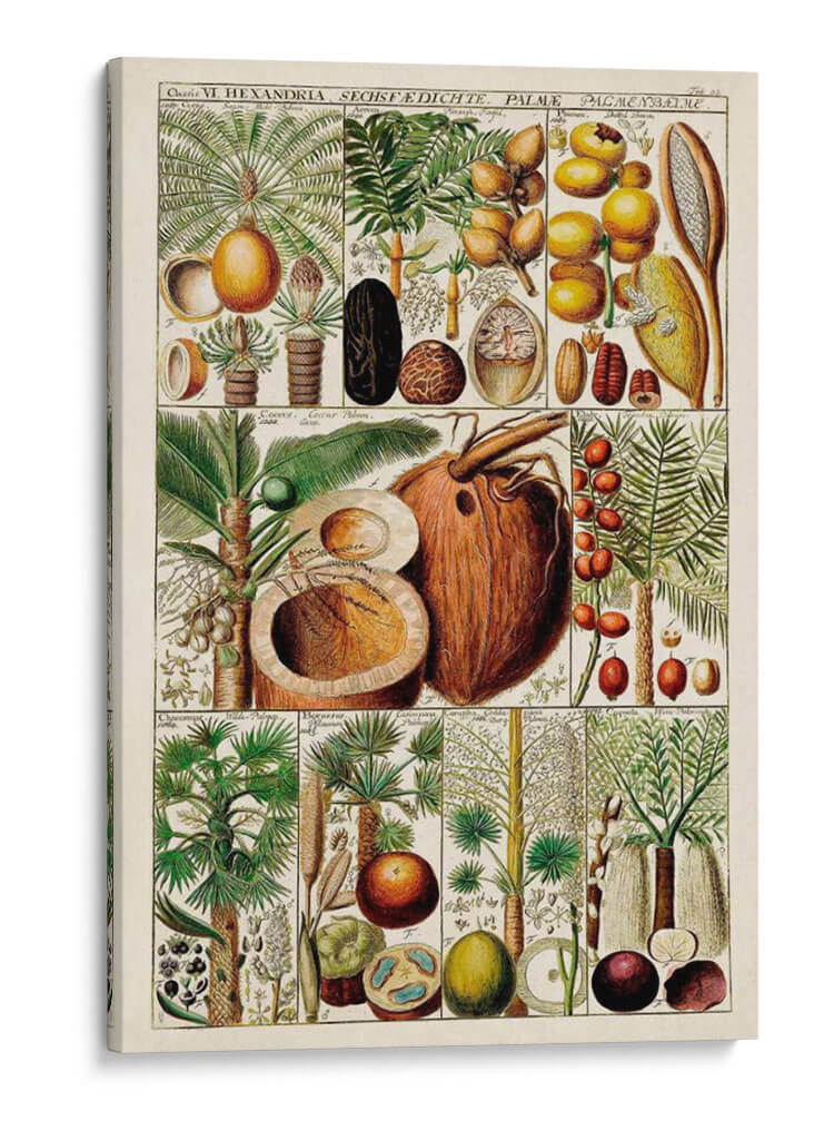 Embellece tu hogar u oficina con este exquisito cuadro decorativo, "Carta De Palmera", del Vision Studio. Esta obra de arte botánica reproduce con gran detalle y precisión las diversas especies de palmeras y sus frutos, capturando la esencia tropical y exótica de estas majestuosas plantas. La paleta de colores, dominada por tonos tierra, verdes vibrantes y toques de amarillo y ocre, evoca una sensación de calidez, naturaleza y conocimiento científico. Cada sección de la obra presenta un estudio minucioso de diferentes palmeras, desde sus hojas intrincadas hasta sus frutos maduros y semillas, ofreciendo una perspectiva educativa y estéticamente atractiva. El estilo de ilustración botánica vintage, con sus líneas finas y sombreados cuidadosos, añade un aire de elegancia y sofisticación. Este cuadro es ideal para aquellos que aprecian la belleza de la flora, buscan un toque de naturaleza en su decoración, o desean infundir un ambiente de aprendizaje y descubrimiento en sus espacios. Su rica composición visual lo convierte en un punto focal fascinante para salas de estar, estudios, bibliotecas o cualquier rincón que necesite una dosis de encanto natural y diseño clásico. Transforma tu ambiente con la serenidad y el vigor de estas maravillas botánicas.