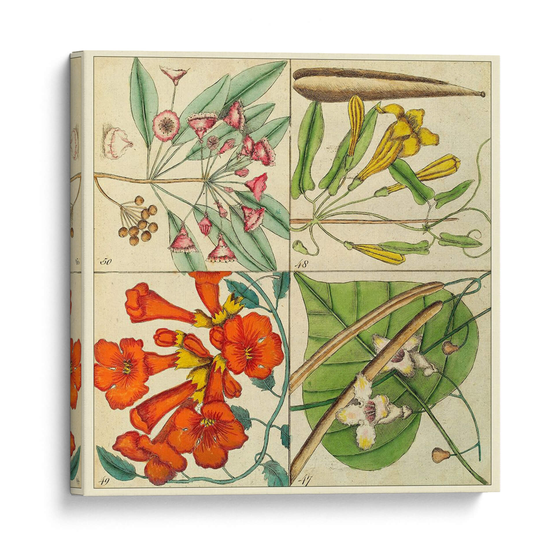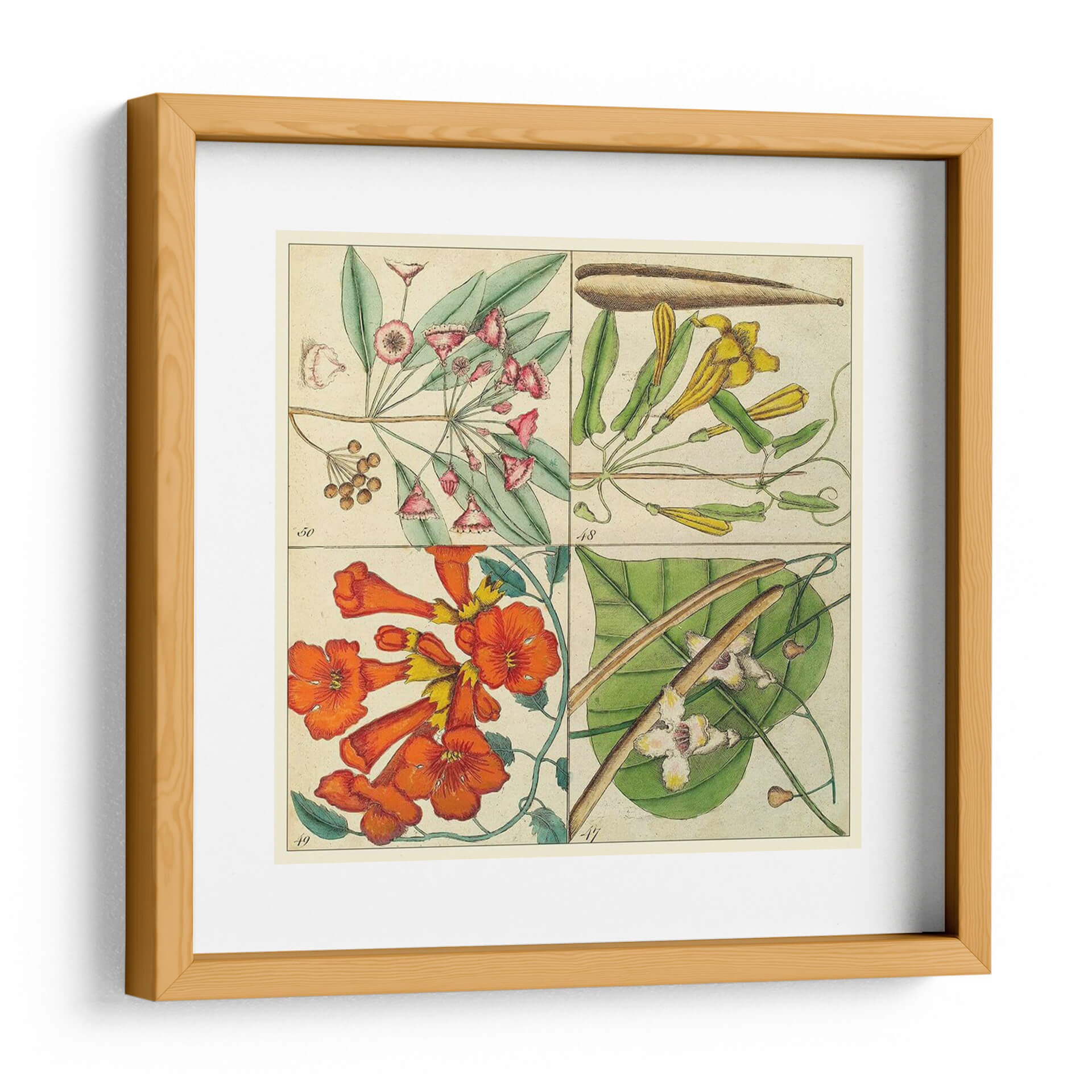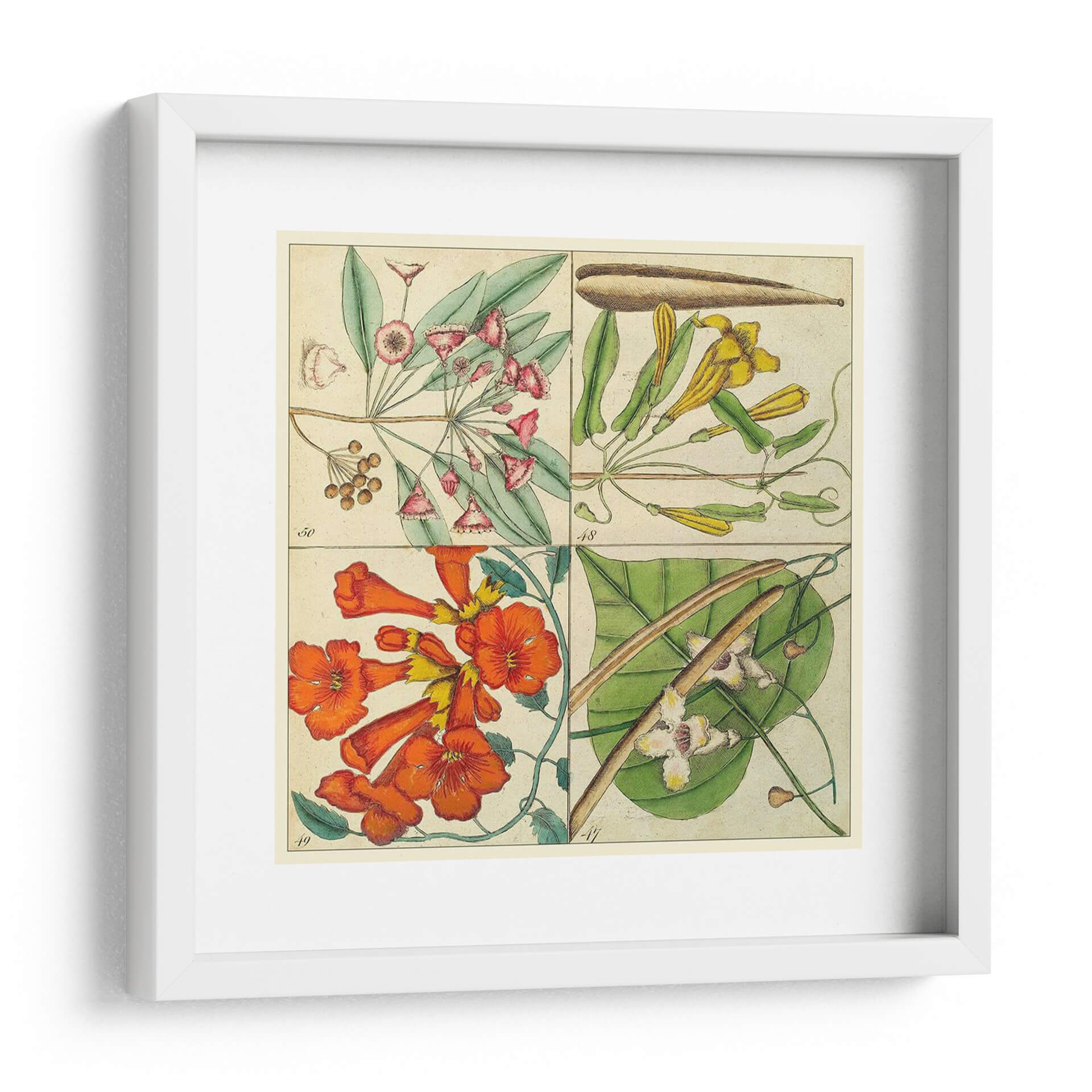Embellece tu espacio con el "Catesby Botanical Quadrant III", una obra de arte exquisita que captura la delicadeza de la naturaleza con un toque científico histórico. Esta pieza, inspirada en las detalladas ilustraciones botánicas de Mark Catesby, presenta cuatro cuadrantes distintos, cada uno mostrando con precisión diferentes especies de flora. Observa la sutil belleza de las flores rosadas y los racimos de bayas en la parte superior izquierda, contrastando con las elegantes formas tubulares de las flores amarillas en la sección superior derecha. La vibrante explosión de flores anaranjadas y amarillas en la parte inferior izquierda aporta energía y calidez, mientras que los delicados capullos blancos y las hojas exuberantes en la inferior derecha añaden un aire de serenidad y descubrimiento. La paleta de colores, dominada por tonos tierra, verdes, rosados, amarillos y naranjas intensos, evoca una sensación de clasicismo y elegancia atemporal. Este cuadro decorativo es perfecto para añadir un toque de sofisticación botánica a salones, estudios o comedores. Su diseño cuadriculado y su estilo de ilustración científica lo convierten en un punto focal fascinante que invita a la contemplación y añade profundidad a cualquier decoración, desde la clásica hasta la contemporánea. Ideal para amantes de la botánica, la historia natural o simplemente para quienes buscan una pieza de arte que combine belleza y conocimiento.
