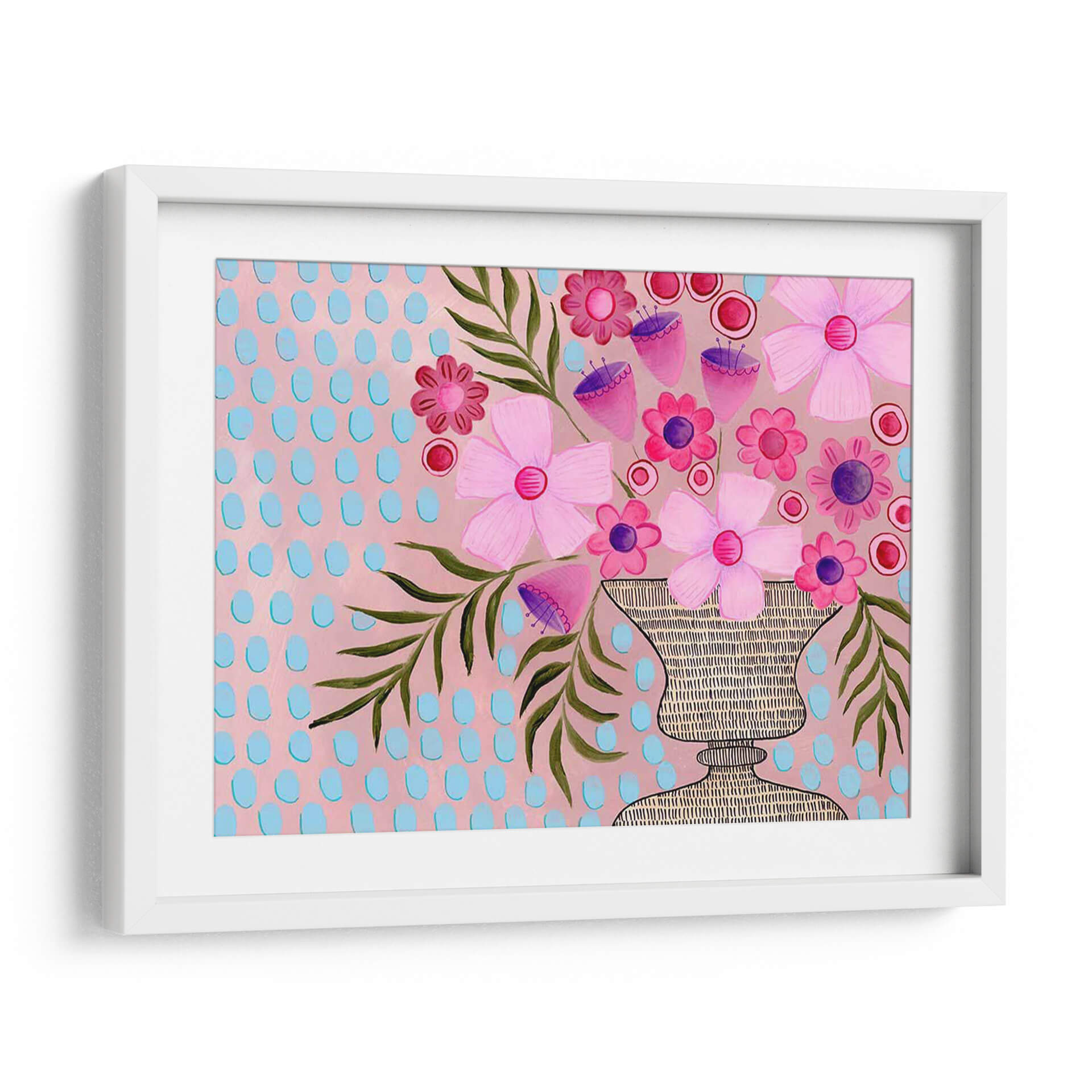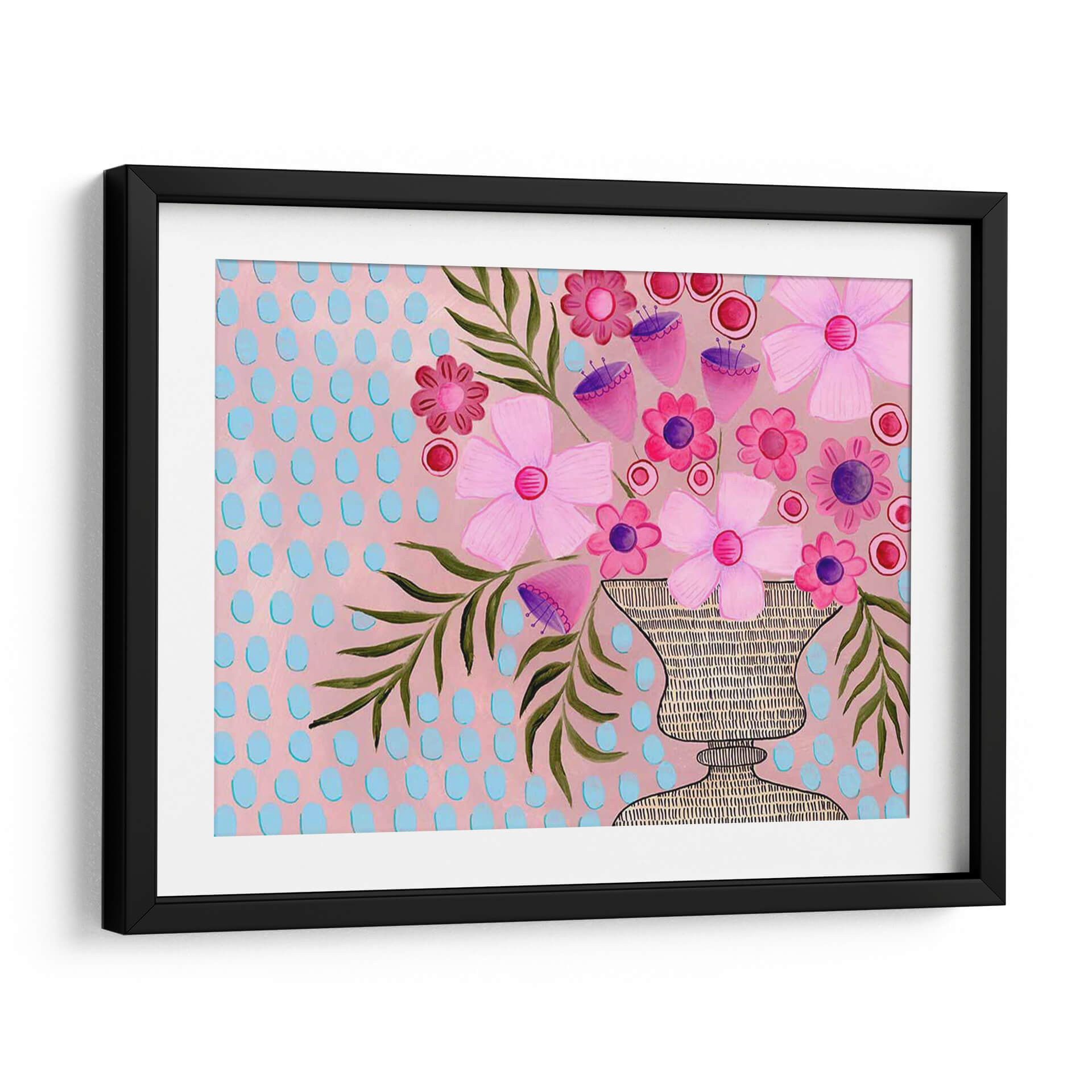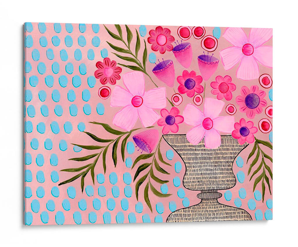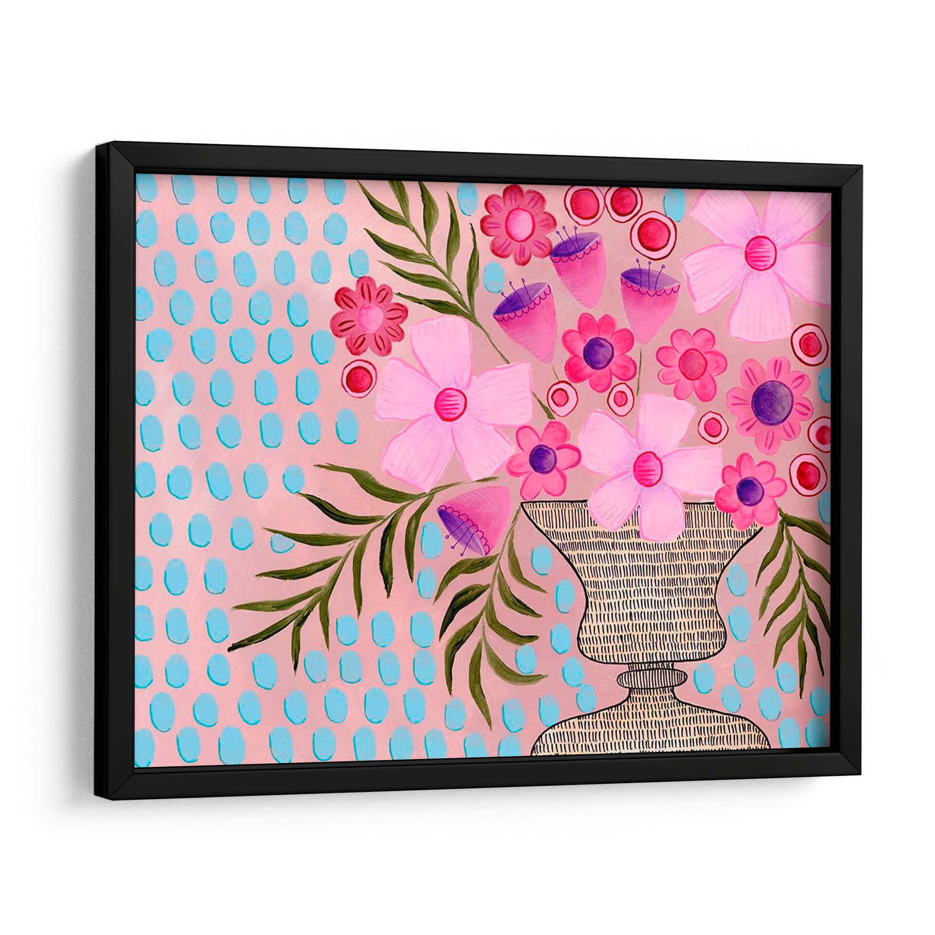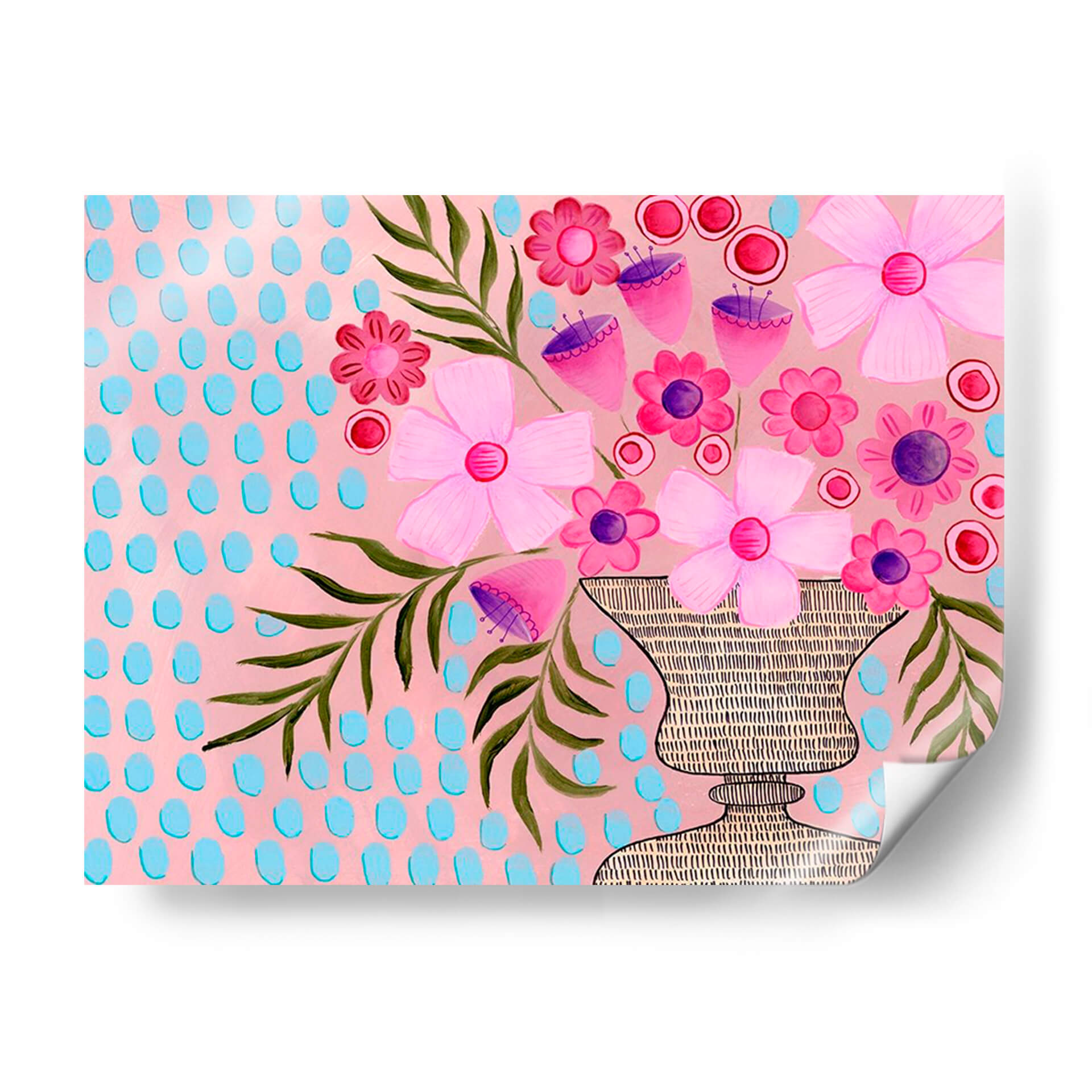 Inyecta una dosis de alegría y estilo contemporáneo en tu hogar con "Cheeky Pink Floral II", una vibrante obra de arte de Regina Moore. Este cuadro decorativo presenta un cautivador arreglo floral en tonos rosados y fucsias, contrastando maravillosamente con el fondo suavemente teñido y salpicado de alegres topos turquesas. Las flores, representadas con un estilo audaz y un toque juguetón, emanan energía y vitalidad, mientras que las hojas verdes añaden profundidad y un toque natural. La composición se centra en un jarrón estilizado con un patrón intrincado que sirve como base terrenal para la explosión floral. La paleta de colores, dominada por rosas, púrpuras y toques de turquesa, crea una atmósfera optimista y moderna, perfecta para espacios que buscan un acento de color y personalidad. Ideal para salas de estar, dormitorios o estudios que deseen un toque de frescura y arte contemporáneo. "Cheeky Pink Floral II" es más que una simple decoración; es una declaración de estilo y buen humor.