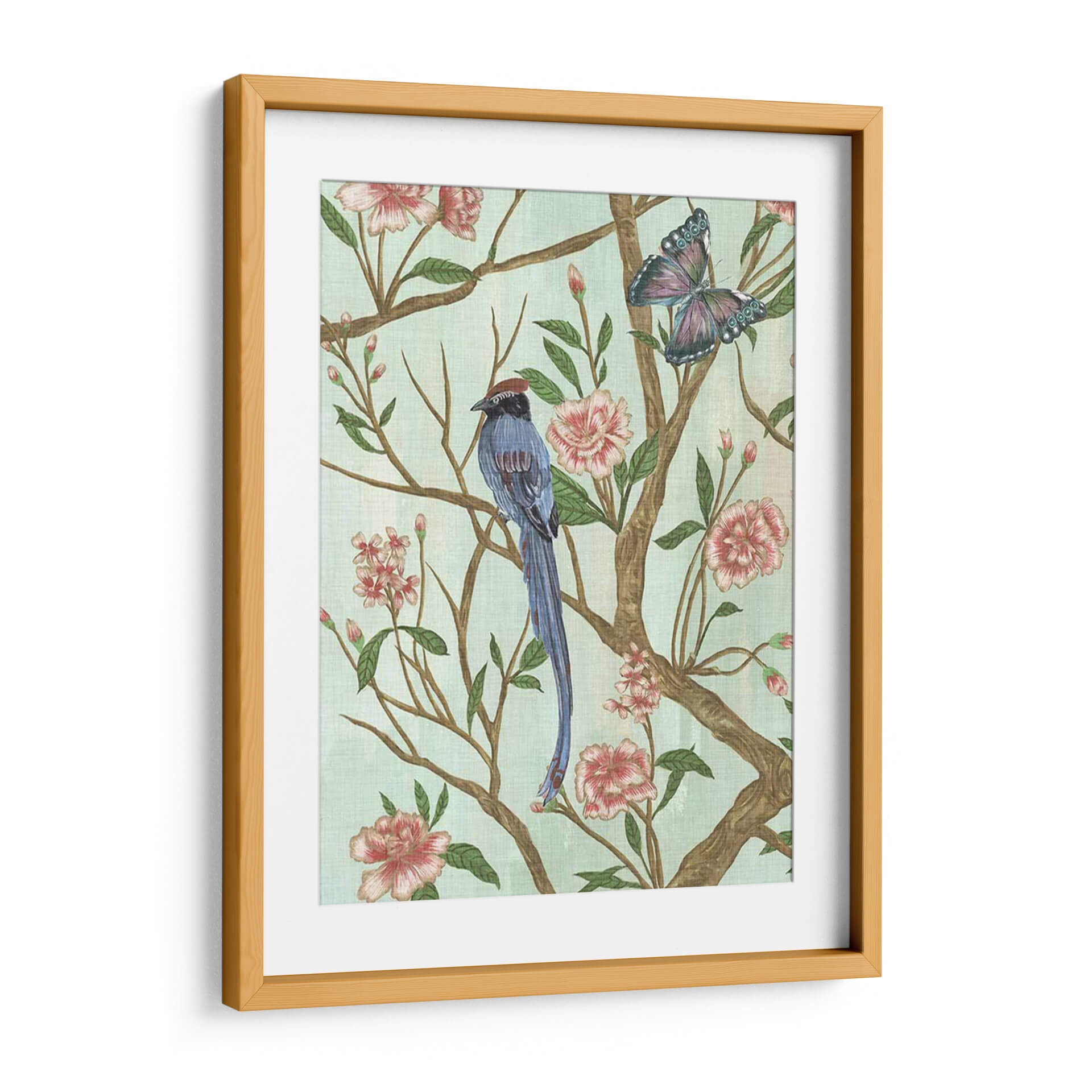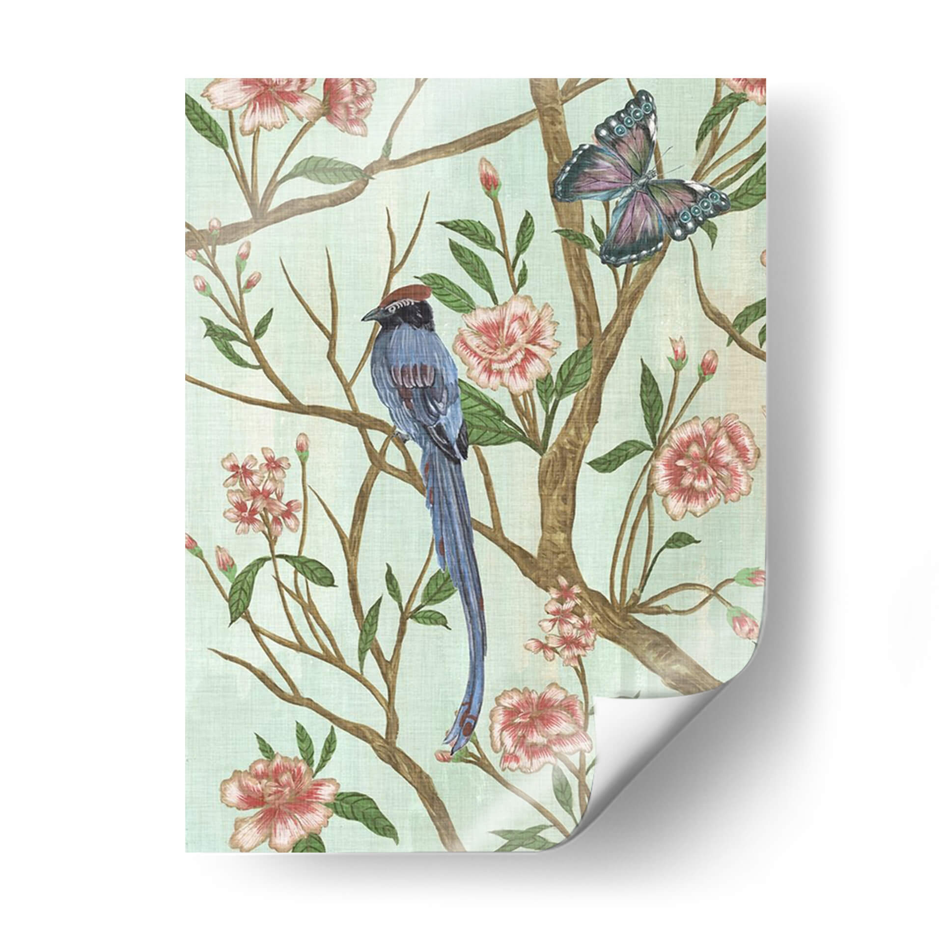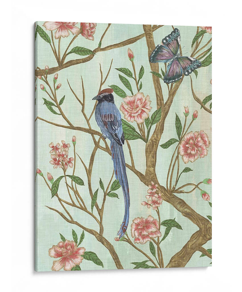 Adéntrate en un mundo de elegancia serena con "Chinoiserie Delicada I", una obra de arte de Melissa Wang que captura la esencia de la naturaleza en su máxima expresión. Este cuadro decorativo presenta un detallado diseño de inspiración oriental, donde un majestuoso pájaro de plumaje azul intenso se posa grácilmente sobre ramas floridas, acompañado por la etérea presencia de una mariposa. La delicada paleta de colores, dominada por suaves tonos verde menta, rosados empolvados y acentos de azul y terracota, crea una atmósfera de calma y sofisticación. Las flores, con sus pétalos detallados y textura sutil, invitan a la contemplación, mientras que el pájaro y la mariposa añaden un toque de vida y movimiento a la composición. Ideal para quienes buscan infundir tranquilidad y un toque de exotismo en sus espacios, este cuadro es perfecto para salones, dormitorios o estudios. Su estilo clásico con un giro contemporáneo lo convierte en una pieza versátil que puede complementar desde decoraciones tradicionales hasta ambientes más modernos, aportando un aire de refinamiento y belleza atemporal a cualquier rincón de tu hogar u oficina. Transforma tu espacio con la delicadeza y el encanto de esta pieza única.