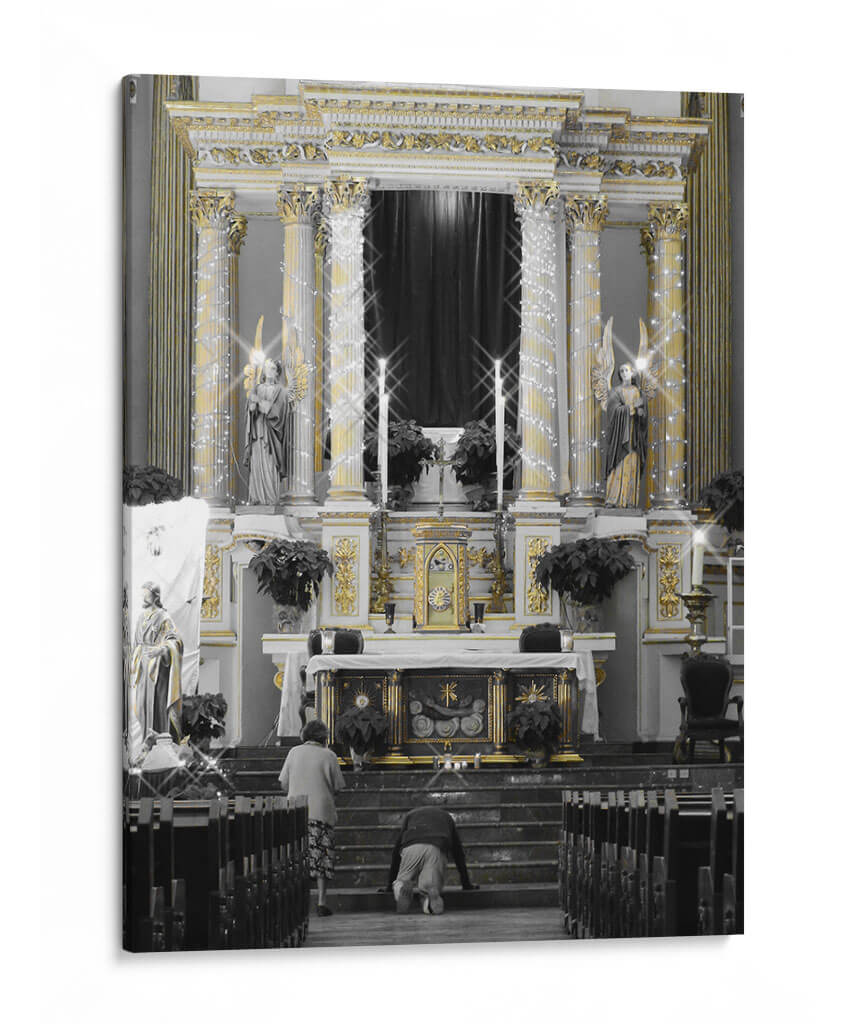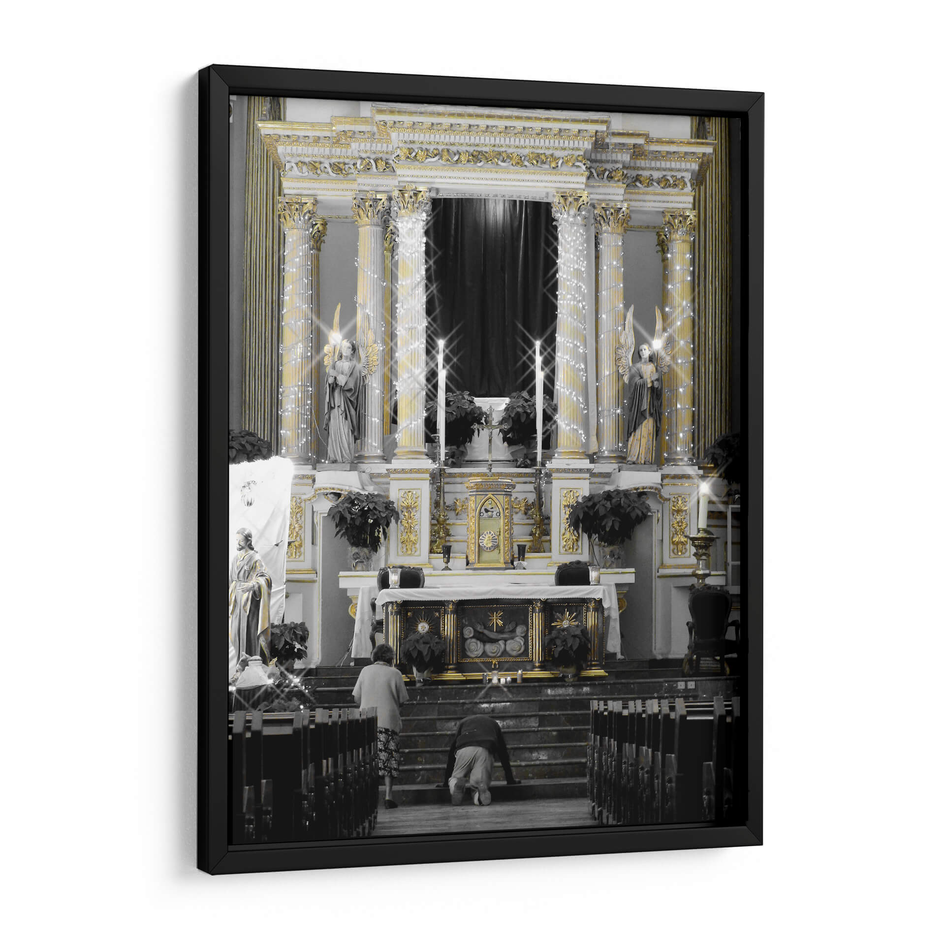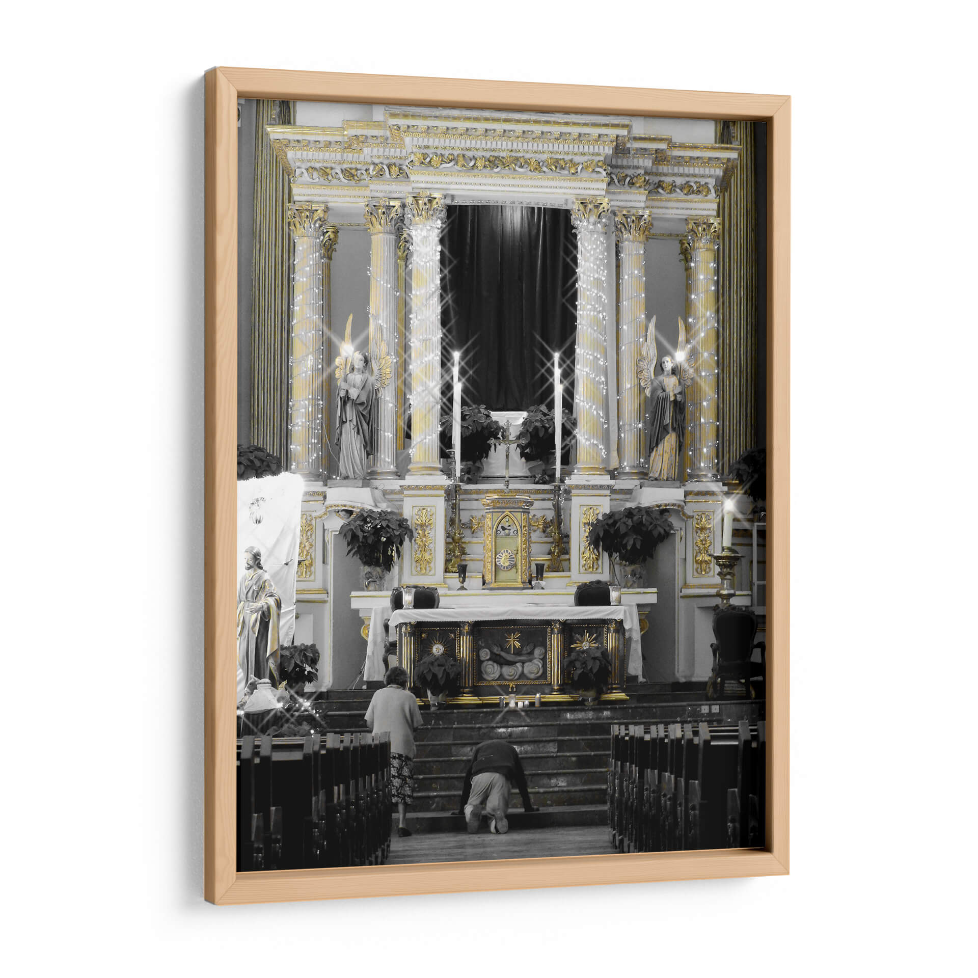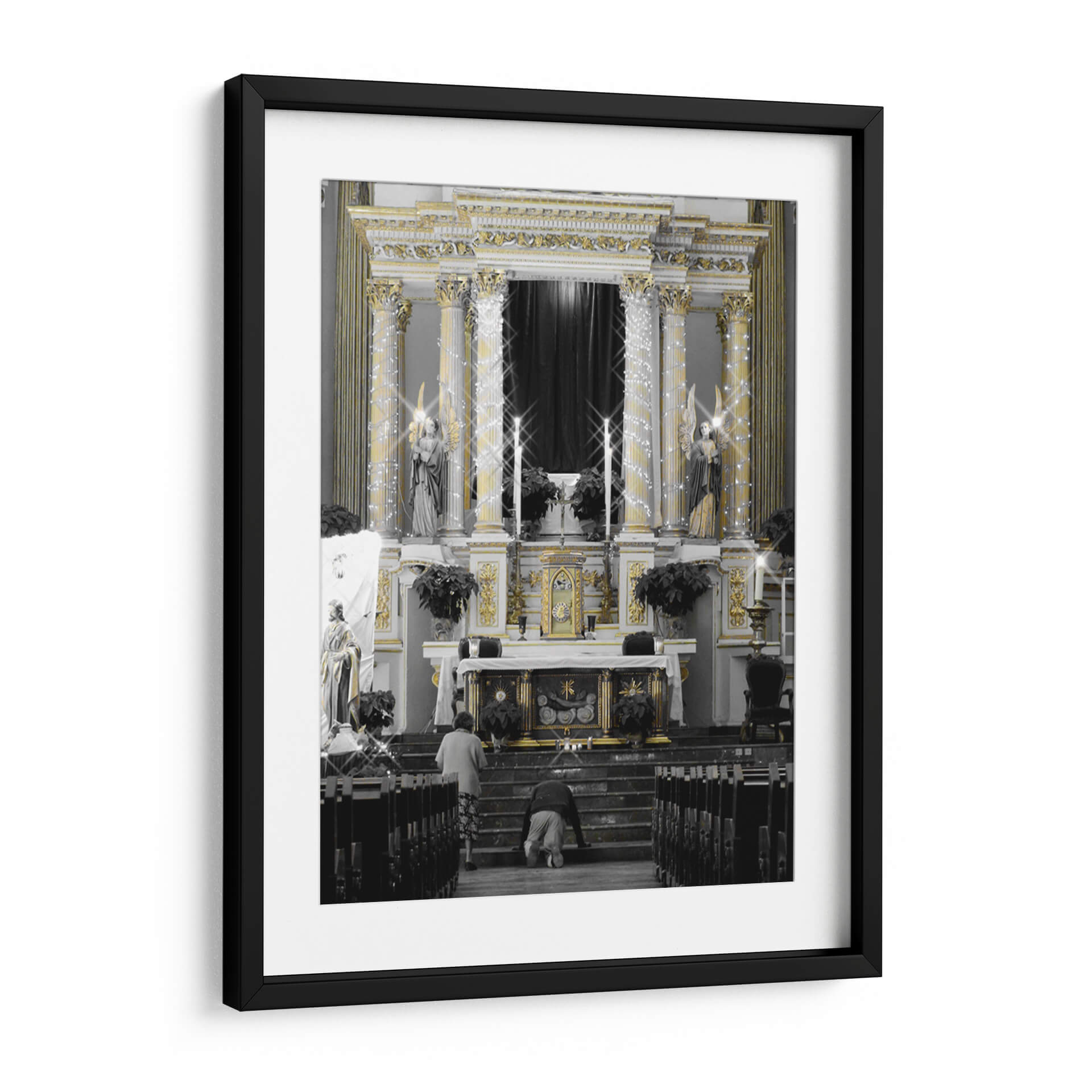 Adéntrate en la solemnidad y la belleza arquitectónica con "Clemencia", una obra de Hugo Segura que captura la esencia de un espacio sagrado con un toque artístico único. Este cuadro decorativo presenta una imponente iglesia o catedral, destacada por su arquitectura neoclásica, con columnas doradas y detalles ornamentados que evocan grandeza y tradición. La paleta de colores, predominantemente en blanco y negro con selectivos toques dorados y luces blancas festivas, crea un contraste dramático y una atmósfera de reverencia. La escena muestra figuras en actitud de oración o contemplación, añadiendo una dimensión humana y espiritual a la majestuosidad del lugar. Las luces parpadeantes y las plantas verdes aportan un toque de calidez y vivacidad, equilibrando la solemnidad de la arquitectura. "Clemencia" es ideal para quienes buscan infundir sus espacios con un sentido de paz, historia y arte refinado. Este cuadro decorativo es perfecto para salones, comedores o incluso como pieza central en un estudio u oficina, aportando un aire de sofisticación y reflexión.