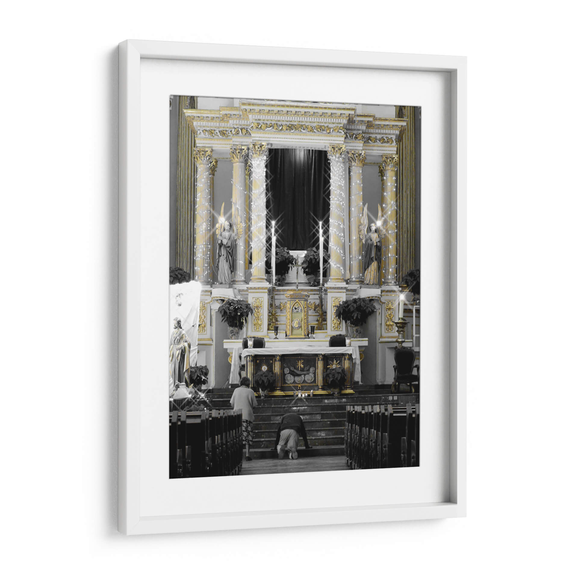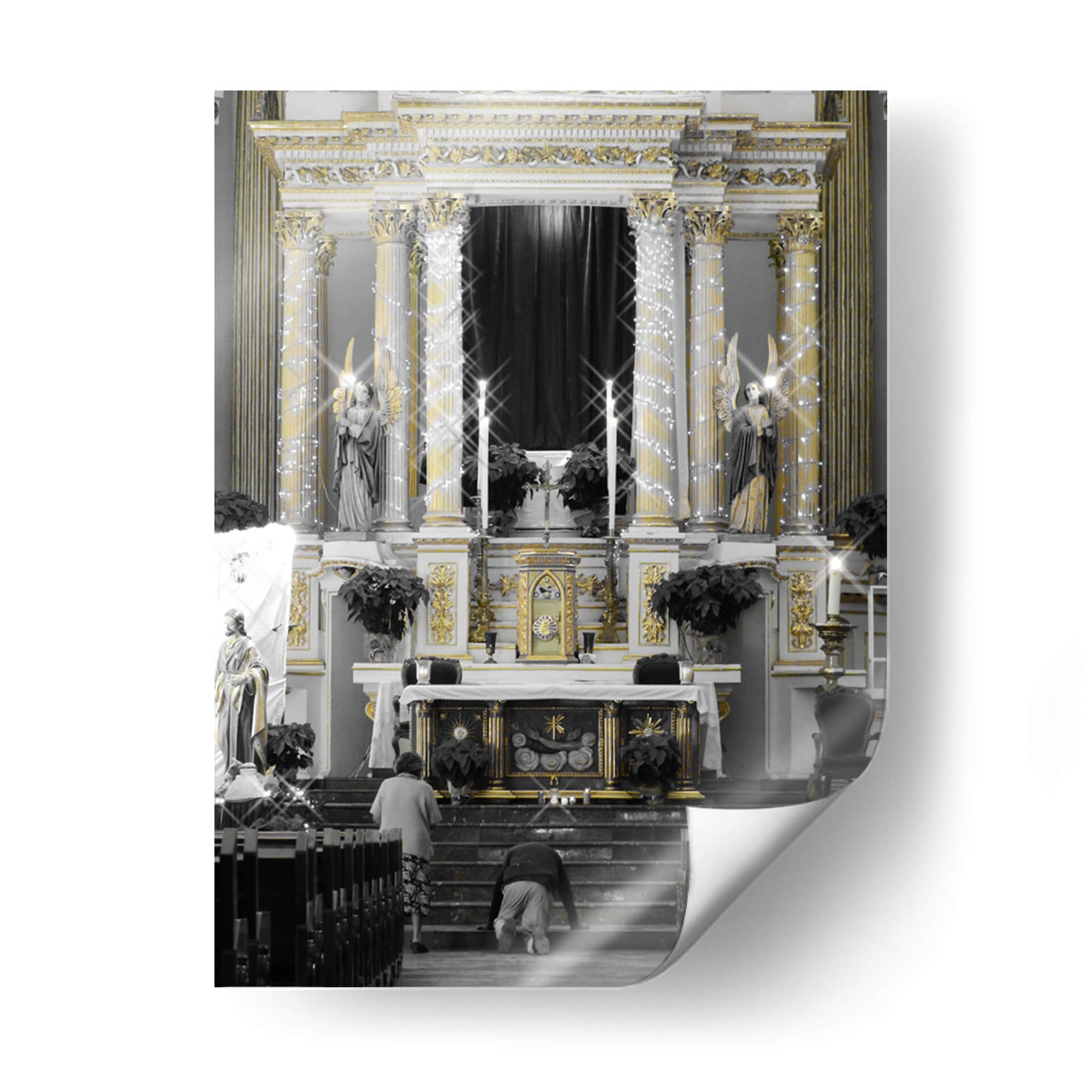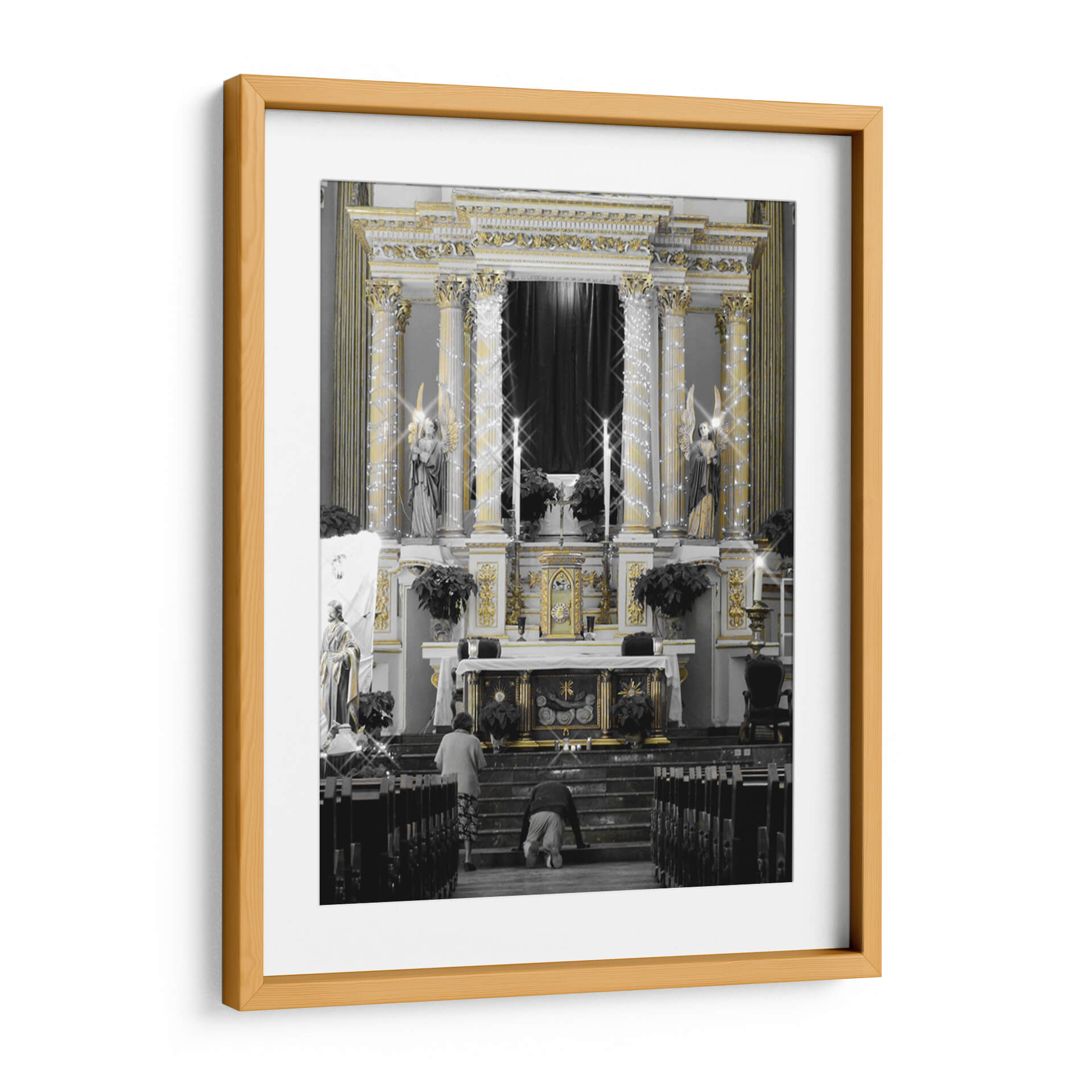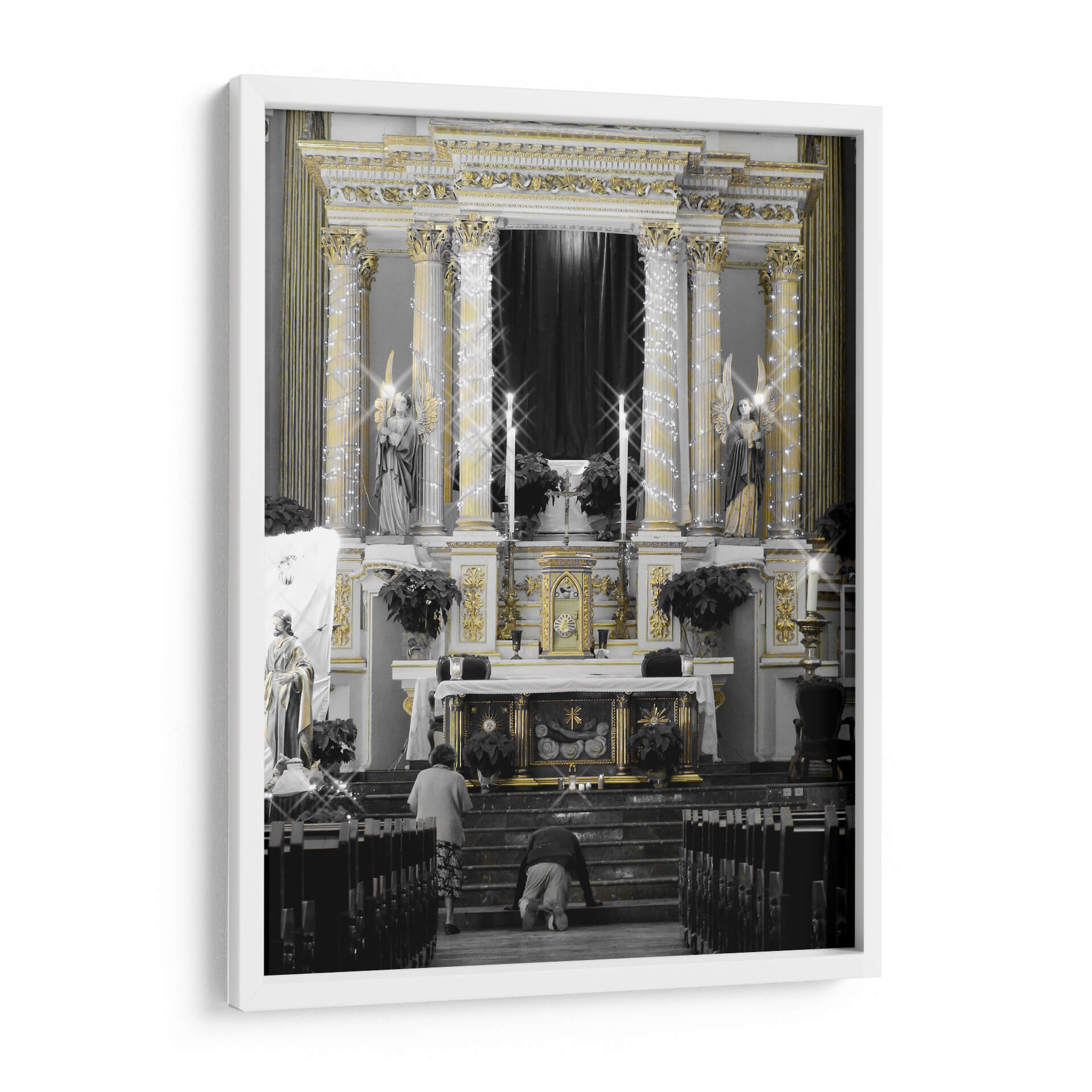 Adéntrate en la solemnidad y la belleza arquitectónica con "Clemencia", una obra de Hugo Segura que captura la esencia de un espacio sagrado con un toque artístico único. Este cuadro decorativo presenta una imponente iglesia o catedral, destacada por su arquitectura neoclásica, con columnas doradas y detalles ornamentados que evocan grandeza y tradición. La paleta de colores, predominantemente en blanco y negro con selectivos toques dorados y luces blancas festivas, crea un contraste dramático y una atmósfera de reverencia. La escena muestra figuras en actitud de oración o contemplación, añadiendo una dimensión humana y espiritual a la majestuosidad del lugar. Las luces parpadeantes y las plantas verdes aportan un toque de calidez y vivacidad, equilibrando la solemnidad de la arquitectura. "Clemencia" es ideal para quienes buscan infundir sus espacios con un sentido de paz, historia y arte refinado. Este cuadro decorativo es perfecto para salones, comedores o incluso como pieza central en un estudio u oficina, aportando un aire de sofisticación y reflexión.