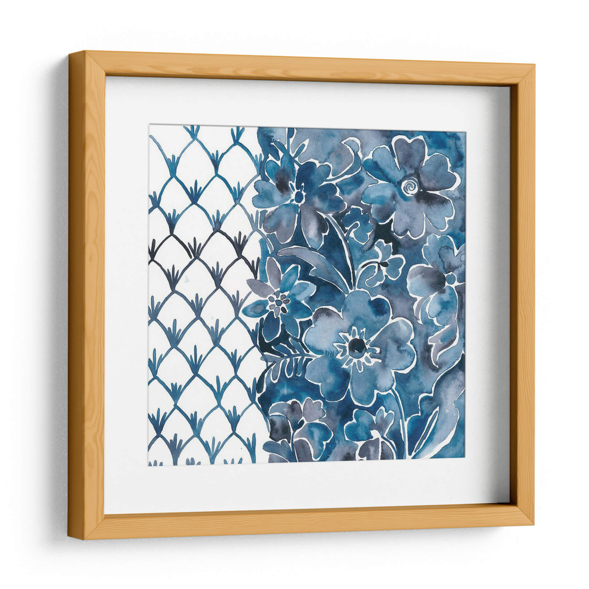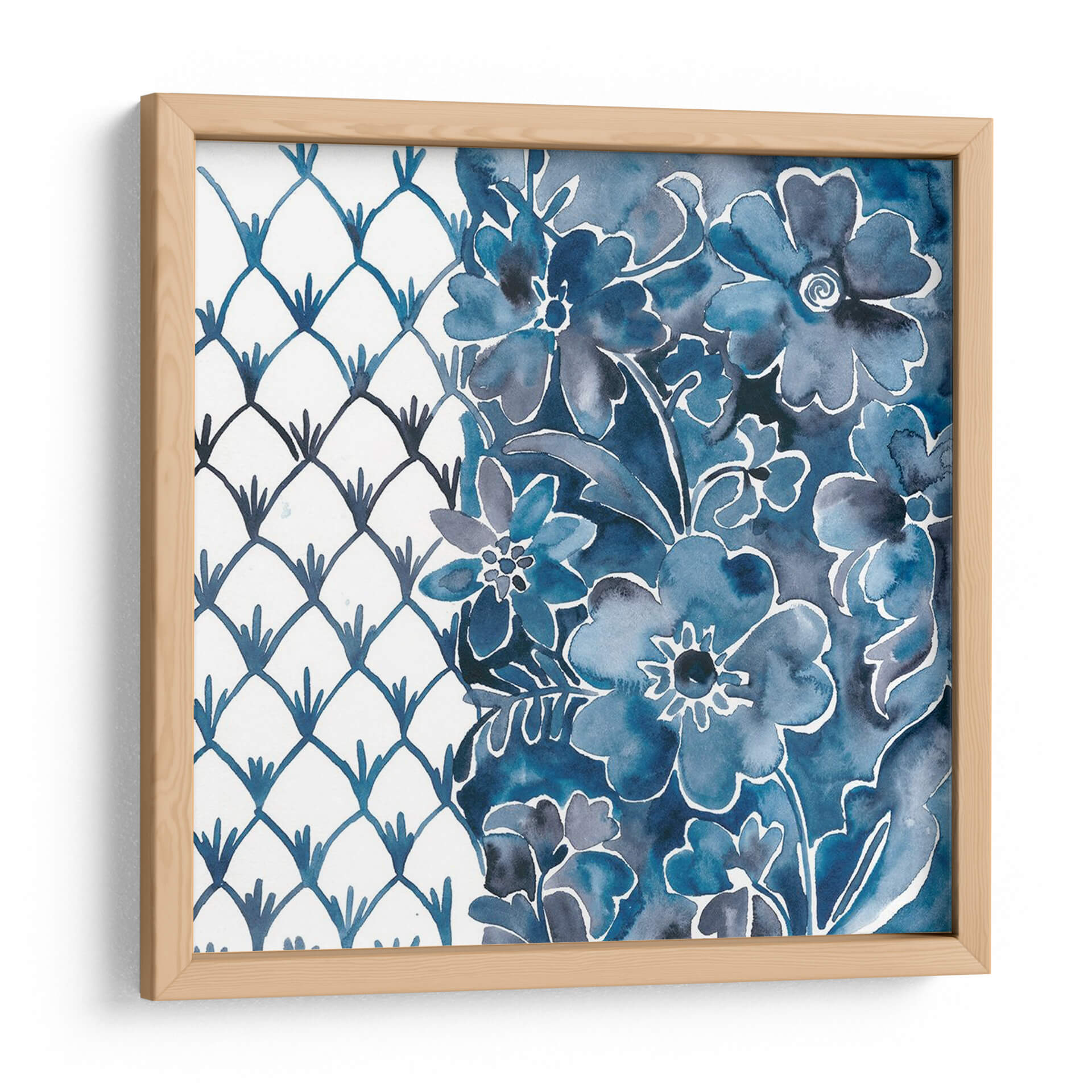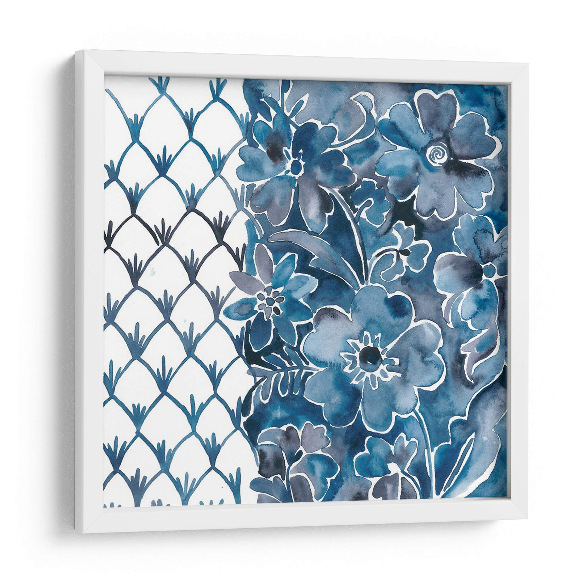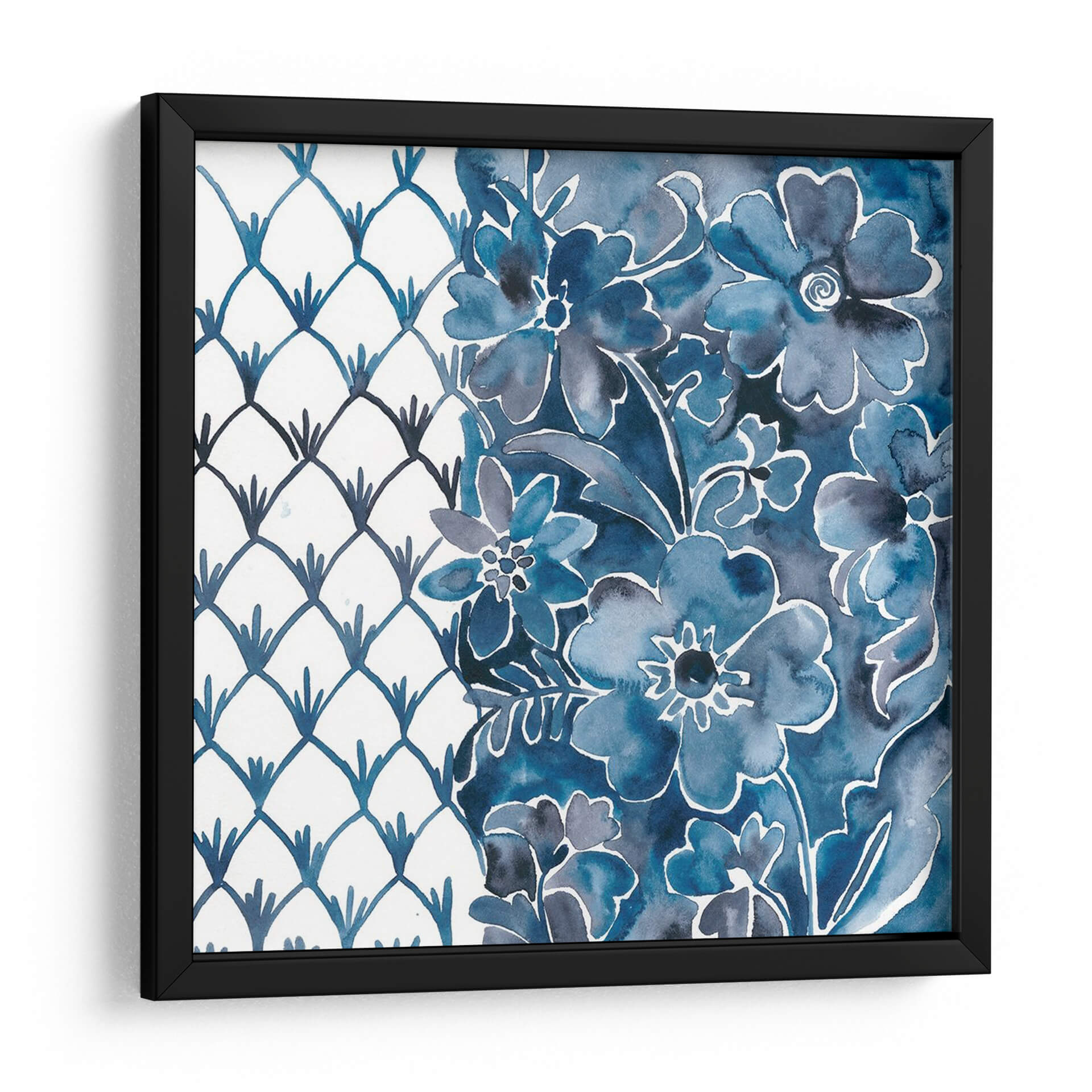 Sumérgete en la serenidad y el encanto de "Cobalt Garden III", una obra de arte contemporáneo de Chariklia Zarris que evoca la belleza atemporal de la naturaleza. Este cautivador cuadro decorativo presenta un delicado arreglo floral en tonos azules profundos, con trazos que sugieren la fluidez y la delicadeza de la acuarela. La composición se divide elegantemente: a la izquierda, un patrón geométrico de escamas en azul cobalto sobre un fondo blanco limpio aporta un toque moderno y estructurado; a la derecha, un exuberante jardín de flores en diversas tonalidades de azul, desde el índigo intenso hasta el azul cielo, crea una sensación de profundidad y vitalidad. La técnica de Zarris, que combina la precisión del diseño con la libertad expresiva de la acuarela, resulta en una pieza que es a la vez relajante y visualmente estimulante. "Cobalt Garden III" es ideal para añadir un toque de sofisticación y calma a cualquier espacio, ya sea una sala de estar luminosa, un sereno dormitorio o una oficina que busca inspiración. Su paleta de colores vibrante pero armoniosa lo convierte en un punto focal perfecto para interiores que buscan fusionar lo clásico con lo contemporáneo, aportando una atmósfera de tranquilidad y elegancia.