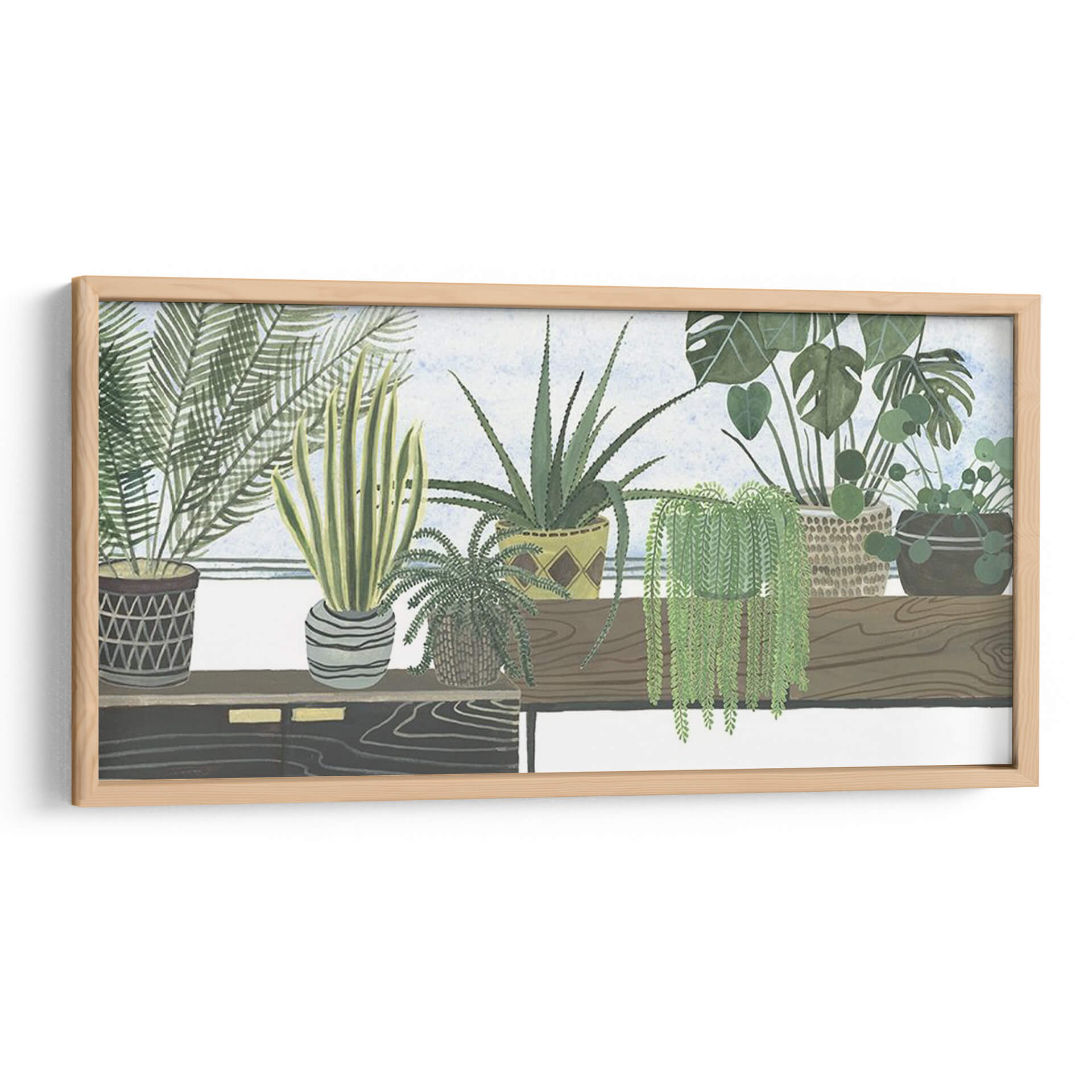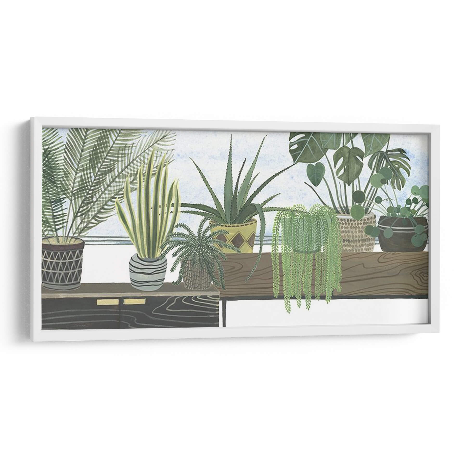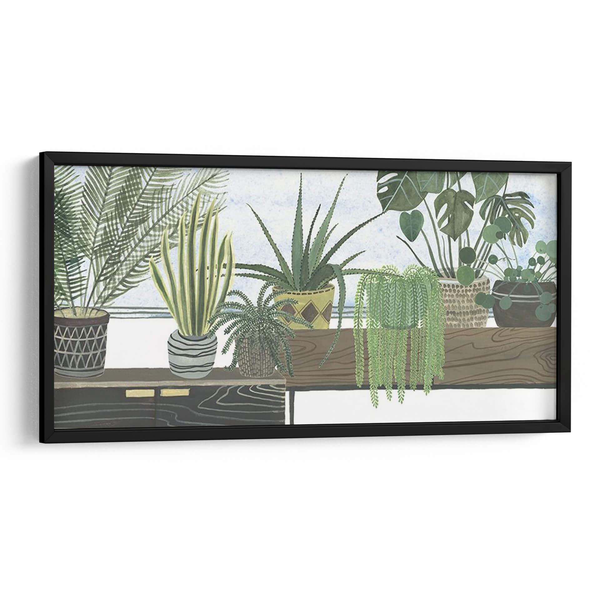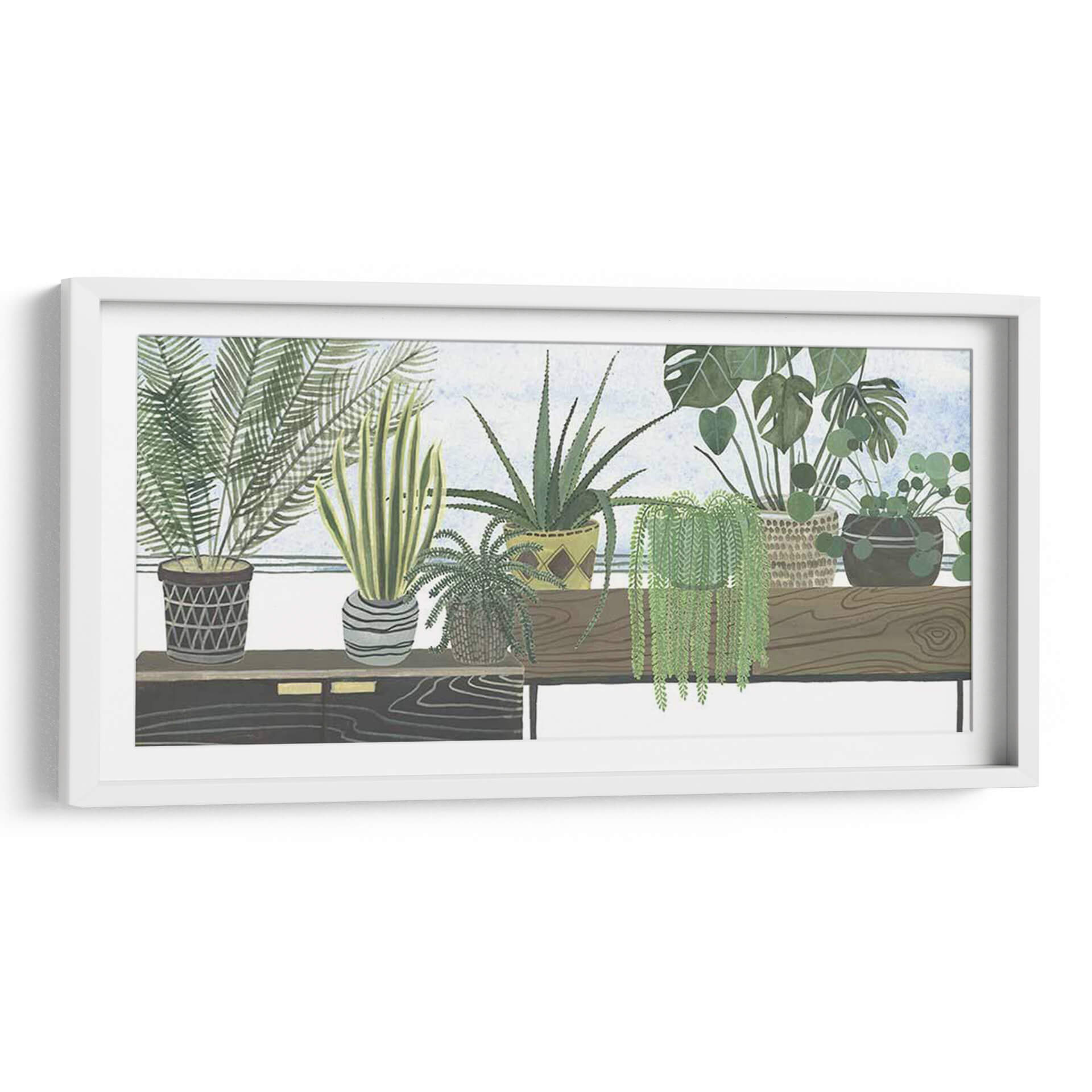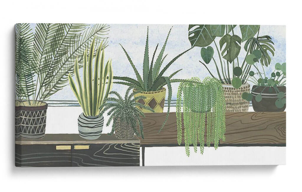 Sumérgete en la serenidad botánica con 'Colección De Mes Flantes D', una obra de arte original de Melissa Wang que captura la esencia de un oasis interior. Este cuadro decorativo presenta una cuidada selección de plantas de interior dispuestas armoniosamente, creando una atmósfera de calma y conexión con la naturaleza. Los tonos verdes vibrantes de las diferentes especies, desde la exuberante cascada de una planta colgante hasta las espinas de un aloe vera y las delicadas hojas de un helecho, se combinan con los tonos tierra de las macetas y la suave luz del fondo para evocar una sensación de tranquilidad y frescura. La composición, con su detallada ilustración botánica y un estilo que recuerda a las acuarelas modernas, invita a la contemplación. Es la pieza perfecta para añadir un toque de vida y serenidad a cualquier espacio, ya sea una sala de estar, un dormitorio o un estudio, transformando tu hogar en un refugio personal de paz y belleza natural. Descubre cómo este cuadro decorativo puede revitalizar tu ambiente y reflejar tu amor por la botánica y el diseño contemporáneo.