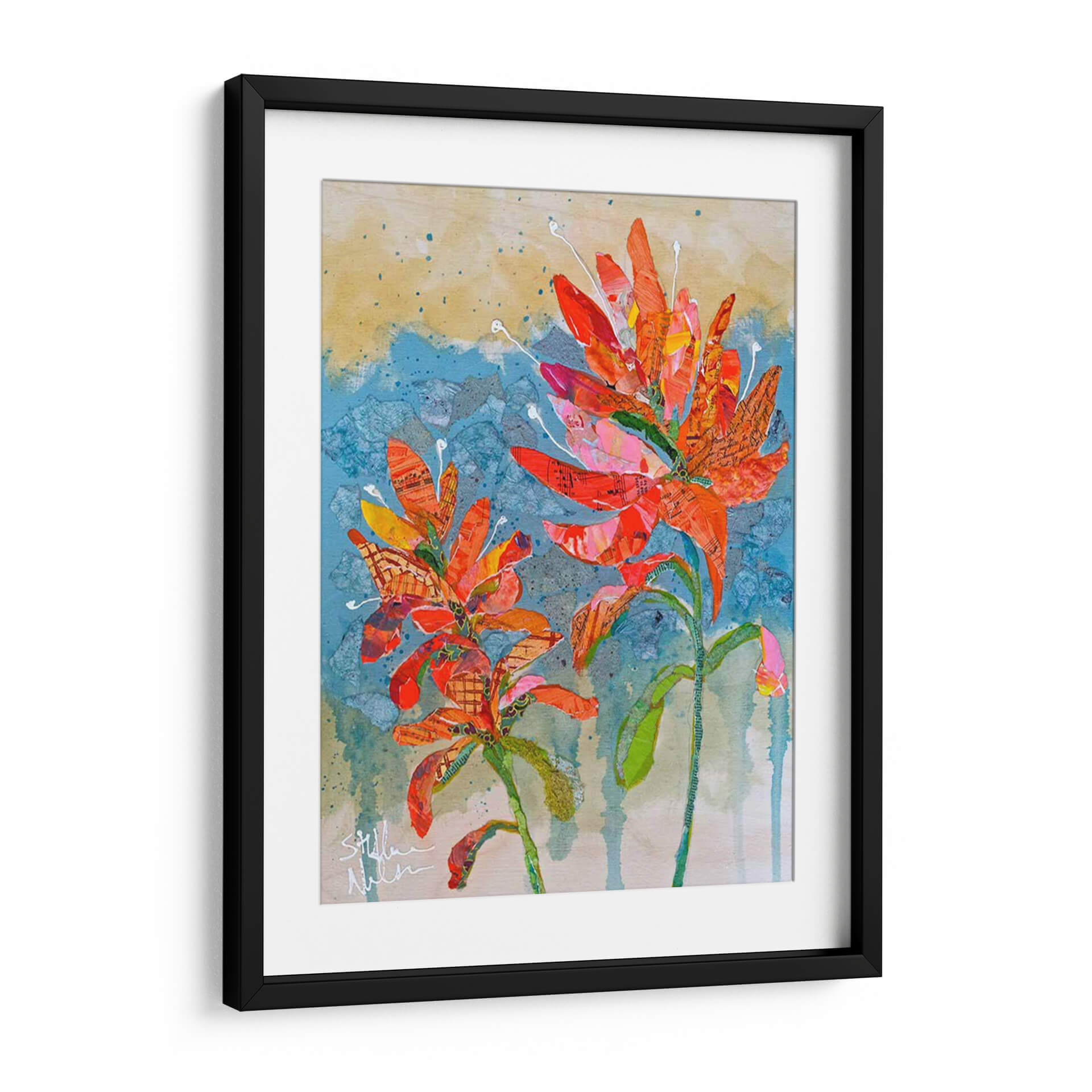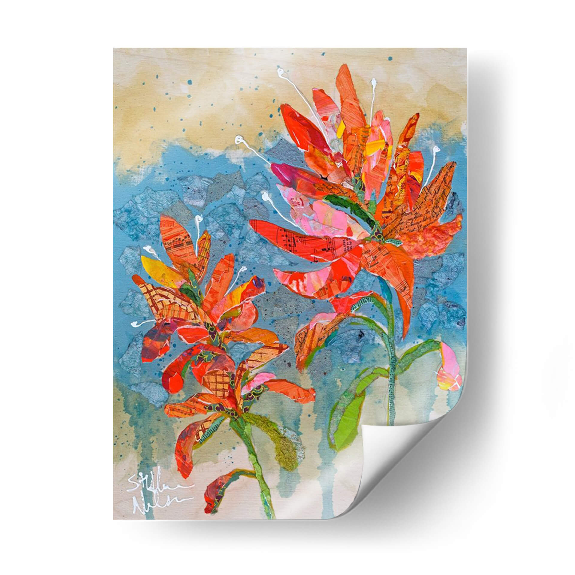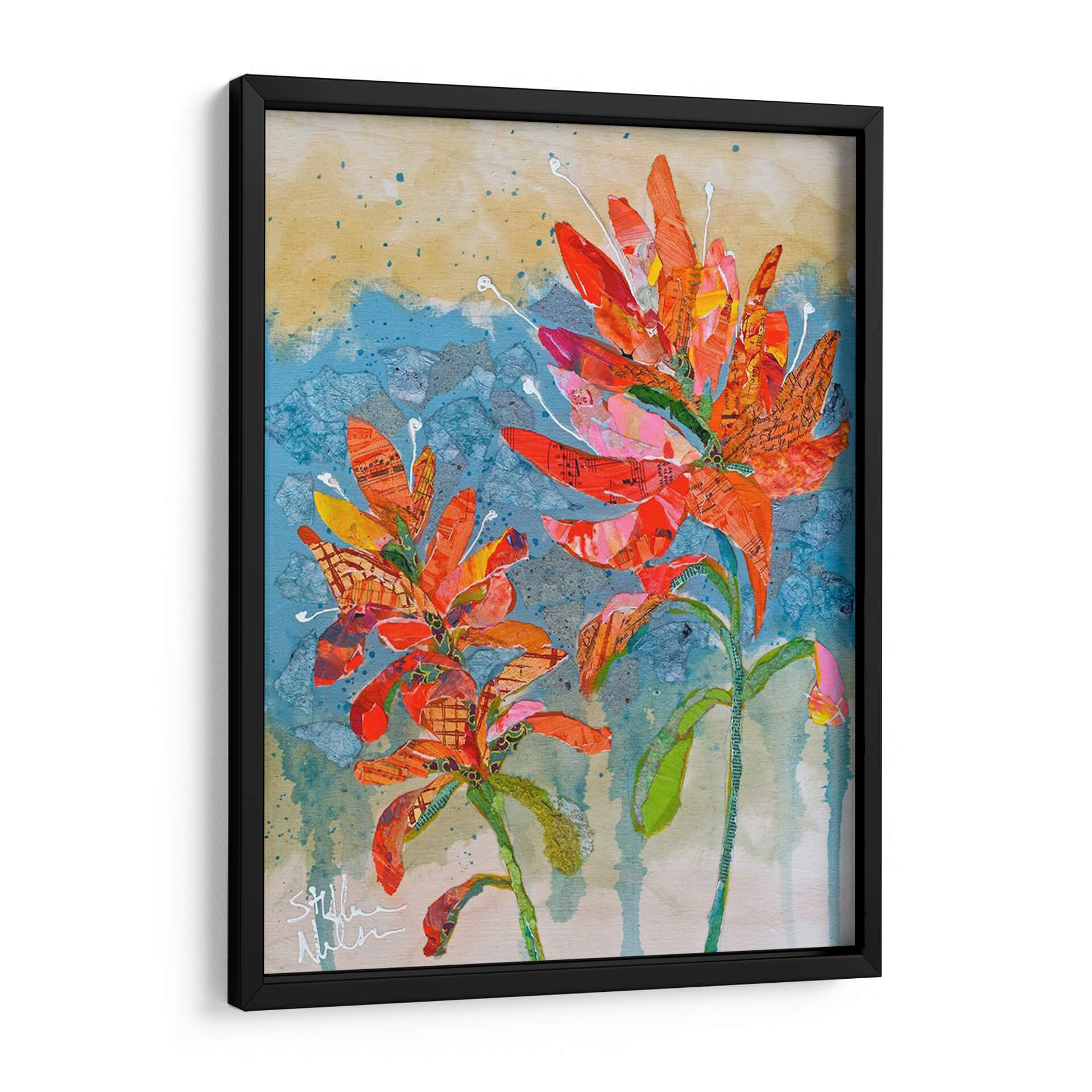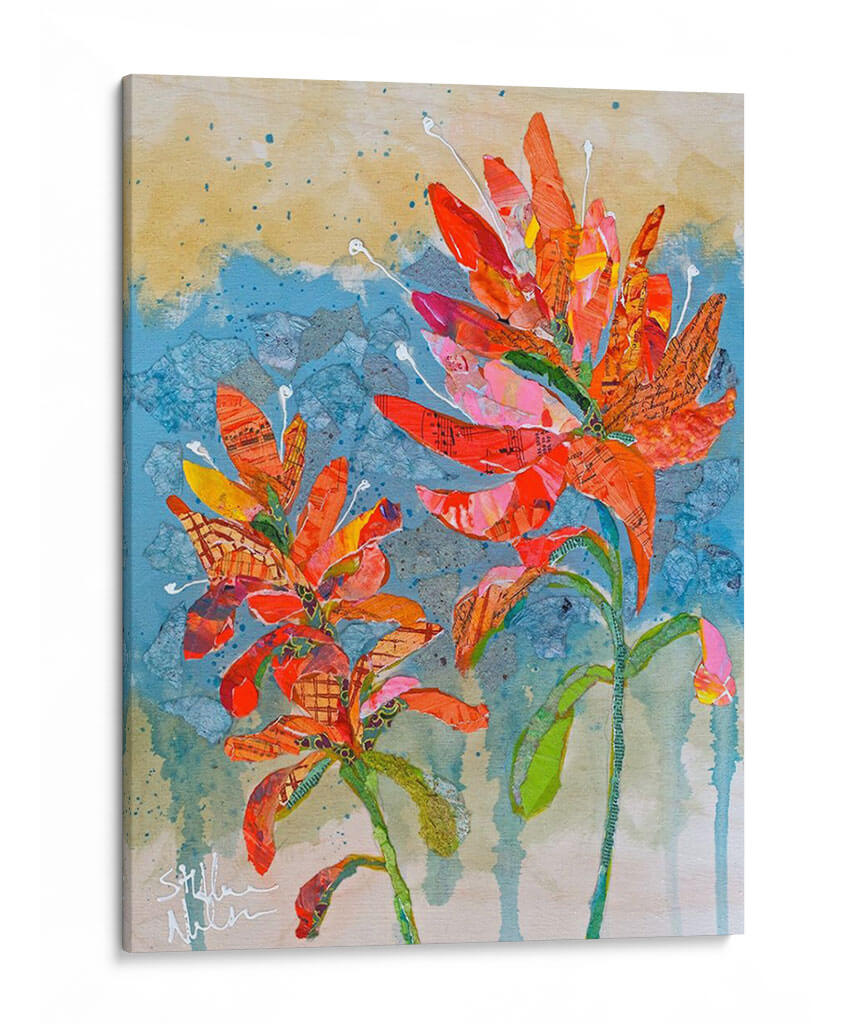 Sumérgete en la vibrante explosión de color y textura con 'Collage De Pincel Indio Ii', una obra de arte contemporáneo que captura la esencia de la naturaleza con un toque artístico único. Este cuadro decorativo presenta dos delicadas flores en tonos anaranjados y rojizos intensos, cuyas formas parecen emerger de un fondo texturizado en azules y ocres. La técnica de collage, empleada magistralmente por Elizabeth St. Hilaire, integra sutiles fragmentos de partituras y patrones, añadiendo una dimensión inesperada y una profundidad visual cautivadora. La composición, centrada en la exuberancia floral, evoca una sensación de alegría y vitalidad, perfecta para inyectar energía a cualquier espacio. Ideal para salones modernos, estudios o recibidores que buscan un punto focal distintivo y lleno de personalidad. Cada pincelada y corte de papel ha sido cuidadosamente dispuesto para crear una pieza que no solo decora, sino que también inspira y despierta la imaginación, convirtiéndose en un elemento decorativo de pared que habla de creatividad y aprecio por la belleza natural reimaginada. Añade este toque de arte contemporáneo a tu hogar y transforma tu ambiente con su calidez y estilo inconfundible.