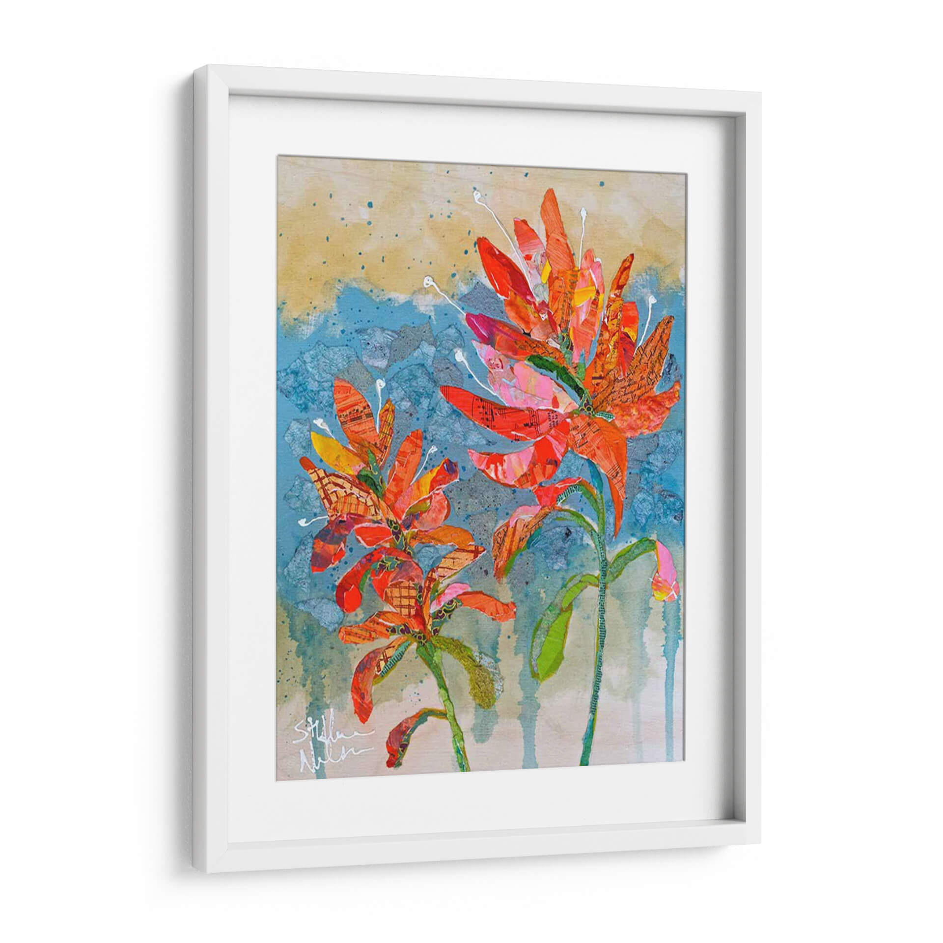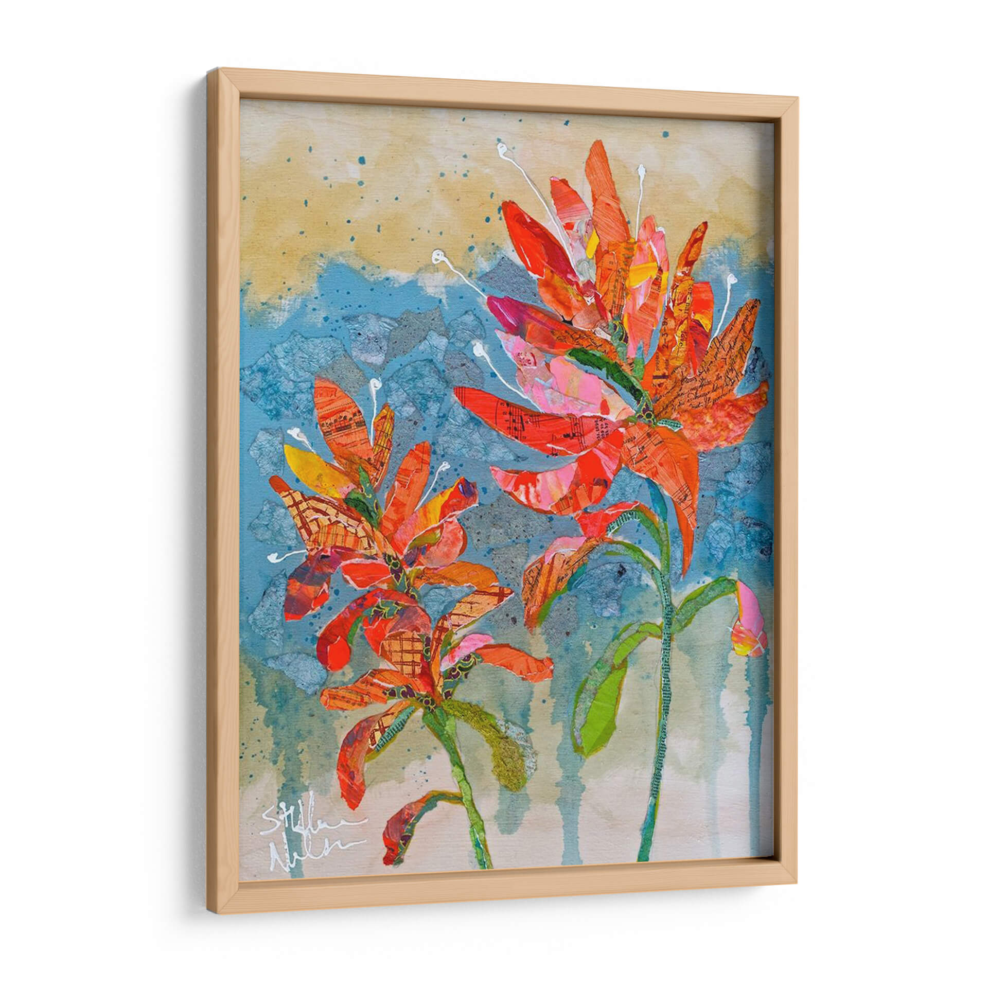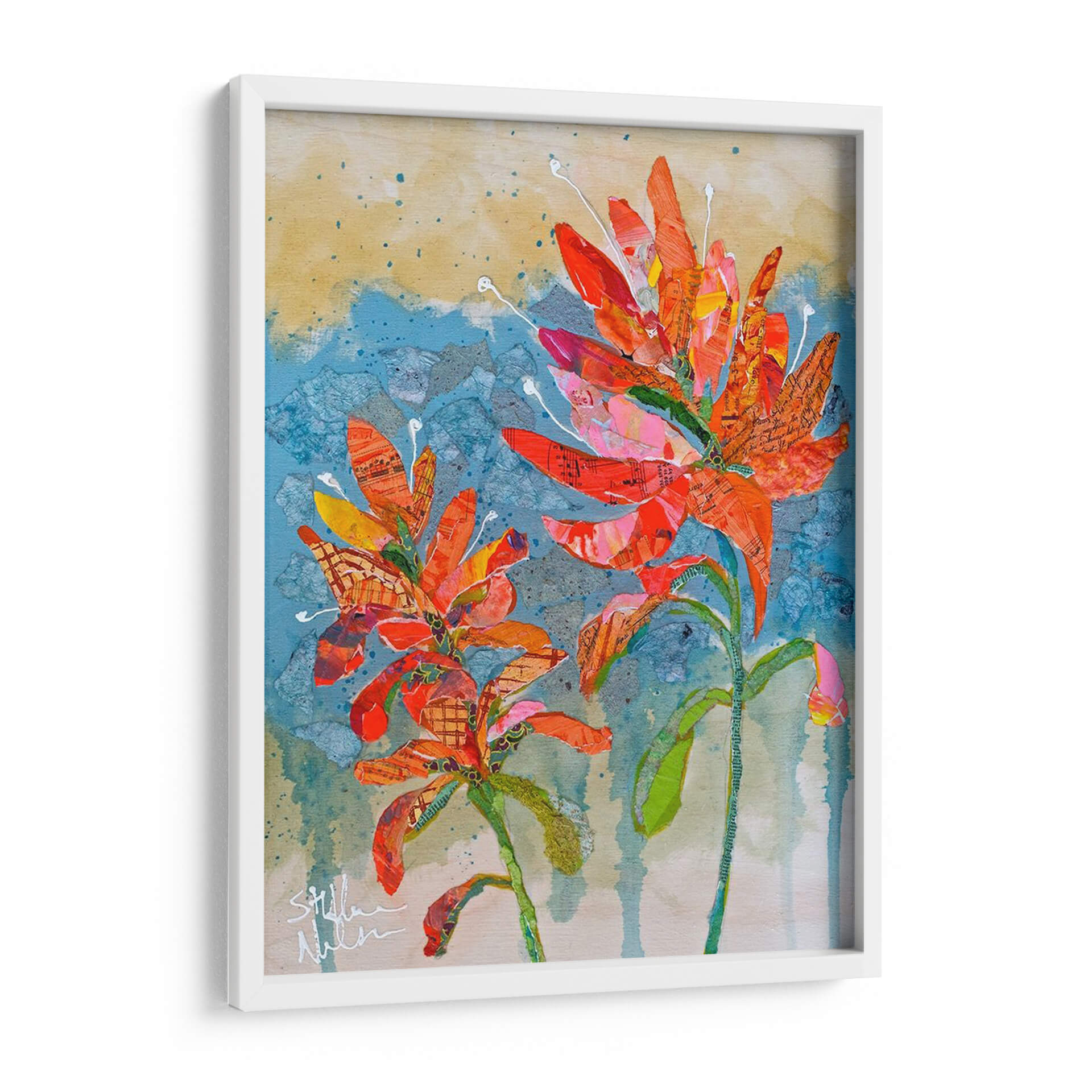 Sumérgete en la vibrante explosión de color y textura con 'Collage De Pincel Indio Ii', una obra de arte contemporáneo que captura la esencia de la naturaleza con un toque artístico único. Este cuadro decorativo presenta dos delicadas flores en tonos anaranjados y rojizos intensos, cuyas formas parecen emerger de un fondo texturizado en azules y ocres. La técnica de collage, empleada magistralmente por Elizabeth St. Hilaire, integra sutiles fragmentos de partituras y patrones, añadiendo una dimensión inesperada y una profundidad visual cautivadora. La composición, centrada en la exuberancia floral, evoca una sensación de alegría y vitalidad, perfecta para inyectar energía a cualquier espacio. Ideal para salones modernos, estudios o recibidores que buscan un punto focal distintivo y lleno de personalidad. Cada pincelada y corte de papel ha sido cuidadosamente dispuesto para crear una pieza que no solo decora, sino que también inspira y despierta la imaginación, convirtiéndose en un elemento decorativo de pared que habla de creatividad y aprecio por la belleza natural reimaginada. Añade este toque de arte contemporáneo a tu hogar y transforma tu ambiente con su calidez y estilo inconfundible.