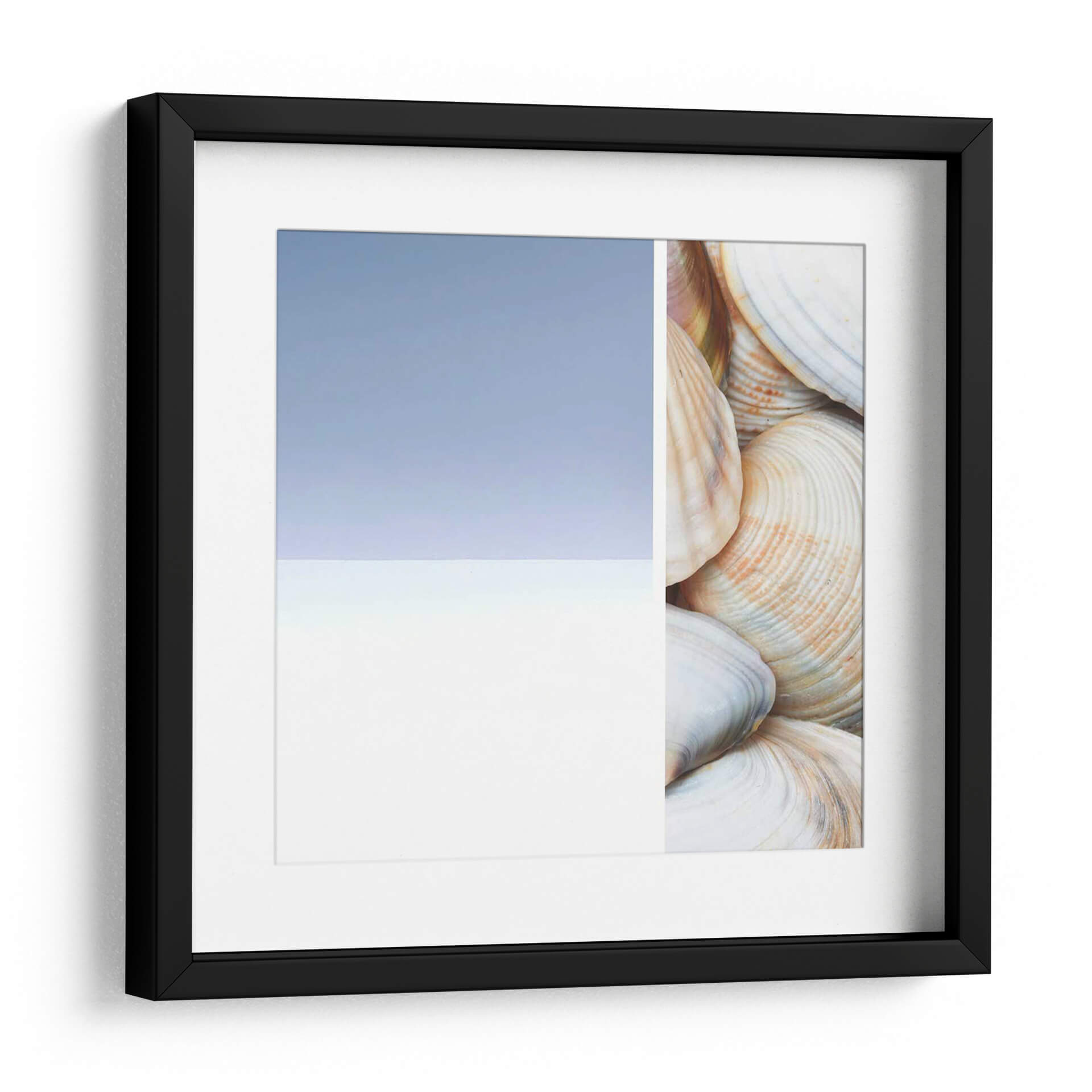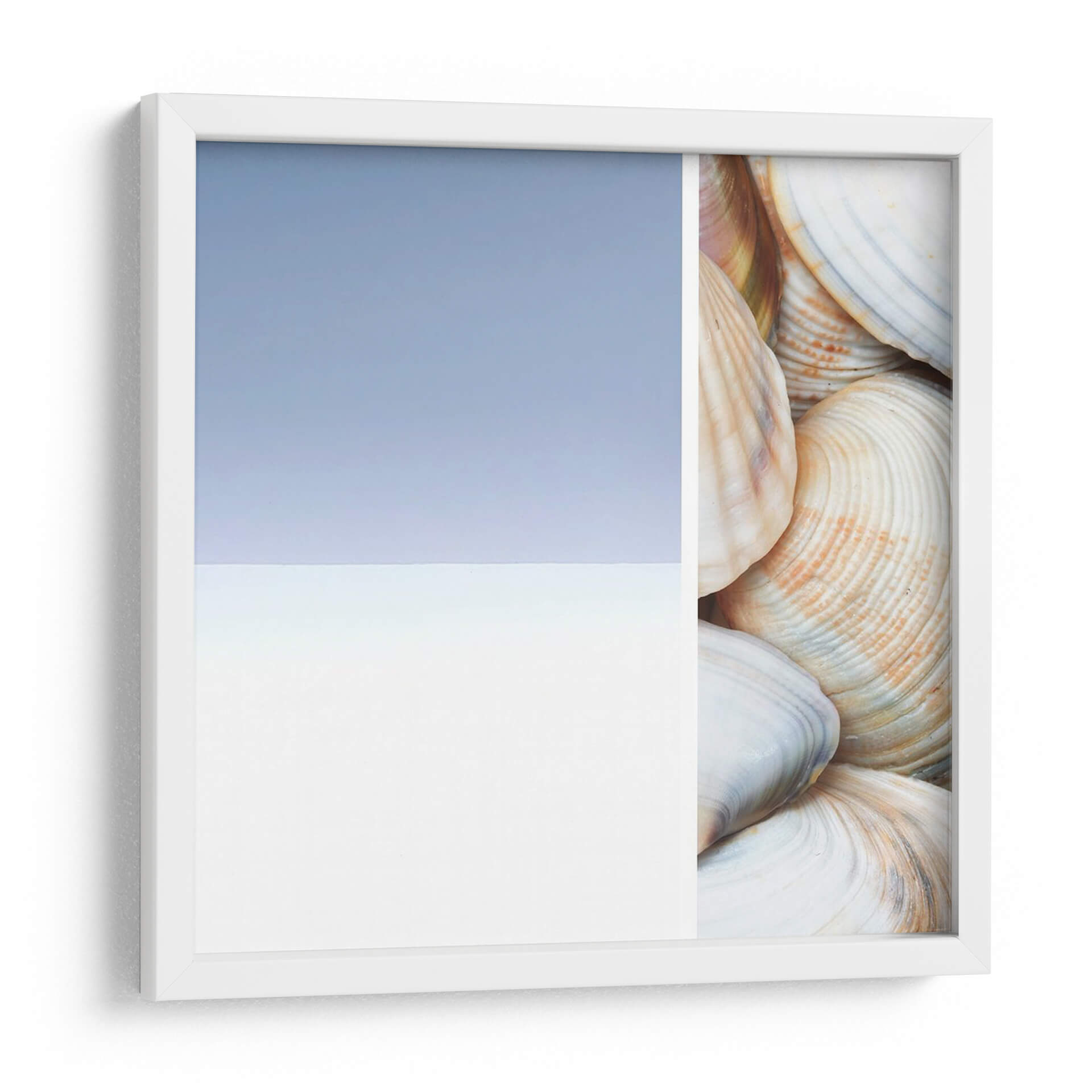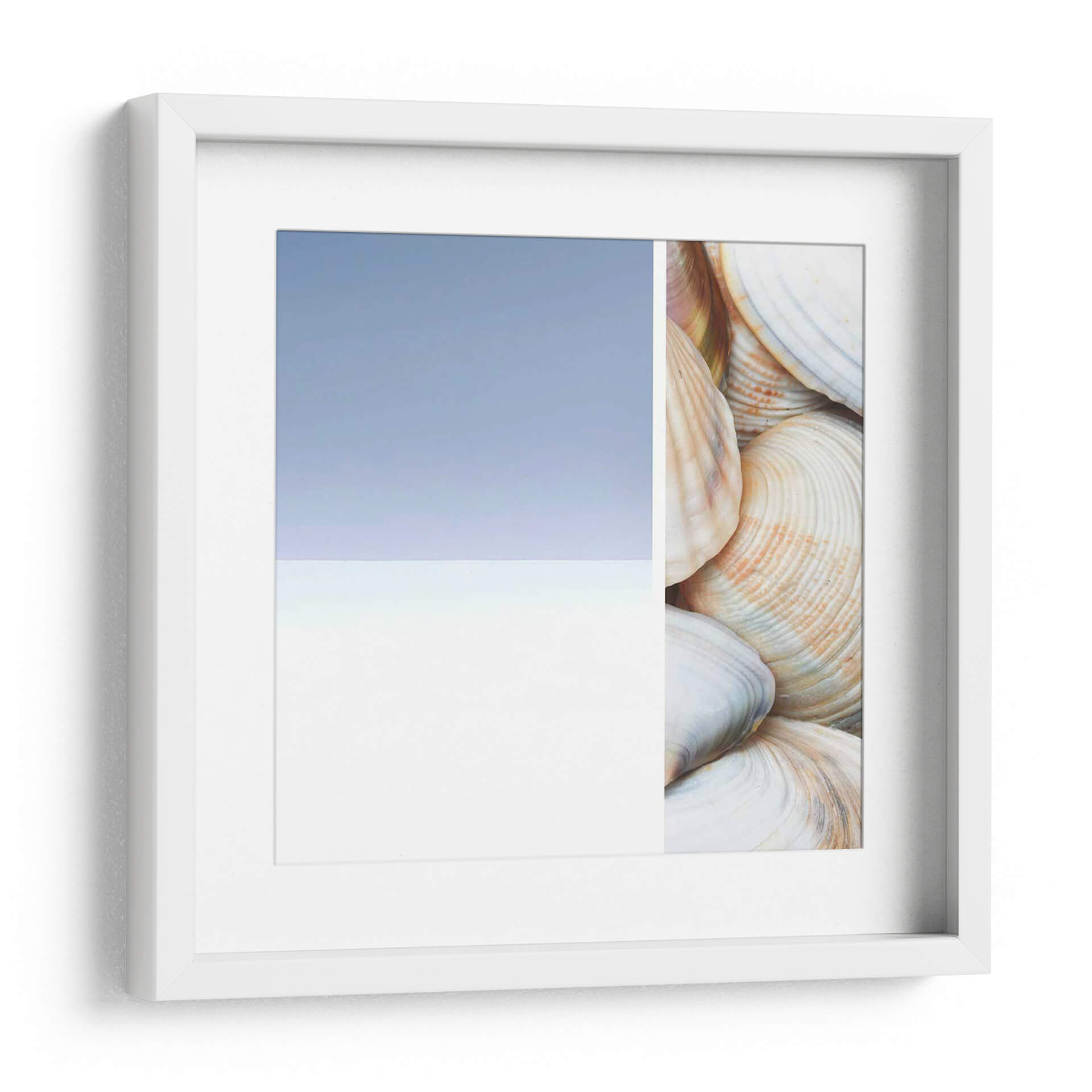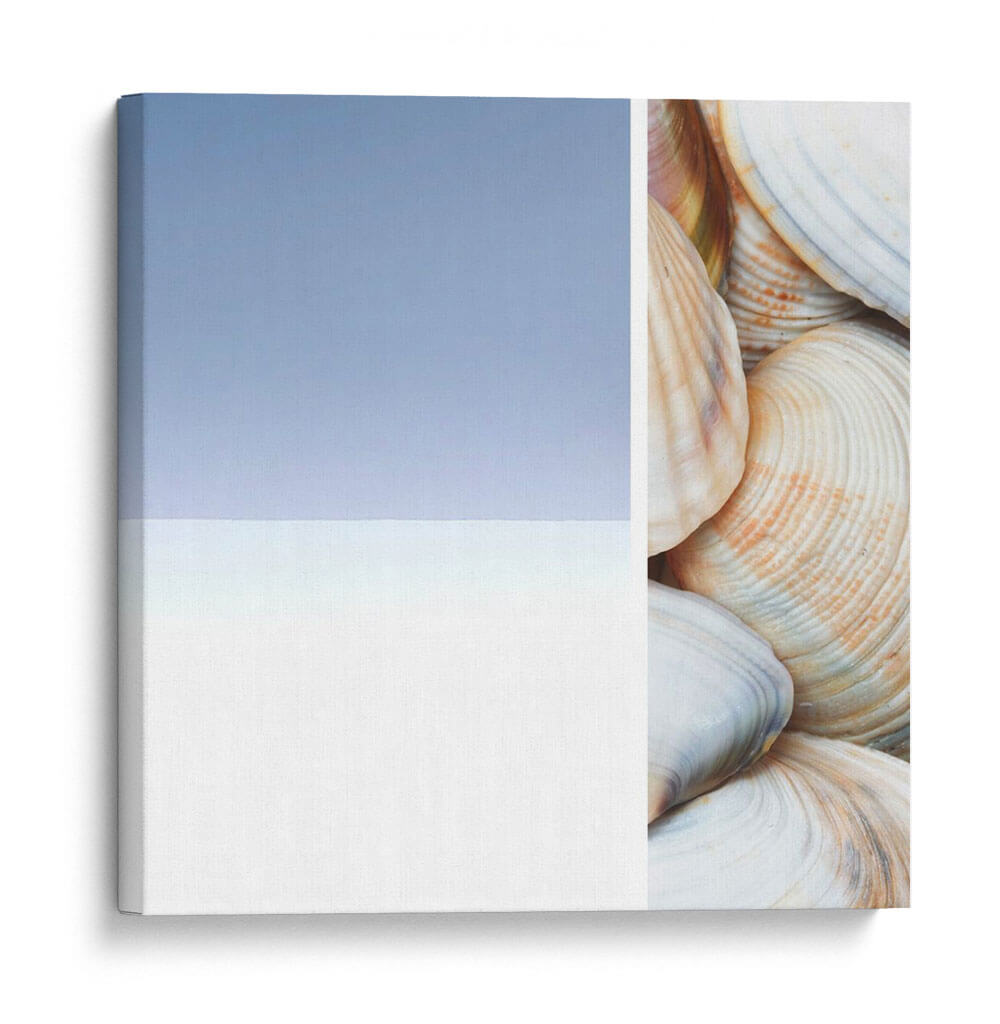 Sumérgete en la serenidad costera con "Collage Spa I", una obra de arte que captura la esencia tranquila del mar. Esta pieza, creada por Irena Orlov, presenta un cautivador collage que fusiona la abstracción sutil de un cielo y mar estilizados con el detalle orgánico de una colección de conchas marinas. Los tonos pastel, dominados por un azul cielo suave y un blanco nítido en un lado, contrastan elegantemente con la calidez de las conchas en el otro, que exhiben delicados matices de crema, beige y toques de coral. La composición, dividida limpiamente, crea una dualidad visual entre lo etéreo y lo terrenal, invitando a la contemplación y al descanso. Ideal para espacios que buscan evocar paz y conexión con la naturaleza, como dormitorios, baños o salas de estar con una estética relajada. "Collage Spa I" no es solo una decoración; es una invitación a un santuario personal, aportando una sensación de calma y frescura a cualquier ambiente, y transformando tu hogar en un refugio de tranquilidad inspirado en la belleza natural.