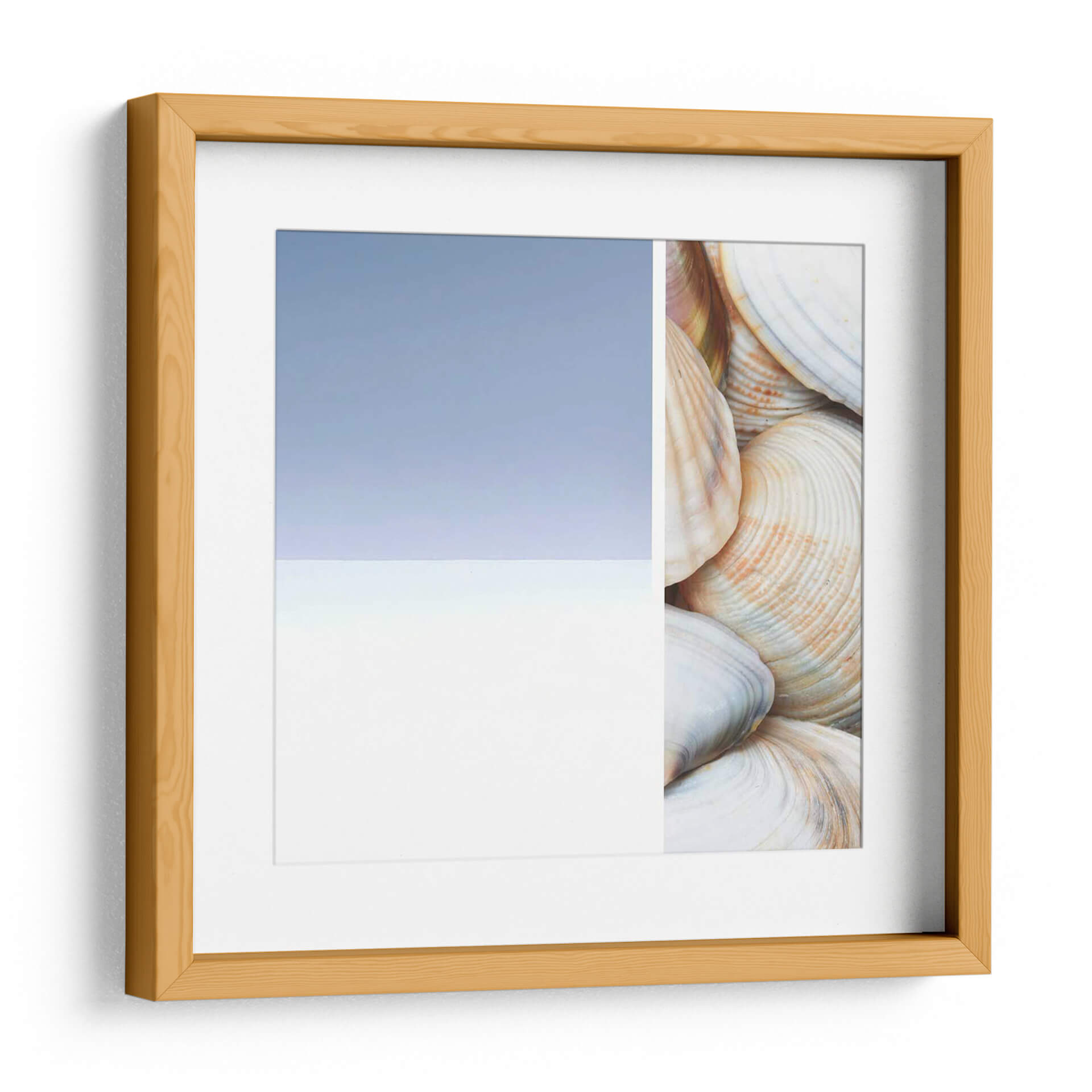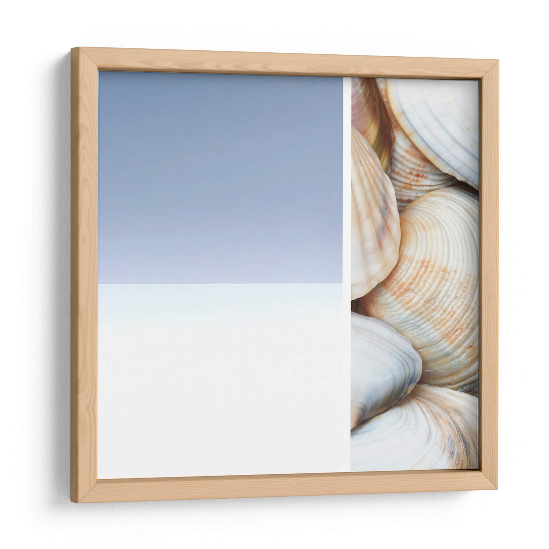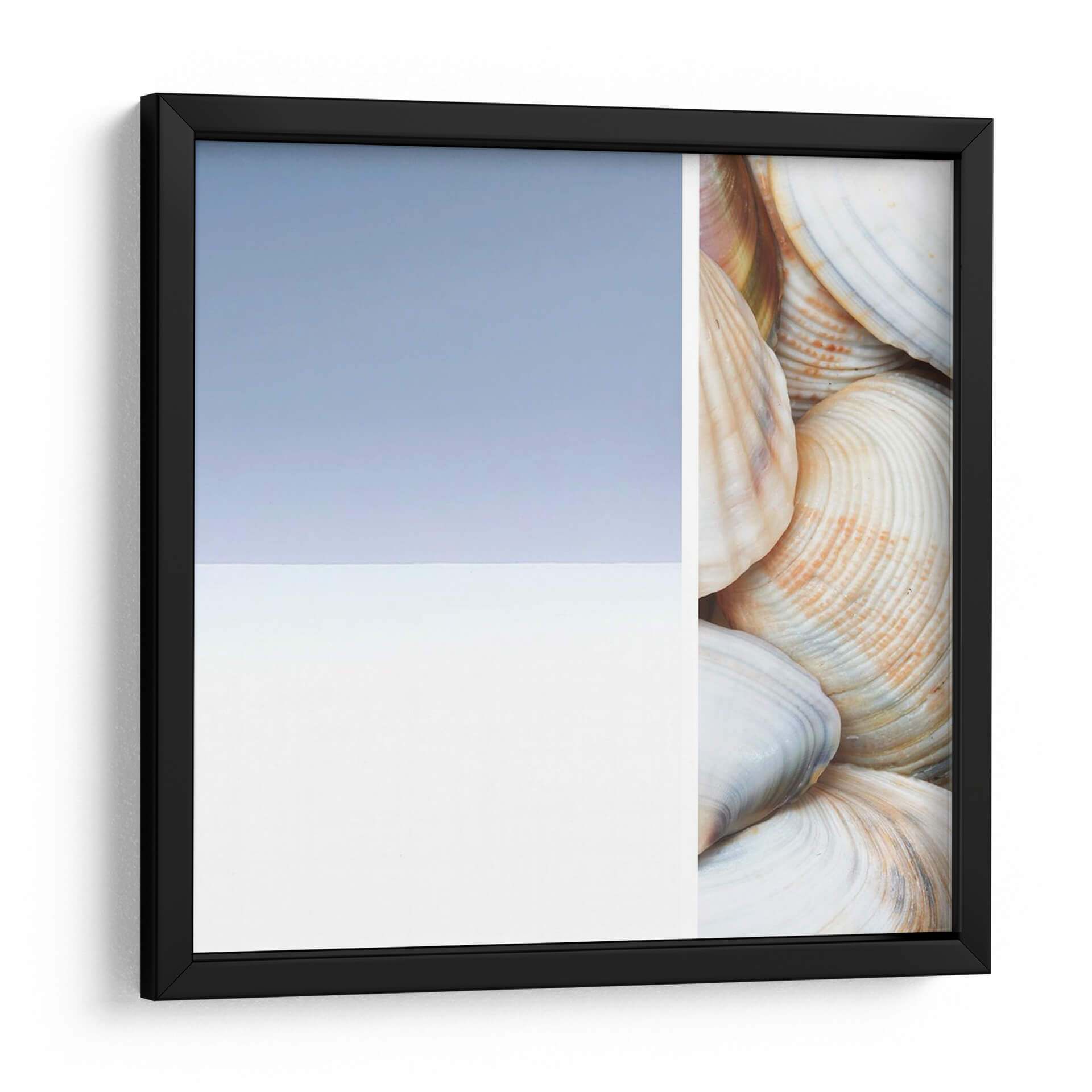 Sumérgete en la serenidad costera con "Collage Spa I", una obra de arte que captura la esencia tranquila del mar. Esta pieza, creada por Irena Orlov, presenta un cautivador collage que fusiona la abstracción sutil de un cielo y mar estilizados con el detalle orgánico de una colección de conchas marinas. Los tonos pastel, dominados por un azul cielo suave y un blanco nítido en un lado, contrastan elegantemente con la calidez de las conchas en el otro, que exhiben delicados matices de crema, beige y toques de coral. La composición, dividida limpiamente, crea una dualidad visual entre lo etéreo y lo terrenal, invitando a la contemplación y al descanso. Ideal para espacios que buscan evocar paz y conexión con la naturaleza, como dormitorios, baños o salas de estar con una estética relajada. "Collage Spa I" no es solo una decoración; es una invitación a un santuario personal, aportando una sensación de calma y frescura a cualquier ambiente, y transformando tu hogar en un refugio de tranquilidad inspirado en la belleza natural.