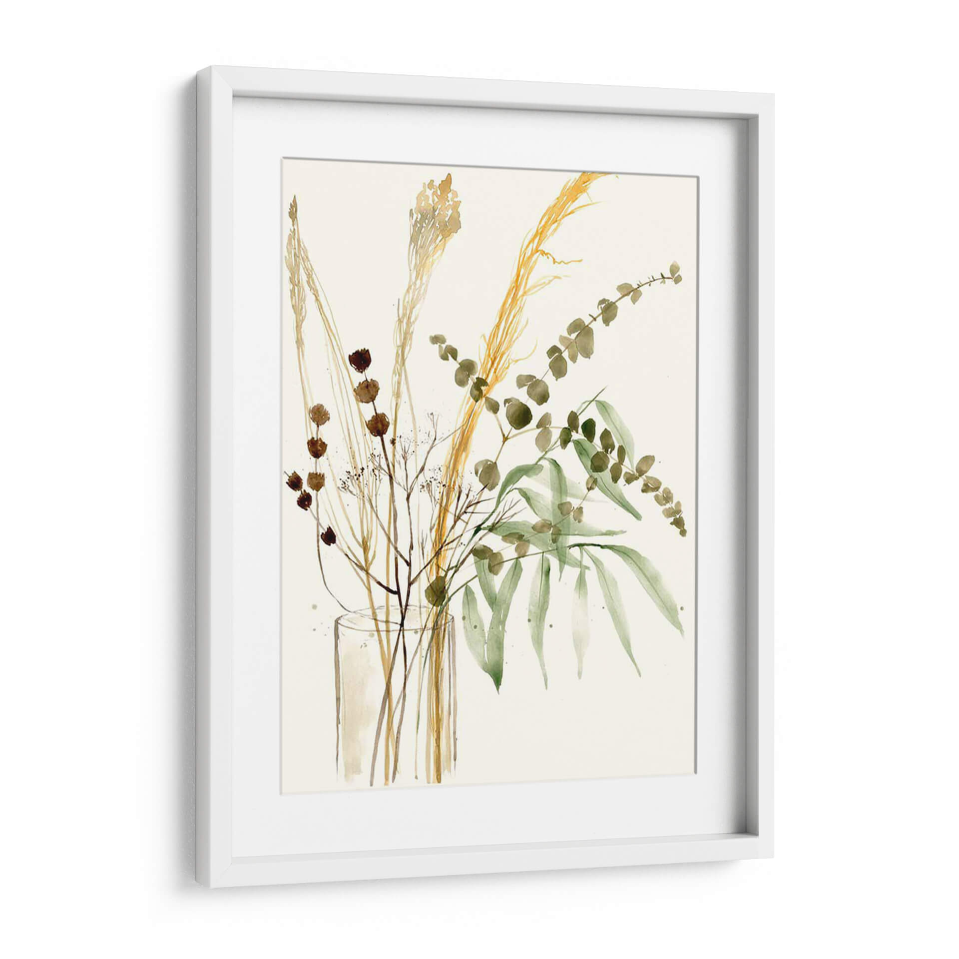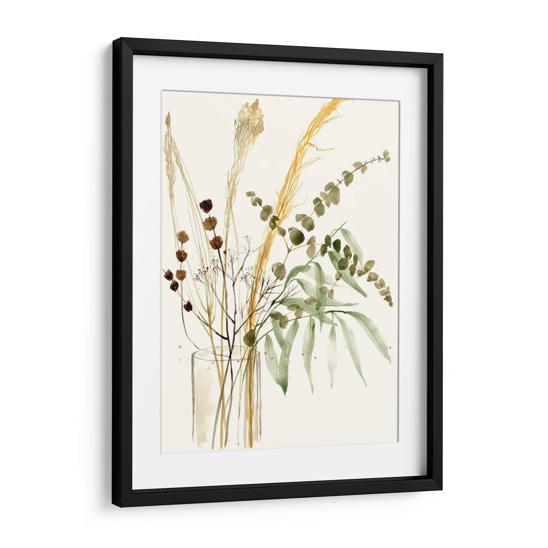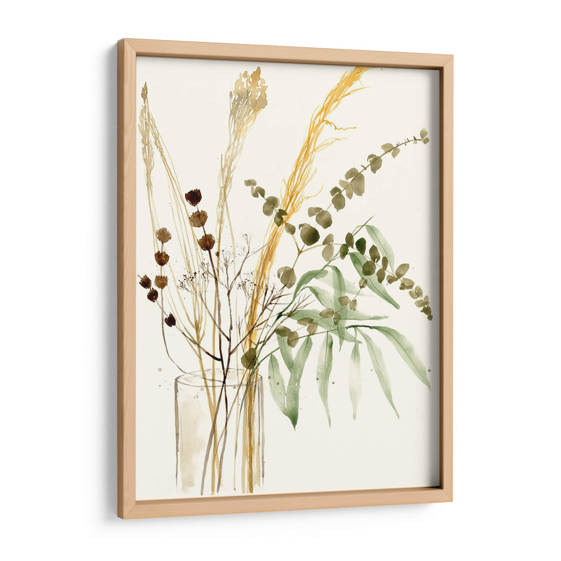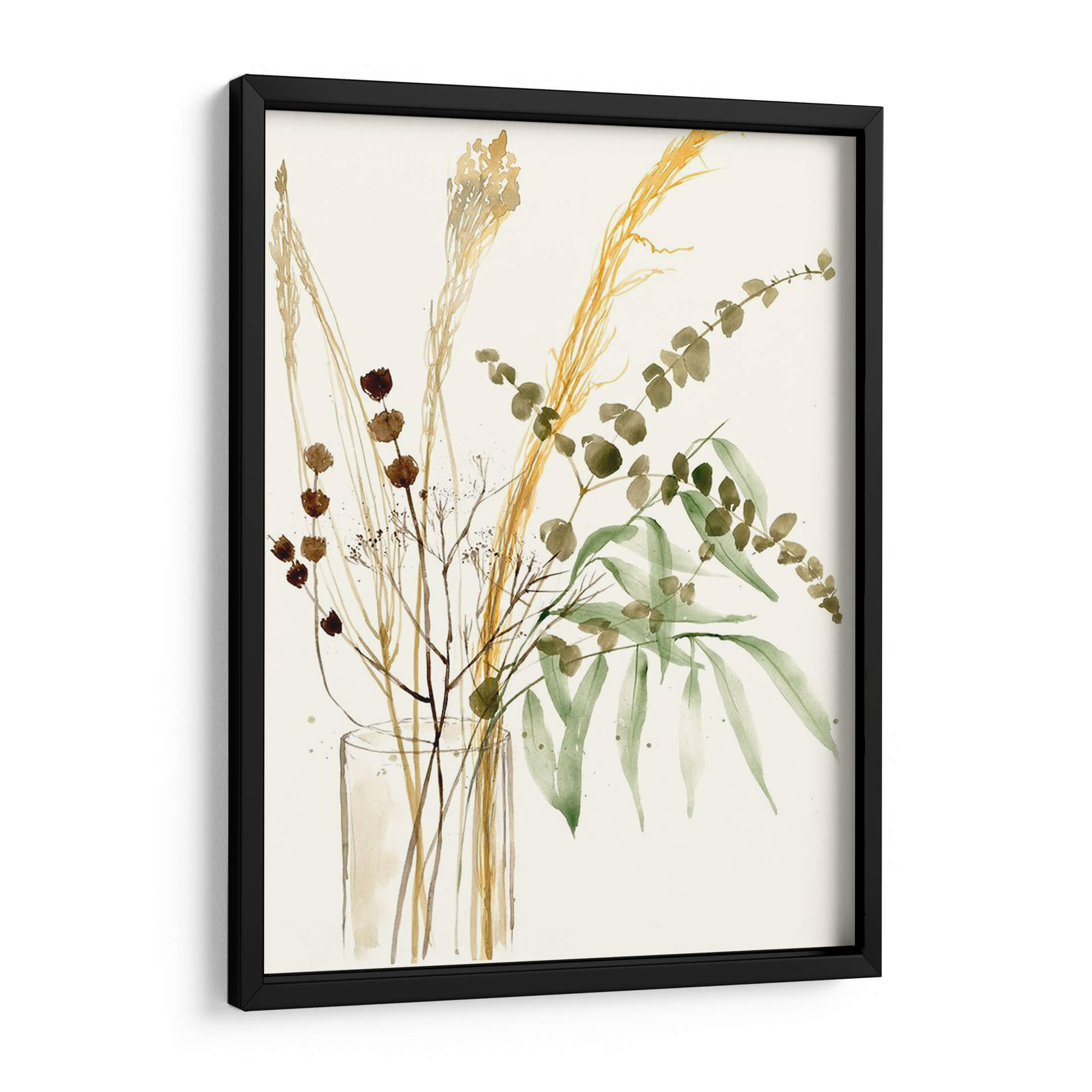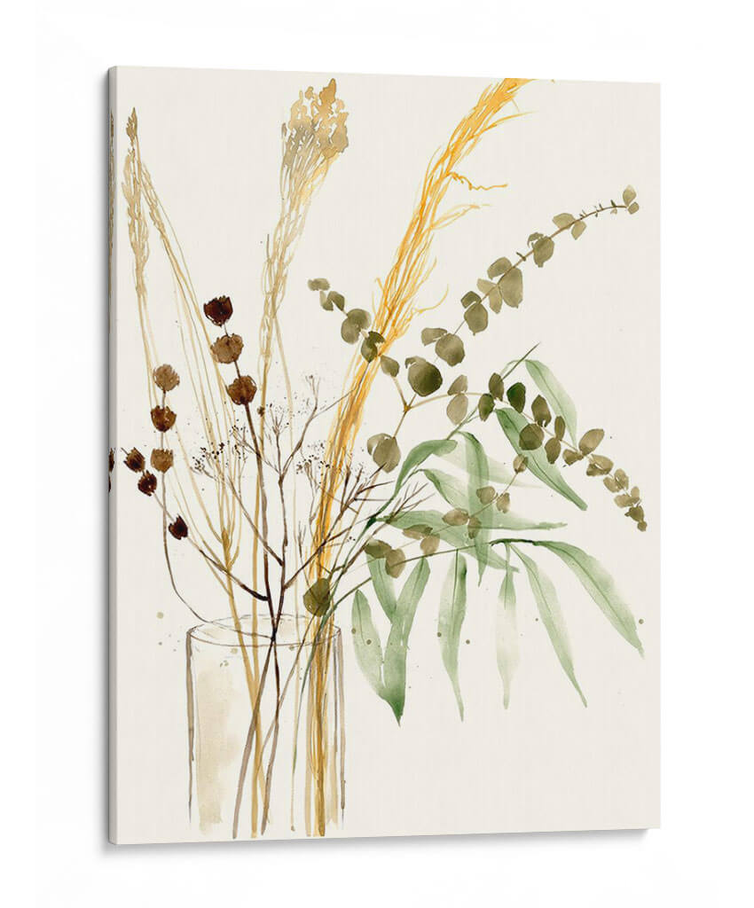 Captura la esencia de la naturaleza serena con "Composición En Jarrón Ii", una obra de arte digital que celebra la belleza sutil de la flora seca y las hojas verdes. Este cuadro decorativo presenta un delicado arreglo floral en tonos tierra y verdes suaves, con elementos como espigas doradas, ramas finas con pequeñas flores marrones y delicadas hojas de eucalipto. La técnica acuarela, ejecutada con maestría, evoca una sensación de ligereza y movimiento, como si las plantas danzaran suavemente en su jarrón transparente. La paleta de colores, dominada por ocres, marrones, verdes musgo y un fondo neutro y luminoso, crea una atmósfera de calma, sofisticación y conexión con lo orgánico. Ideal para espacios que buscan un toque de elegancia natural, como salones, dormitorios o estudios, este cuadro moderno es perfecto para añadir serenidad y un punto focal artístico sin abrumar. Su composición vertical y el estilo contemporáneo lo convierten en una pieza versátil que complementa una amplia gama de decoraciones, desde las más minimalistas hasta las rústicas chic. Añade esta pieza inspirada en la botánica a tu hogar y siente la tranquilidad y el encanto del mundo natural.