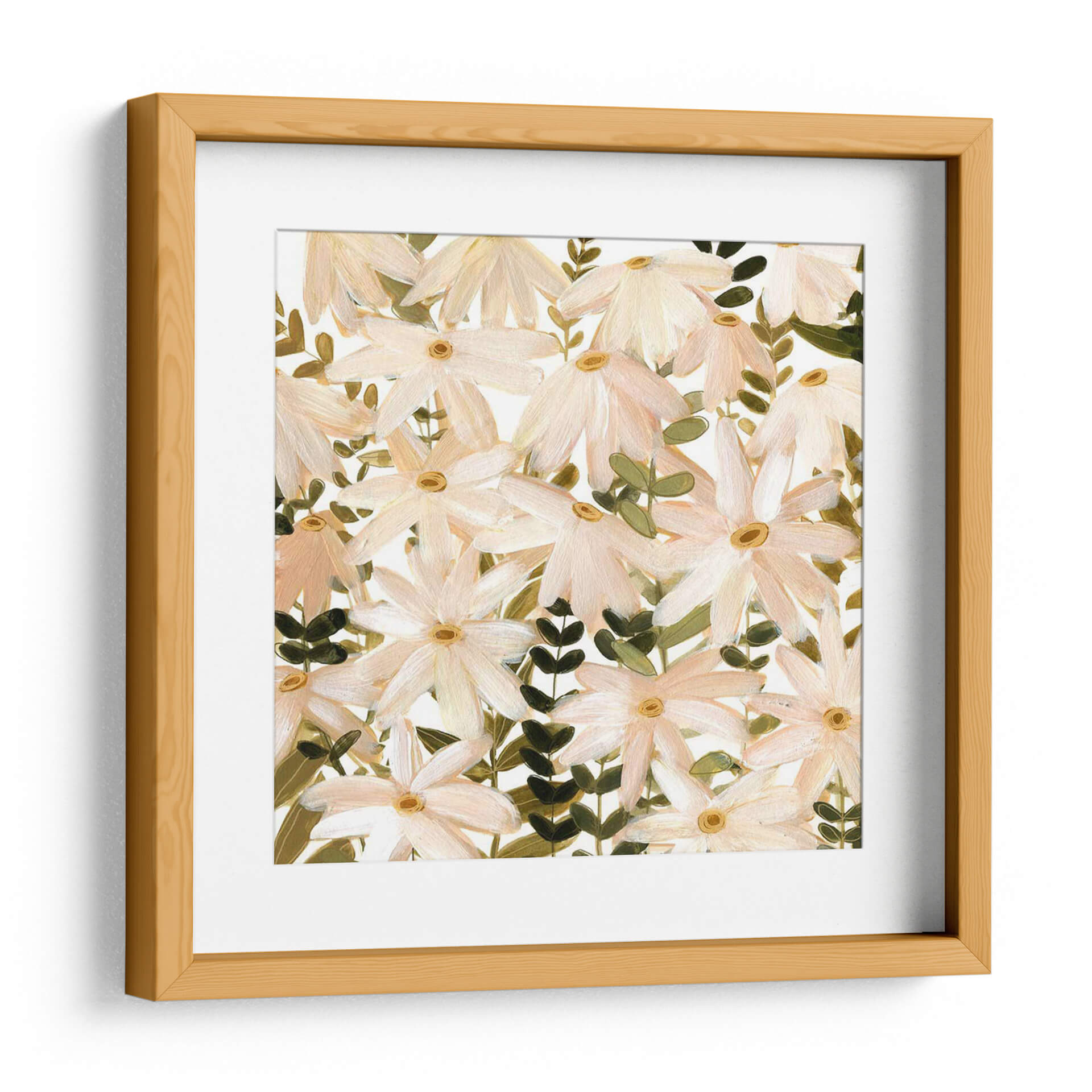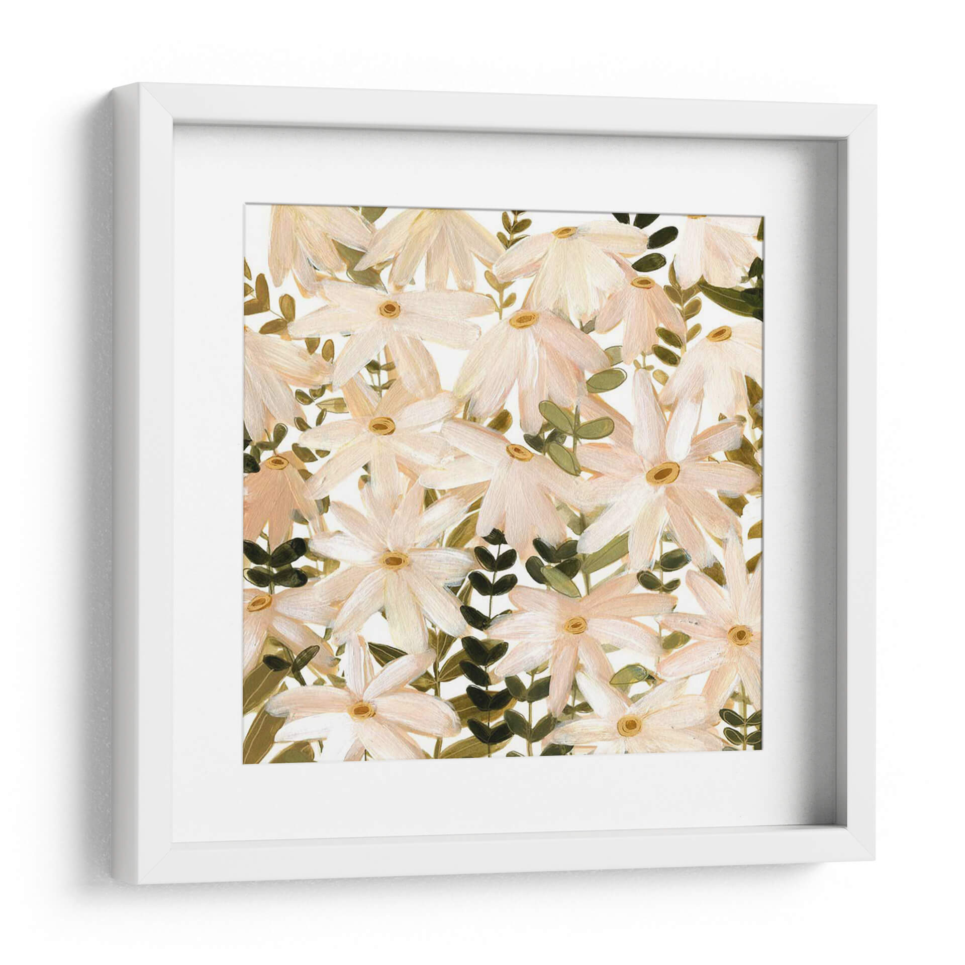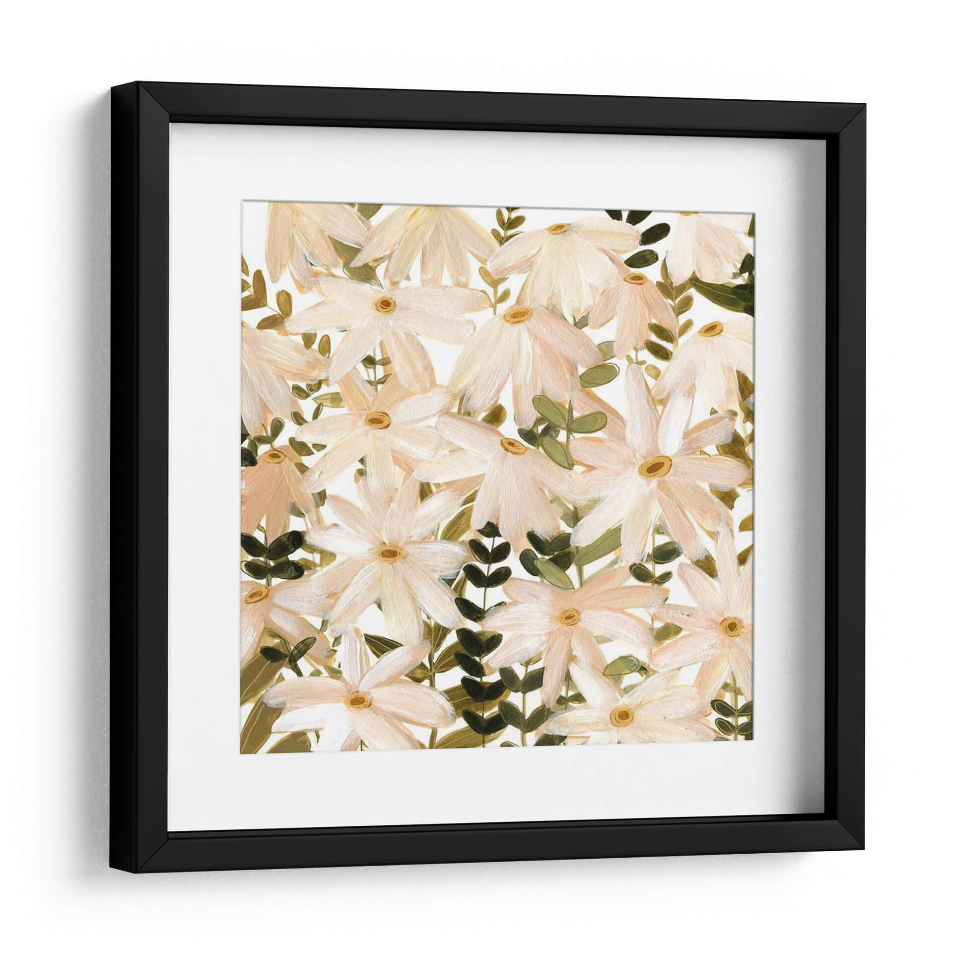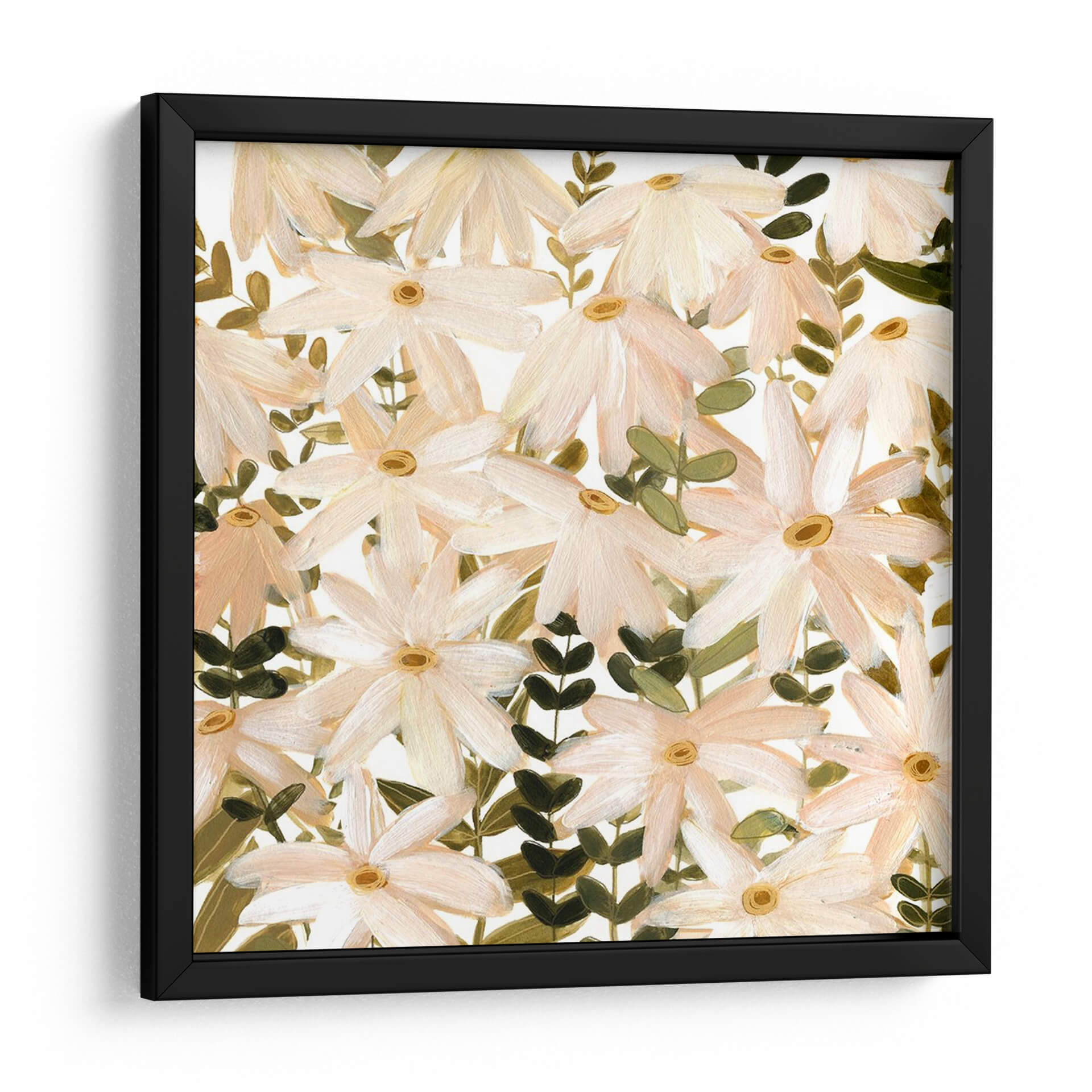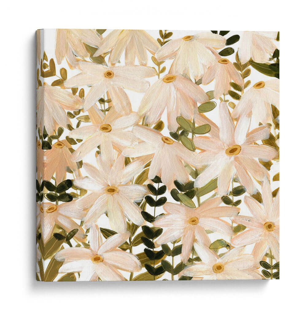 Sumérgete en la delicadeza de "Daisy Field II", una obra de arte que captura la esencia de un campo florido con una sensibilidad contemporánea. Las margenes suaves de pétalos en tonos melocotón y blanco, salpicados por el cálido centro de color amarillo ocre, crean una armonía visual que evoca calma y serenidad. Las pinceladas sueltas y expresivas, características del estilo impresionista moderno de Emma Scarvey, otorgan profundidad y textura a la composición, invitando a la contemplación. Las hojas verdes oscuras y los tallos crean un contraste sutil pero efectivo, anclando la pieza y aportando vitalidad. Este cuadro decorativo es ideal para infundir un ambiente de tranquilidad y belleza natural en cualquier espacio, desde un dormitorio acogedor hasta una sala de estar luminosa o un estudio inspirador. "Daisy Field II" no es solo una representación floral, sino una invitación a conectar con la naturaleza y la belleza efímera de las flores, aportando un toque de sofisticación y frescura atemporal a tu decoración.