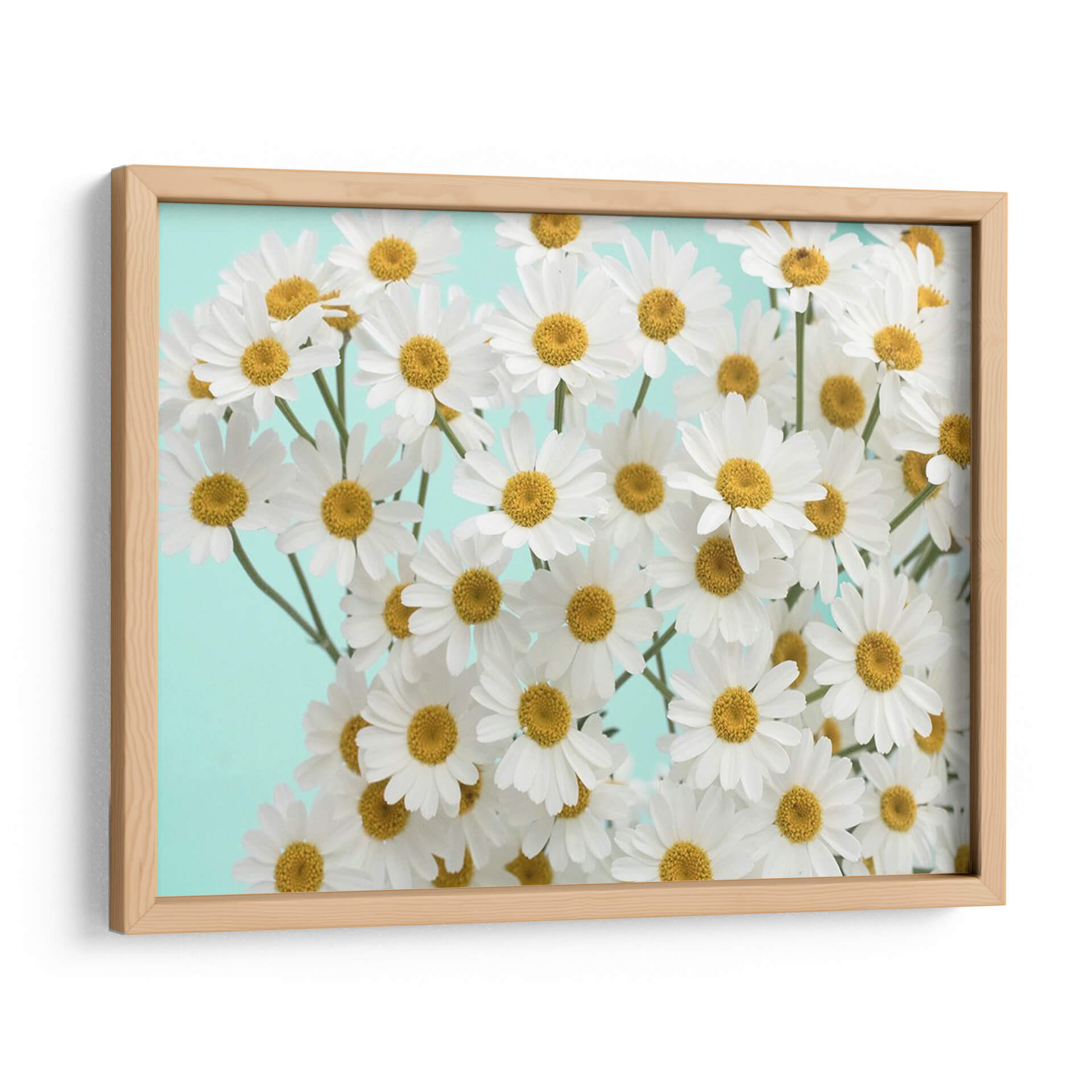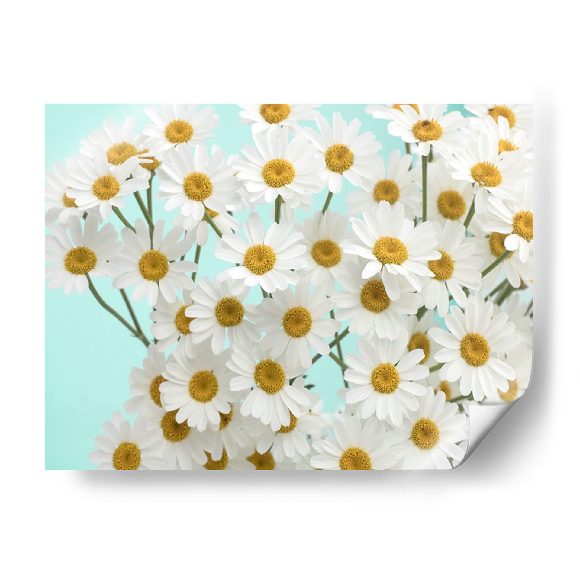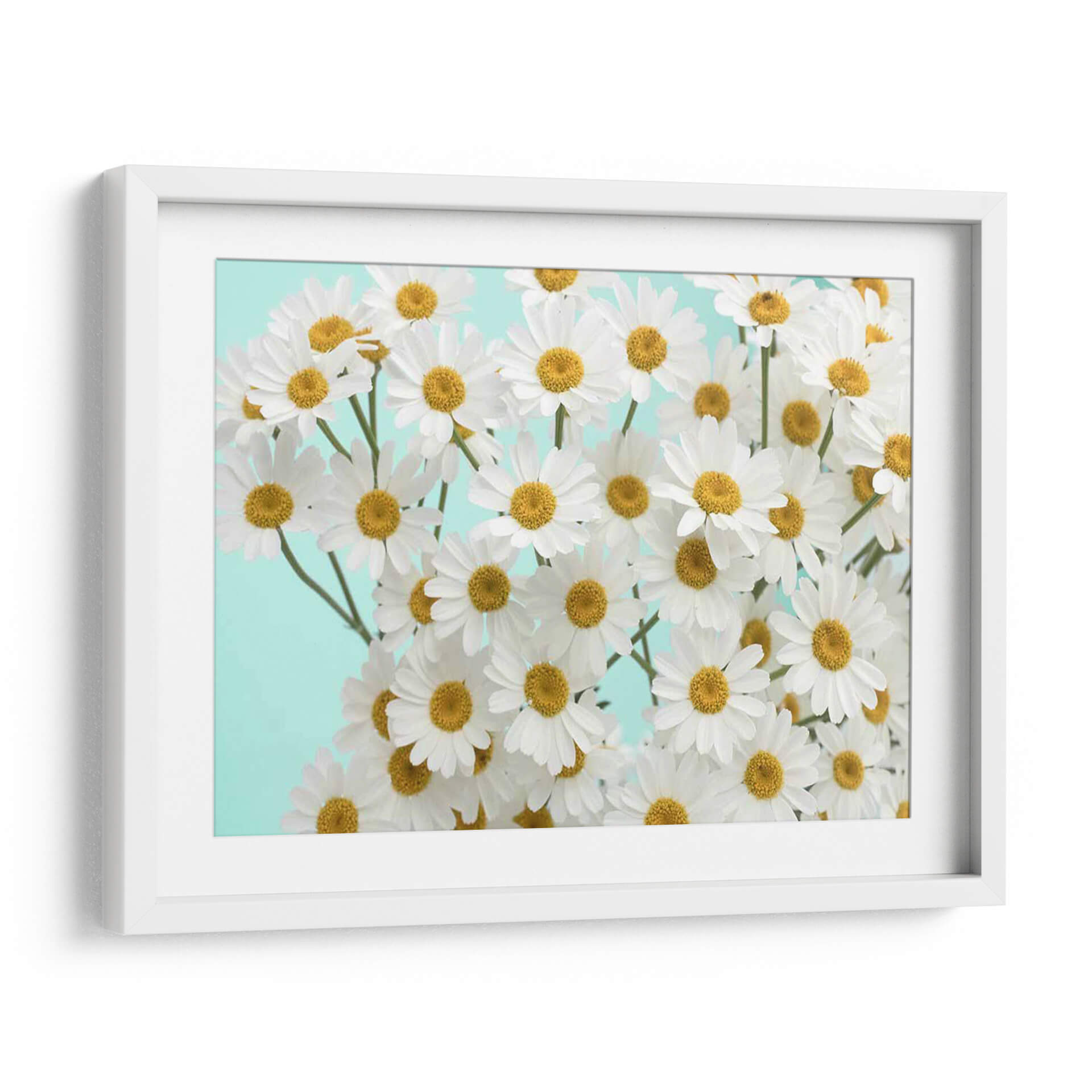 Inunda tu hogar con la frescura y la alegría de "Daisy Love Iii", una obra de arte decorativo de pared que captura la esencia vibrante de las margaritas en plena floración. Este cuadro decorativo presenta un detallado primer plano de numerosas flores de margarita blanca con centros amarillos brillantes, dispuestas de manera orgánica sobre un fondo liso de color azul verdoso suave. La composición, llena de vida y delicadeza, evoca una sensación de paz y optimismo, perfecta para añadir un toque de naturaleza y serenidad a cualquier espacio. Los colores puros y la claridad de la imagen la convierten en una pieza versátil, ideal para salones modernos, dormitorios acogedores, recibidores luminosos o incluso oficinas que buscan un ambiente más inspirador. "Daisy Love Iii" no es solo una decoración, es una invitación a disfrutar de la belleza simple y radiante de la naturaleza, transformando tu ambiente en un oasis de calma y estilo. Integra esta pieza en tu decoración para crear un punto focal encantador que nunca pasará de moda, aportando luz y una conexión con la vitalidad de las flores.