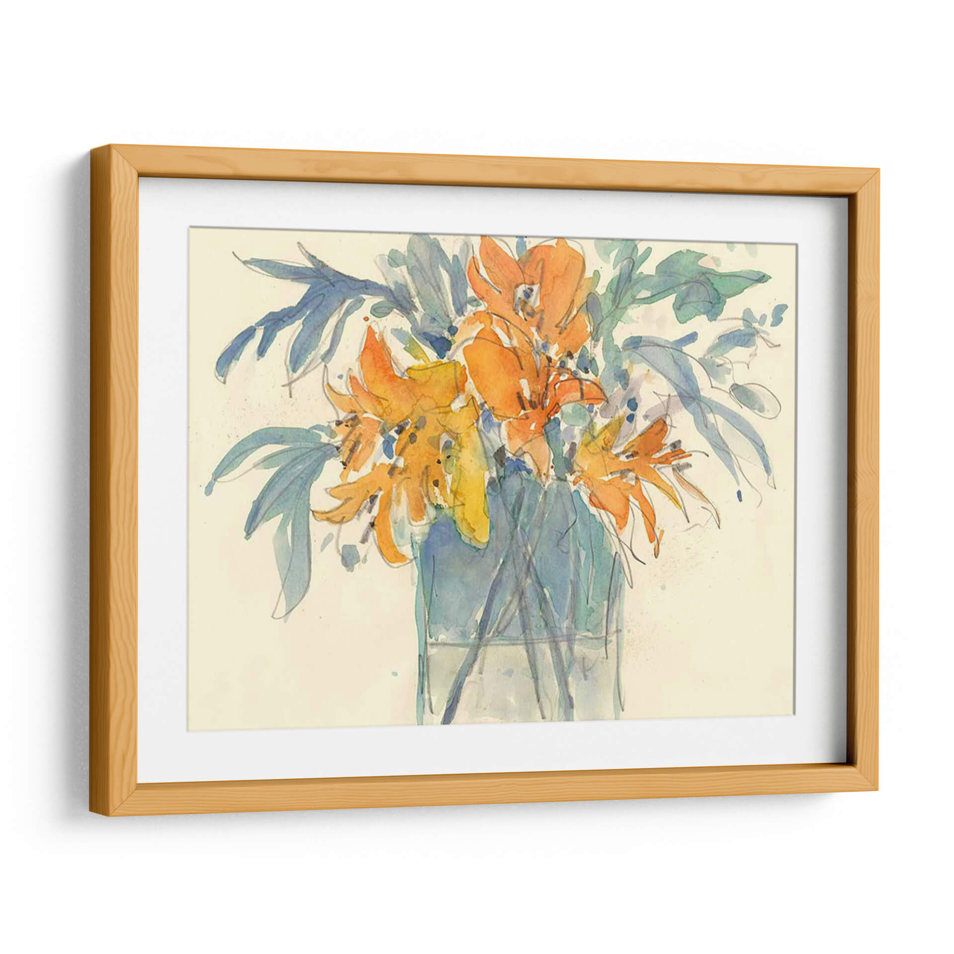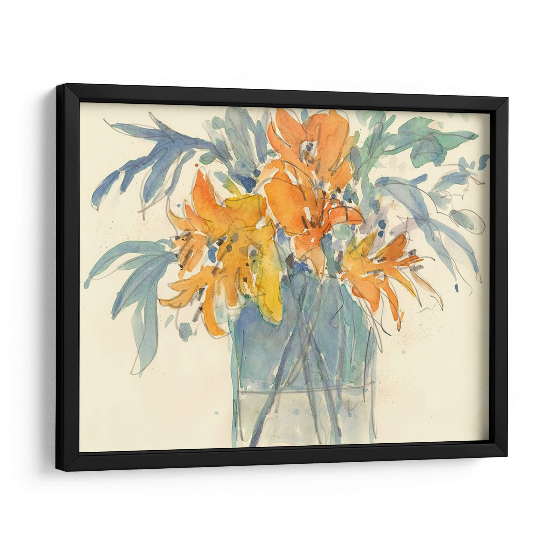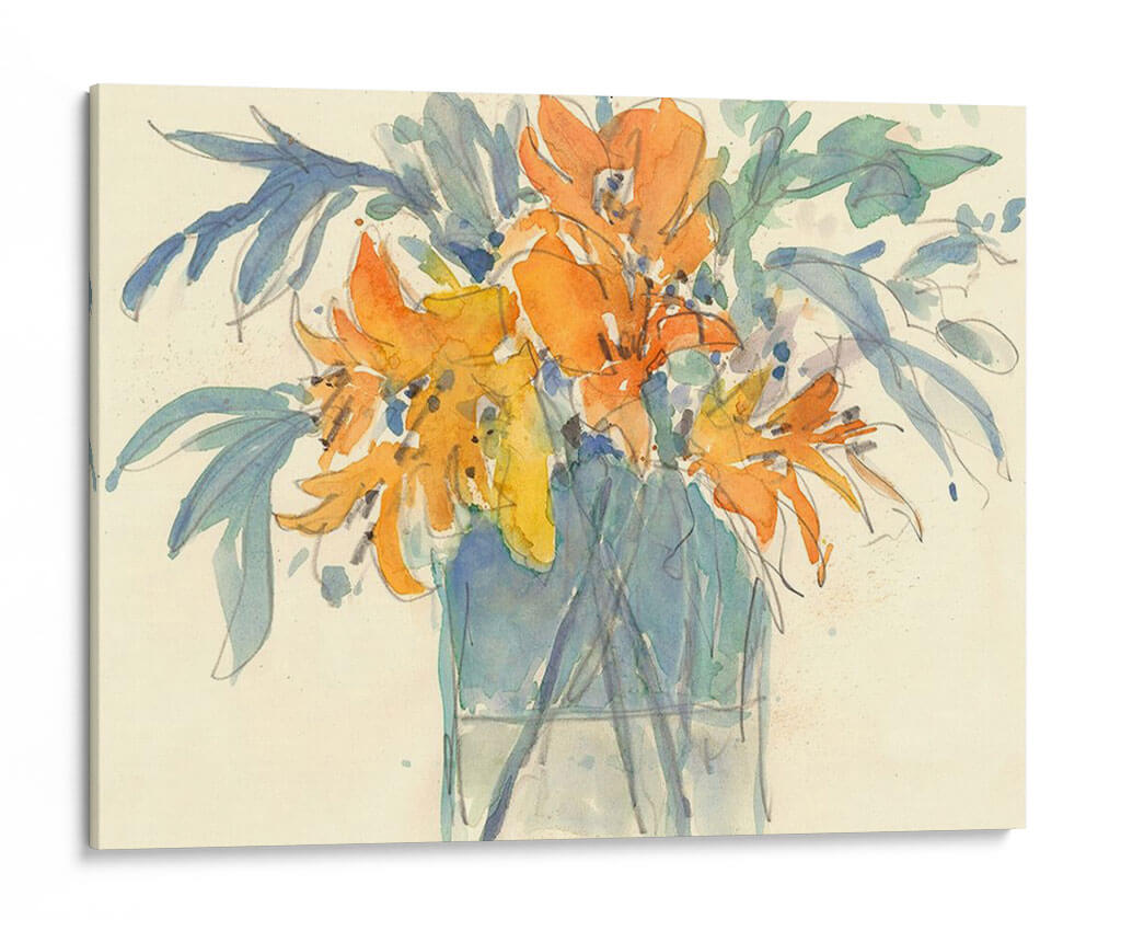 Capture la esencia vibrante de la naturaleza con "Día Lily Momento Ii", una cautivadora obra de arte de Samuel Dixon. Este cuadro decorativo presenta un delicado arreglo de lirios anaranjados y amarillos, pintados con una técnica de acuarela que evoca movimiento y ligereza. Las pinceladas sueltas y fluidas dan vida a los pétalos, mientras que las hojas de un azul verdoso profundo añaden un contraste sereno. La composición se centra en un jarrón de cristal transparente, a través del cual se intuyen los tallos y el agua, aportando una sensación de frescura y naturalidad. La paleta de colores, dominada por cálidos tonos anaranjados y amarillos, se complementa con los fríos azules y verdes de las hojas, creando un equilibrio visual armonioso. Esta pieza de arte contemporáneo es perfecta para infundir alegría y vitalidad en cualquier espacio, desde una sala de estar moderna hasta un rincón tranquilo en tu dormitorio u oficina. Su estilo desenfadado y emotivo invita a la contemplación y añade un toque de sofisticación orgánica a tu decoración de pared. Transforma tu hogar con la belleza atemporal de las flores capturada en este exquisito cuadro.