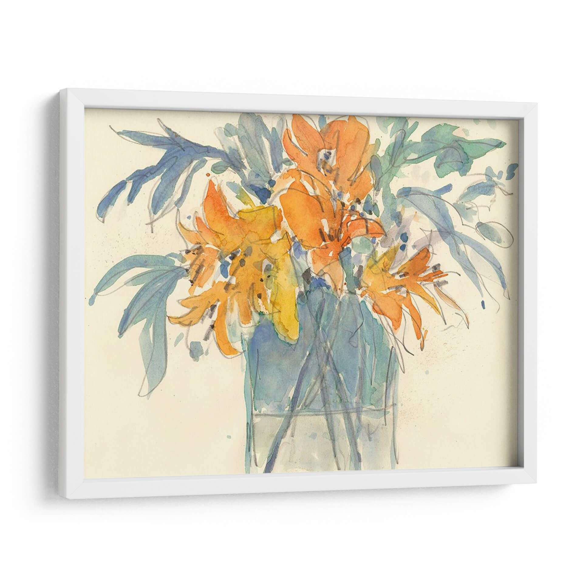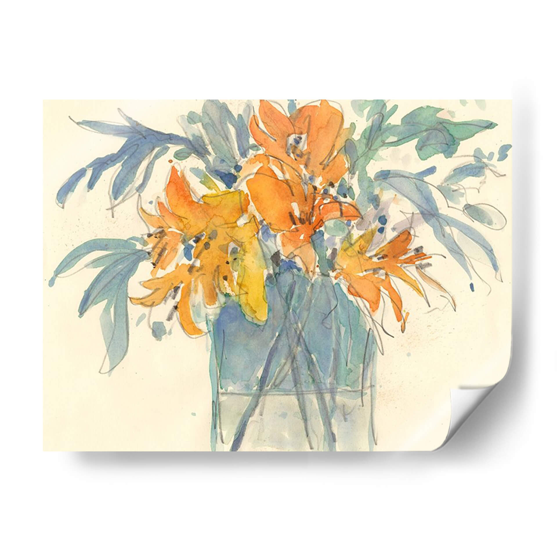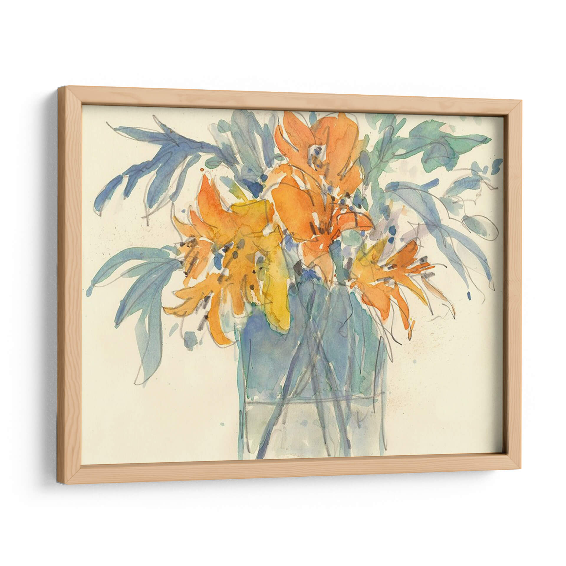 Capture la esencia vibrante de la naturaleza con "Día Lily Momento Ii", una cautivadora obra de arte de Samuel Dixon. Este cuadro decorativo presenta un delicado arreglo de lirios anaranjados y amarillos, pintados con una técnica de acuarela que evoca movimiento y ligereza. Las pinceladas sueltas y fluidas dan vida a los pétalos, mientras que las hojas de un azul verdoso profundo añaden un contraste sereno. La composición se centra en un jarrón de cristal transparente, a través del cual se intuyen los tallos y el agua, aportando una sensación de frescura y naturalidad. La paleta de colores, dominada por cálidos tonos anaranjados y amarillos, se complementa con los fríos azules y verdes de las hojas, creando un equilibrio visual armonioso. Esta pieza de arte contemporáneo es perfecta para infundir alegría y vitalidad en cualquier espacio, desde una sala de estar moderna hasta un rincón tranquilo en tu dormitorio u oficina. Su estilo desenfadado y emotivo invita a la contemplación y añade un toque de sofisticación orgánica a tu decoración de pared. Transforma tu hogar con la belleza atemporal de las flores capturada en este exquisito cuadro.