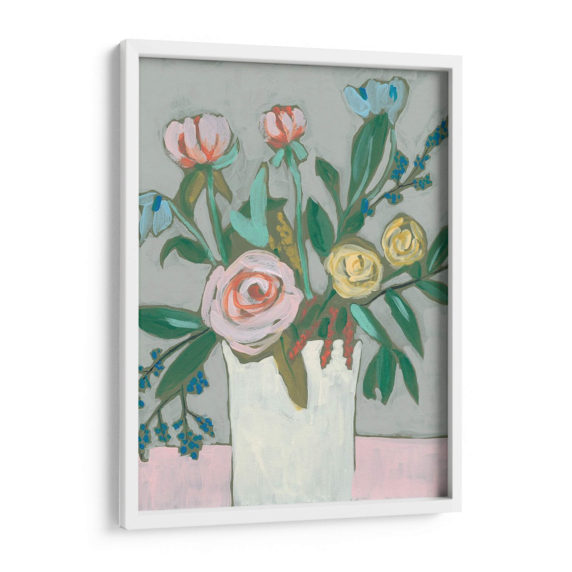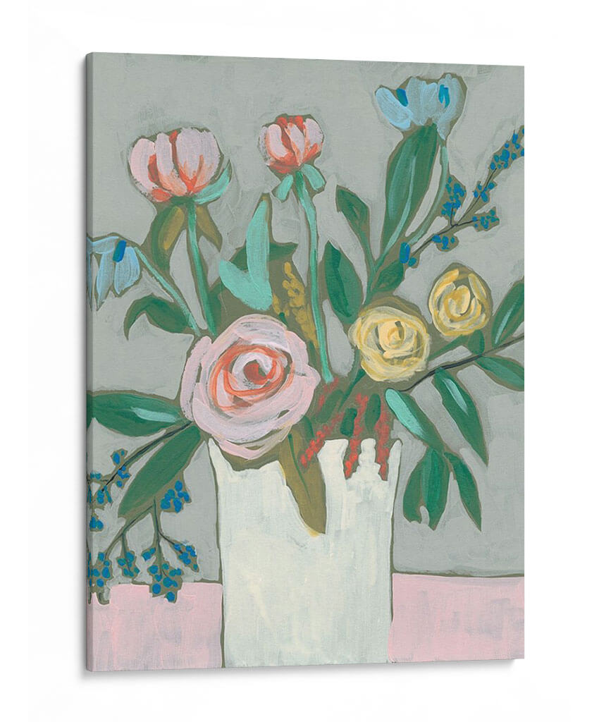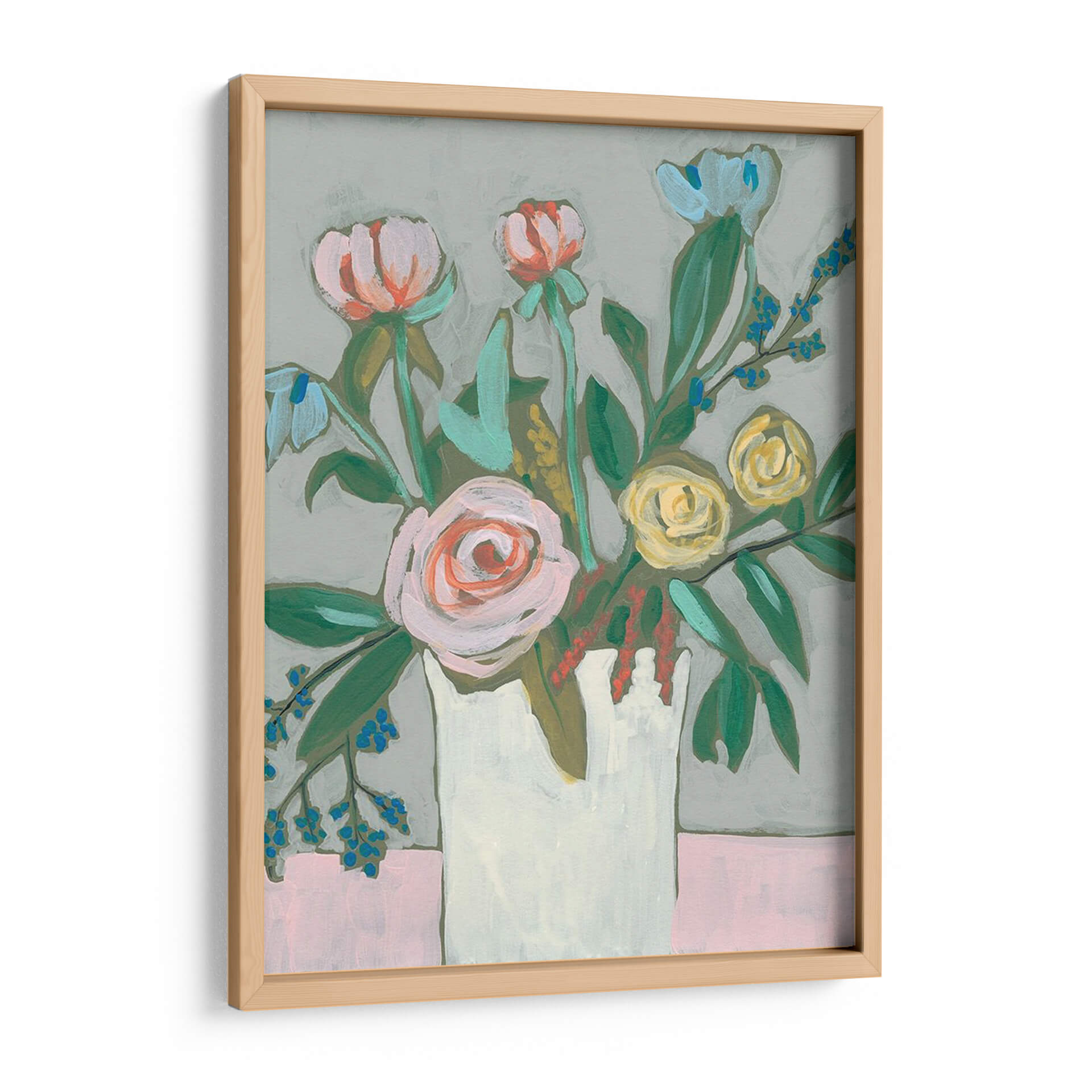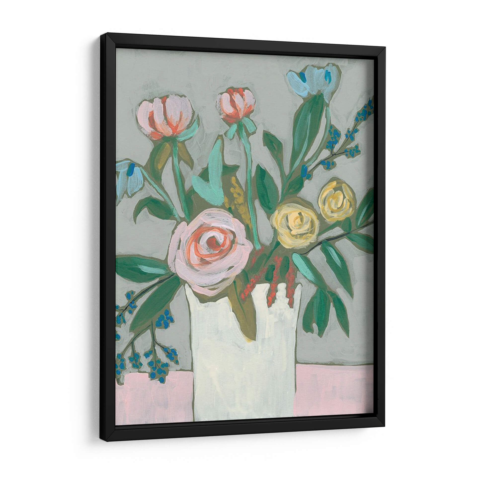 Inunda tus espacios con la delicadeza y el encanto de "Dulce Y Peculiar I", una obra de arte contemporáneo de Jennifer Goldberger. Este cuadro decorativo captura la belleza etérea de un ramo floral presentado en un jarrón blanco texturizado, sobre un fondo de suaves tonos grises y un toque de rosa pastel. La composición, con sus flores en tonos pastel de rosa, amarillo y azul, junto a un follaje verde exuberante, evoca una sensación de calma y serenidad. El estilo pictórico, con pinceladas visibles y un toque impresionista, aporta una calidez y una profundidad únicas, invitando a la contemplación. Esta pieza es ideal para añadir un acento de color sutil pero significativo a tu sala de estar, dormitorio o estudio, creando un ambiente acogedor y lleno de estilo. "Dulce Y Peculiar I" no es solo una decoración de pared, sino una invitación a disfrutar de la belleza efímera de la naturaleza en tu día a día, transformando cualquier rincón en un santuario de paz y buen gusto. Su paleta de colores y su temática floral lo convierten en una elección perfecta para quienes buscan un arte que inspire tranquilidad y belleza.