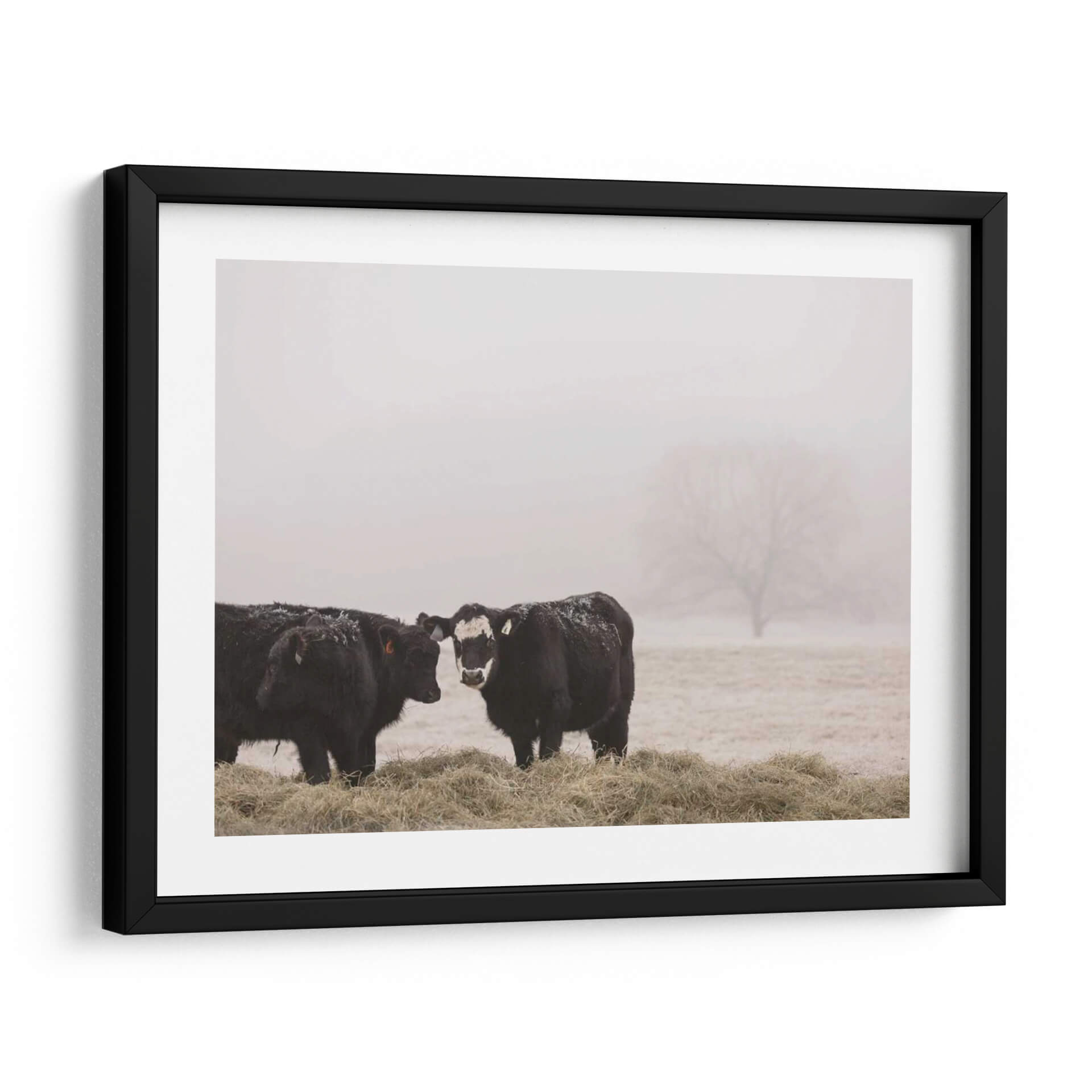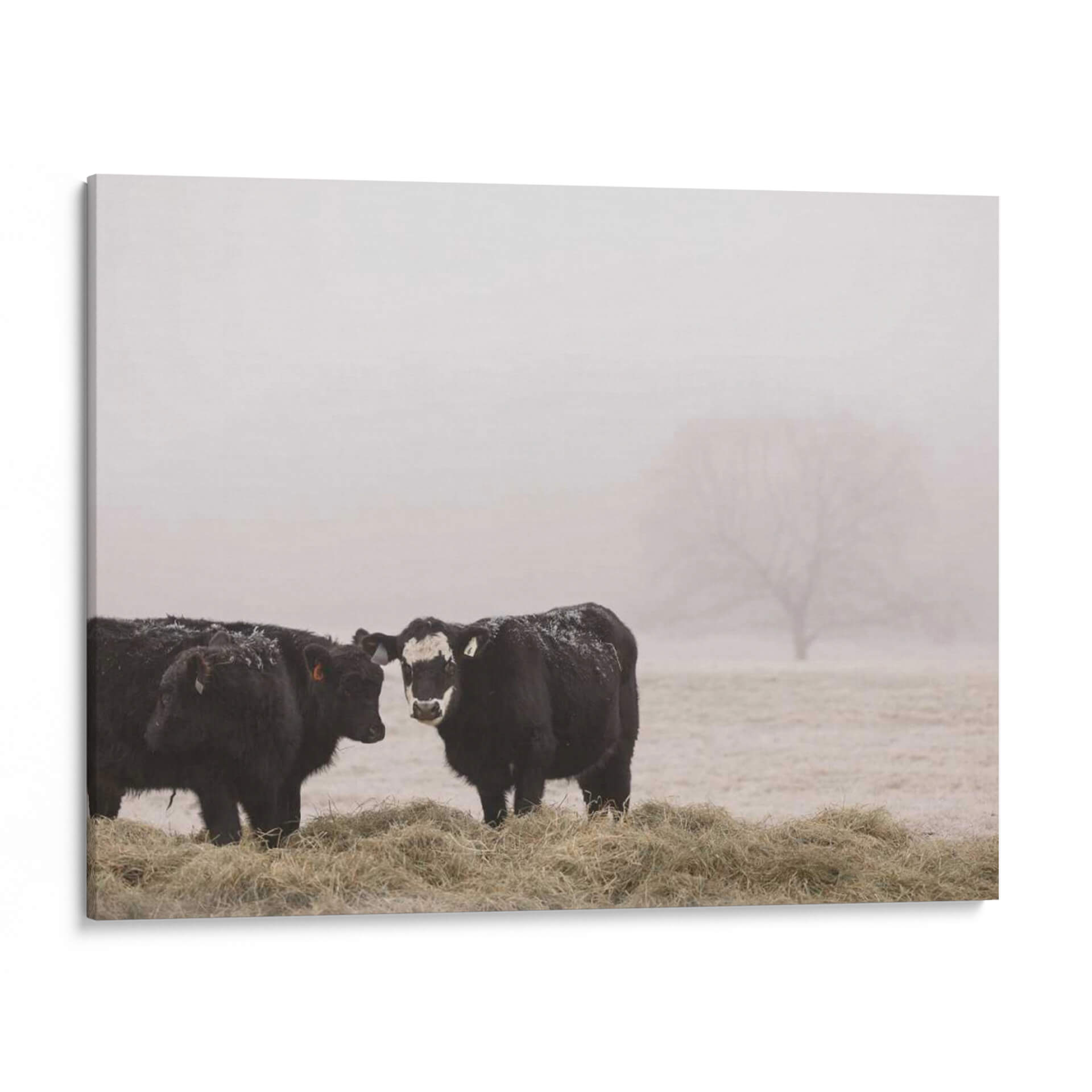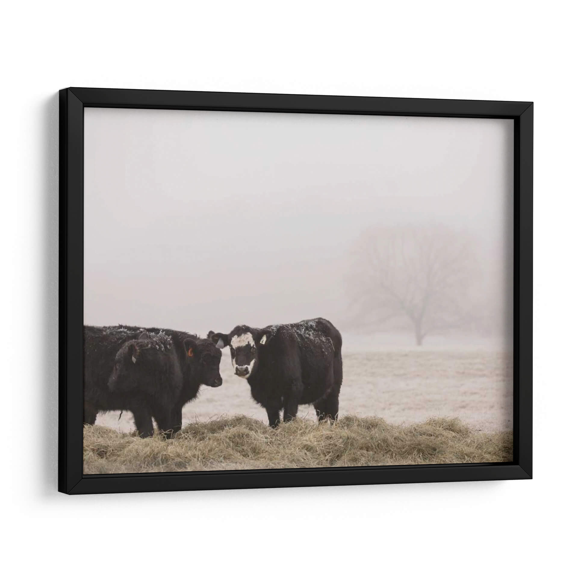 Sumérgete en la serena belleza del campo con "Estudio De Granja I", una obra de arte cautivadora de Adam Mead. Este cuadro decorativo captura un momento íntimo en un entorno brumoso, presentando dos majestuosas vacas negras paradas entre pacas de heno. La paleta de colores, dominada por tonos tierra suaves y grises etéreos, evoca una sensación de calma y conexión con la naturaleza. El estilo fotográfico, con un enfoque sutil en los detalles como la nieve esparcida sobre el pelaje de los animales y la silueta difuminada de un árbol en la distancia, añade una capa de realismo melancólico. La composición, centrada en la interacción entre las dos vacas, crea un punto focal que invita a la contemplación. Esta pieza es ideal para añadir un toque rústico y tranquilo a cualquier hogar u oficina, funcionando como un recordatorio de la simplicidad y la paz del mundo rural. "Estudio De Granja I" no es solo una decoración, es una ventana a un paisaje bucólico que inspira paz y reflexión, perfecta para quienes buscan arte con alma y narrativa.