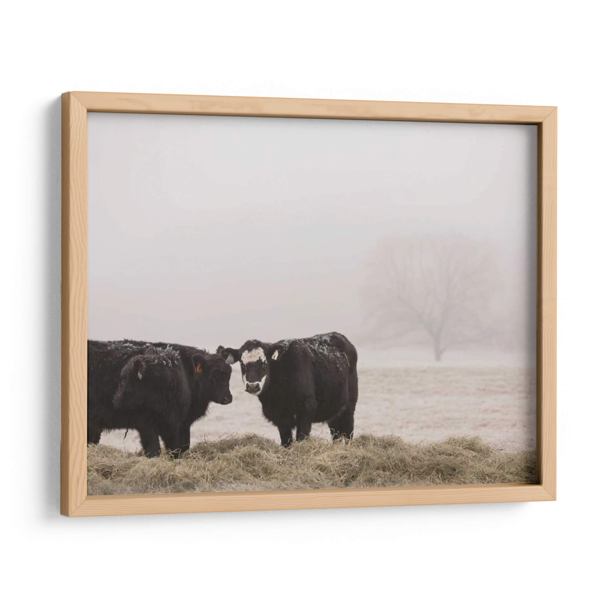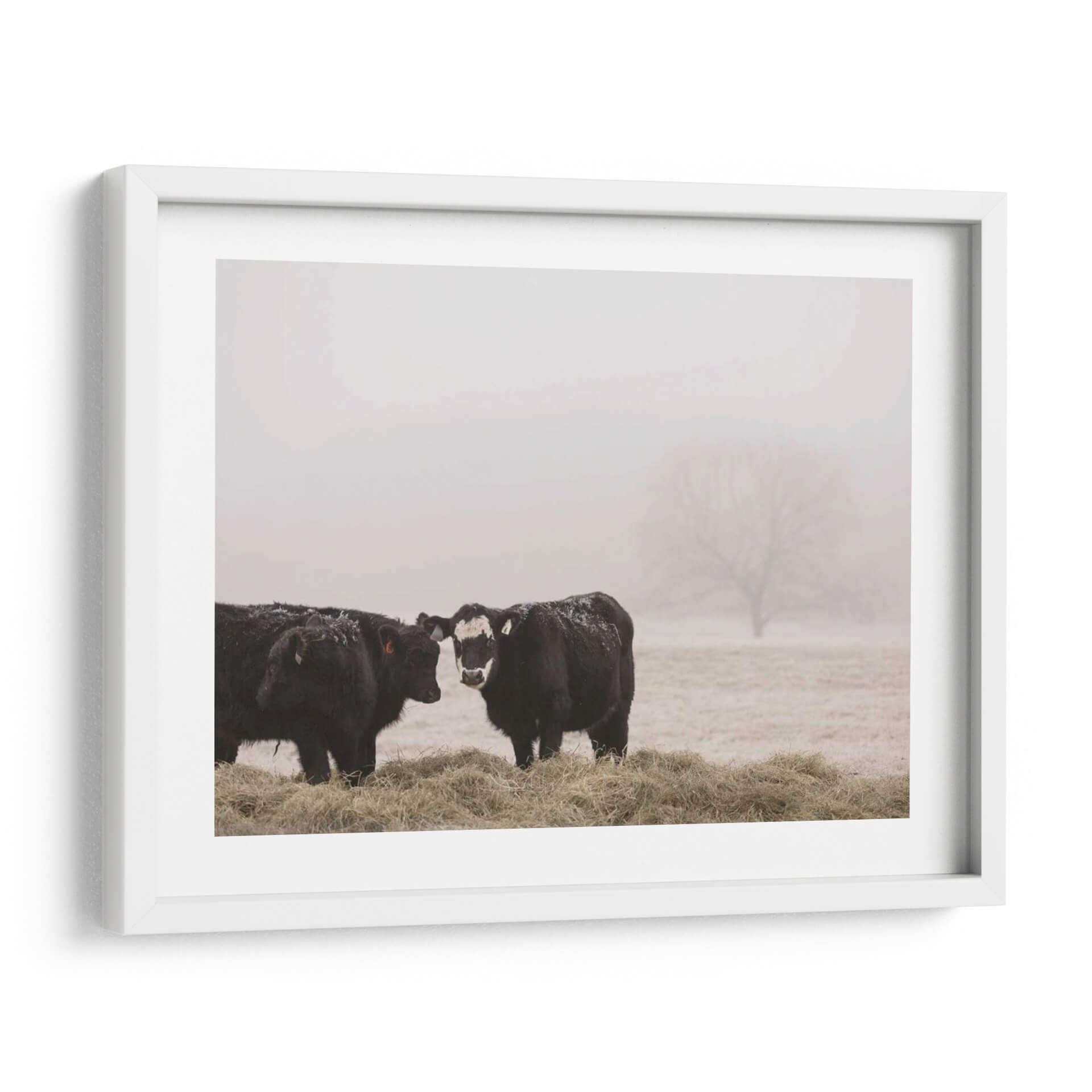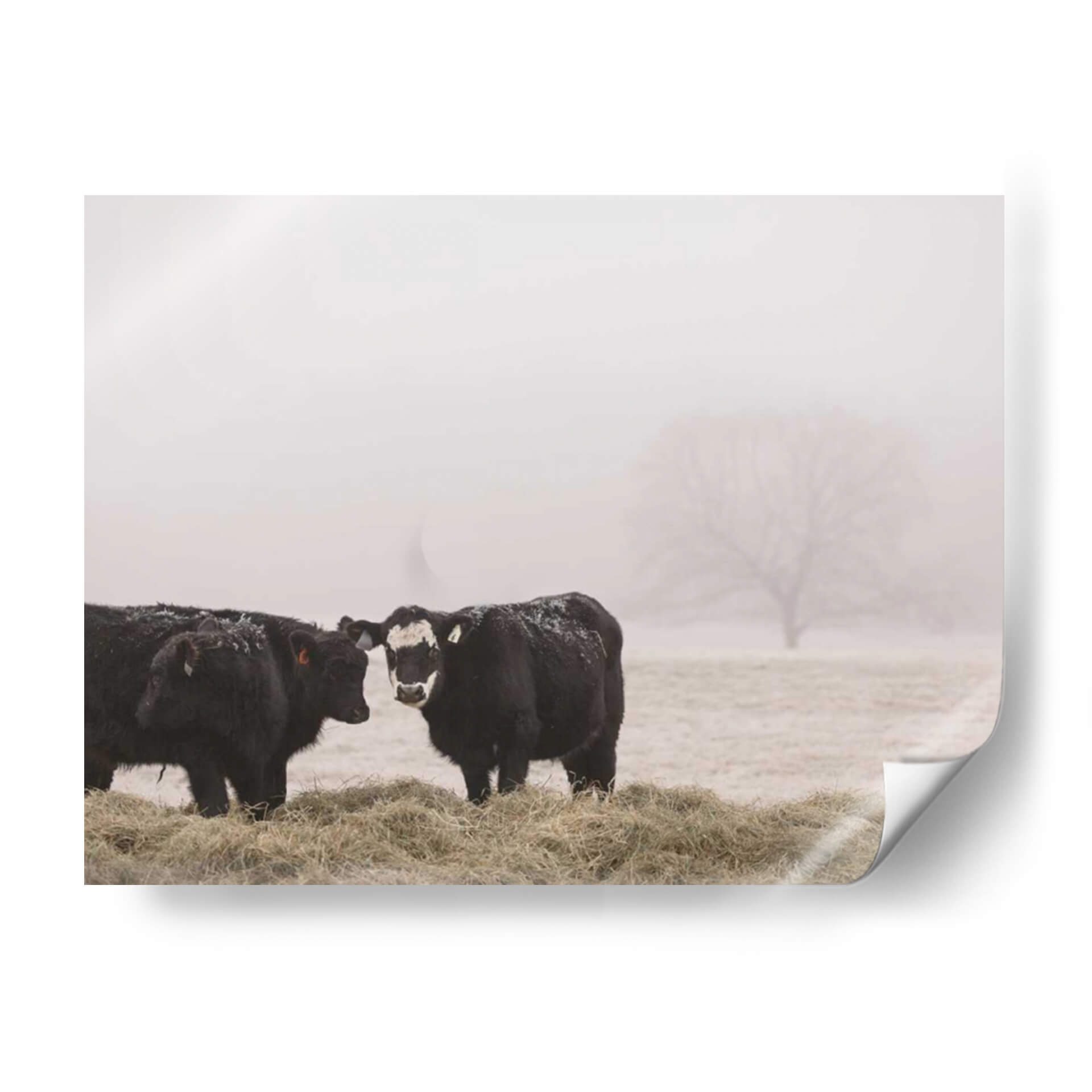 Sumérgete en la serena belleza del campo con "Estudio De Granja I", una obra de arte cautivadora de Adam Mead. Este cuadro decorativo captura un momento íntimo en un entorno brumoso, presentando dos majestuosas vacas negras paradas entre pacas de heno. La paleta de colores, dominada por tonos tierra suaves y grises etéreos, evoca una sensación de calma y conexión con la naturaleza. El estilo fotográfico, con un enfoque sutil en los detalles como la nieve esparcida sobre el pelaje de los animales y la silueta difuminada de un árbol en la distancia, añade una capa de realismo melancólico. La composición, centrada en la interacción entre las dos vacas, crea un punto focal que invita a la contemplación. Esta pieza es ideal para añadir un toque rústico y tranquilo a cualquier hogar u oficina, funcionando como un recordatorio de la simplicidad y la paz del mundo rural. "Estudio De Granja I" no es solo una decoración, es una ventana a un paisaje bucólico que inspira paz y reflexión, perfecta para quienes buscan arte con alma y narrativa.