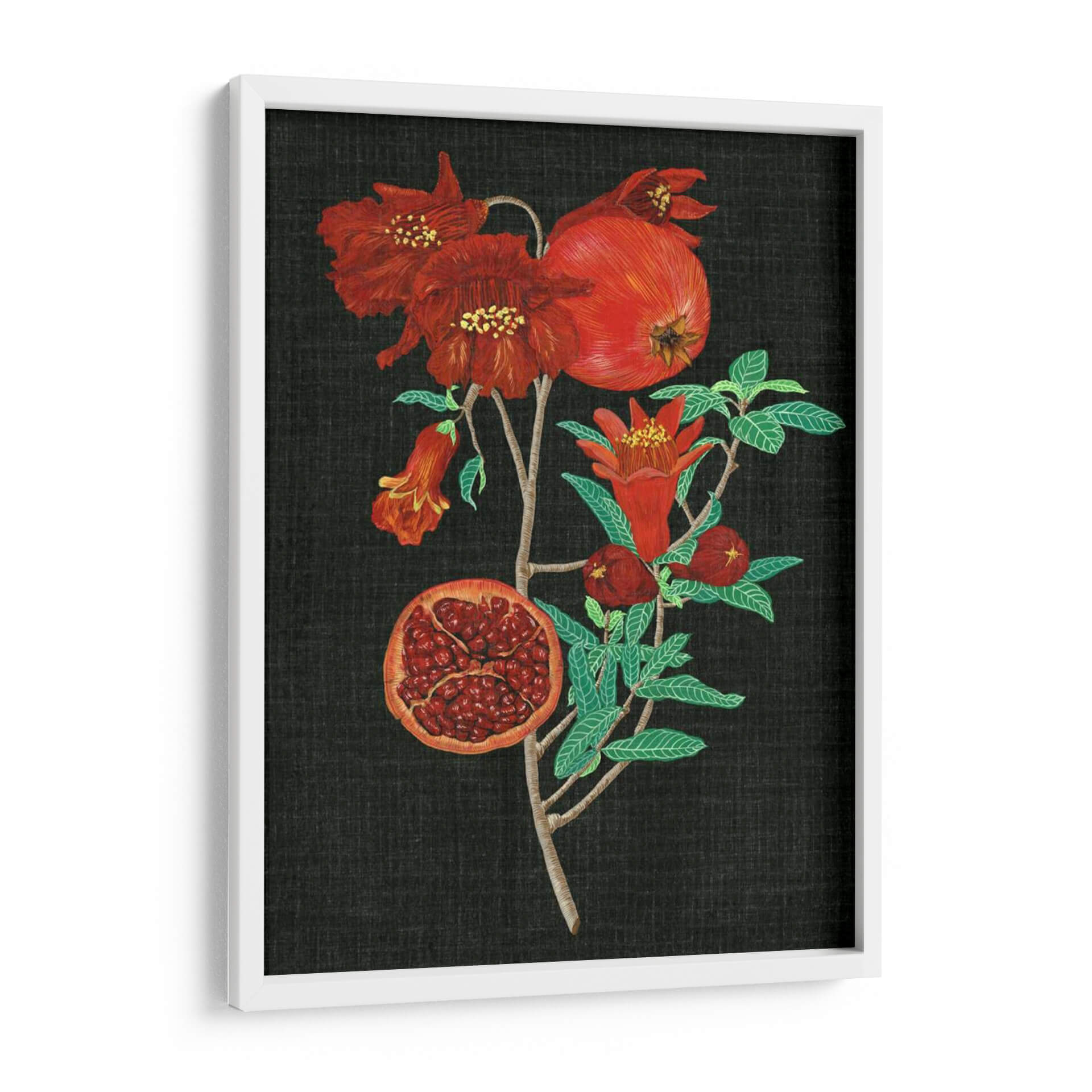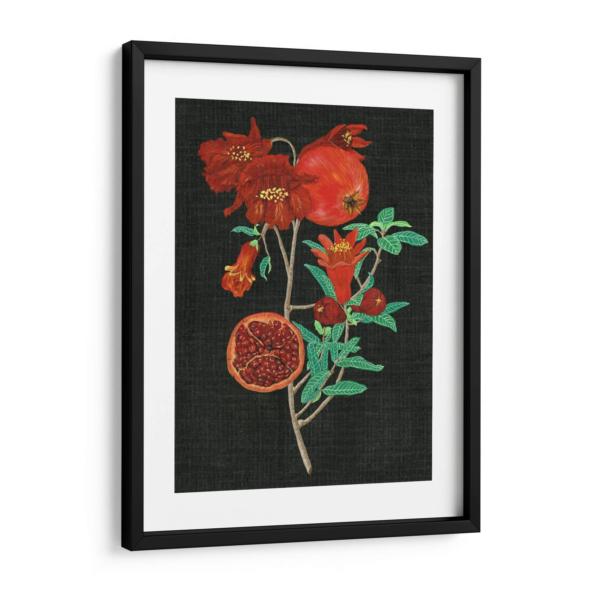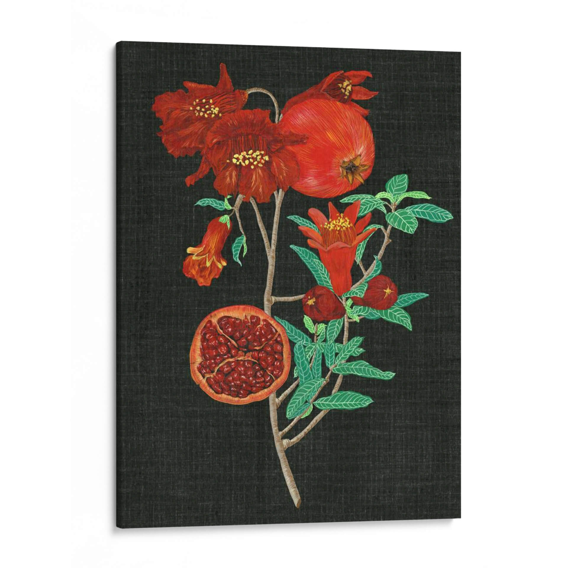 Sumérgete en la rica y vibrante esencia de la naturaleza con "Estudio De La Granada I", una obra maestra de Melissa Wang que captura la belleza intrínseca de esta fruta icónica. La pieza presenta una rama de granada adornada con flores rojas intensas y frutos maduros, uno de ellos abierto para revelar sus jugosas semillas. La paleta de colores se centra en rojos profundos, verdes vibrantes de las hojas y el contraste dramático con un fondo oscuro, creando una atmósfera de elegancia y vitalidad. El estilo detallado y casi botánico de la ilustración evoca una sensación de aprecio por los ciclos naturales y la abundancia. Este cuadro decorativo es ideal para añadir un toque de color y sofisticación a cualquier espacio, desde una sala de estar moderna hasta un comedor acogedor o una cocina inspirada. Su composición vertical y el enfoque en el detalle lo convierten en un punto focal cautivador que invita a la contemplación. Añade esta pieza botánica a tu colección y transforma tu hogar en un oasis de arte y naturaleza, perfecto para quienes buscan decoración de pared que despierte los sentidos y celebre la belleza del mundo natural. Es una representación exquisita que combina la precisión artística con la exuberancia frutal, prometiendo ser una adición memorable a tu decoración.