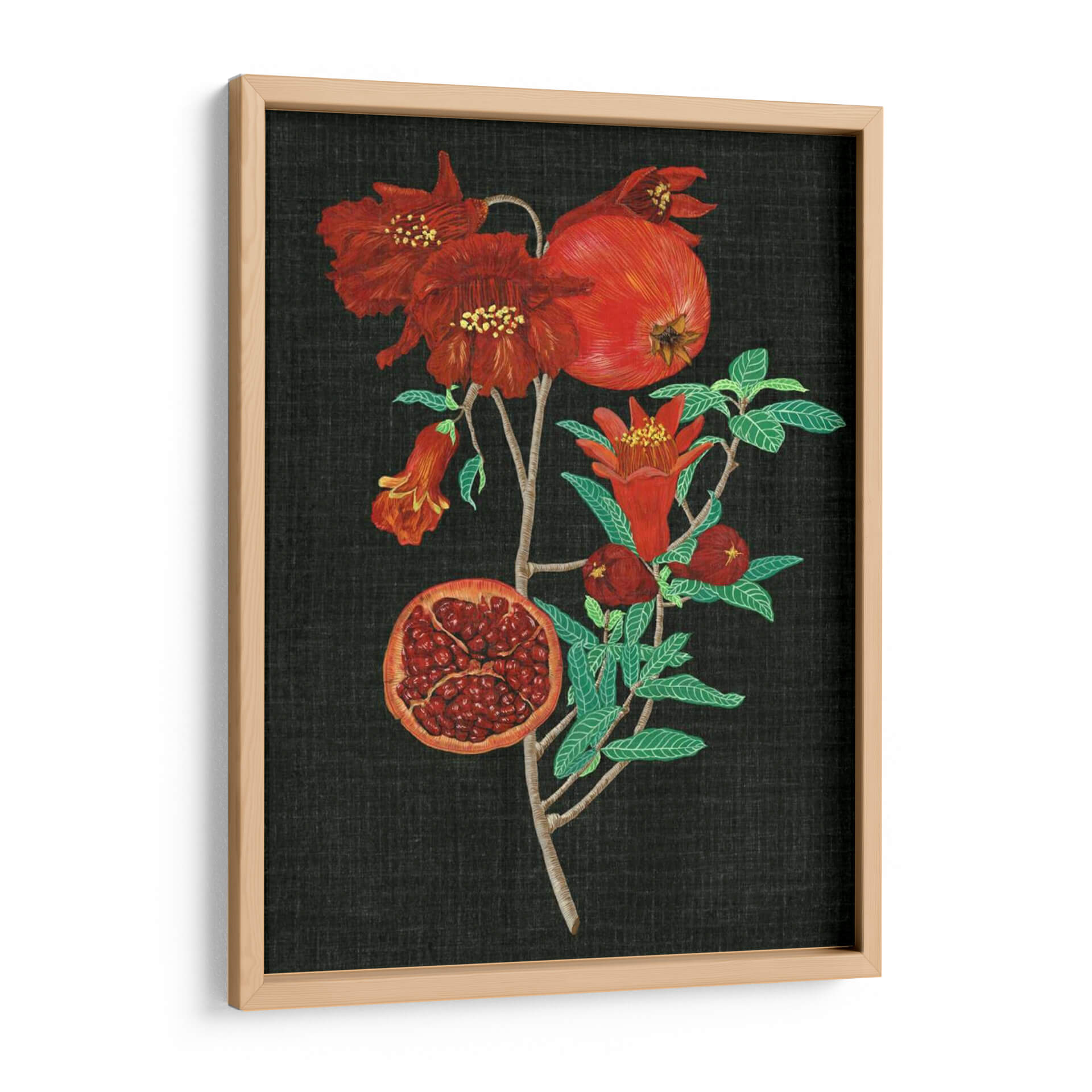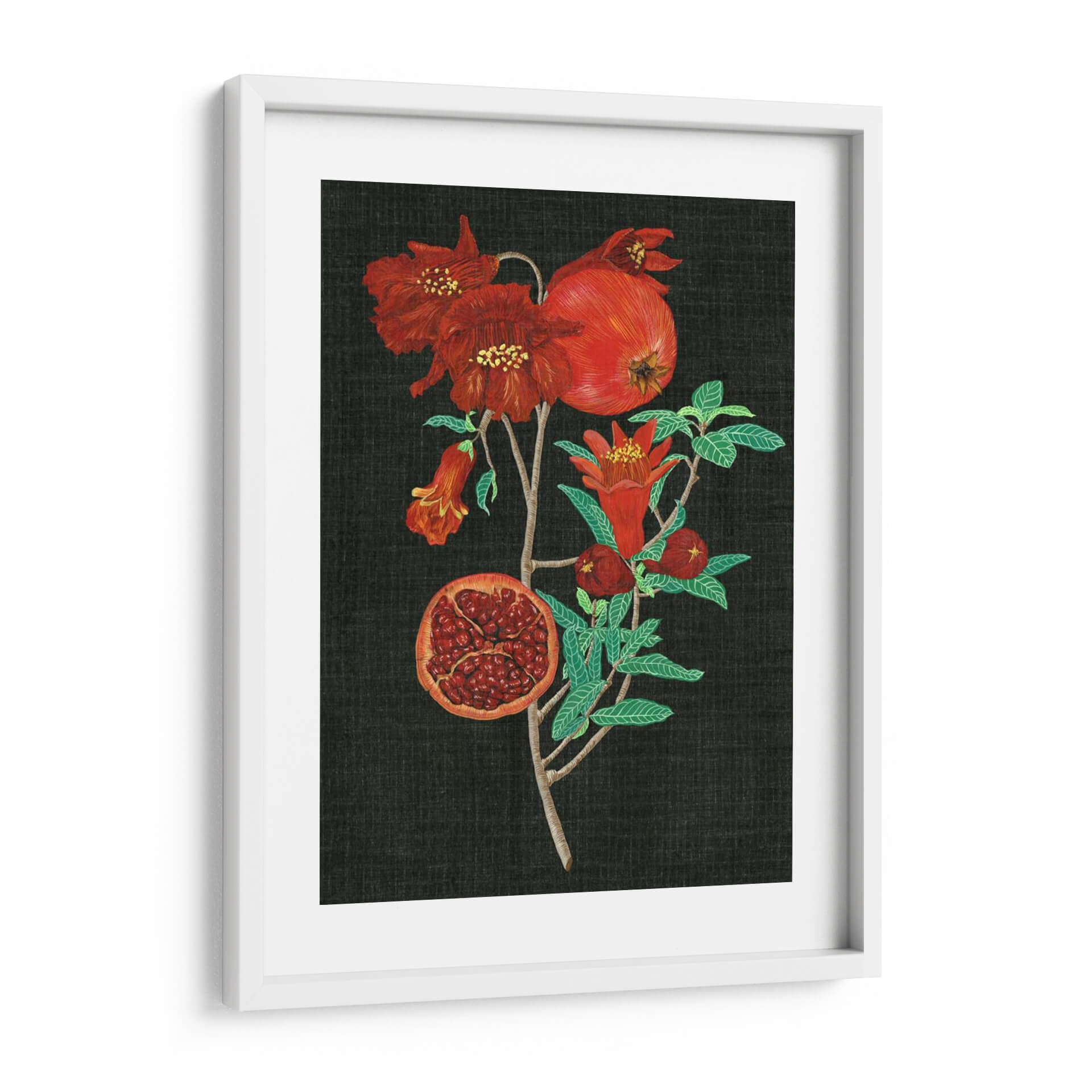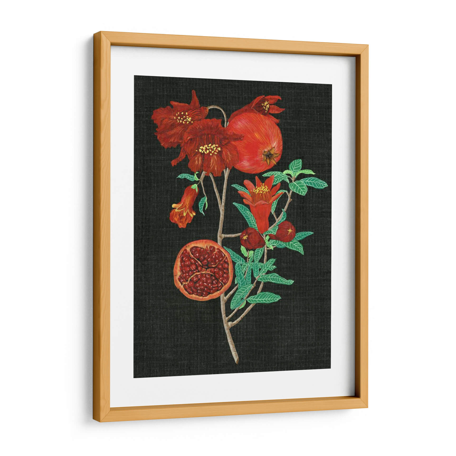 Sumérgete en la rica y vibrante esencia de la naturaleza con "Estudio De La Granada I", una obra maestra de Melissa Wang que captura la belleza intrínseca de esta fruta icónica. La pieza presenta una rama de granada adornada con flores rojas intensas y frutos maduros, uno de ellos abierto para revelar sus jugosas semillas. La paleta de colores se centra en rojos profundos, verdes vibrantes de las hojas y el contraste dramático con un fondo oscuro, creando una atmósfera de elegancia y vitalidad. El estilo detallado y casi botánico de la ilustración evoca una sensación de aprecio por los ciclos naturales y la abundancia. Este cuadro decorativo es ideal para añadir un toque de color y sofisticación a cualquier espacio, desde una sala de estar moderna hasta un comedor acogedor o una cocina inspirada. Su composición vertical y el enfoque en el detalle lo convierten en un punto focal cautivador que invita a la contemplación. Añade esta pieza botánica a tu colección y transforma tu hogar en un oasis de arte y naturaleza, perfecto para quienes buscan decoración de pared que despierte los sentidos y celebre la belleza del mundo natural. Es una representación exquisita que combina la precisión artística con la exuberancia frutal, prometiendo ser una adición memorable a tu decoración.