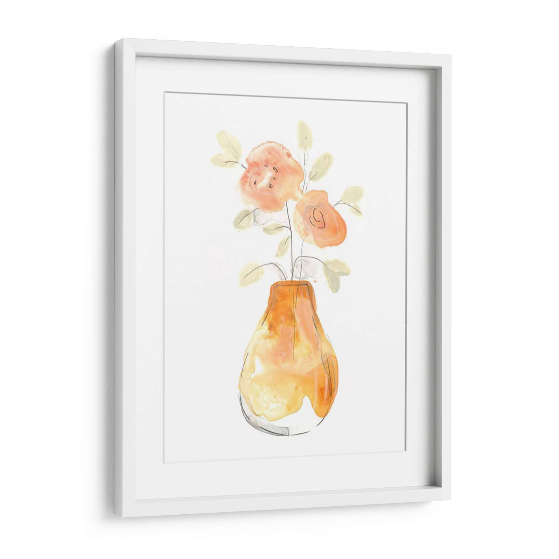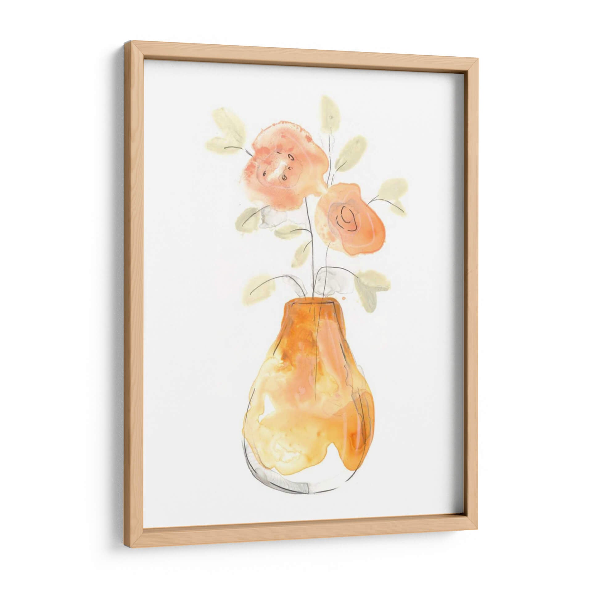 Embárcate en un viaje visual con "Estudio Pop Blossom II", una obra de arte que captura la delicadeza de la naturaleza con un toque contemporáneo. Esta pieza presenta un arreglo floral estilizado, donde tres flores de pétalos suaves en tonos anaranjados y rosados se alzan graciosamente sobre un jarrón de vidrio translúcido. La técnica de acuarela y el uso de trazos de boceto añaden una sensación de espontaneidad y frescura, mientras que la paleta de colores cálidos, dominada por naranjas vibrantes y toques de amarillo pálido, infunde una atmósfera de alegría y optimismo. El fondo blanco y despejado resalta la simplicidad y elegancia del tema central, permitiendo que cada elemento respire y atraiga la mirada. "Estudio Pop Blossom II" es ideal para añadir un toque de color y vitalidad a cualquier espacio, ya sea una sala de estar moderna, un dormitorio sereno o una oficina inspiradora. Su estilo pop art moderno y su representación de flores lo convierten en una elección perfecta para quienes buscan infundir sus ambientes con energía positiva y un sentido de la belleza efímera. Este cuadro decorativo es una invitación a la contemplación y a la apreciación de la forma y el color en su máxima expresión, aportando un aire de sofisticación artística.
