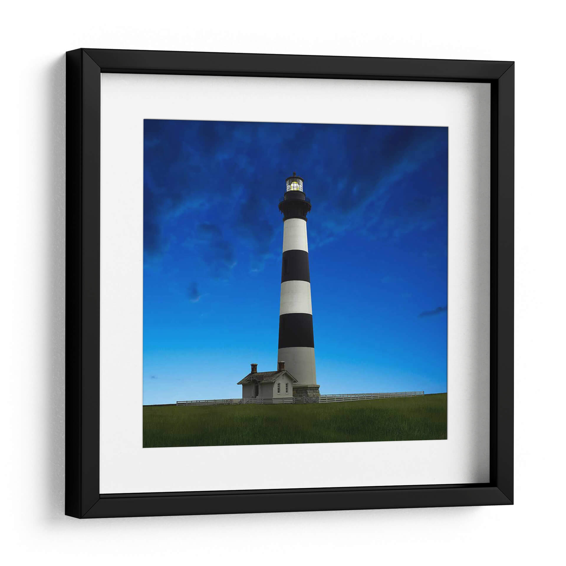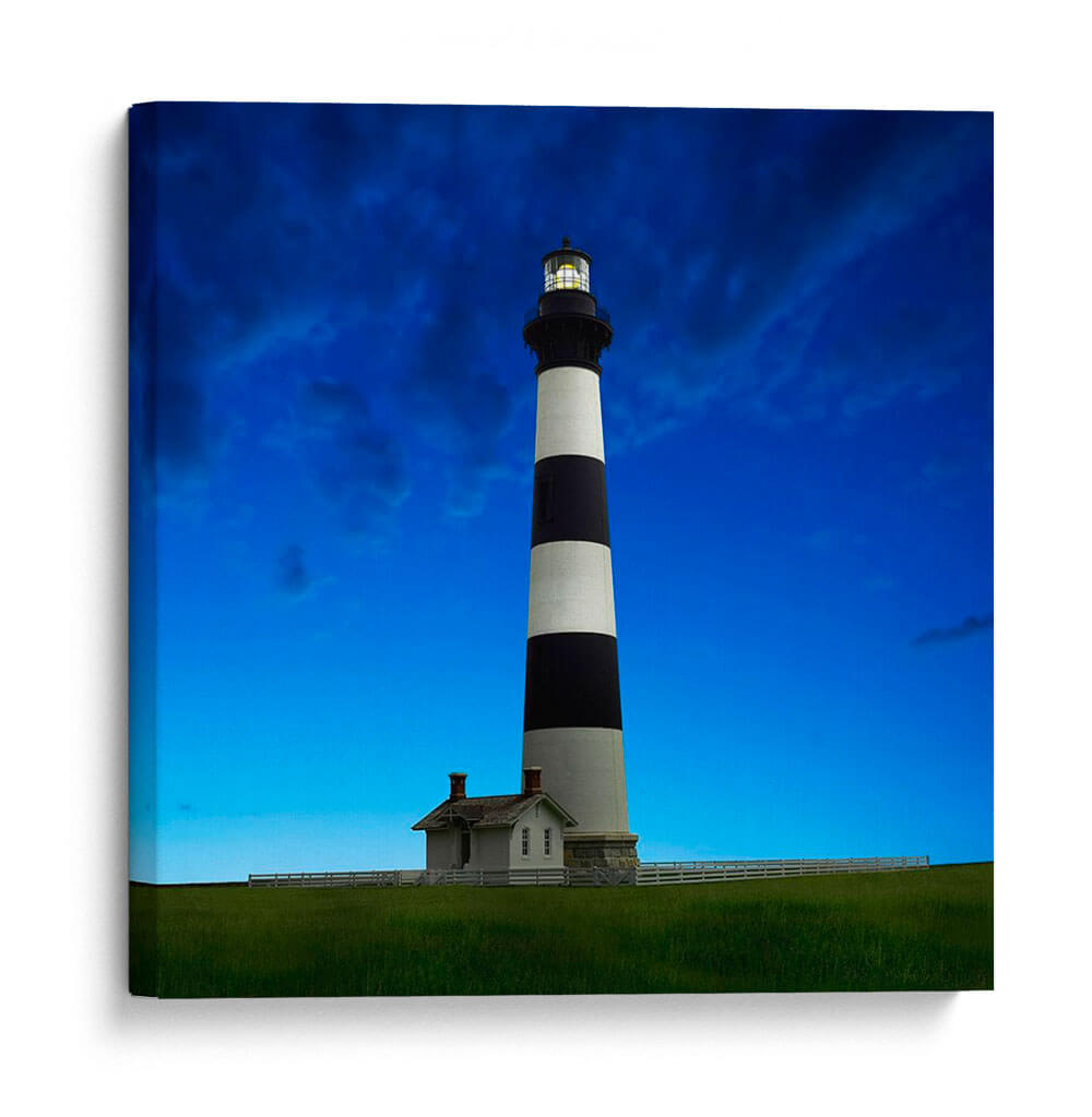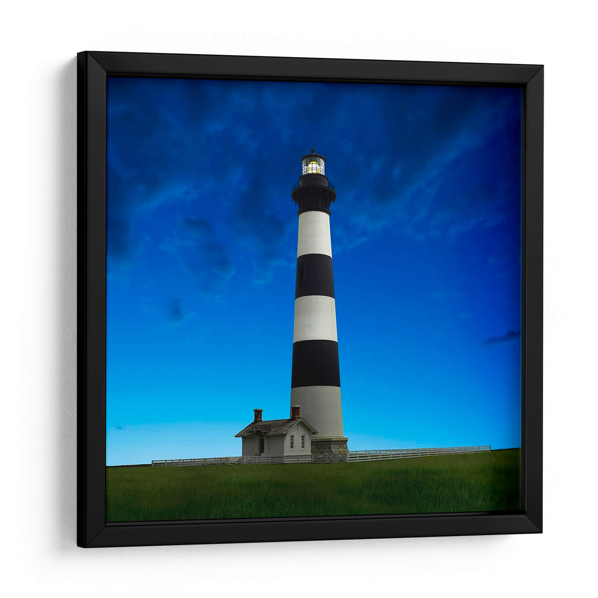 Capta la esencia de la soledad y la guía con este impactante cuadro decorativo "Faro En La Noche Iii" de James McLoughlin. La obra presenta un majestuoso faro a rayas en blanco y negro, erguido con firmeza bajo un cielo azul intenso y dramático, salpicado de nubes oscuras que añaden profundidad y misterio. La base del faro se asienta sobre una verde pradera, delimitada por una sencilla valla blanca, evocando una sensación de aislamiento sereno y a la vez de resistencia. Los colores vibrantes del cielo contrastan poderosamente con la estructura icónica del faro, creando una composición visualmente atractiva y llena de simbolismo. Este cuadro decorativo es perfecto para aquellos que buscan añadir un toque de intriga y reflexión a sus espacios. Su atmósfera evocadora lo convierte en una pieza ideal para salones, oficinas o dormitorios donde se desee proyectar una sensación de calma, seguridad y un punto de inspiración para superar la oscuridad. Transforma tu hogar en un refugio de paz y estilo con esta cautivadora obra de arte, un recordatorio visual de la fuerza y la esperanza que brillan en la noche.
