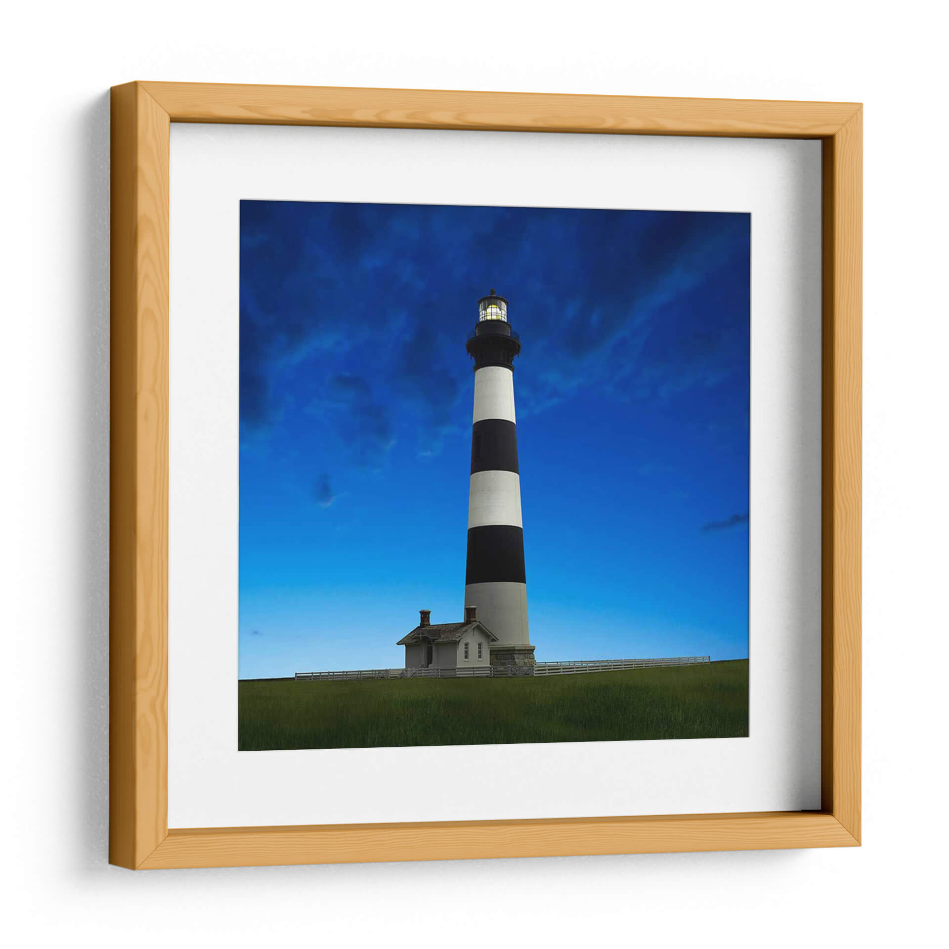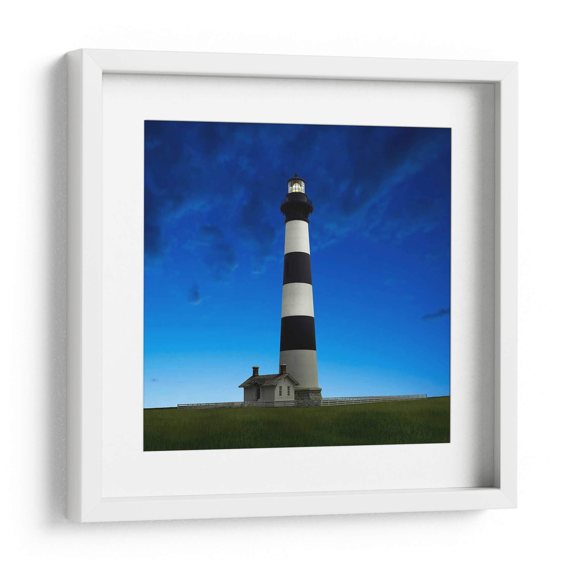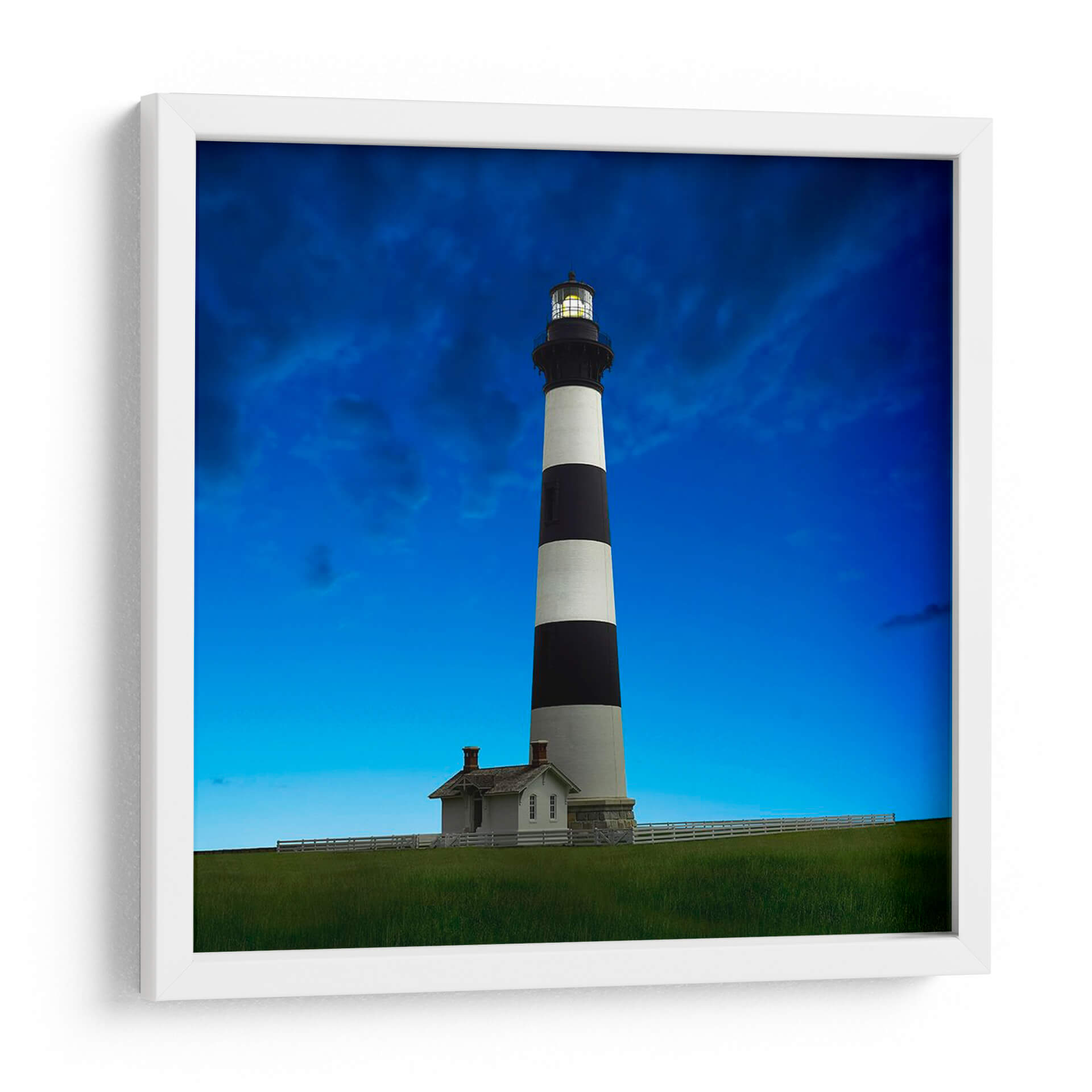 Capta la esencia de la soledad y la guía con este impactante cuadro decorativo "Faro En La Noche Iii" de James McLoughlin. La obra presenta un majestuoso faro a rayas en blanco y negro, erguido con firmeza bajo un cielo azul intenso y dramático, salpicado de nubes oscuras que añaden profundidad y misterio. La base del faro se asienta sobre una verde pradera, delimitada por una sencilla valla blanca, evocando una sensación de aislamiento sereno y a la vez de resistencia. Los colores vibrantes del cielo contrastan poderosamente con la estructura icónica del faro, creando una composición visualmente atractiva y llena de simbolismo. Este cuadro decorativo es perfecto para aquellos que buscan añadir un toque de intriga y reflexión a sus espacios. Su atmósfera evocadora lo convierte en una pieza ideal para salones, oficinas o dormitorios donde se desee proyectar una sensación de calma, seguridad y un punto de inspiración para superar la oscuridad. Transforma tu hogar en un refugio de paz y estilo con esta cautivadora obra de arte, un recordatorio visual de la fuerza y la esperanza que brillan en la noche.