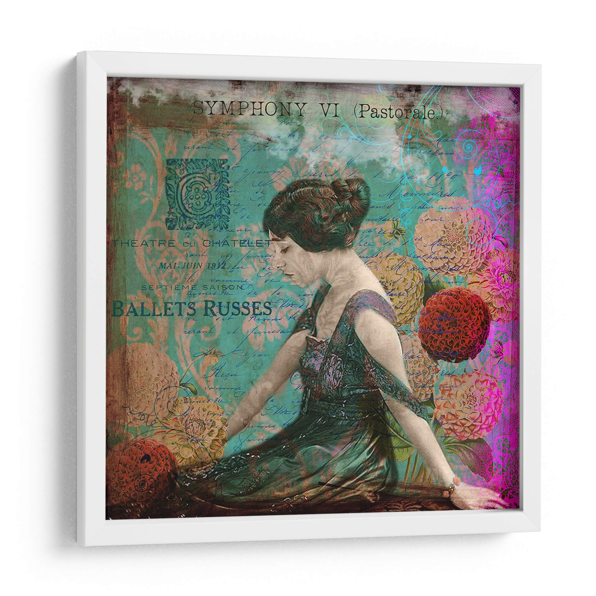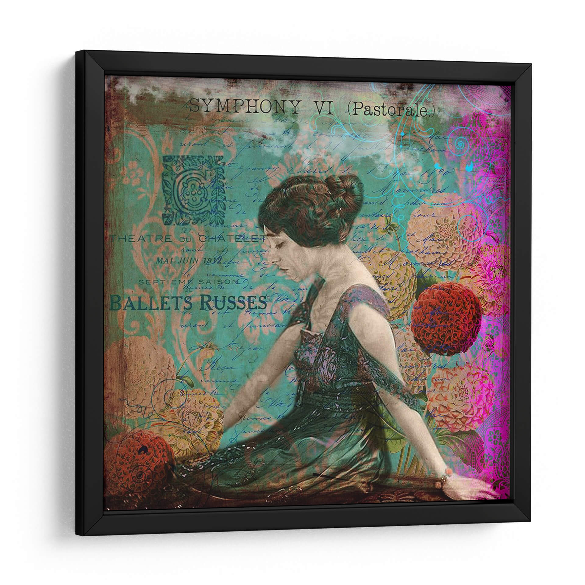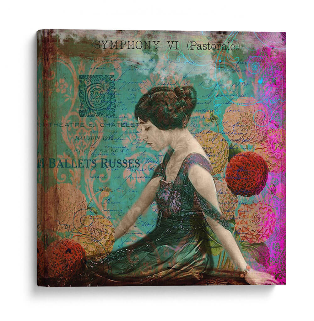 Sumérgete en la elegancia y el misterio con "Femme Paris Viii", una obra de arte digital que evoca la opulencia de la Belle Époque. La pieza presenta una figura femenina central, capturada en un momento de introspección, vestida con un suntuoso traje de época. El fondo se enriquece con texturas de manuscritos antiguos y motivos florales vibrantes en tonos turquesa, magenta y dorados, creando una atmósfera de ensueño. Los elementos de texto, como "Théâtre du Châtelet" y "Ballets Russes", añaden una capa de historia y sofisticación, transportando al espectador a una época de grandes espectáculos y refinamiento artístico. Esta composición, que mezcla lo figurativo con lo abstracto y lo histórico, resulta en un cuadro decorativo de gran impacto visual. Es ideal para añadir un toque de distinción y un aire bohemio chic a cualquier salón, estudio o incluso un dormitorio, convirtiéndose en un punto focal que invita a la contemplación y al diálogo. Una pieza que fusiona nostalgia, arte y moda, perfecta para los amantes de la estética vintage y la decoración de interiores con carácter.