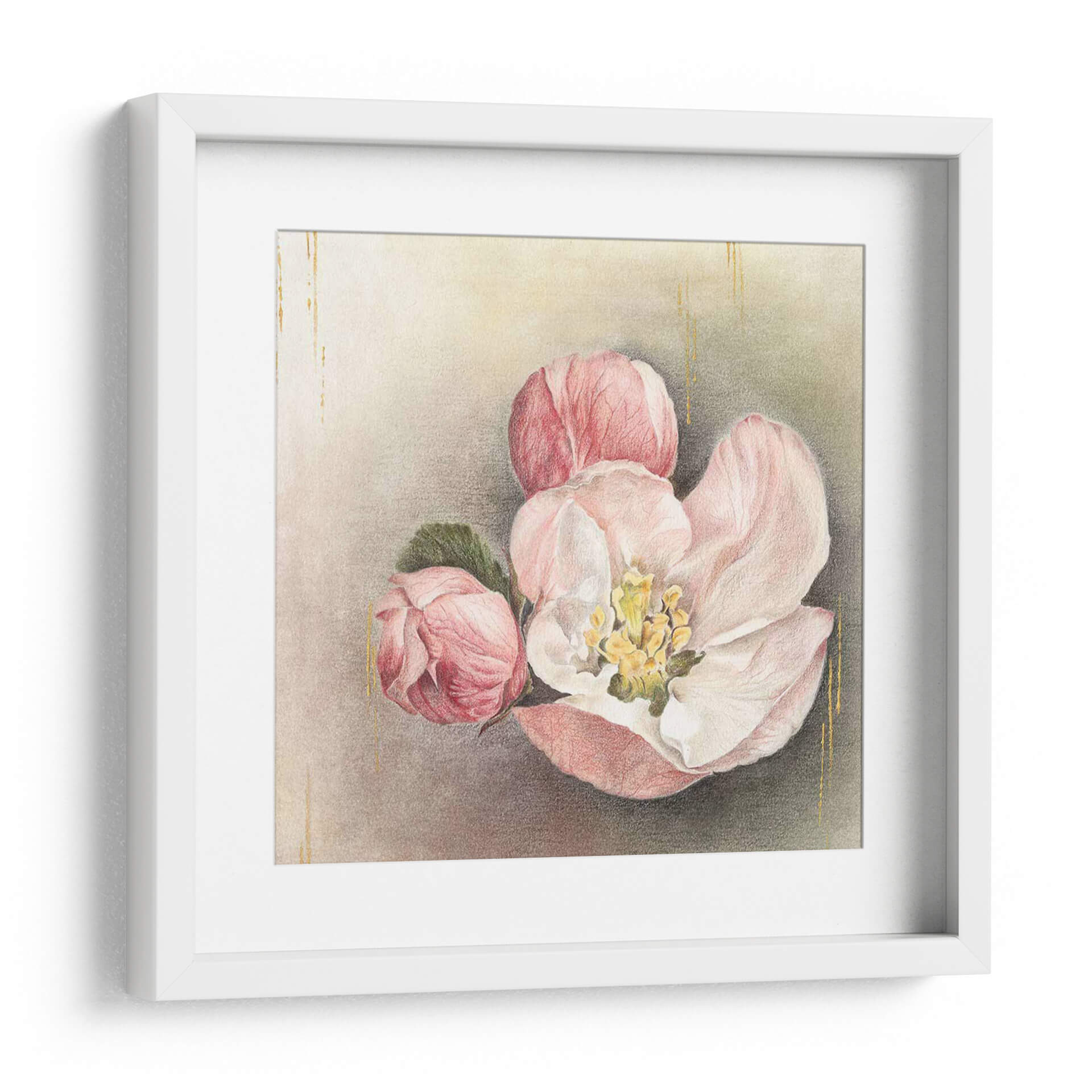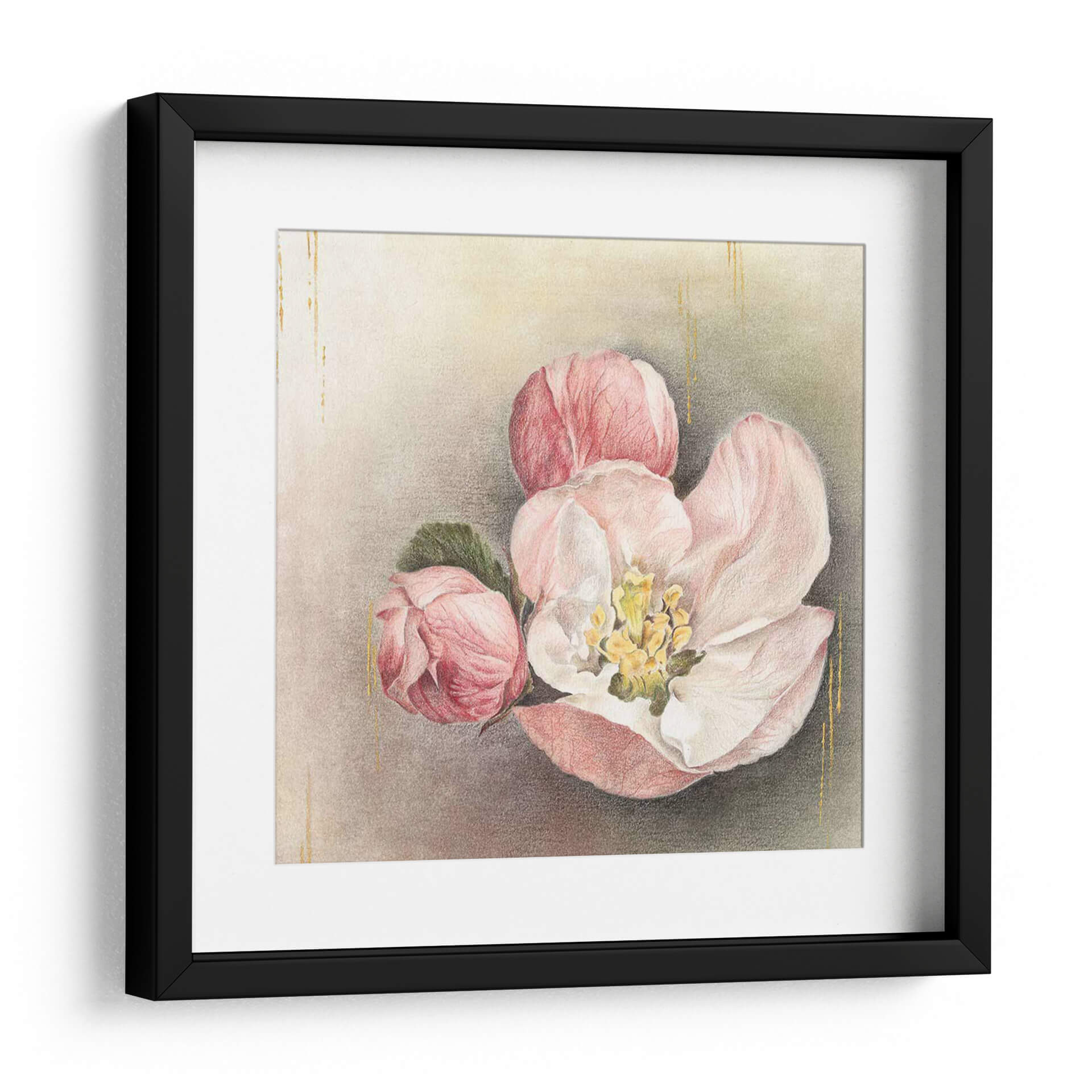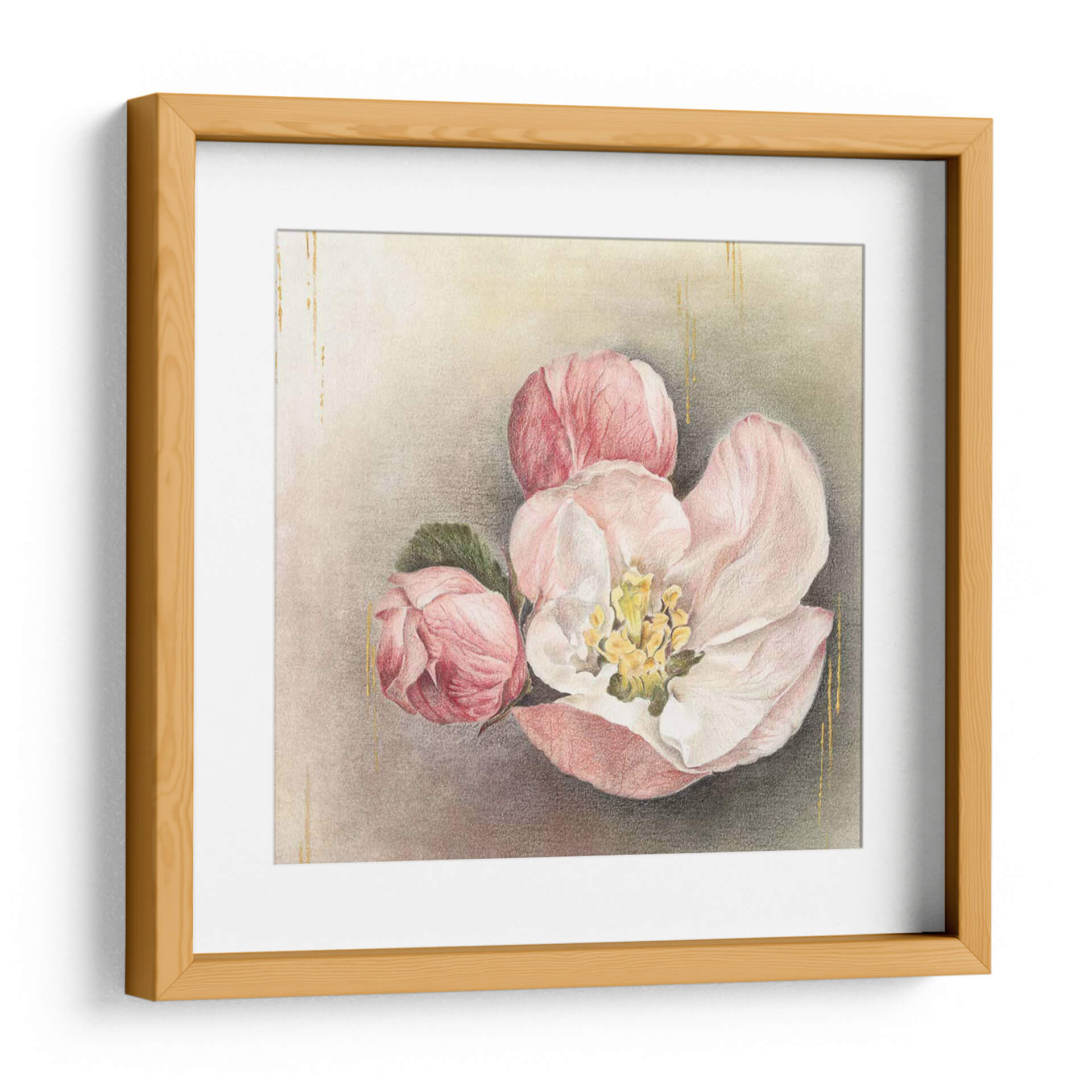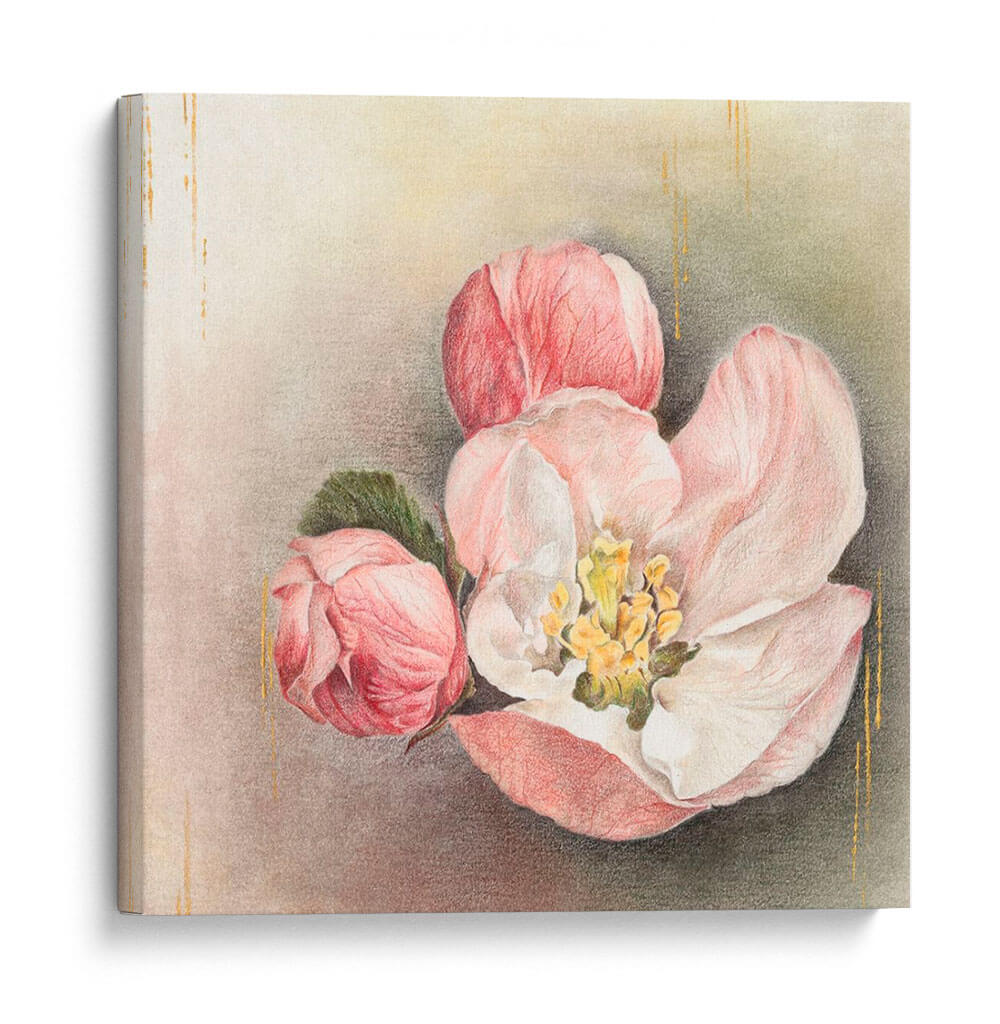 Sumérgete en la delicadeza y el encanto de "Flor De La Iluminación I", una obra de arte que captura la efímera belleza de la naturaleza. Este cuadro decorativo presenta un detallado estudio de flores en tonos rosados y blancos, con vibrantes toques de amarillo en el centro de la flor principal. Las sutiles pinceladas y las finas líneas doradas que caen elegantemente por el fondo añaden un toque de sofisticación y luz, creando una atmósfera de calma y serenidad. La composición centrada en estas delicadas flores, con sus pétalos suaves y capullos a punto de abrirse, evoca una sensación de renovación y esperanza. La paleta de colores, dominada por pasteles suaves y matices terrosos, hace de esta pieza una adición versátil para cualquier espacio, desde una sala de estar acogedora hasta un dormitorio tranquilo o una oficina que busca inspiración. "Flor De La Iluminación I" no es solo una decoración, sino una invitación a la contemplación y a la apreciación de la belleza sutil que nos rodea, aportando un aire de elegancia atemporal y naturalidad a tu hogar. Ideal para quienes buscan un arte que combine la delicadeza floral con un toque de brillo etéreo, esta obra resonará con tu espíritu y transformará tu espacio en un santuario de paz y estilo.